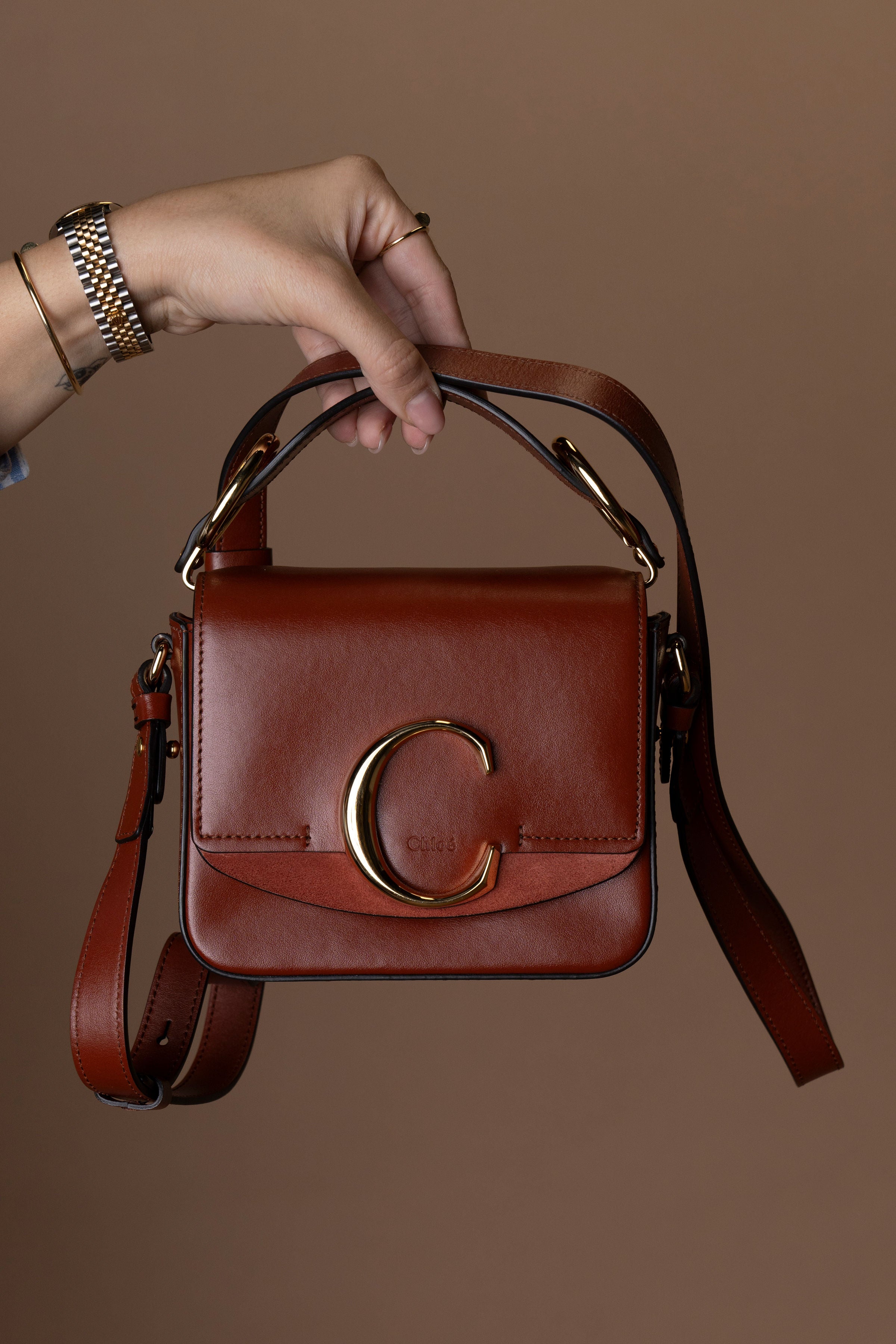 A Chloé C Mini Bag é o equilíbrio perfeito entre sofisticação e estilo contemporâneo. Confeccionada em couro de alta qualidade, o modelo apresenta acabamento impecável e o icônico “C” metálico dourado na parte frontal, assinatura inconfundível da maison francesa Chloé.