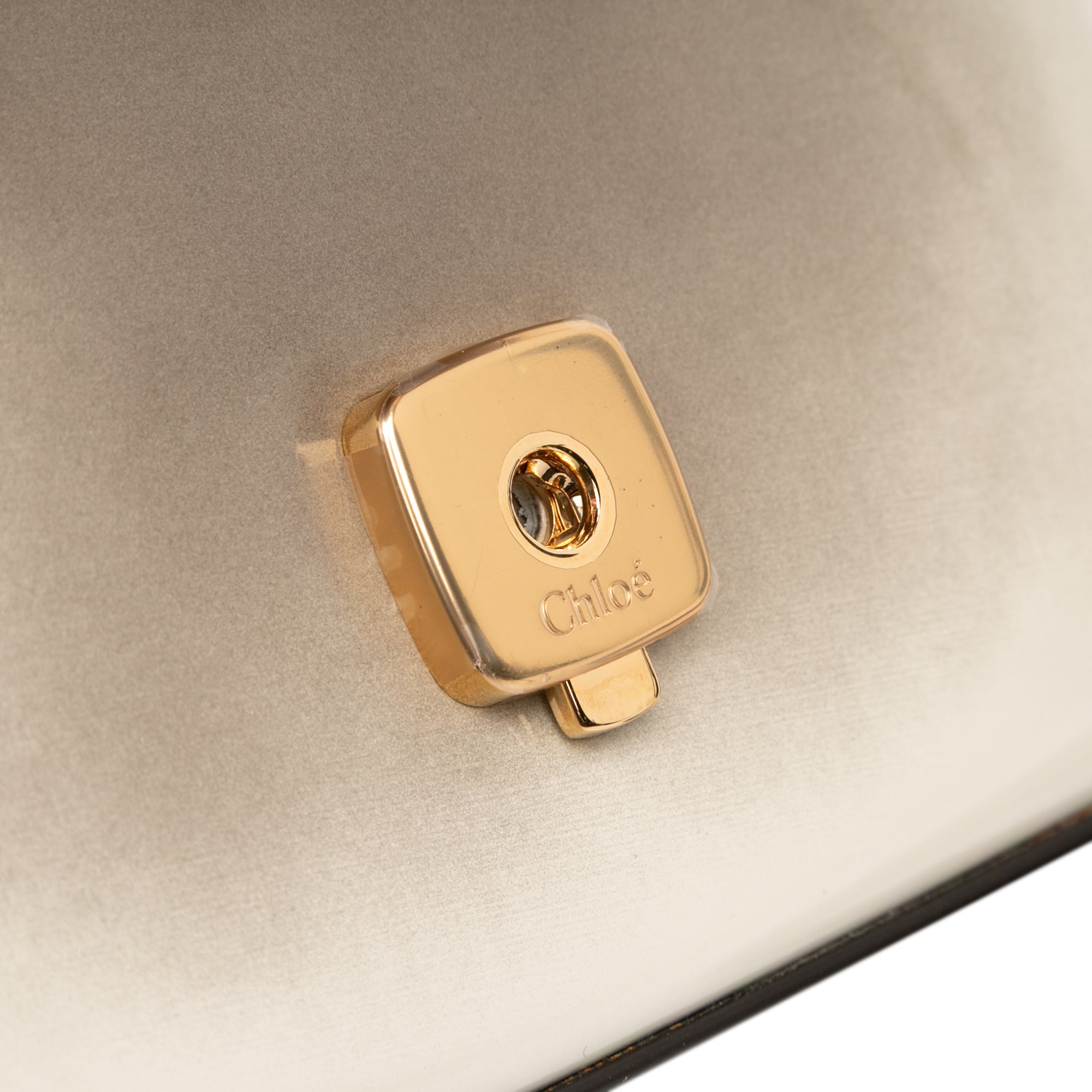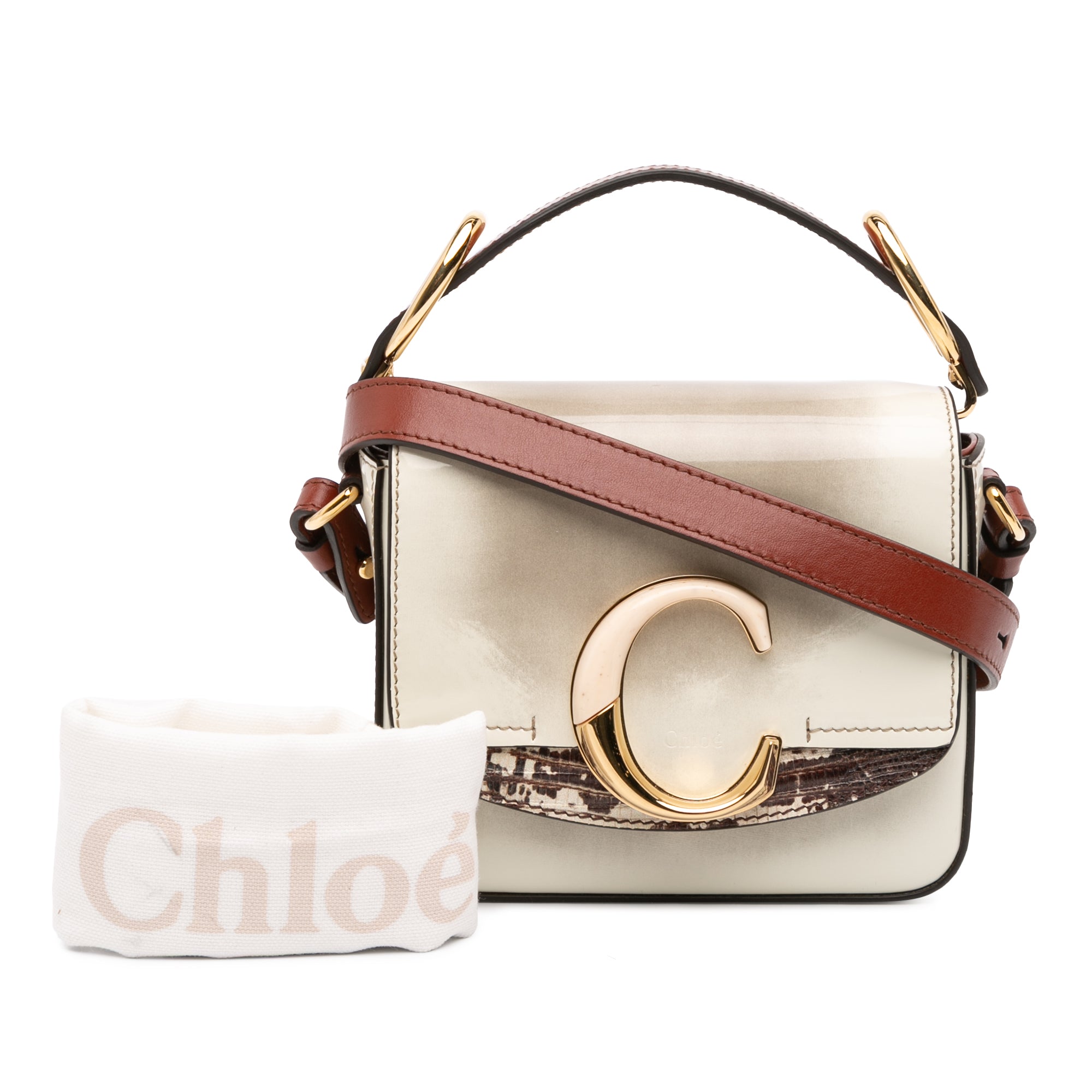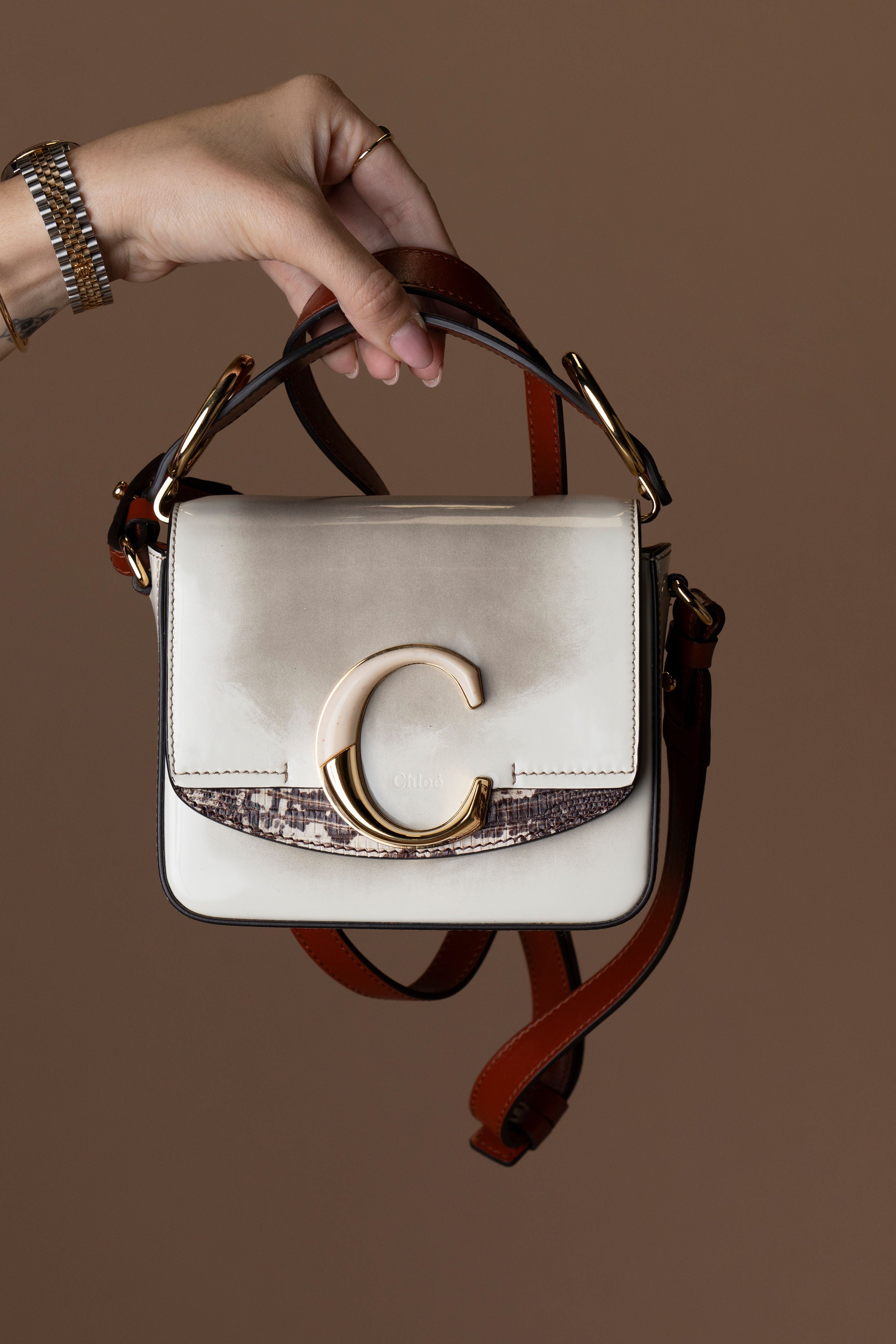 A Chloé C Mini Shaded Glossy é uma das criações mais elegantes da maison francesa, destacando-se pelo seu acabamento em couro brilhante com efeito sombreado (degradé) e pelo icónico “C” dourado em destaque na frente.