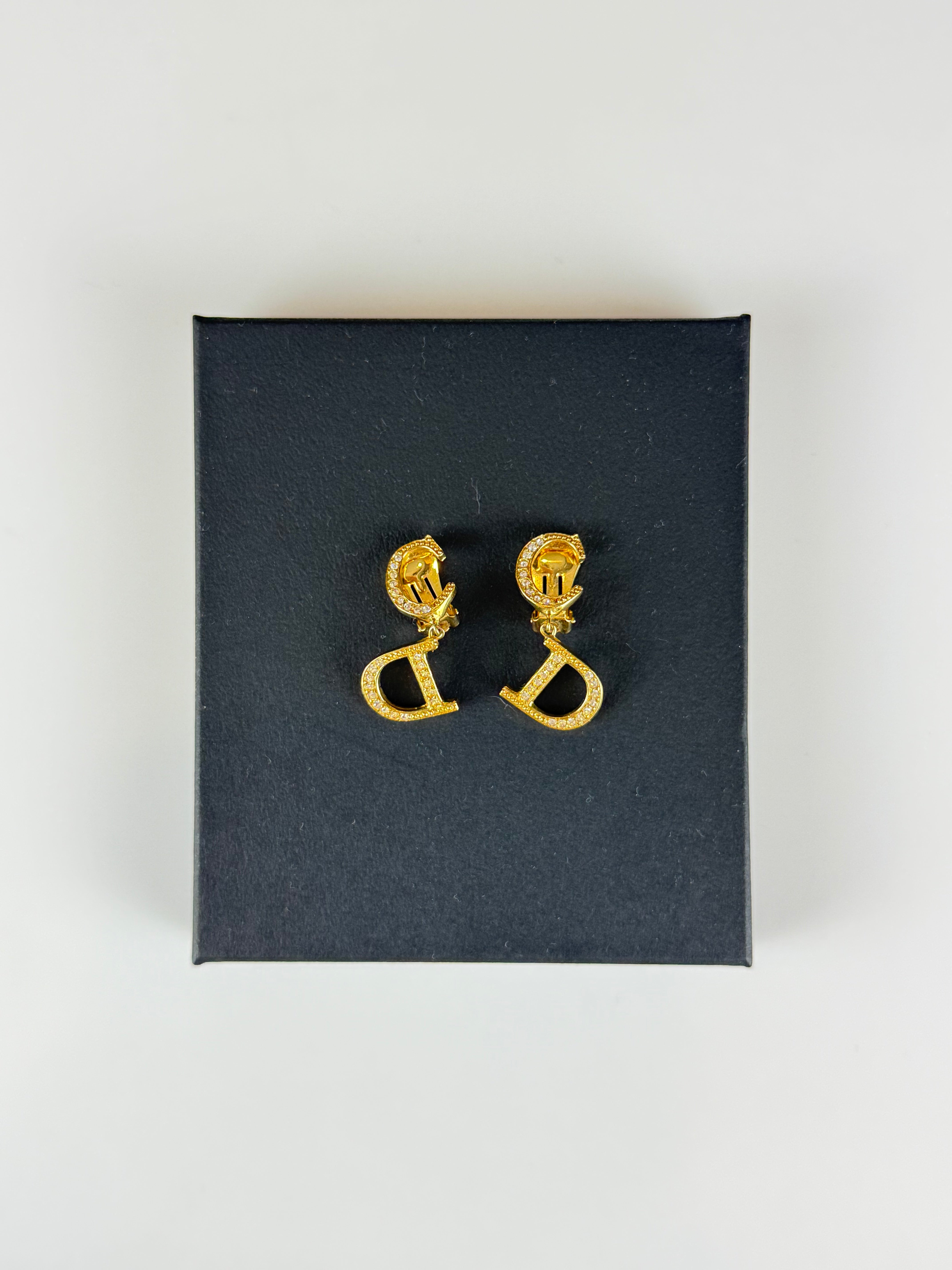 Estes elegantes brincos vintage da Christian Dior são um exemplo clássico do glamour intemporal da marca. Produzidos em metal dourado, apresentam o icónico design com as letras “C” e “D”, ambas ornamentadas com cristais brilhantes que acrescentam um toque de sofisticação e luxo.