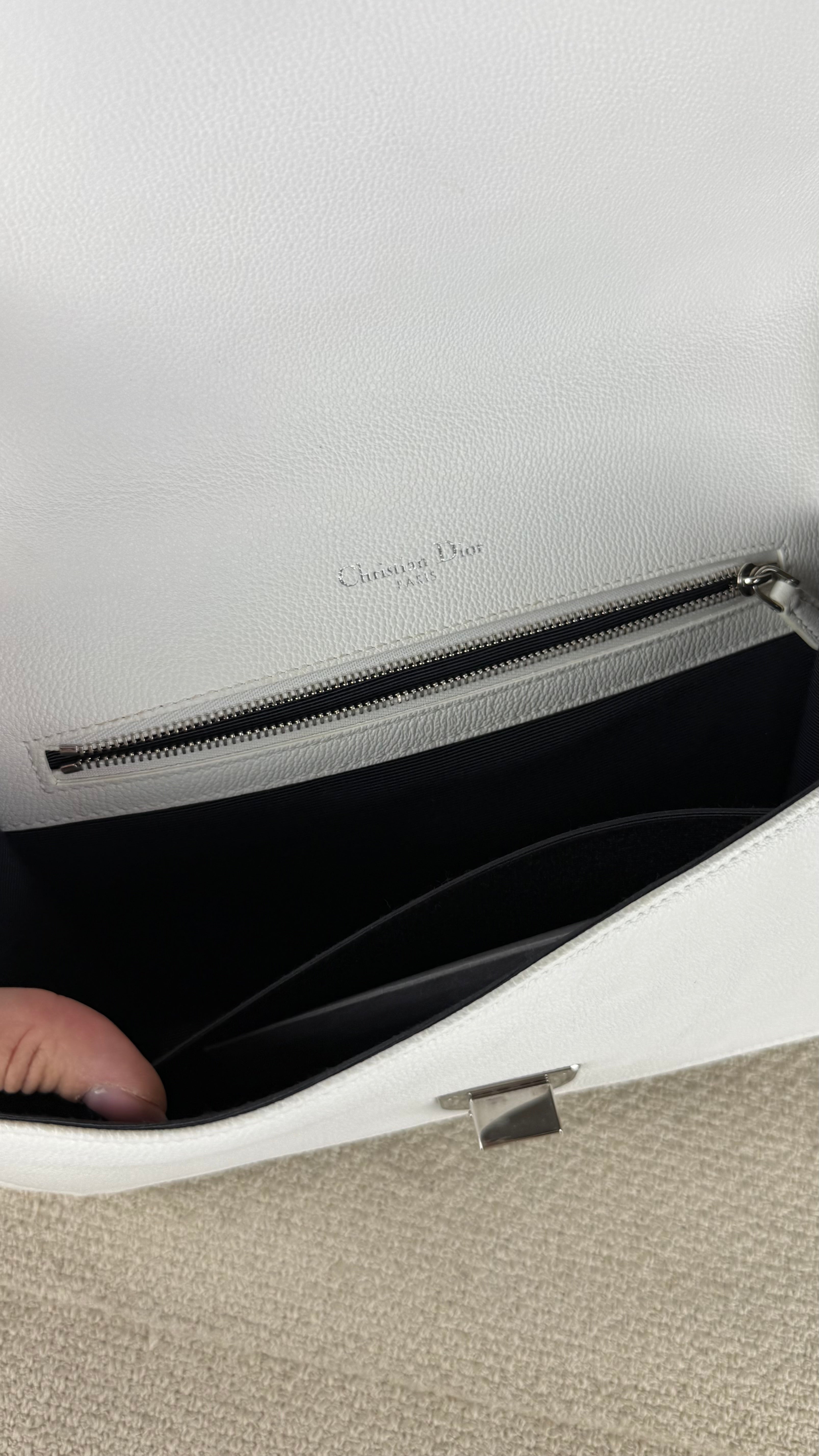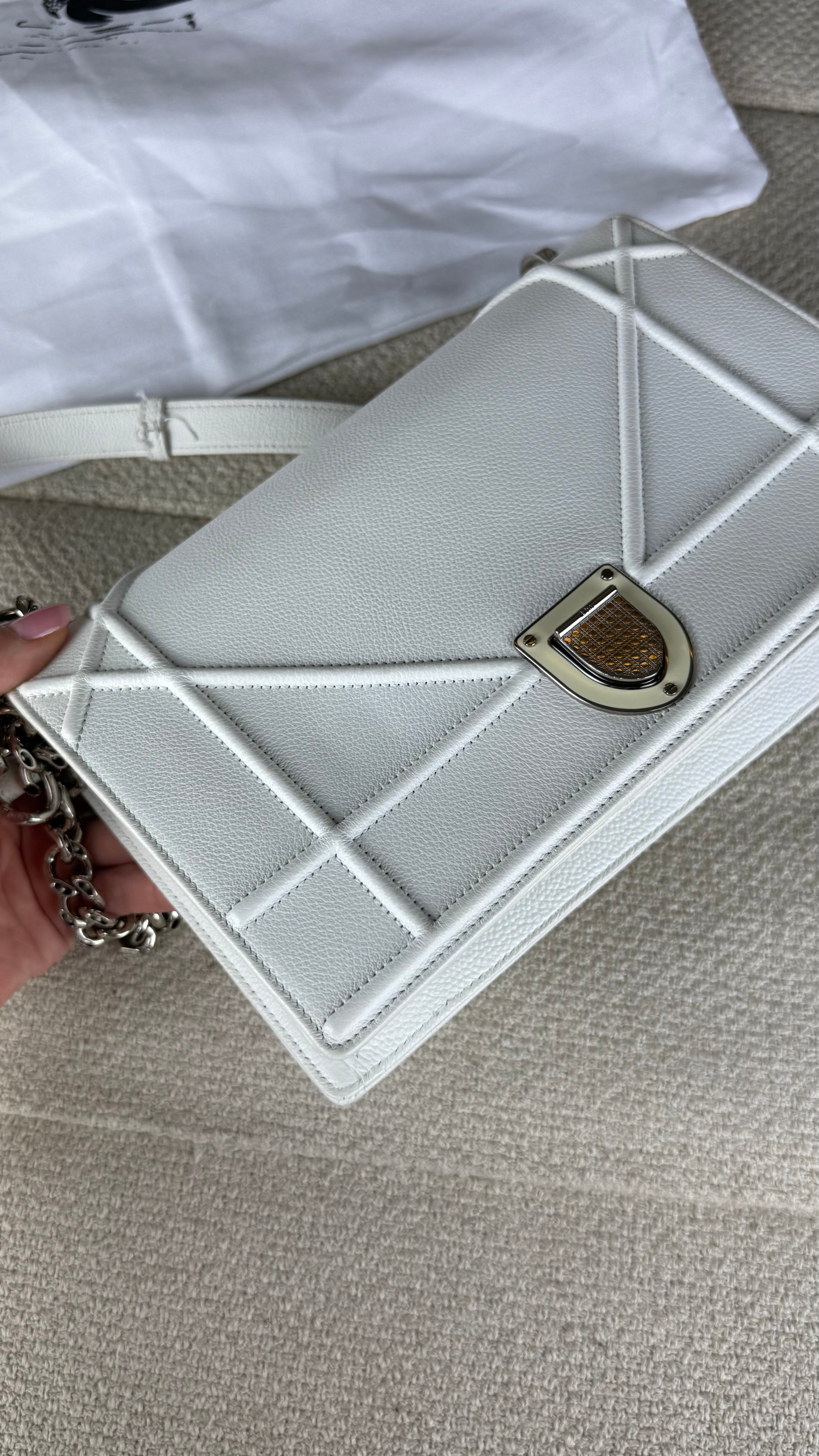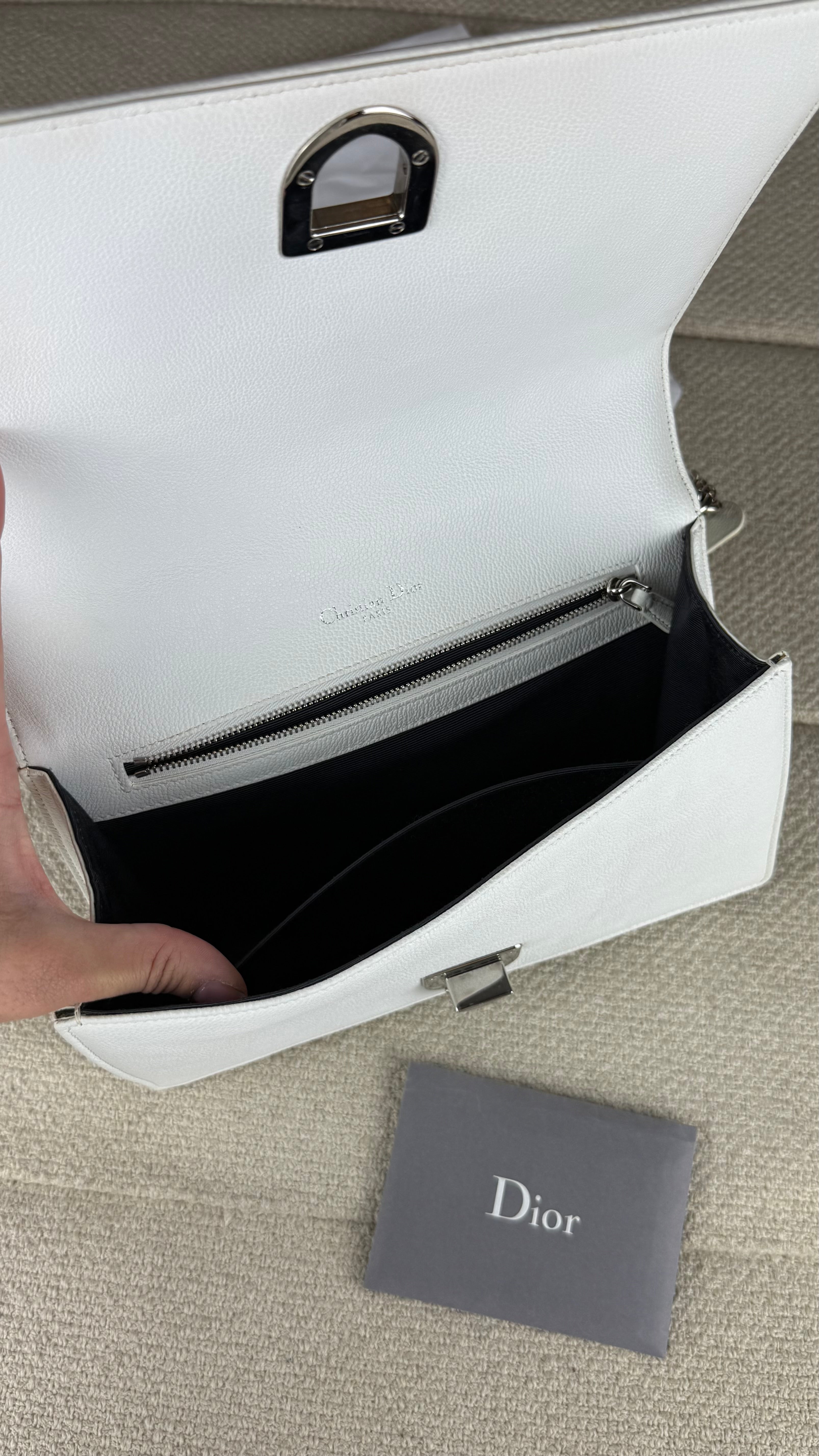 A Dior Diorama Medium Flap é uma expressão de modernidade e elegância atemporal, criada pela Maison Dior como um verdadeiro ícone de estilo contemporâneo. Confeccionada em couro de bezerro granulado branco, esta bolsa combina linhas geométricas sofisticadas e um design arquitetônico que reflete o savoir-faire artesanal da marca francesa.