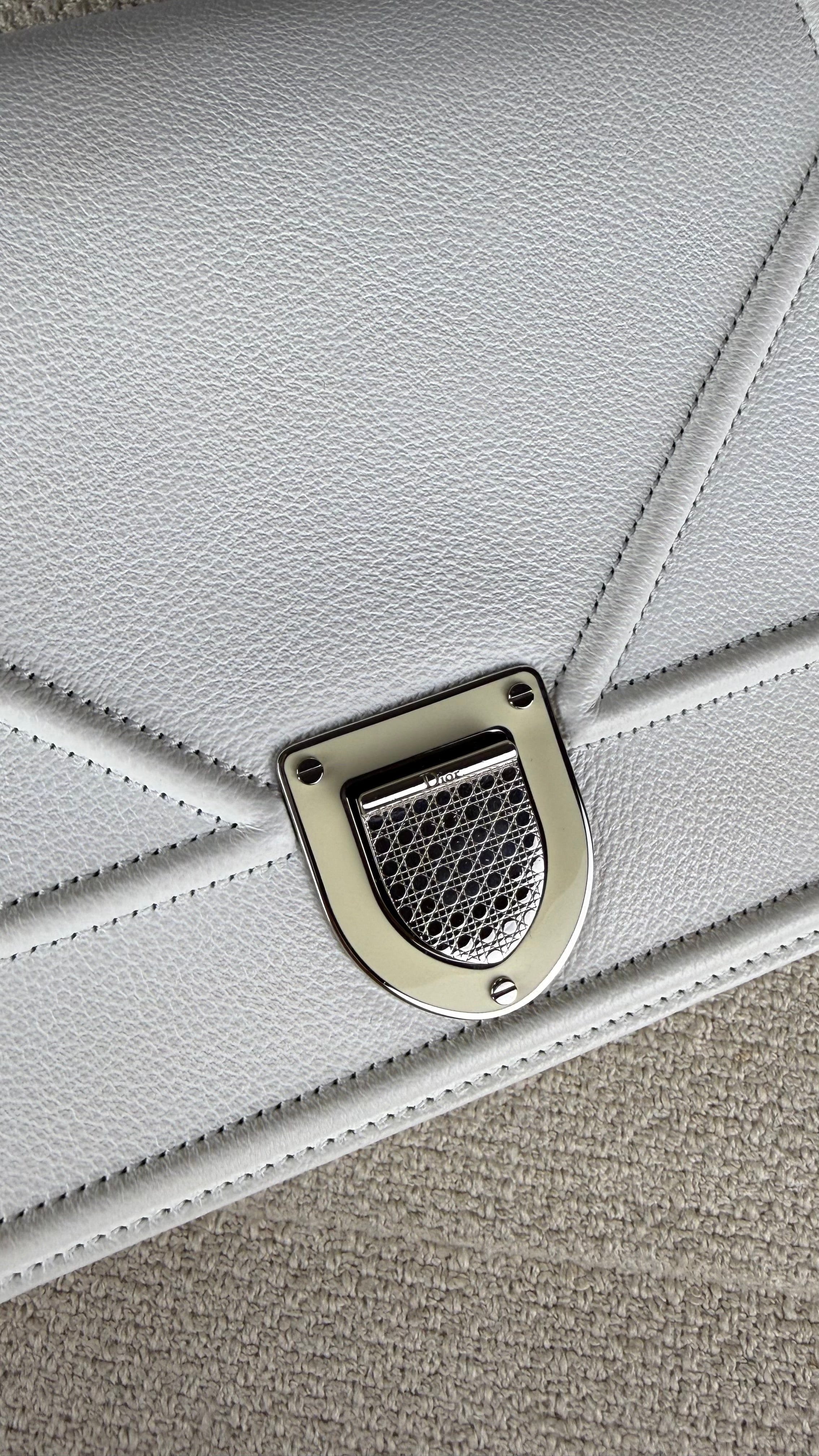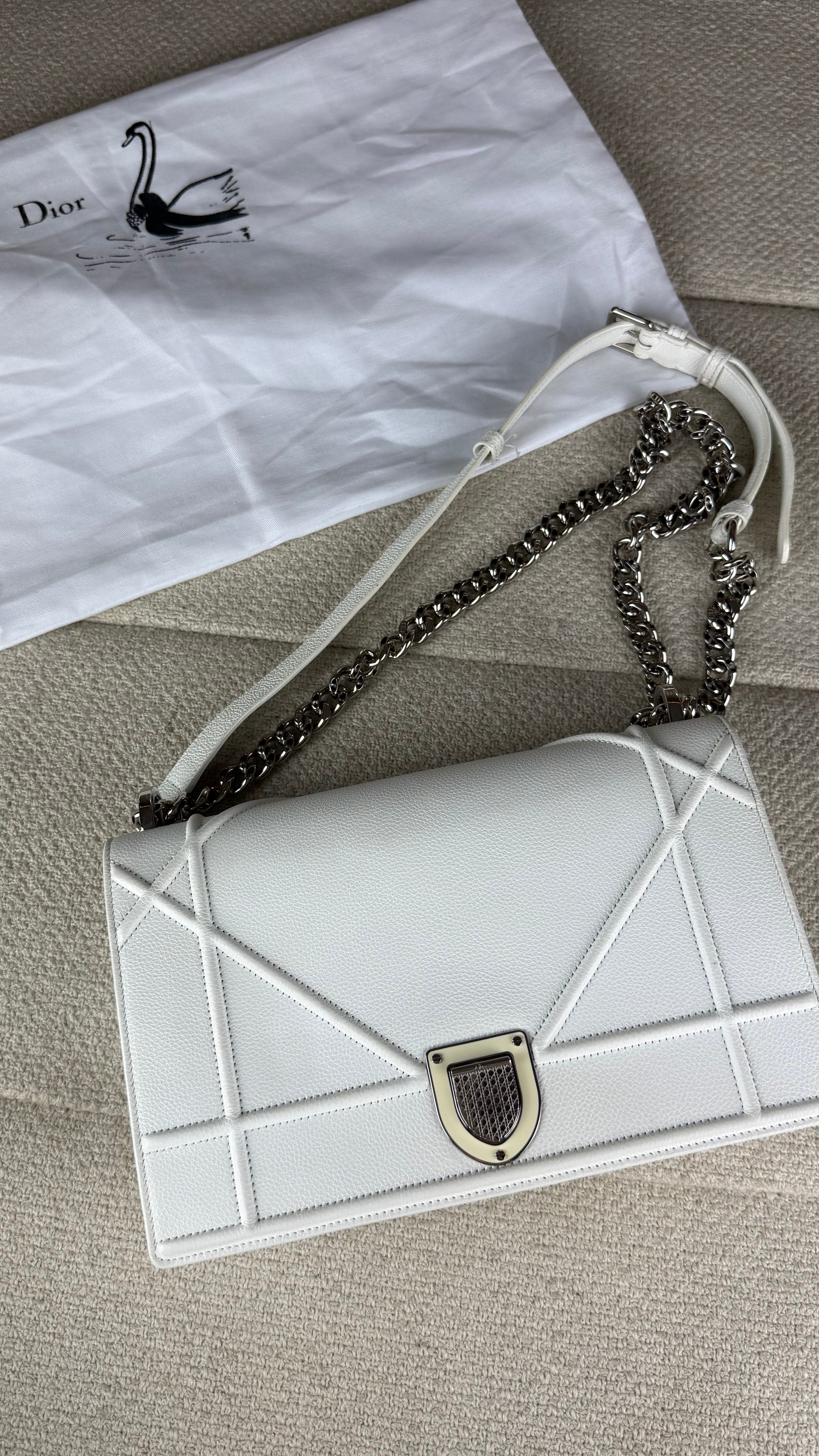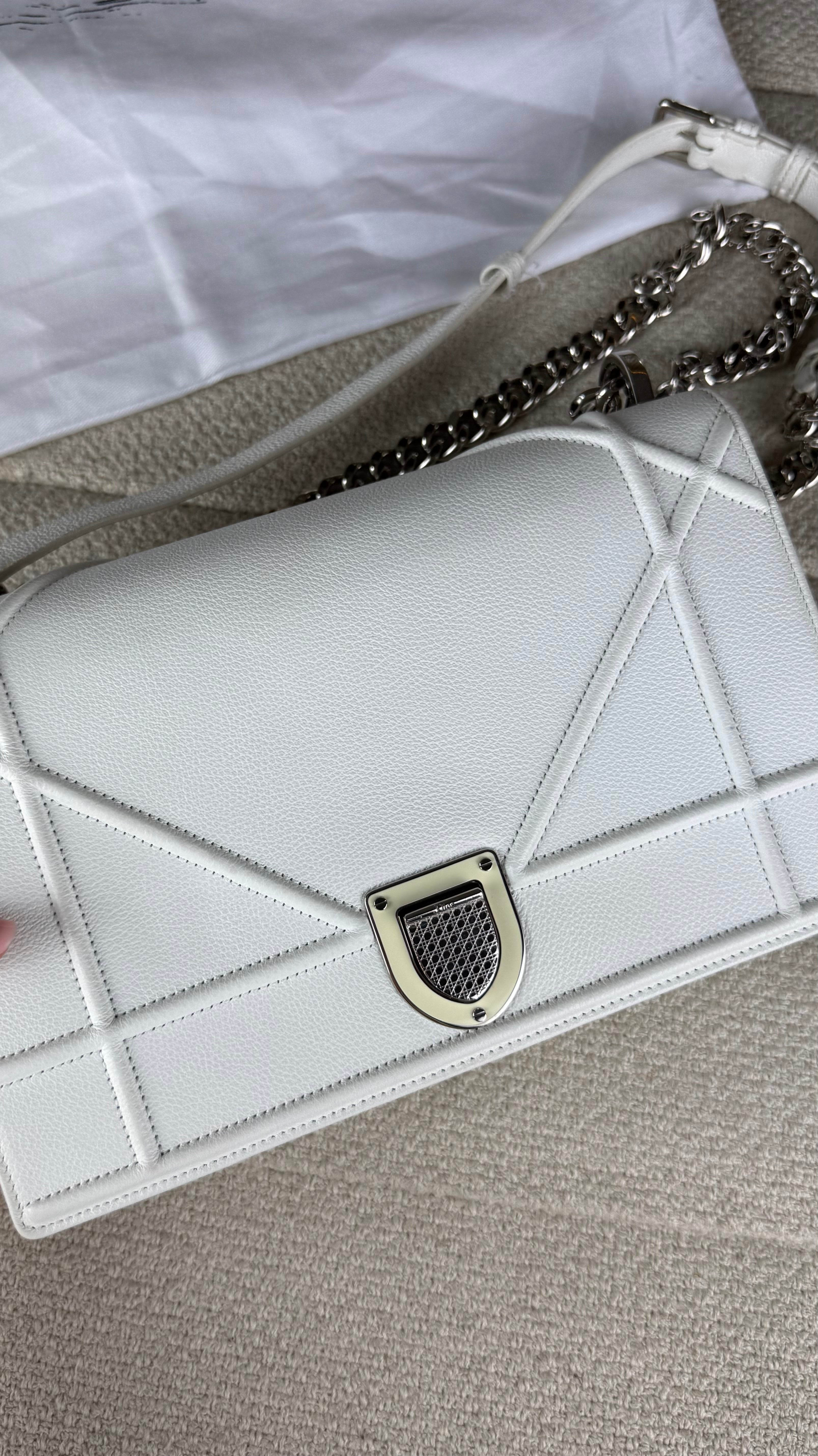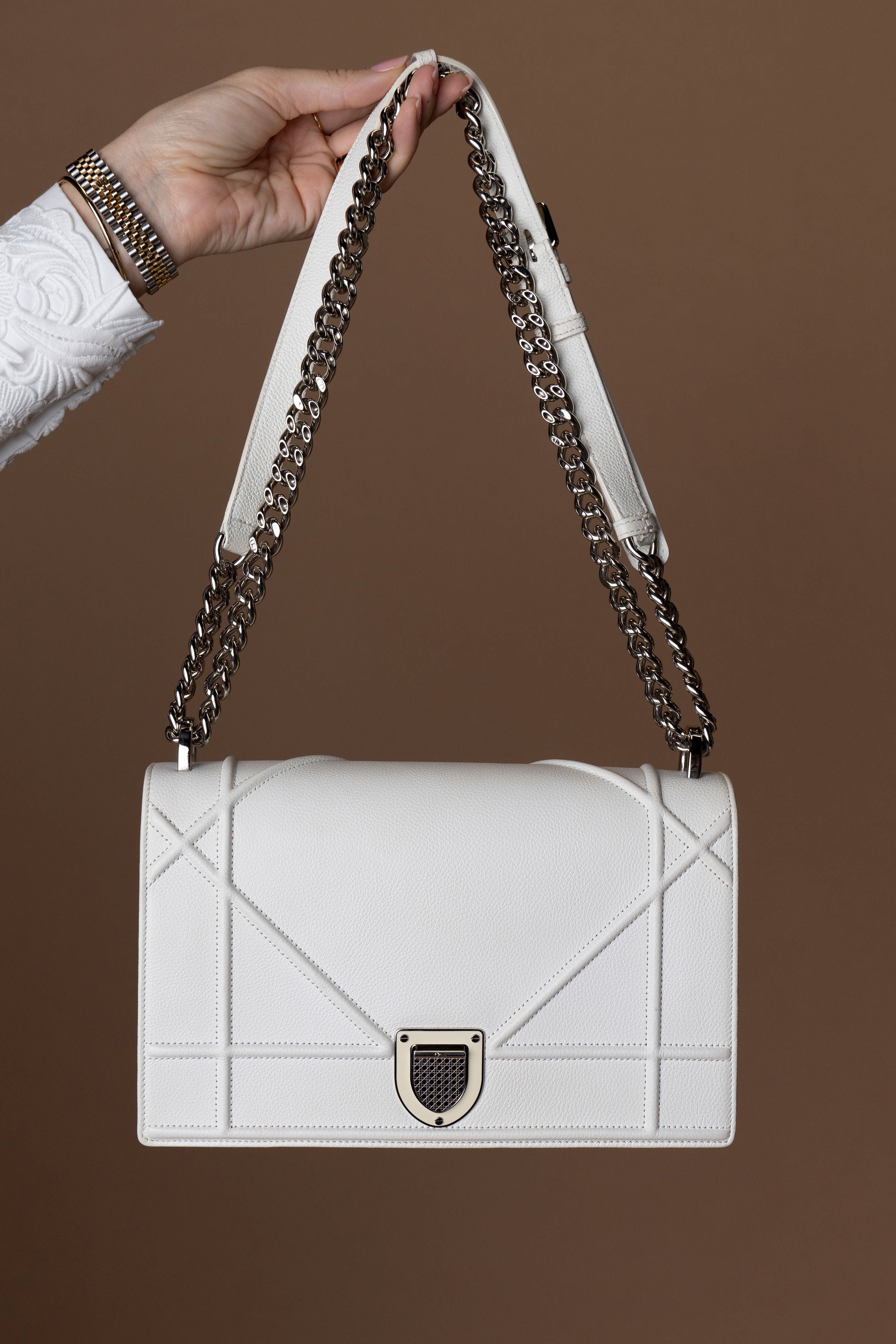 A Dior Diorama Medium Flap é uma expressão de modernidade e elegância atemporal, criada pela Maison Dior como um verdadeiro ícone de estilo contemporâneo. Confeccionada em couro de bezerro granulado branco, esta bolsa combina linhas geométricas sofisticadas e um design arquitetônico que reflete o savoir-faire artesanal da marca francesa.