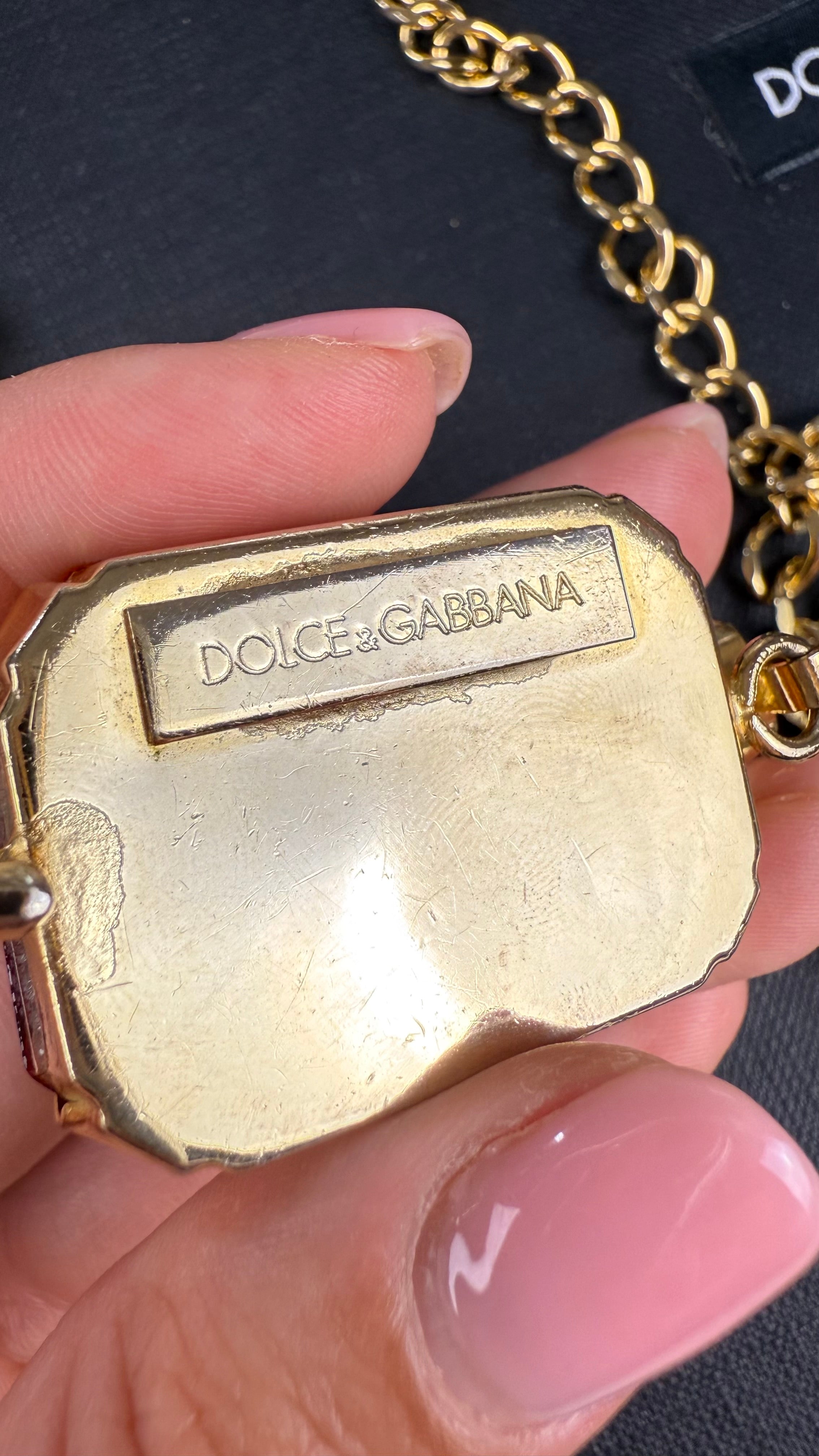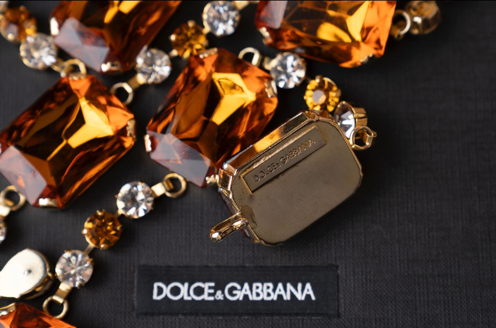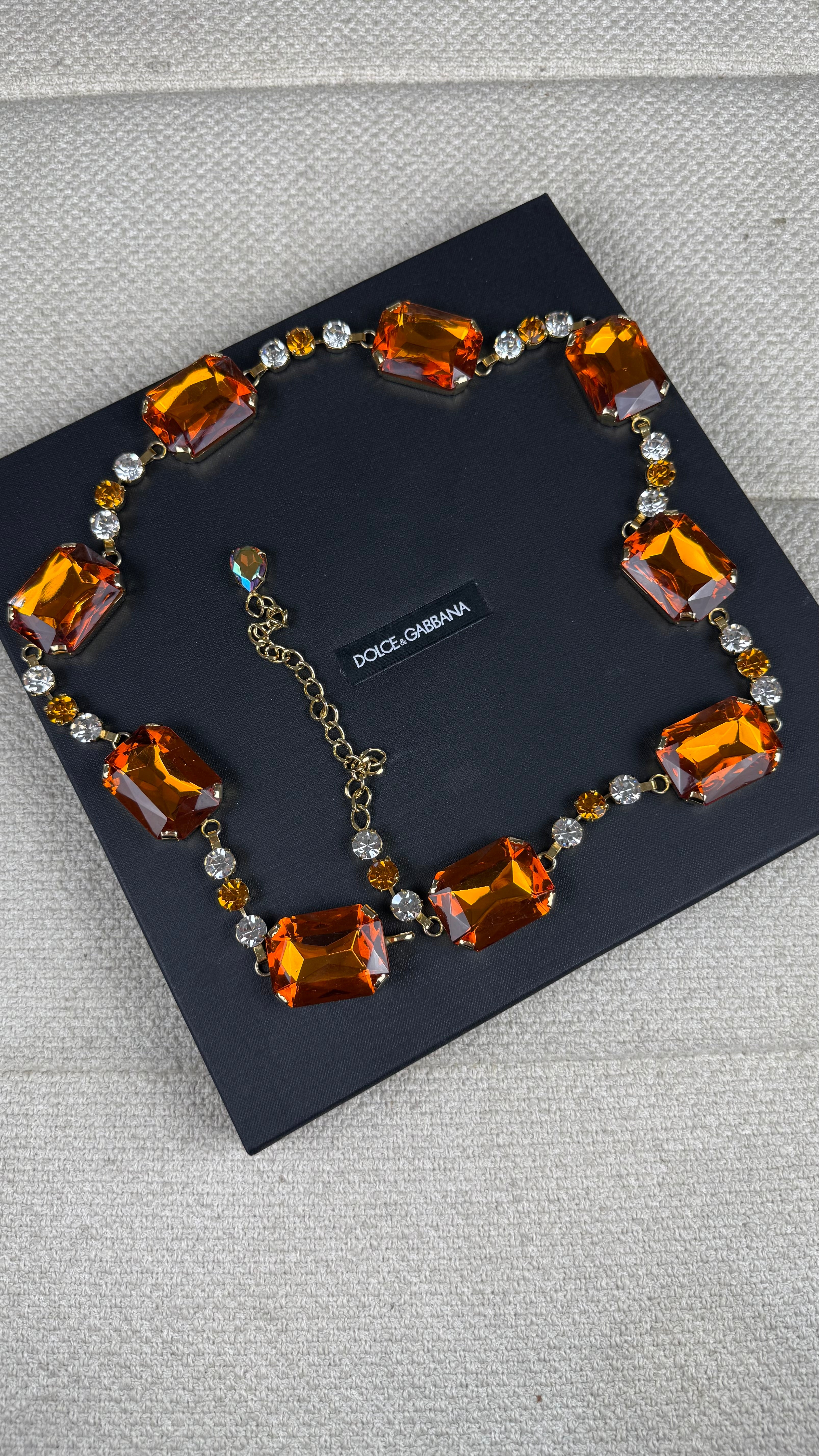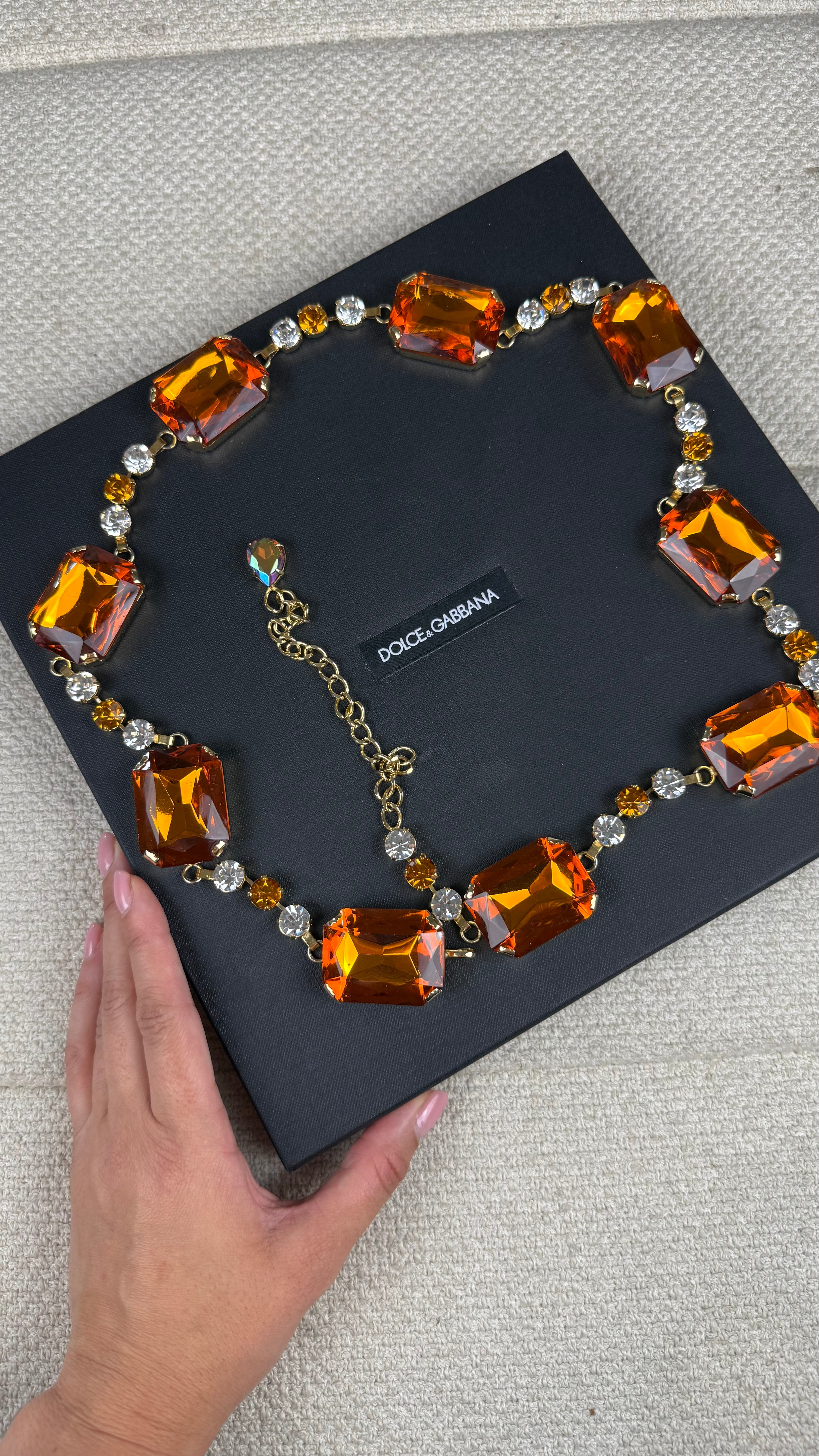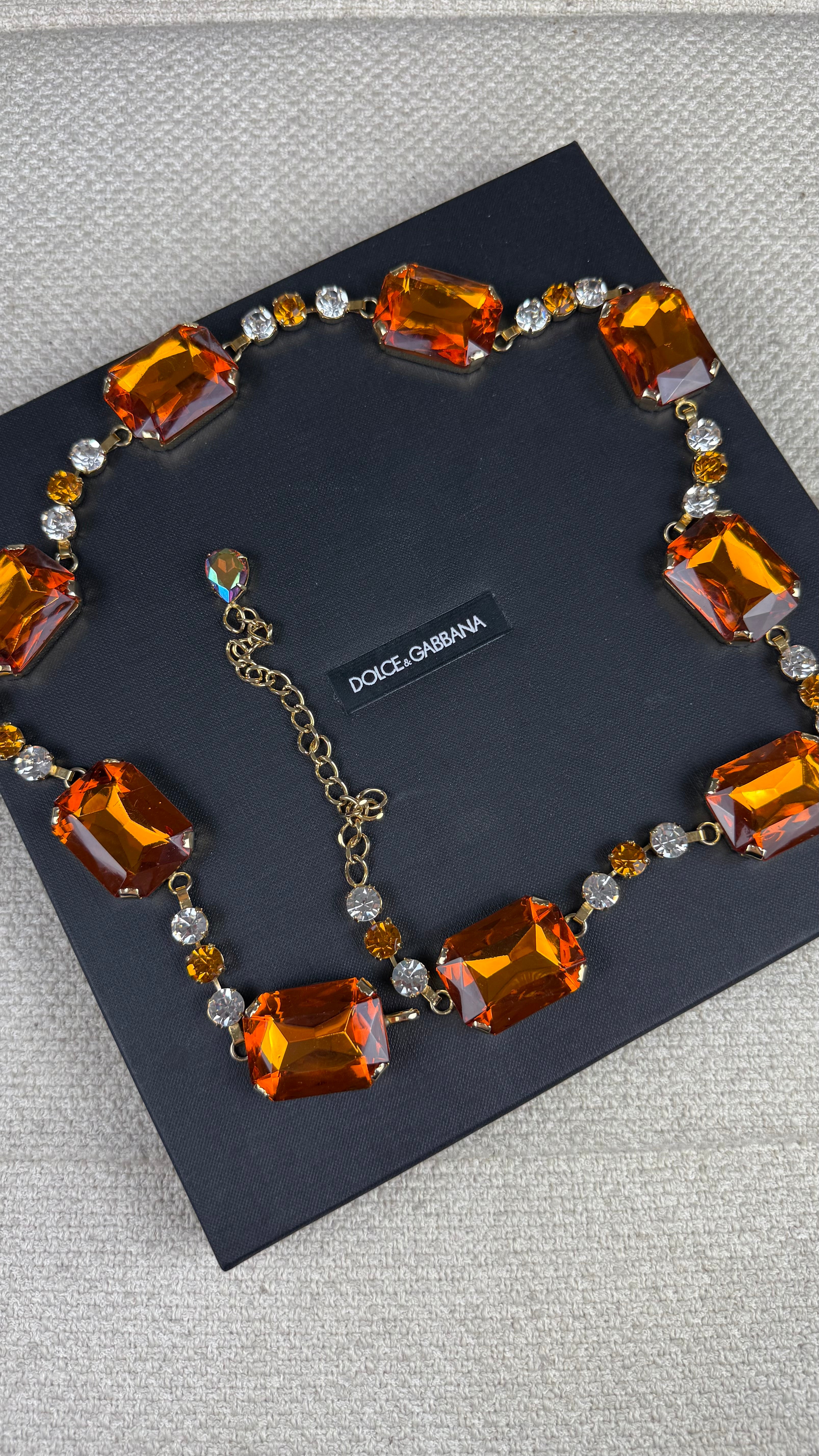 Este deslumbrante cinto Dolce & Gabbana combina o glamour maximalista da marca italiana com uma estética vintage de alta-costura, digna das passarelas. Ele é confeccionado com pedras grandes facetadas em tom âmbar (laranja queimado), intercaladas com cristais menores em tons claros e dourados, todos montados em uma estrutura dourada com acabamento envelhecido.