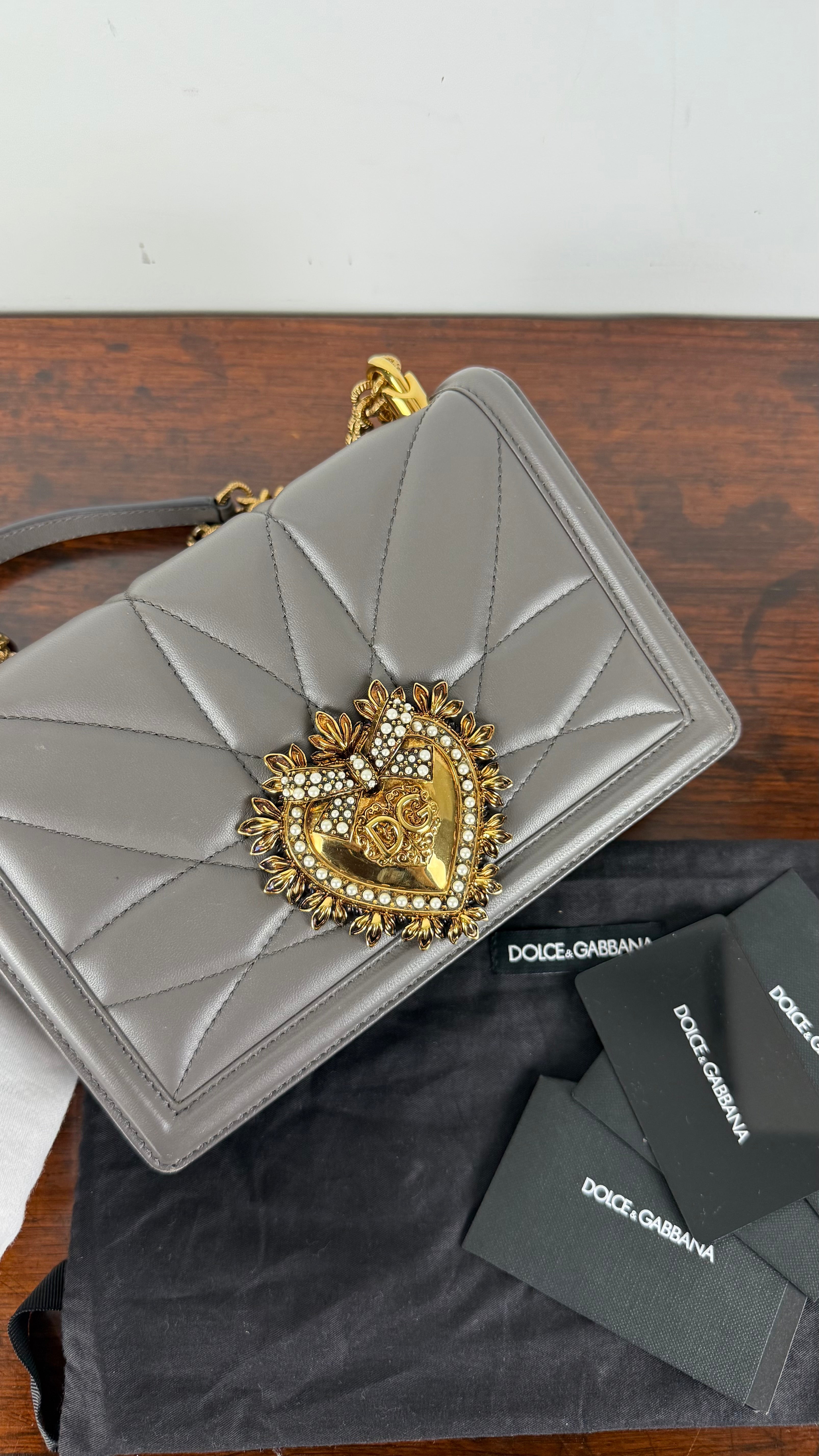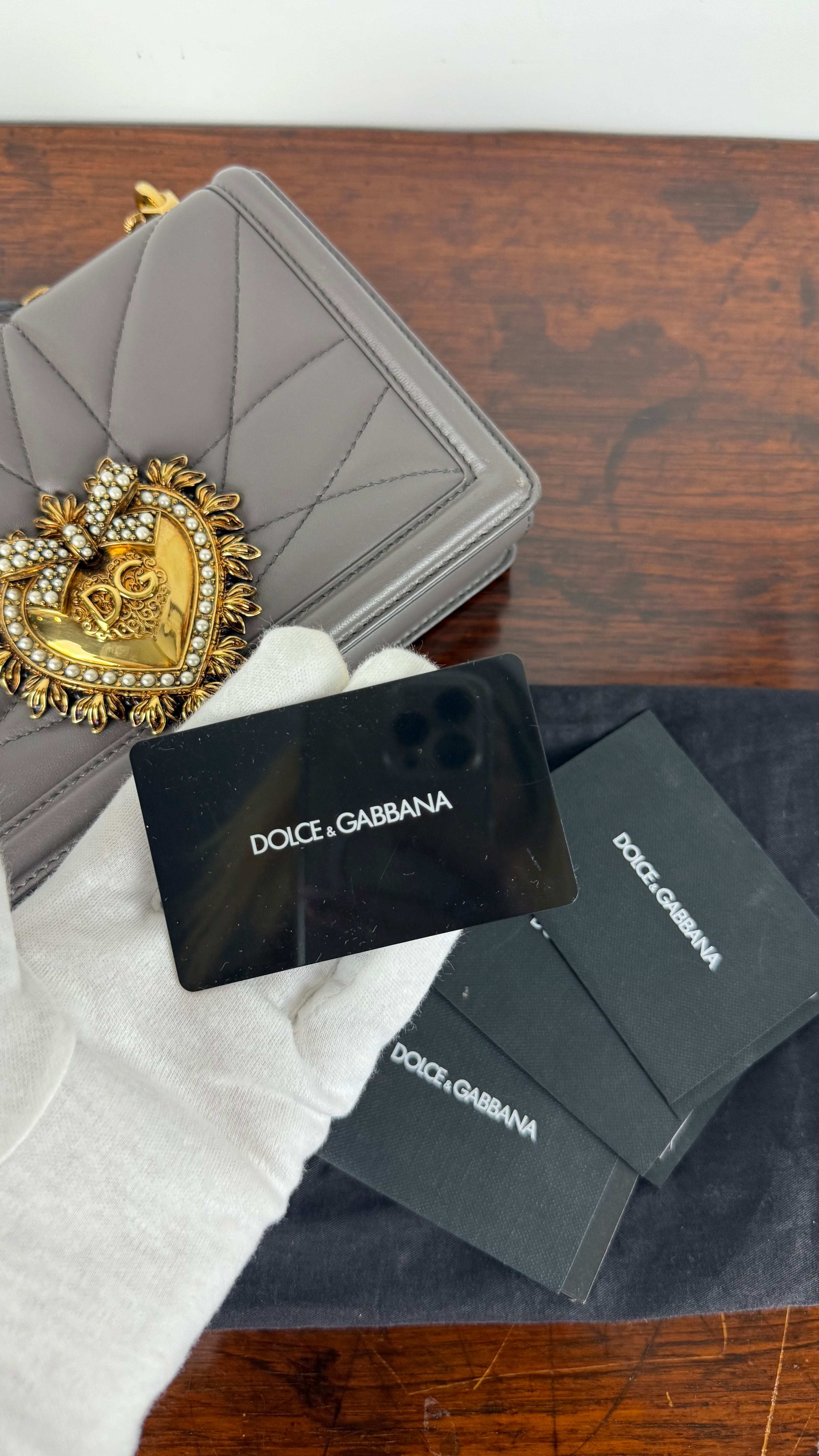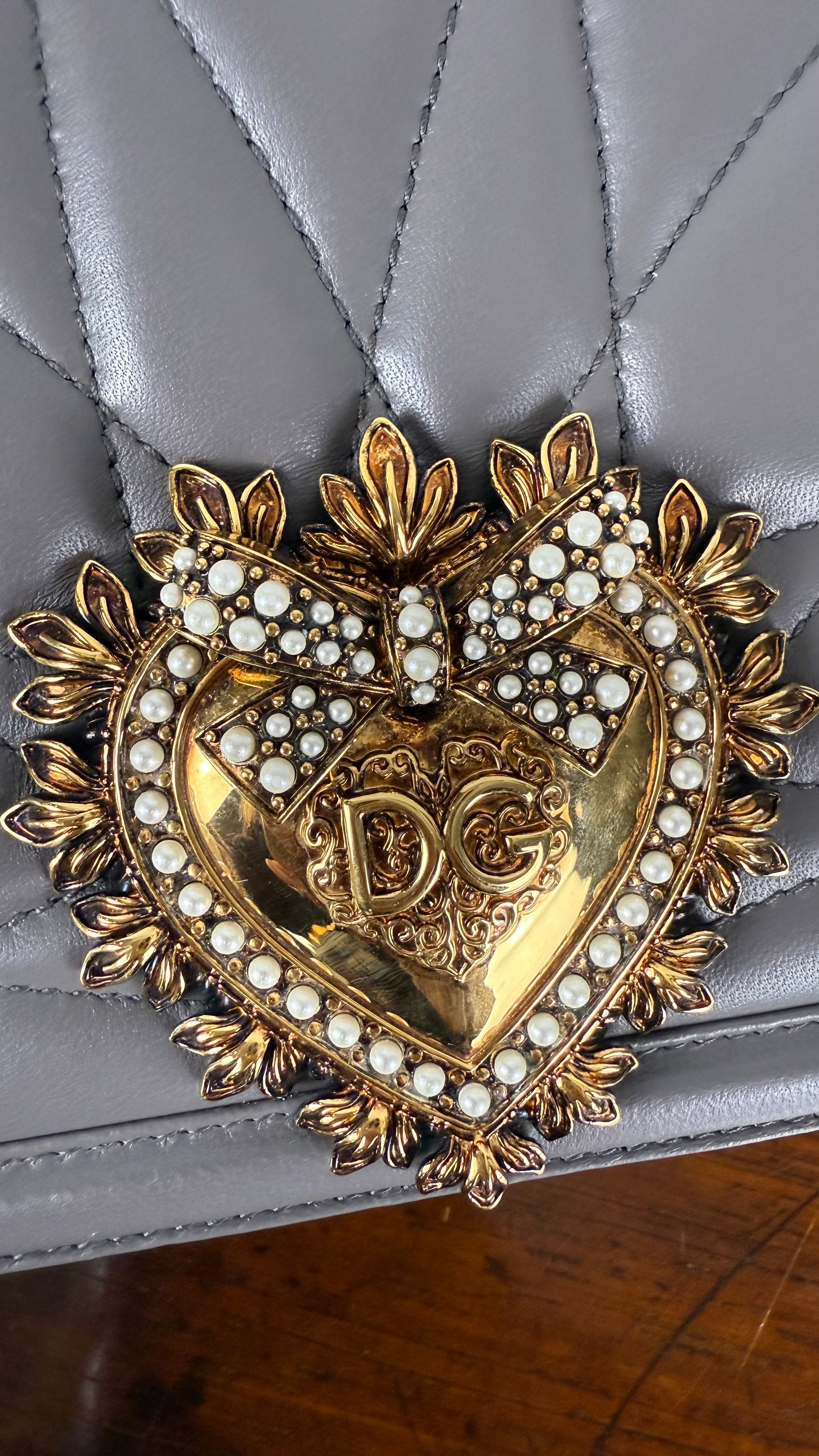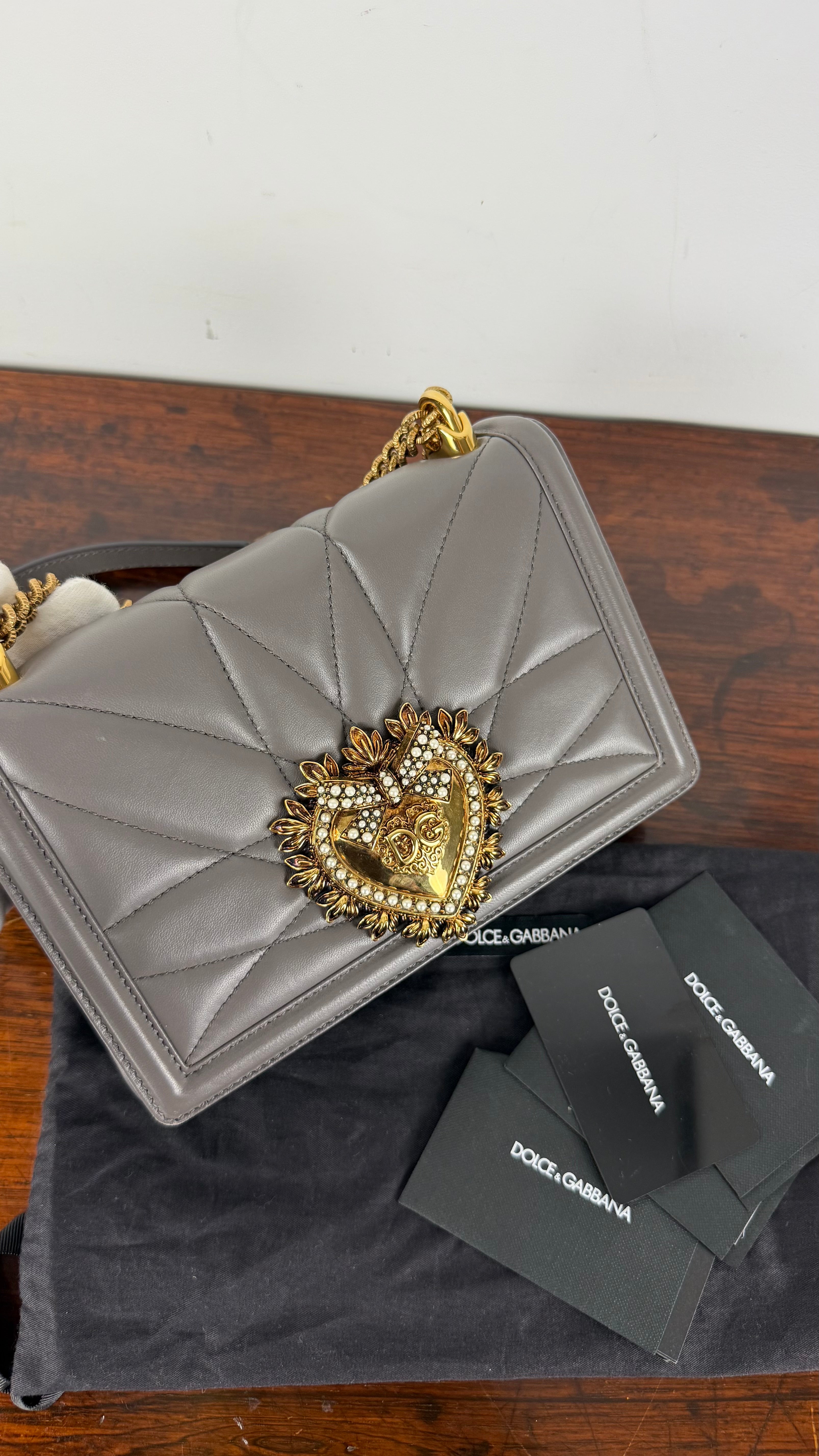 A Devotion Bag é um dos modelos mais emblemáticos da Dolce & Gabbana, celebrada por seu design sofisticado e o detalhe artesanal exclusivo: o sagrado coração DG em metal dourado e pérolas, feito à mão na Itália. É uma peça símbolo da maison, unindo luxo, romantismo e estilo atemporal.