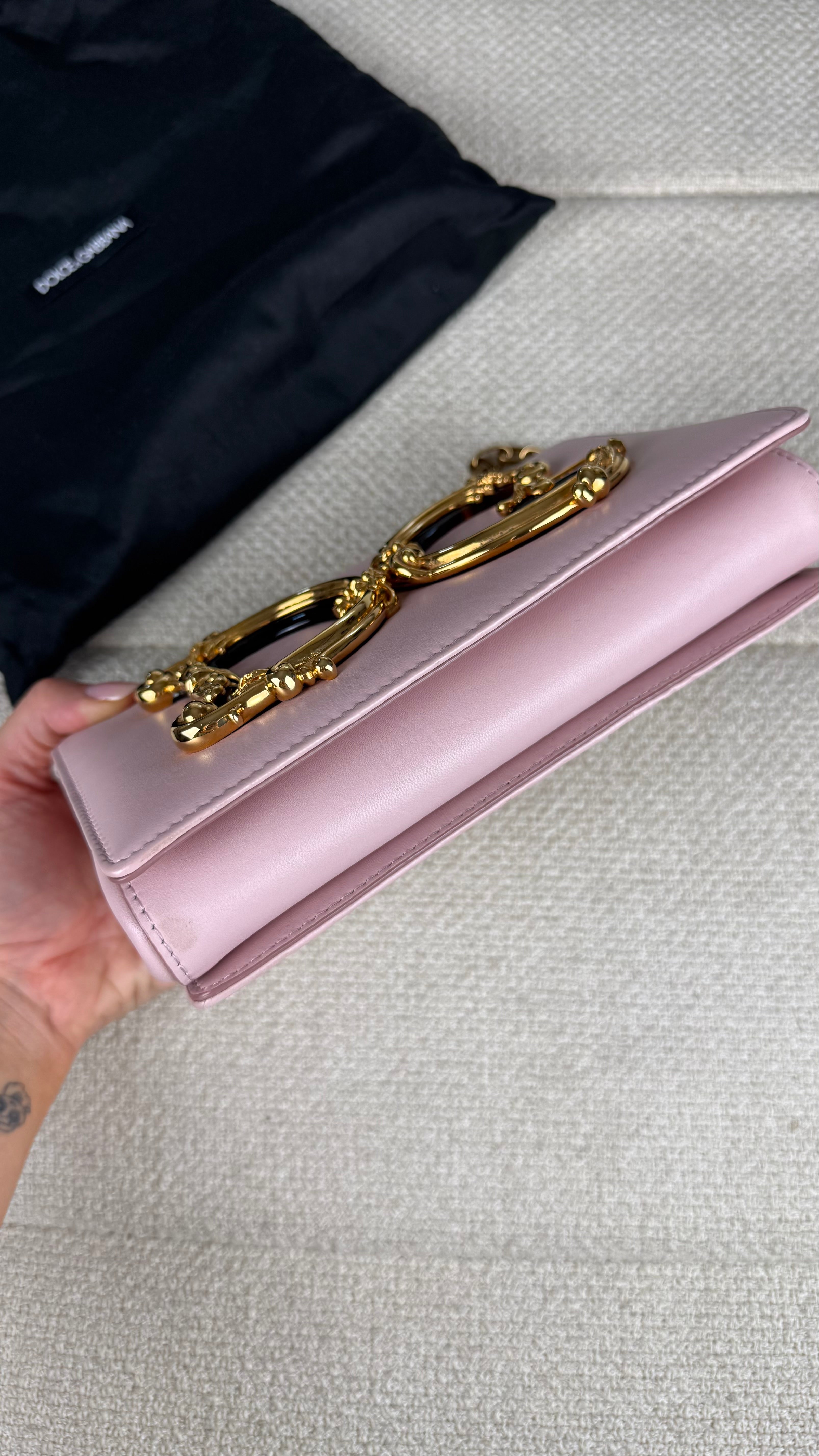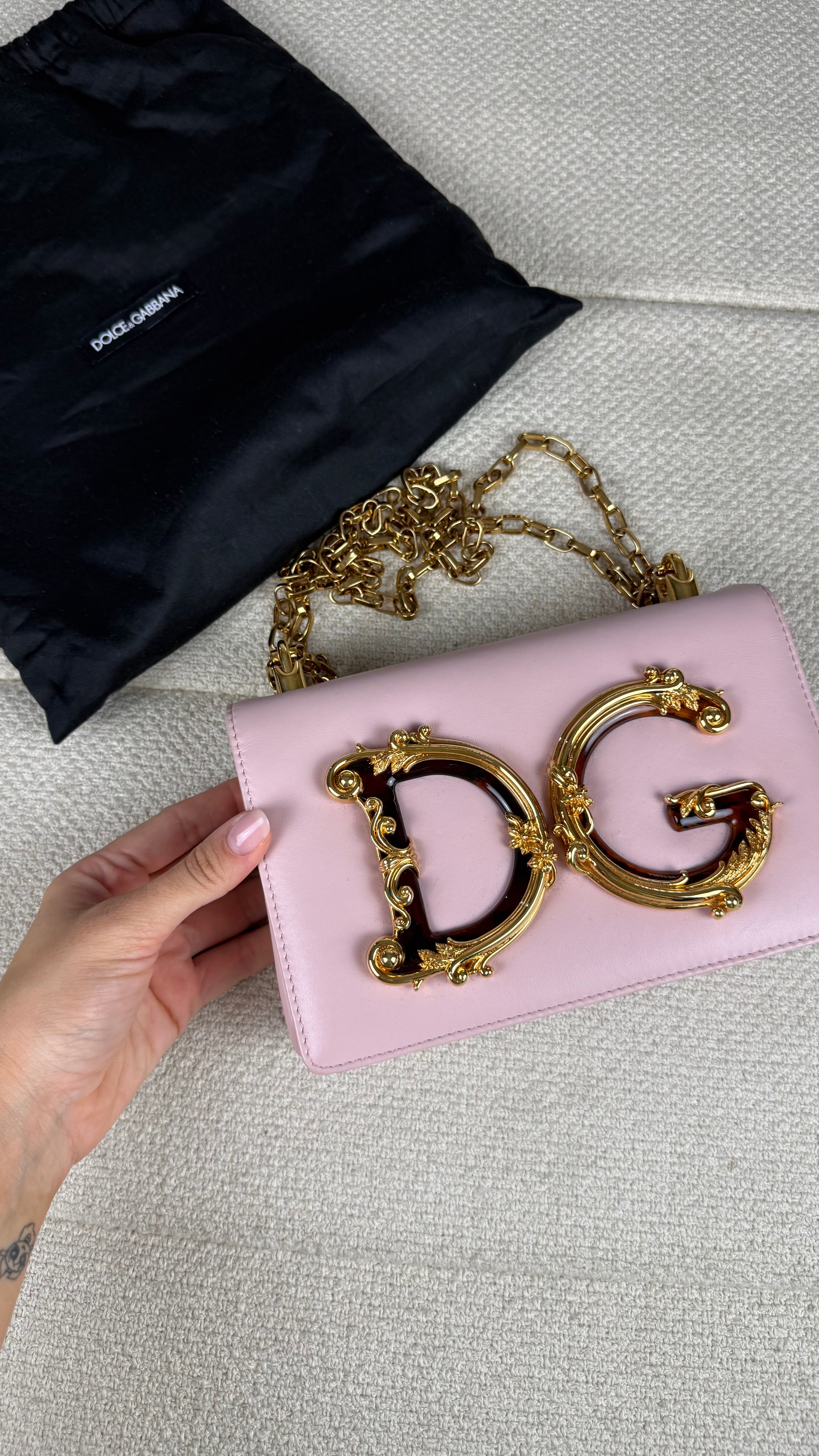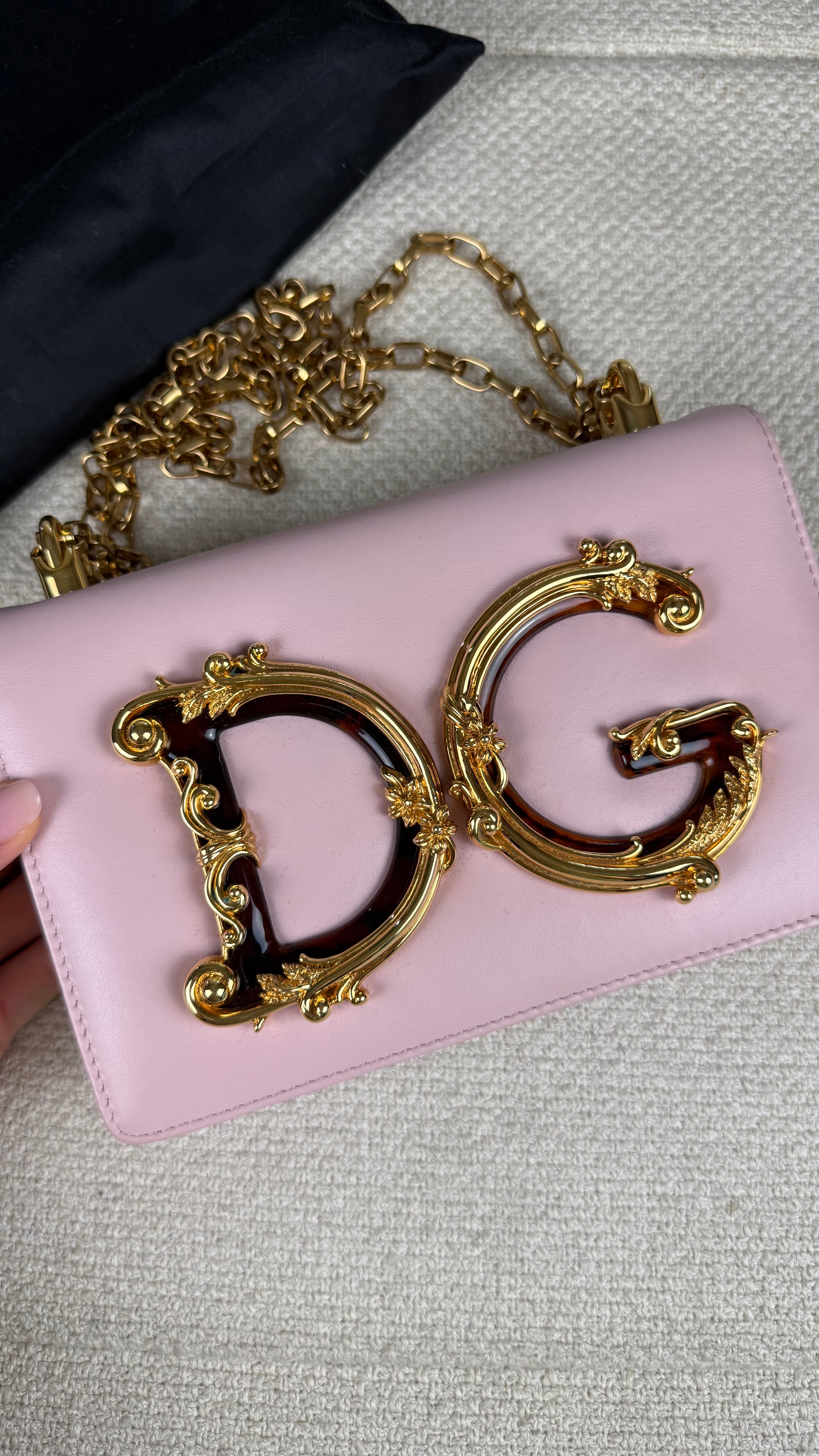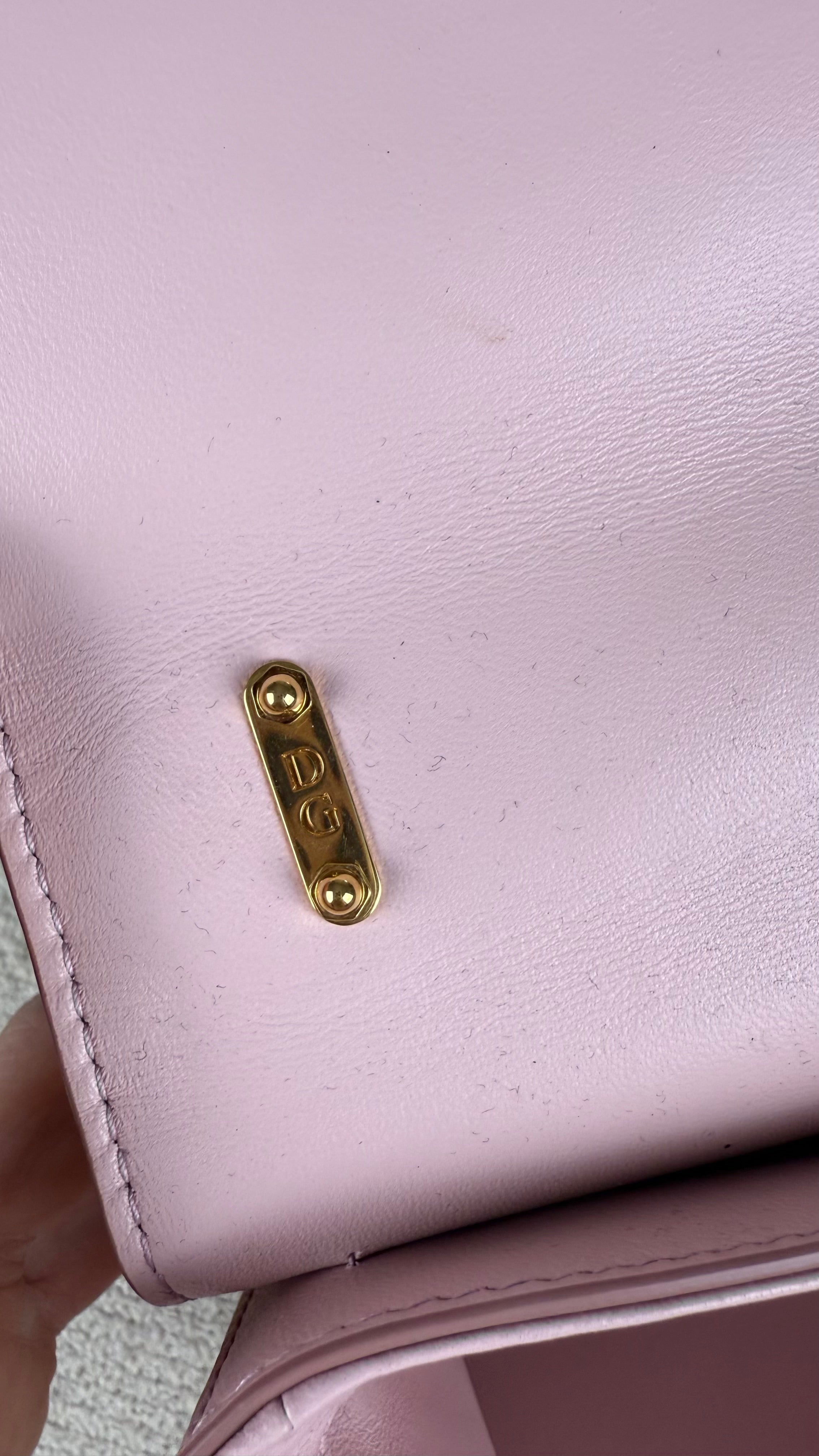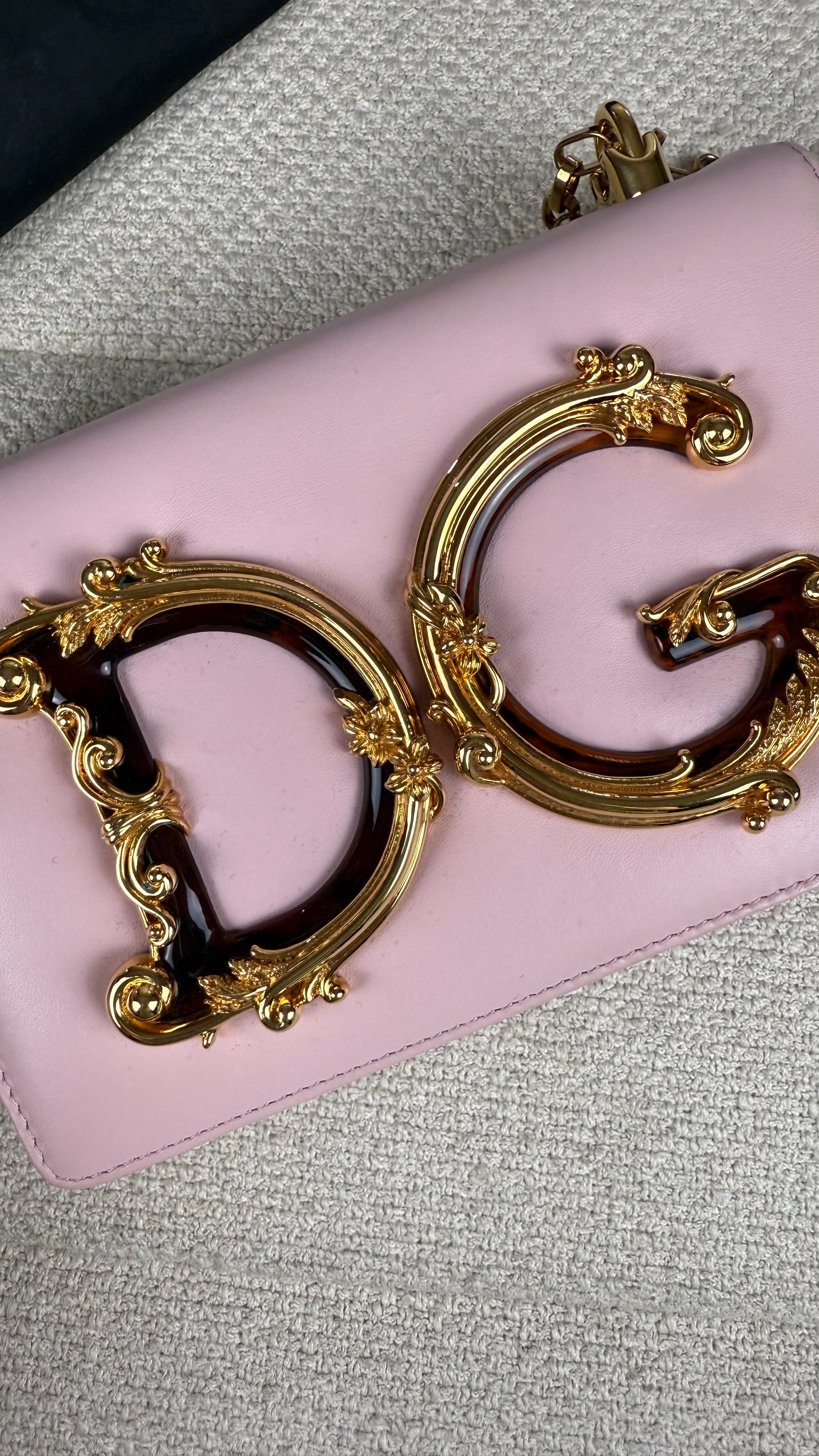 Uma peça icônica da DG Girls, esta bolsa é confeccionada em couro nappa rosa suave (ou metalizado, conforme edição), adornada com o distinto logotipo “DG” barroco em ABS esmaltado com acabamento dourado vintage, que traduz elegância com atitude