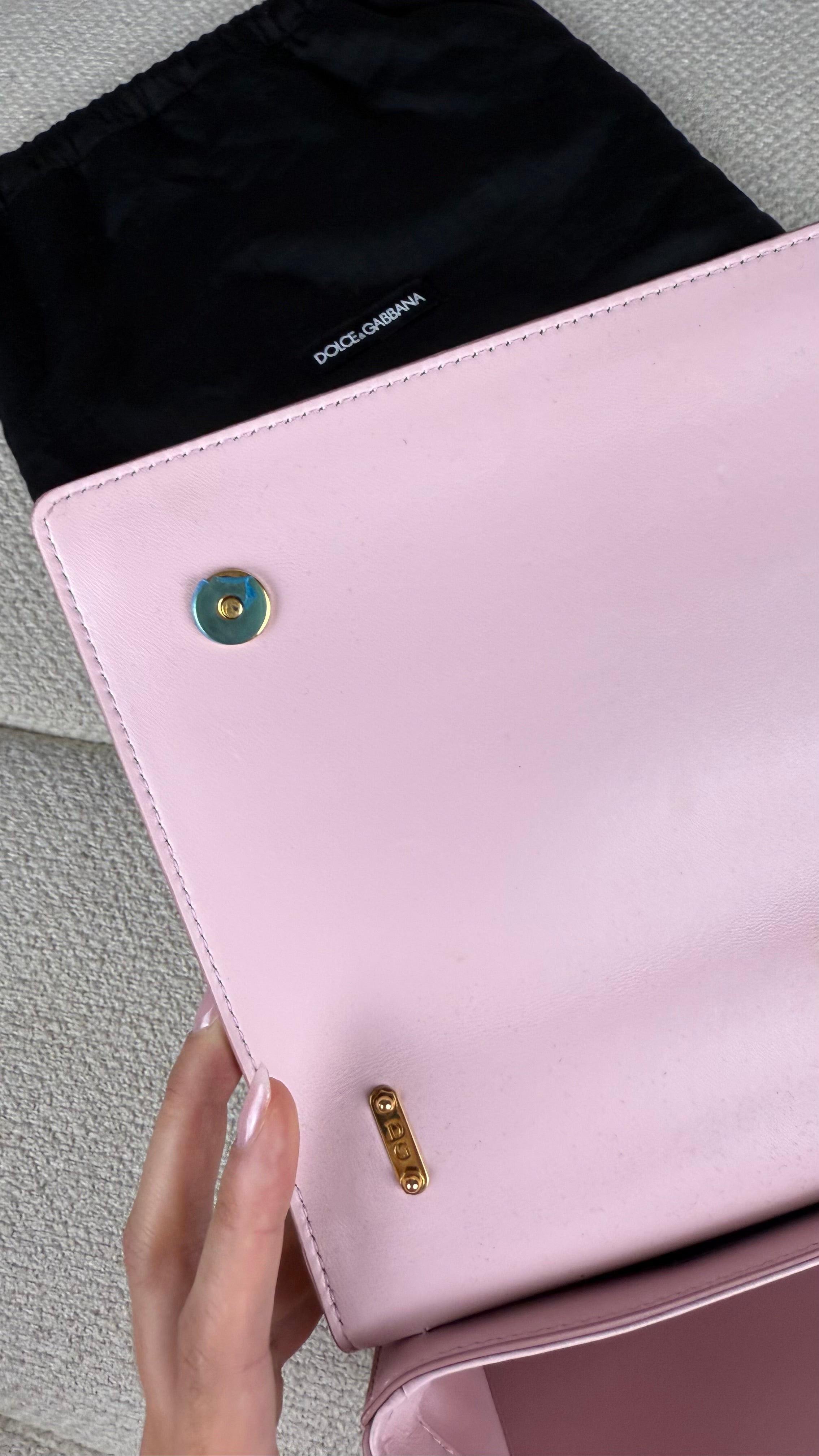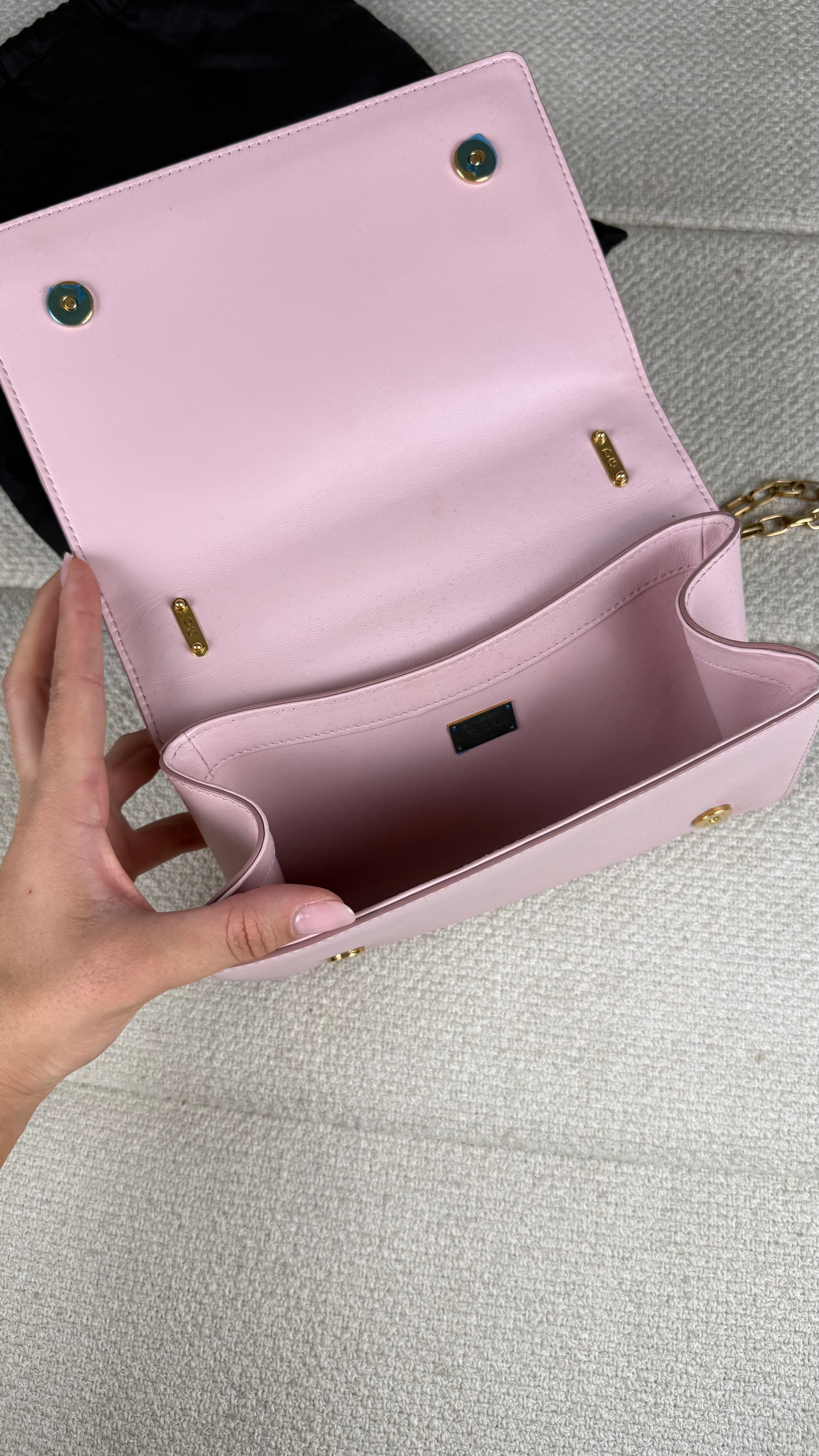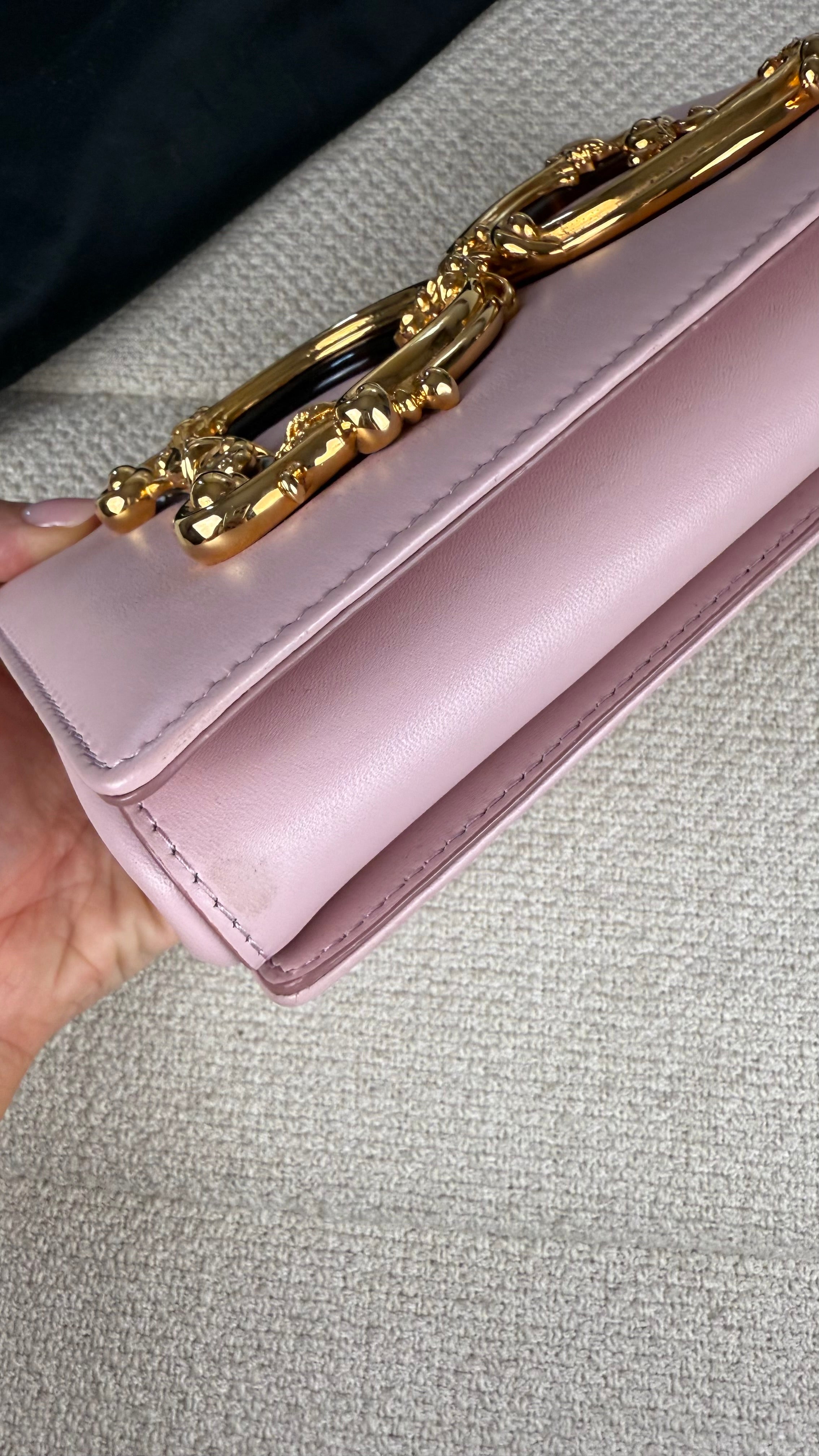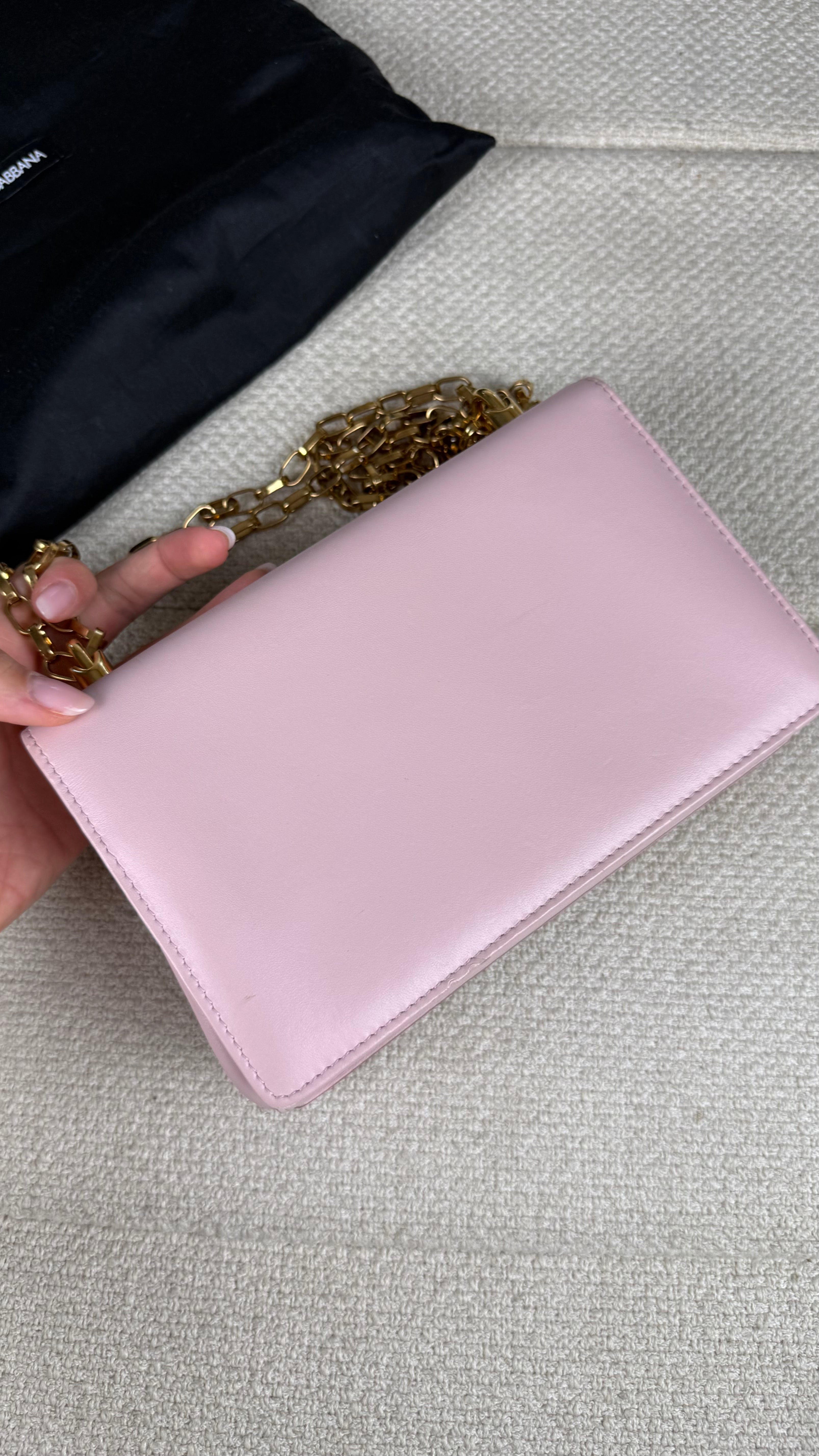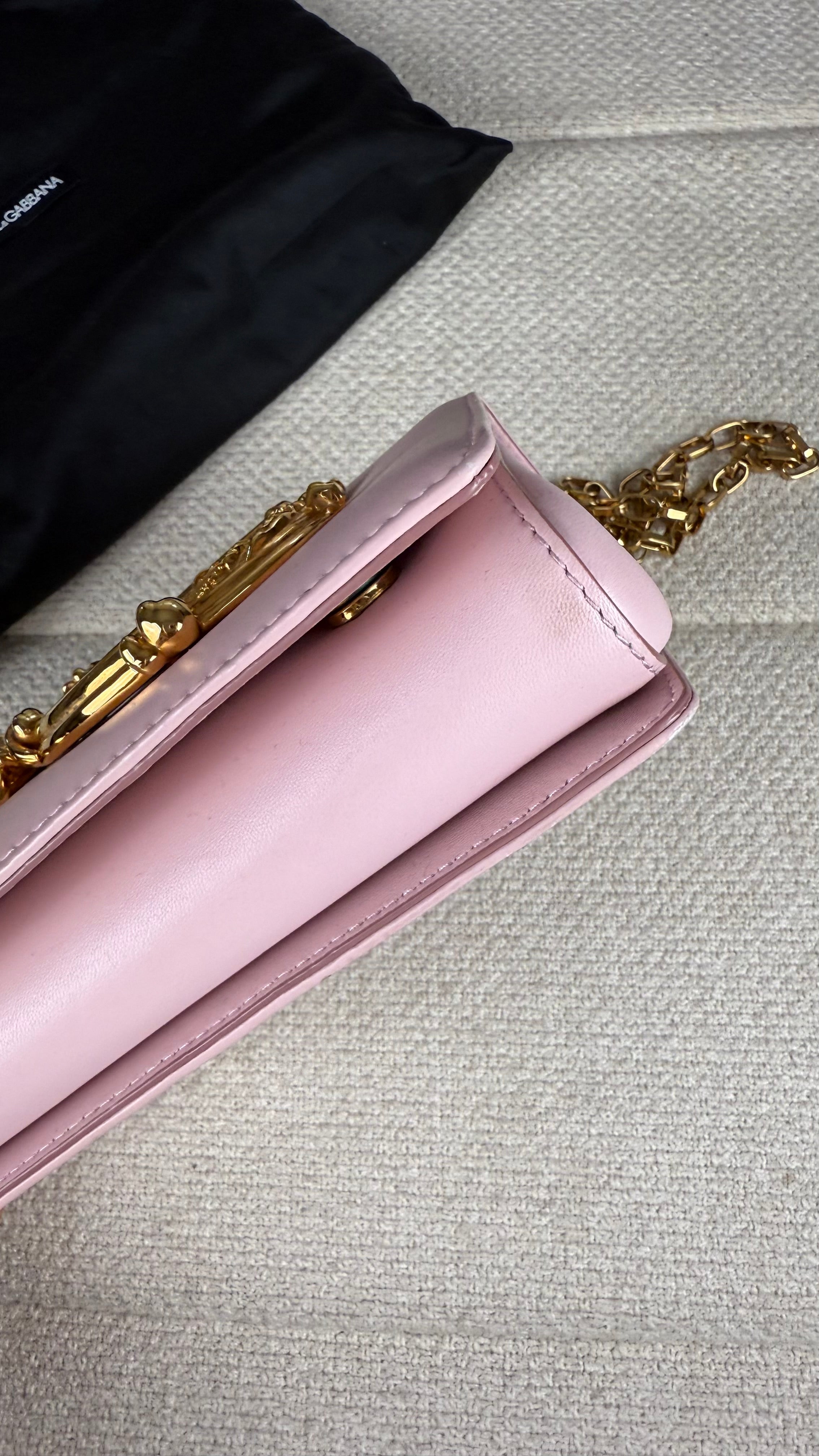 Uma peça icônica da DG Girls, esta bolsa é confeccionada em couro nappa rosa suave (ou metalizado, conforme edição), adornada com o distinto logotipo “DG” barroco em ABS esmaltado com acabamento dourado vintage, que traduz elegância com atitude
