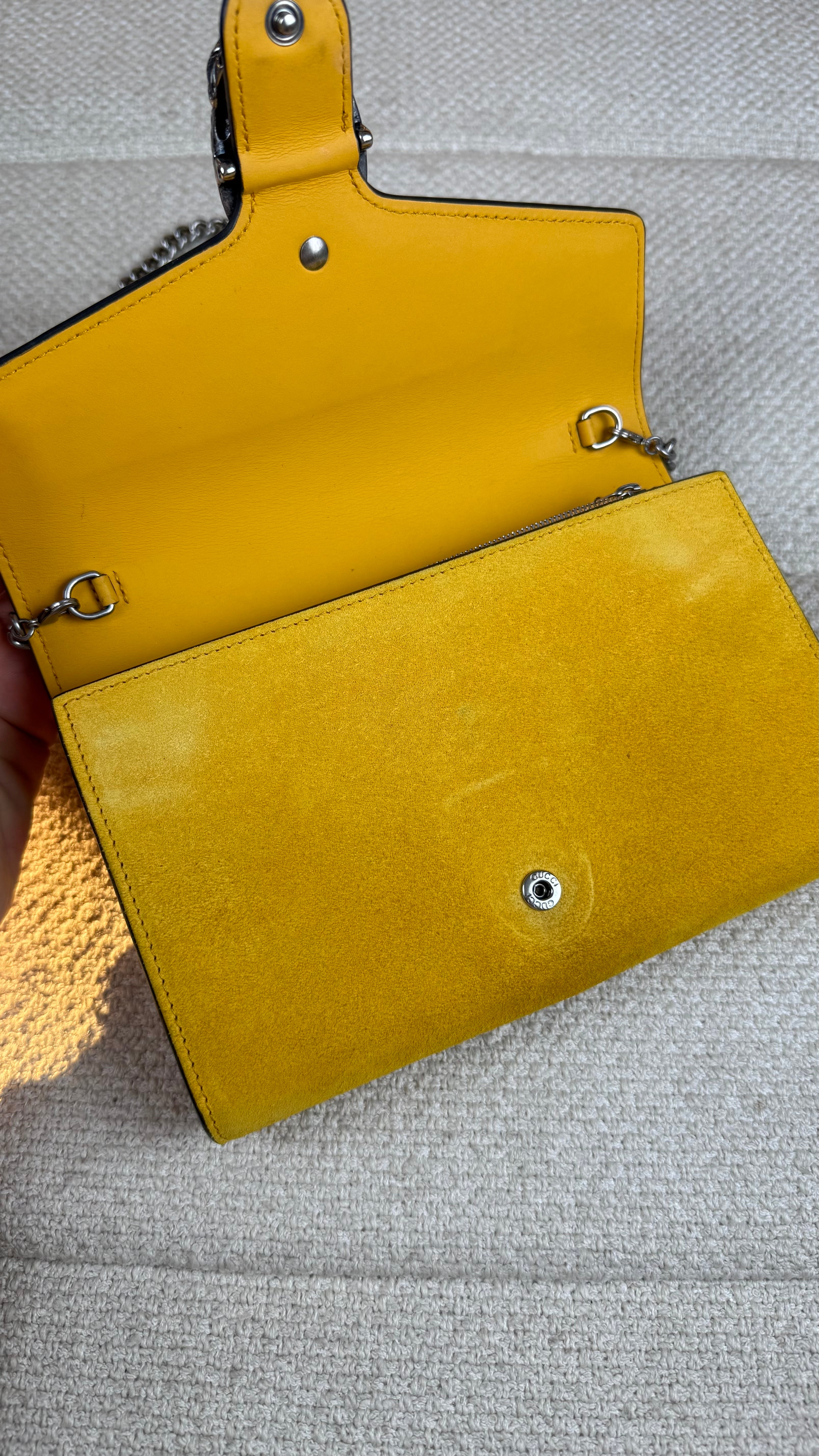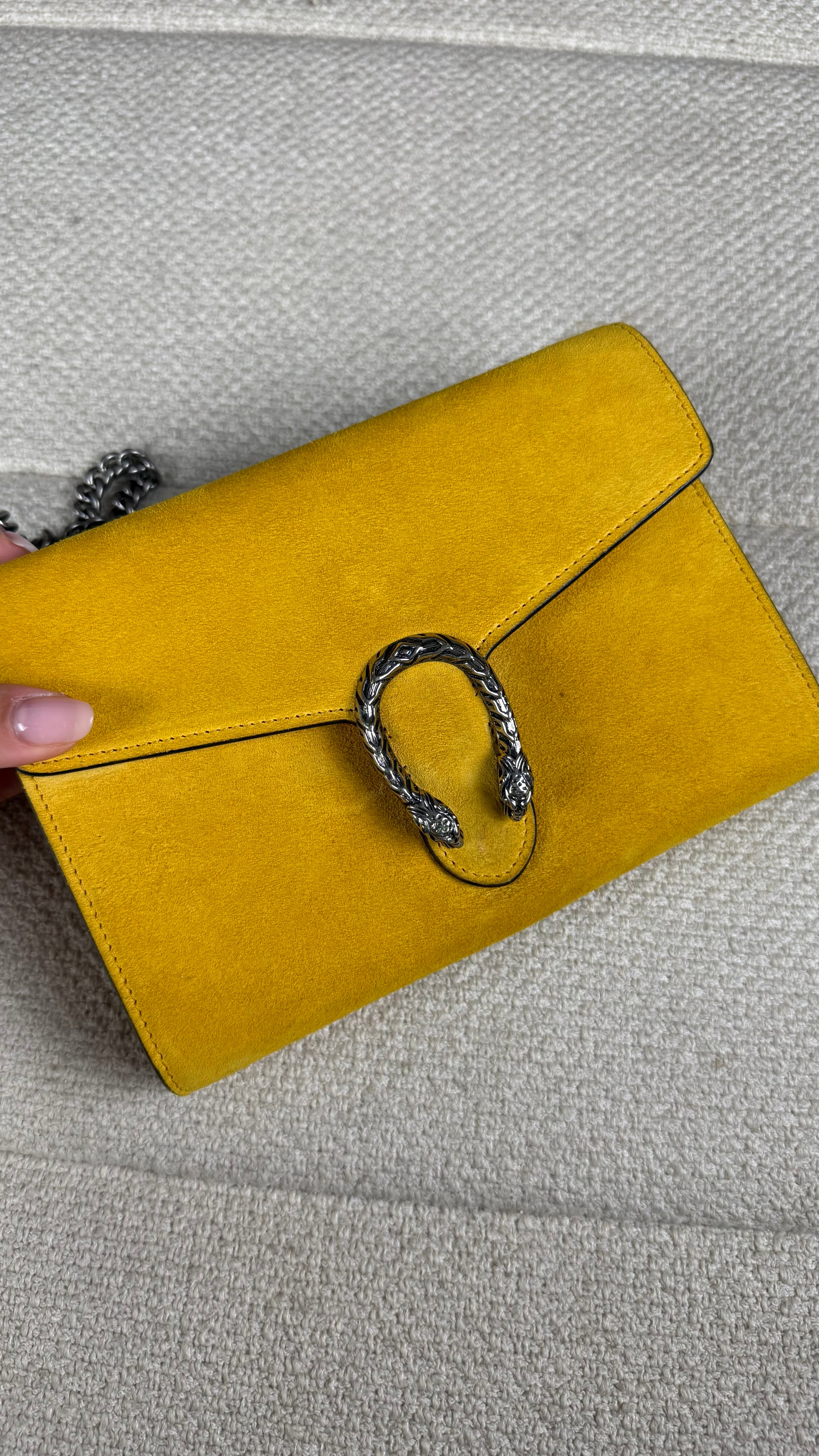 Gucci Dionysus Clutch – Camurça Amarela com Fecho Cabeça de Tigre