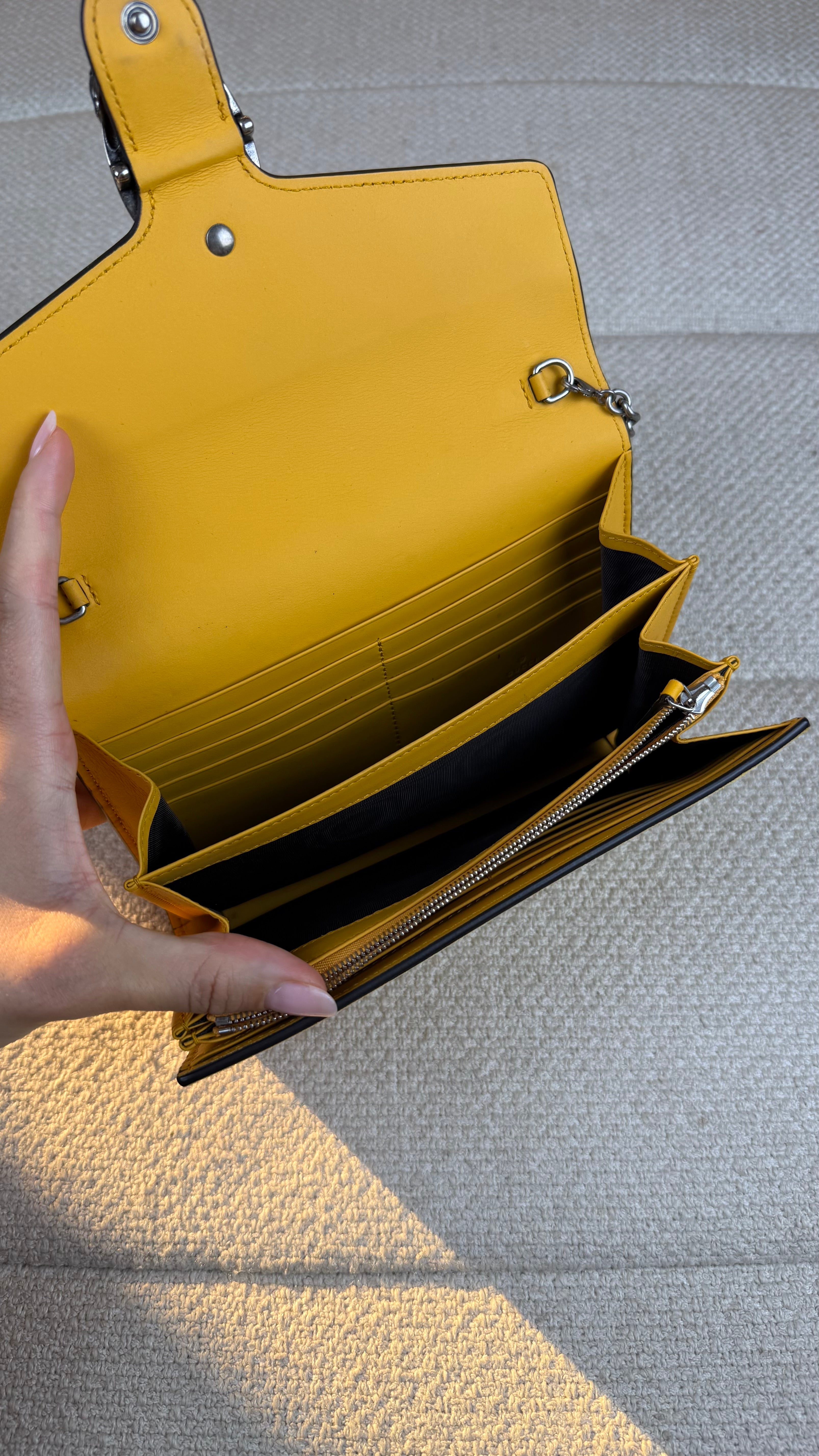 A bolsa Gucci Dionysus Clutch é um ícone moderno da casa italiana, conhecida pela sua elegância ousada e detalhes marcantes. Este modelo, confeccionado em camurça amarela vibrante, apresenta um design estruturado e sofisticado, ideal para elevar instantaneamente qualquer visual.