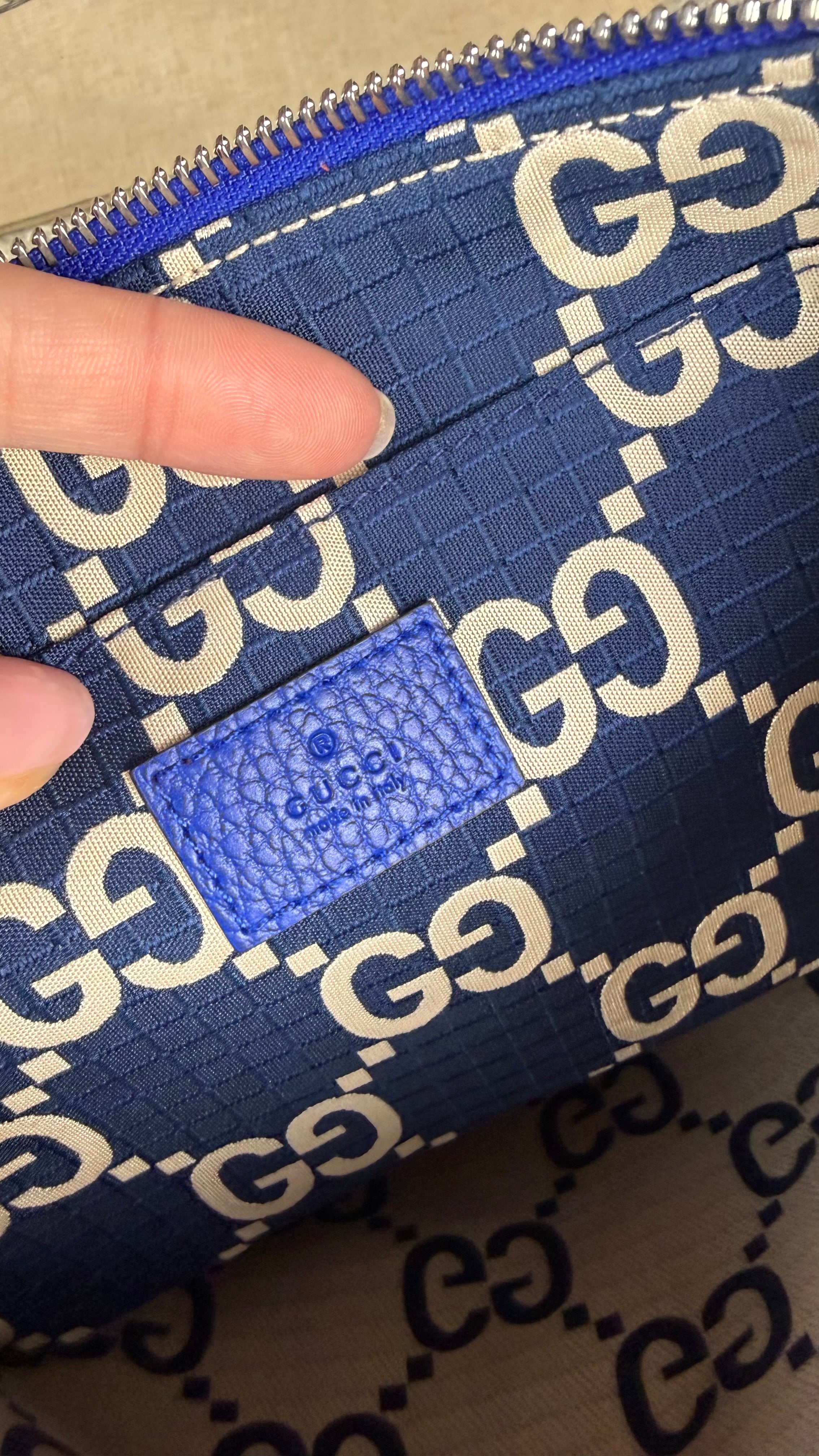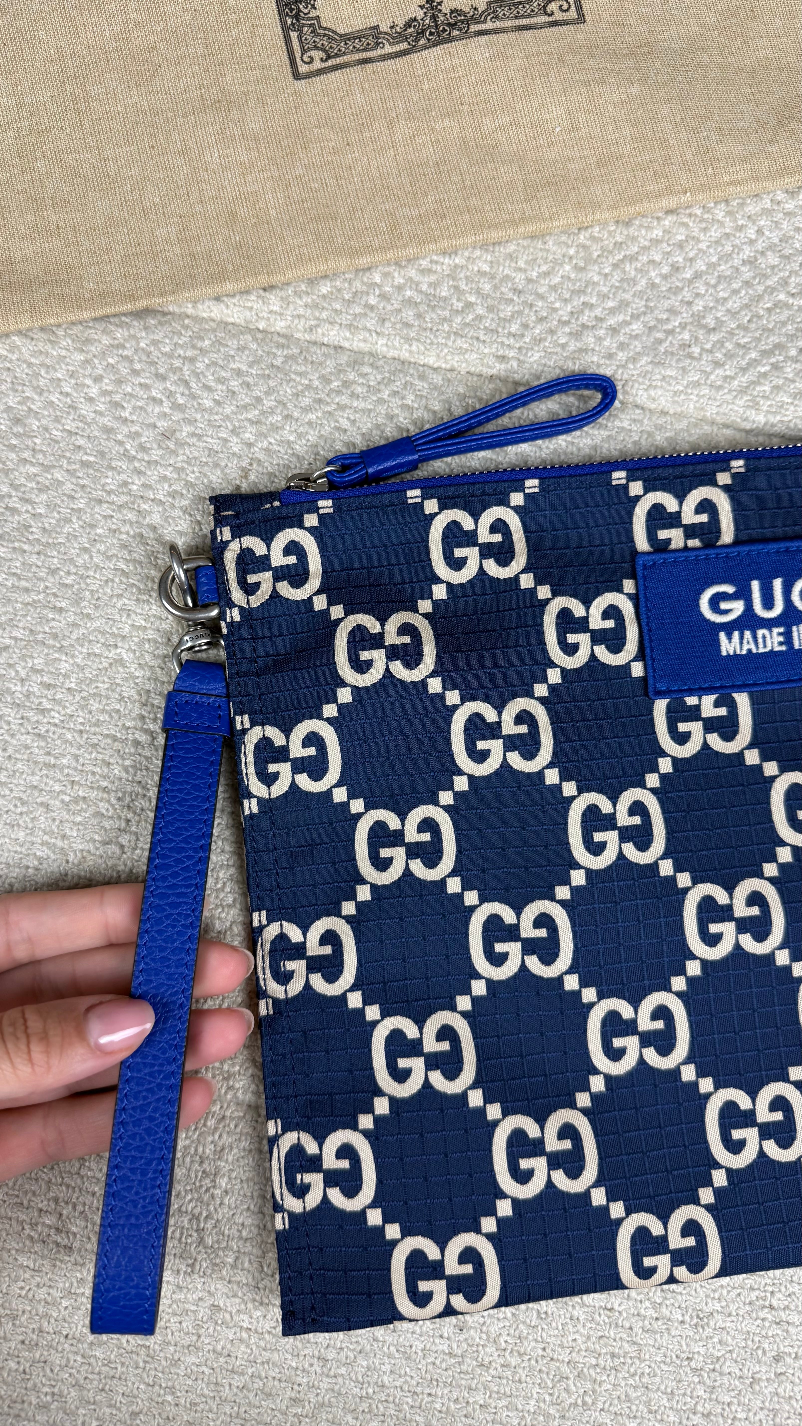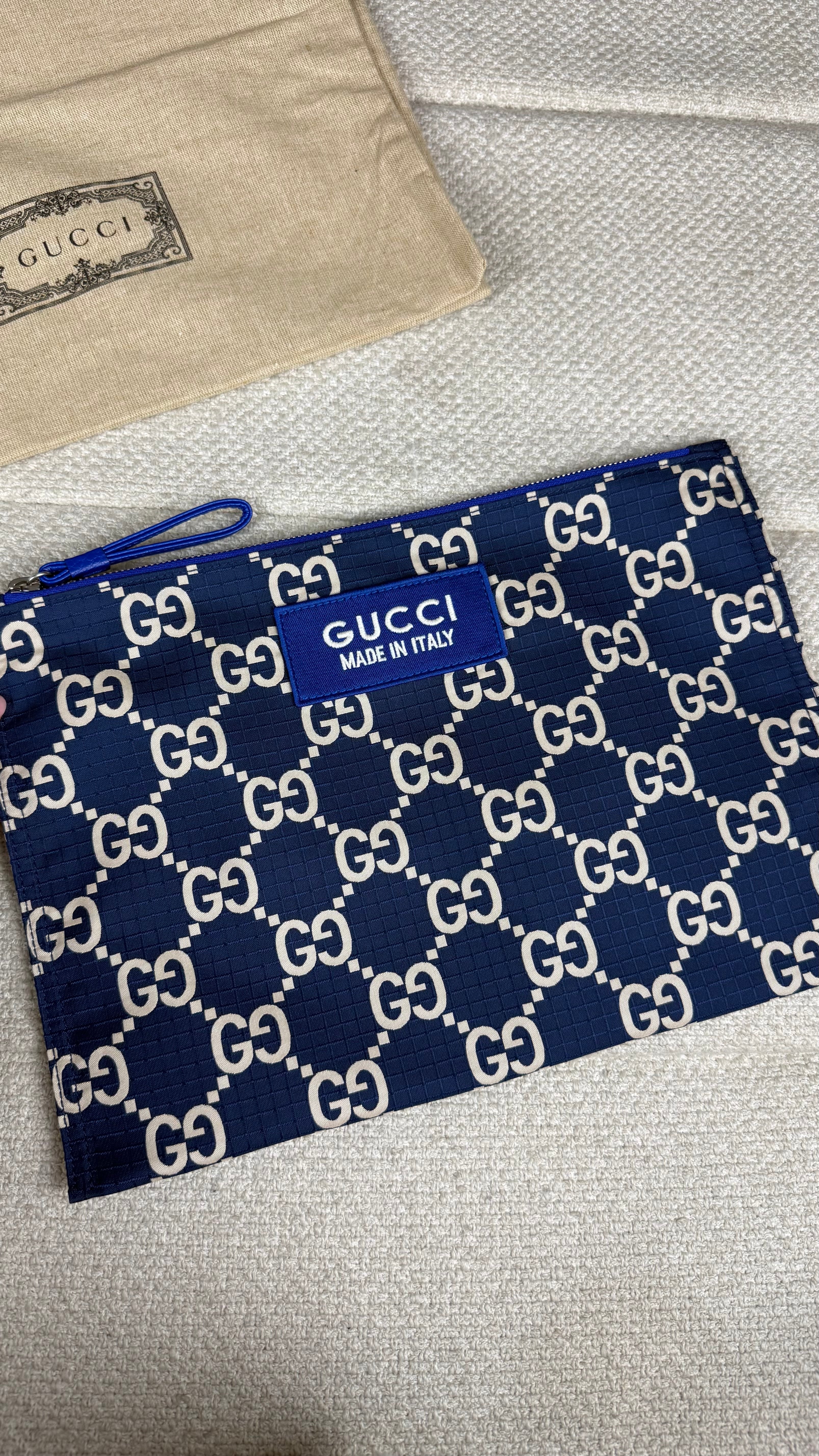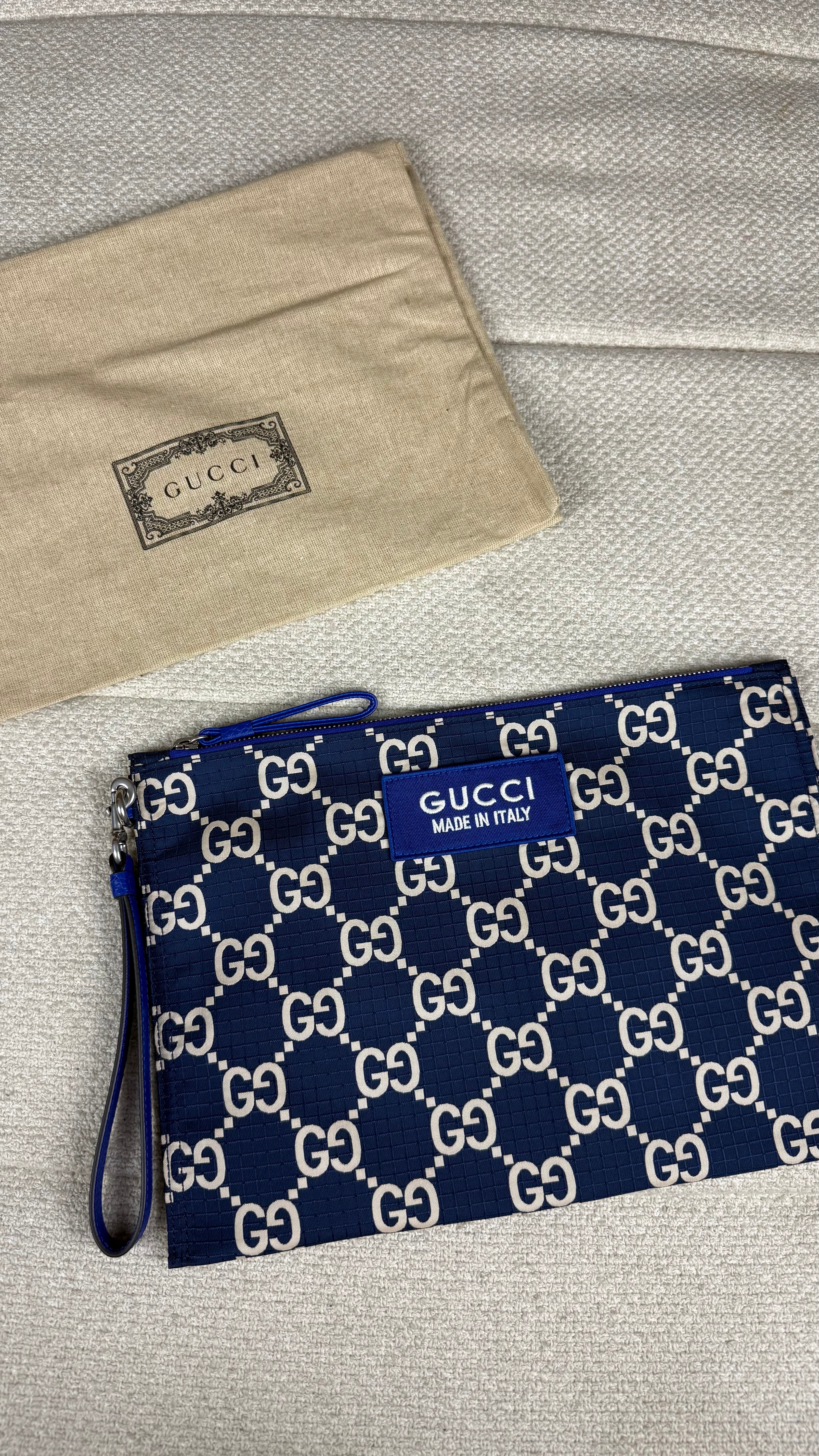 A Gucci GG Canvas Ripstop Pouch é uma clutch moderna e versátil, perfeita para quem busca estilo e praticidade no dia a dia. Confeccionada no material Ripstop — conhecido por sua resistência e leveza — o acessório apresenta o icônico padrão GG em azul e branco, criando um visual marcante e contemporâneo.
