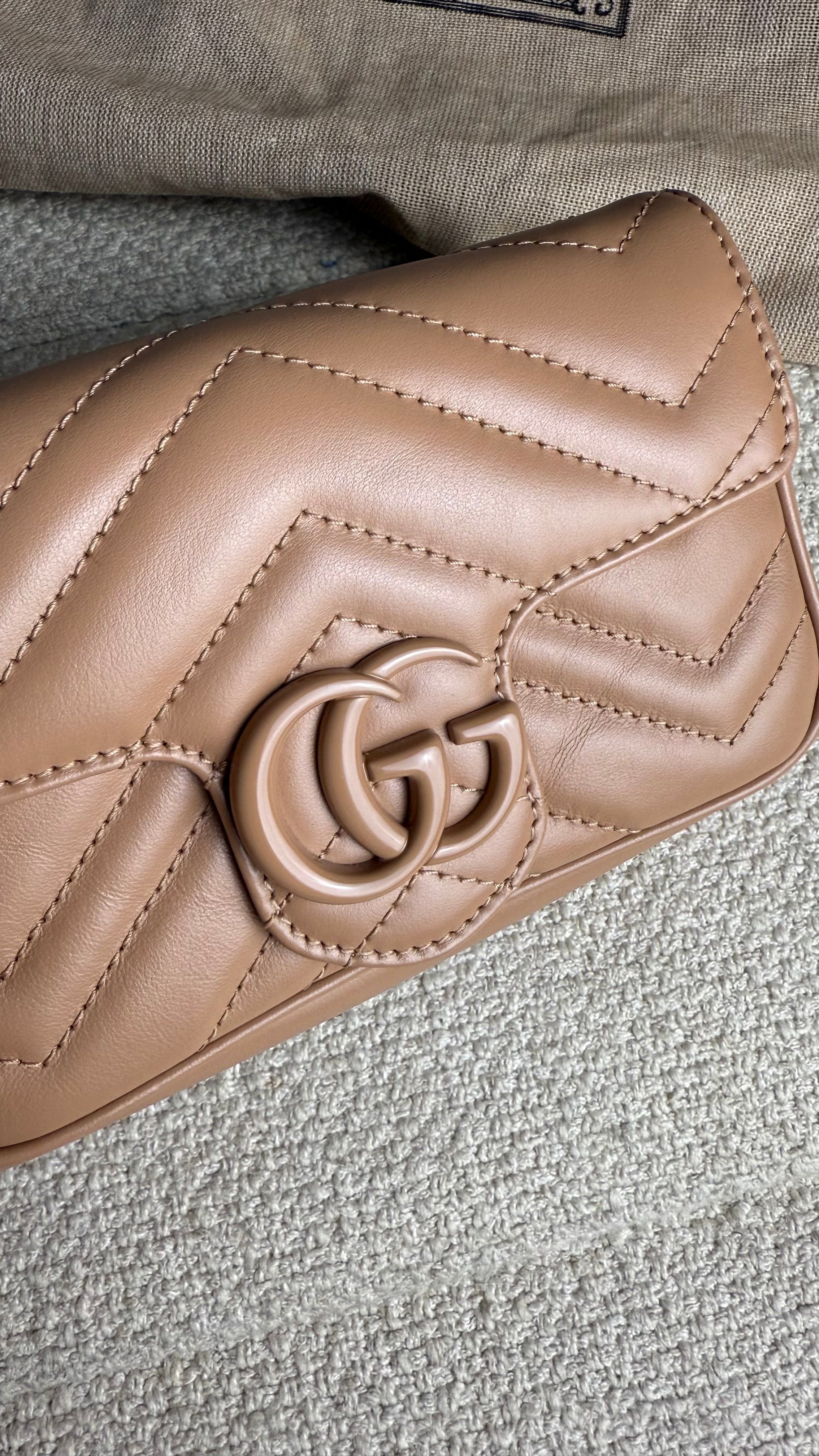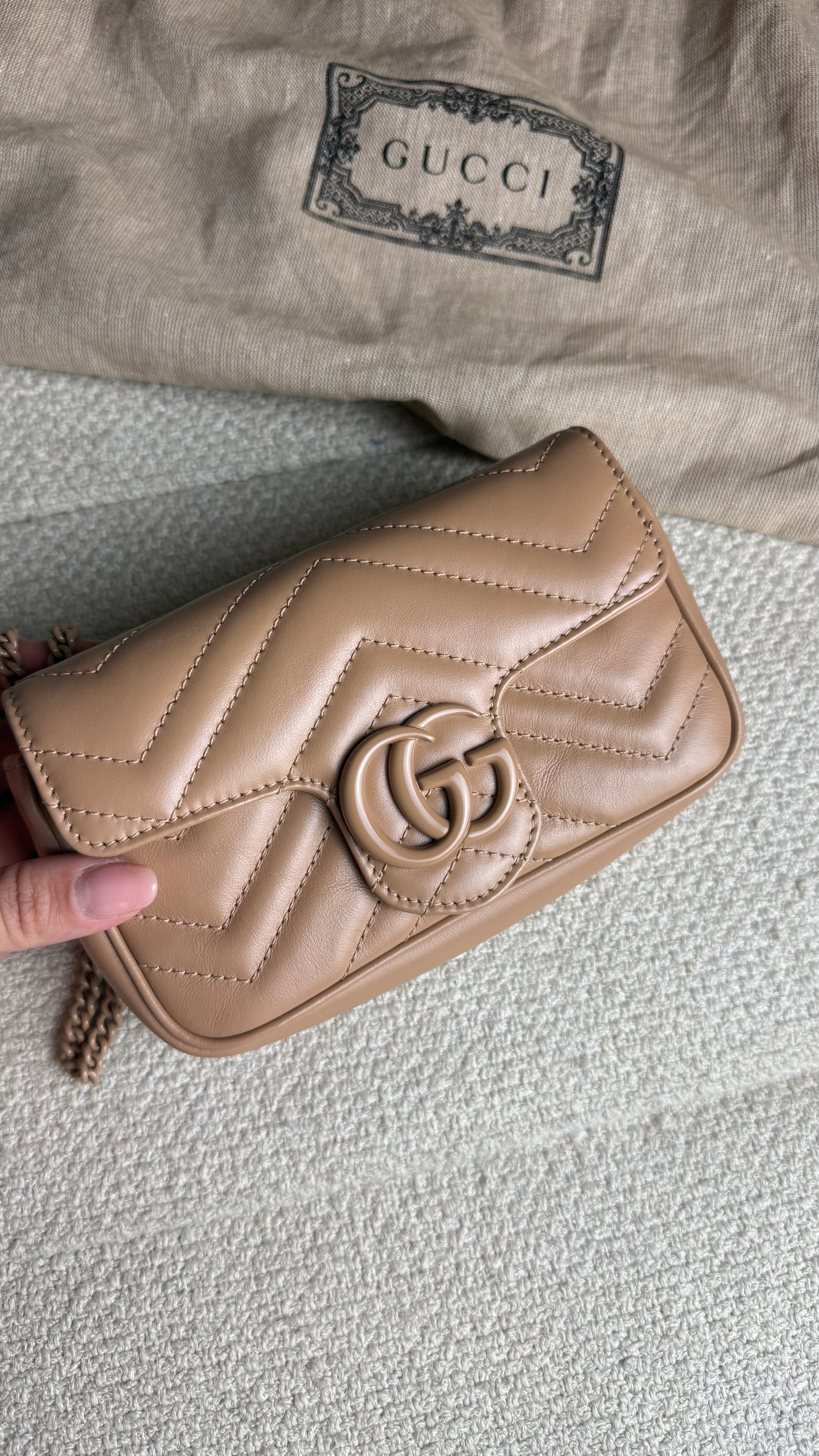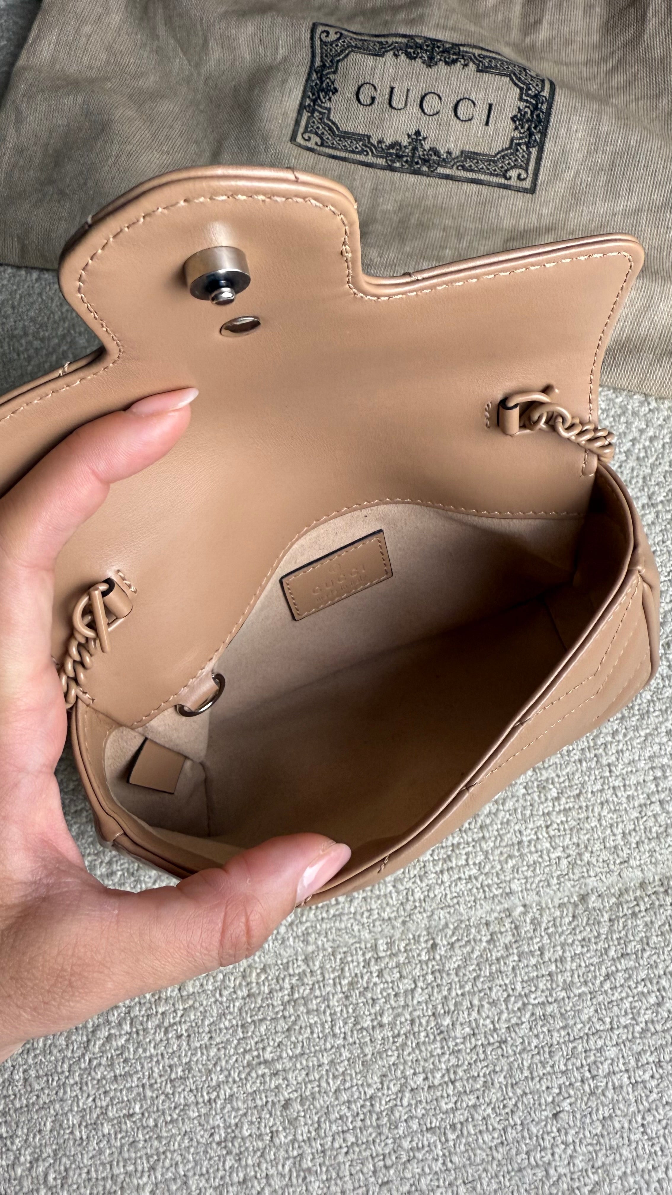 A Gucci GG Marmont Mini é uma bolsa compacta e elegante, feita em couro matelassé com padrão em chevron e o emblemático duplo G na parte frontal. É uma peça sofisticada e versátil, perfeita para o dia e a noite.