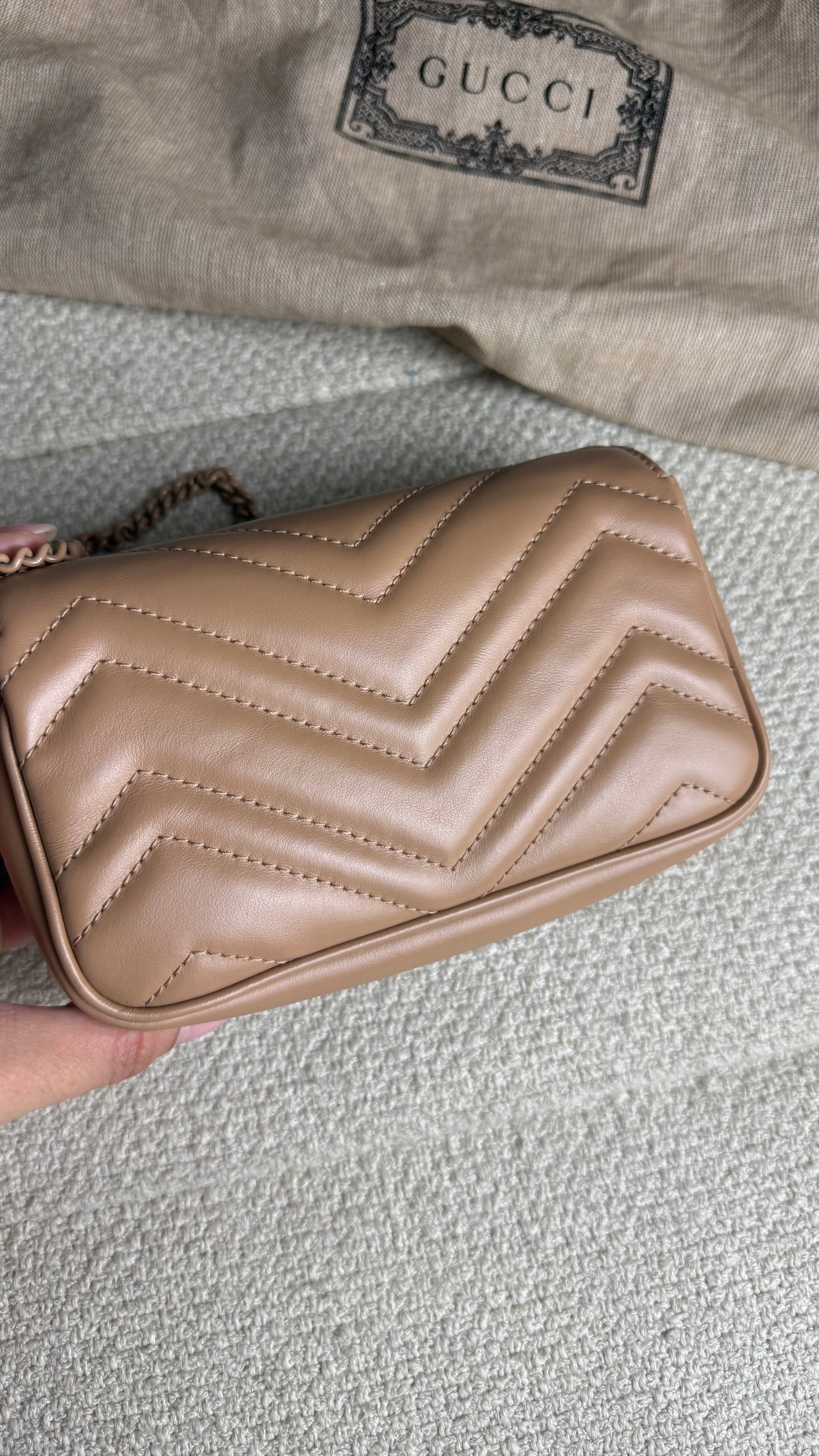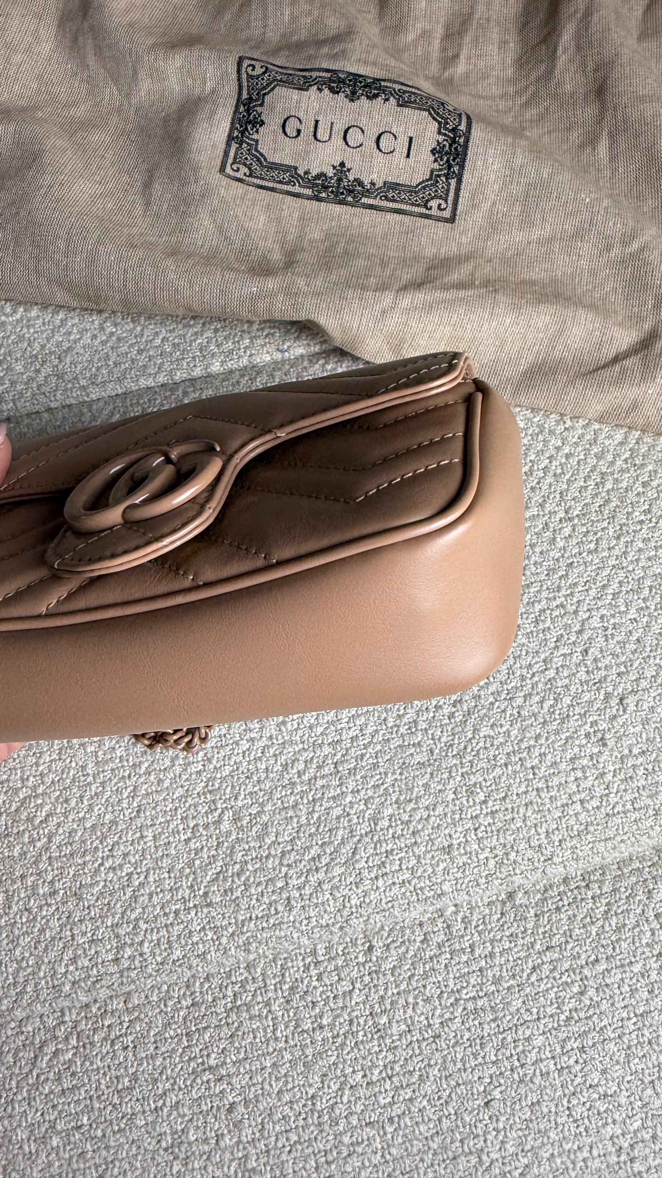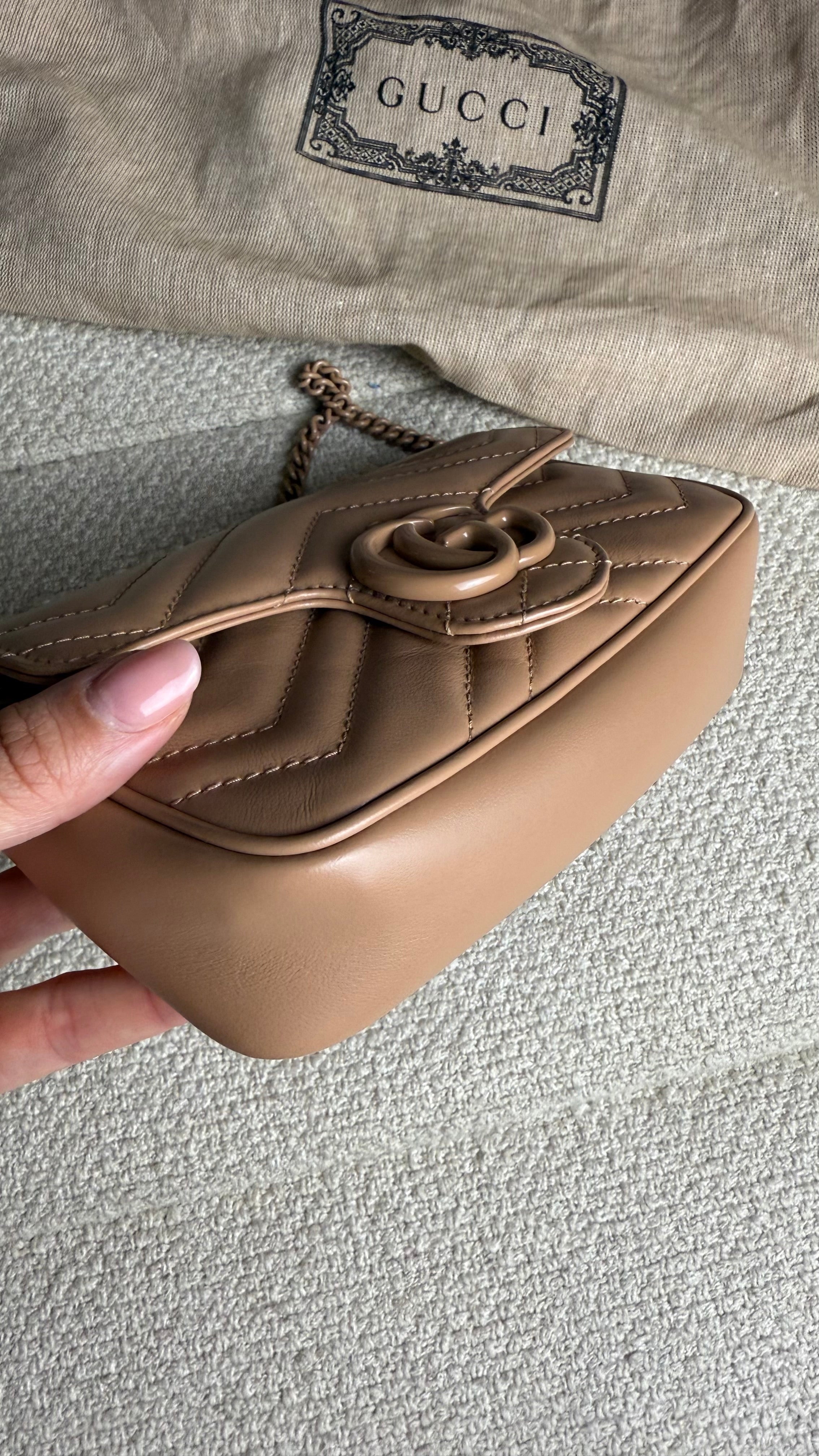 A Gucci GG Marmont Mini é uma bolsa compacta e elegante, feita em couro matelassé com padrão em chevron e o emblemático duplo G na parte frontal. É uma peça sofisticada e versátil, perfeita para o dia e a noite.