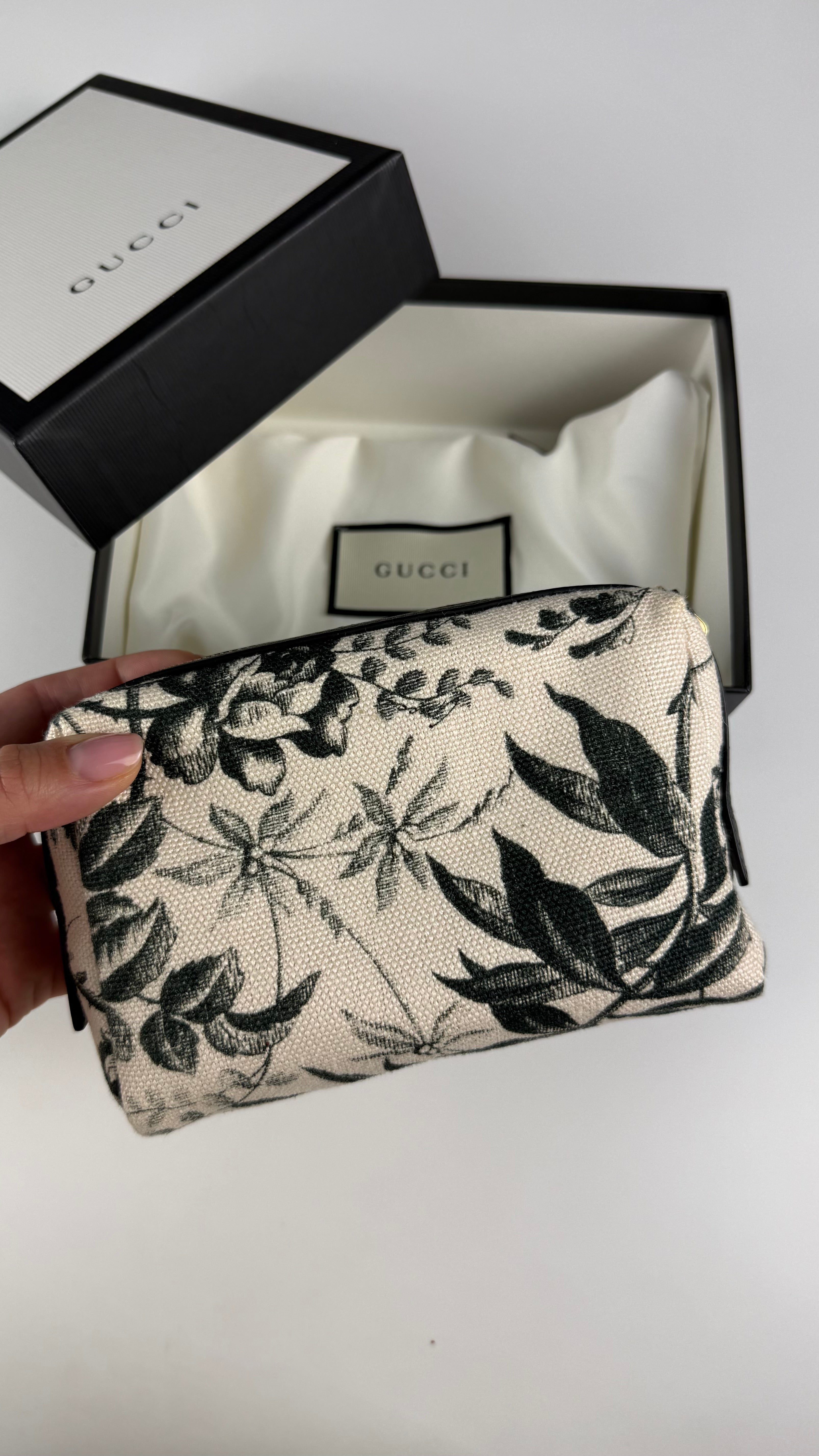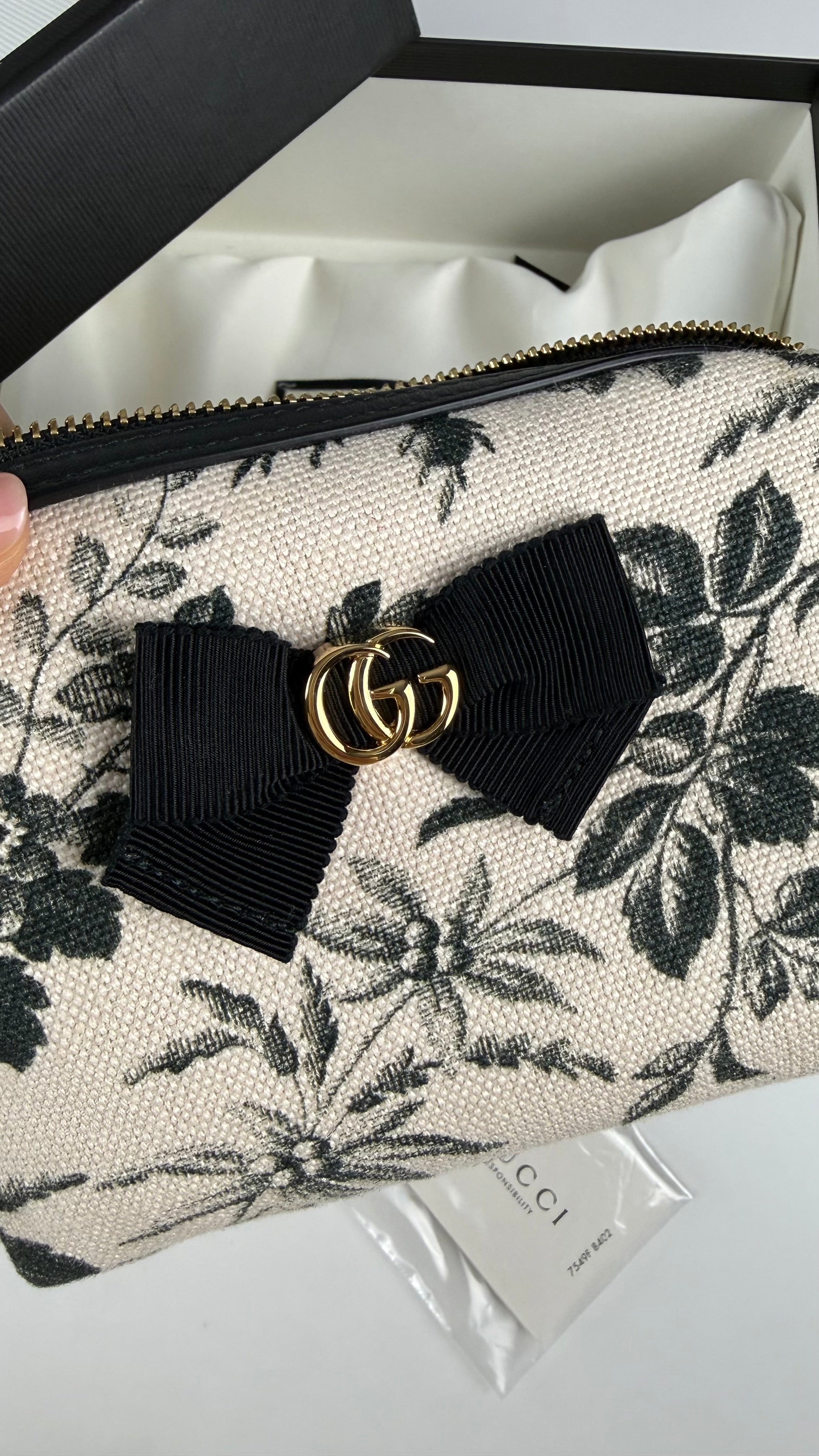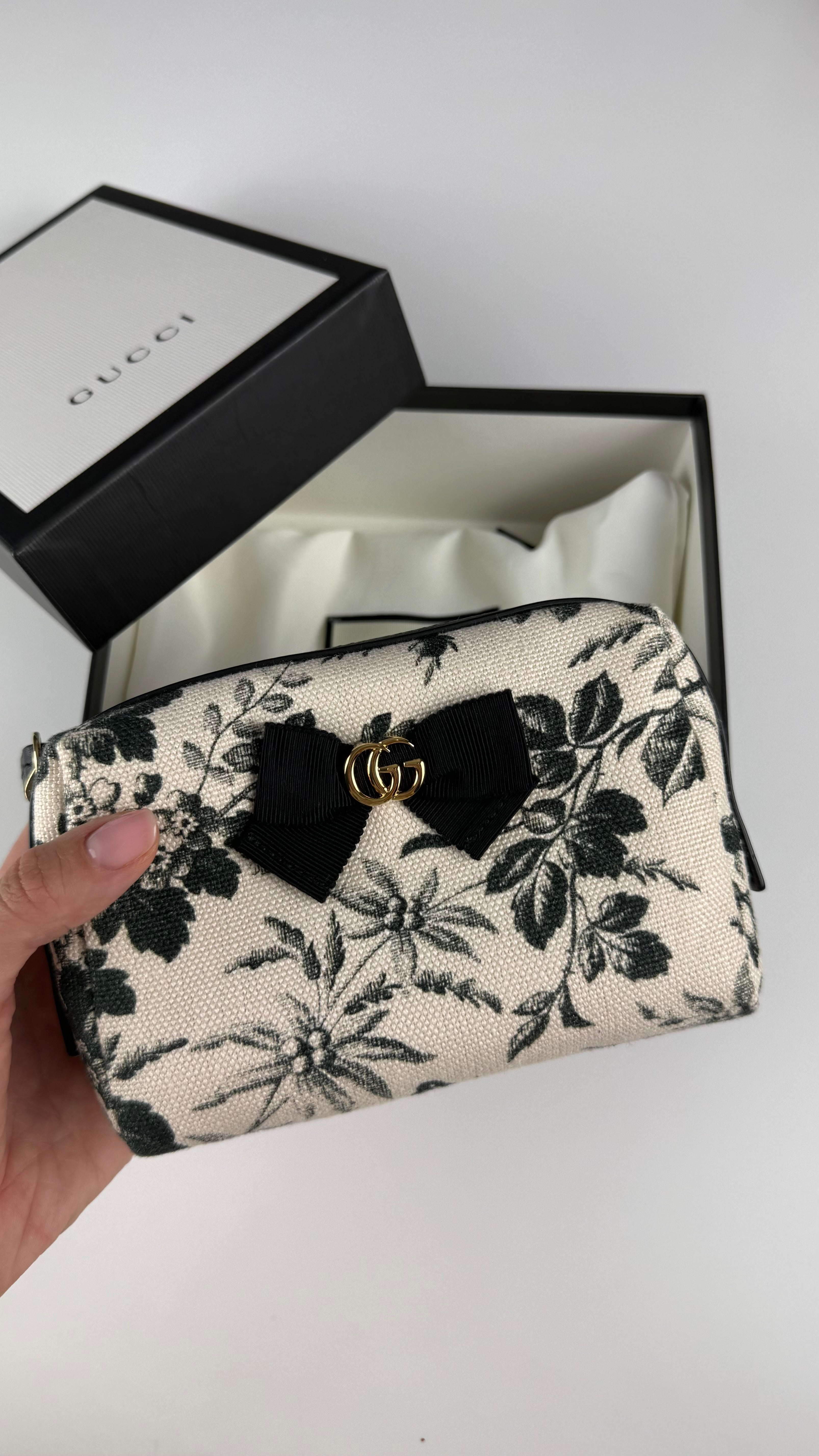 Esta elegante pouch da Gucci combina o charme romântico da Maison italiana com um design delicado e feminino. É perfeita para usar como nécessaire, bolsa de mão, ou organizador dentro de malas maiores.