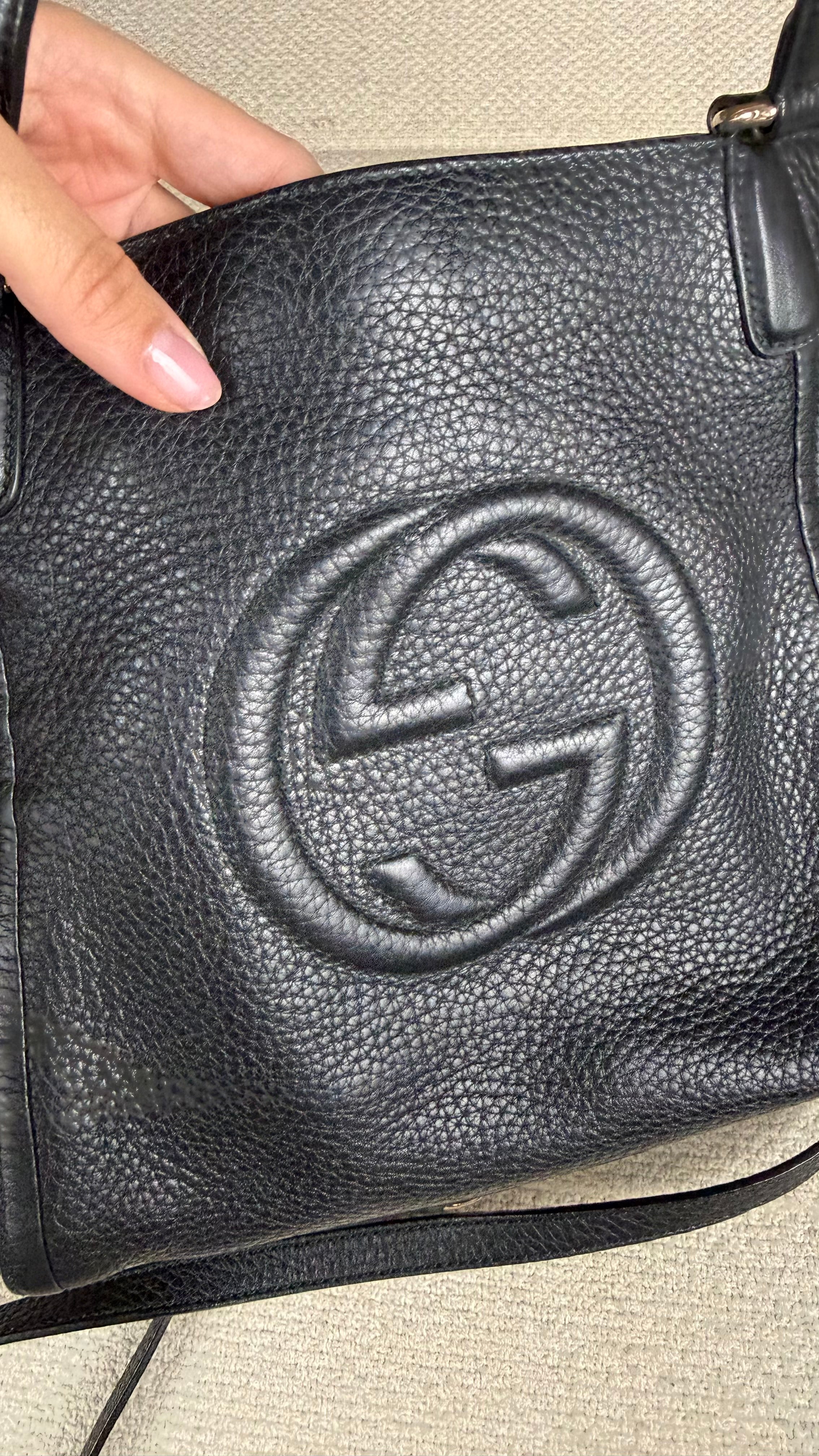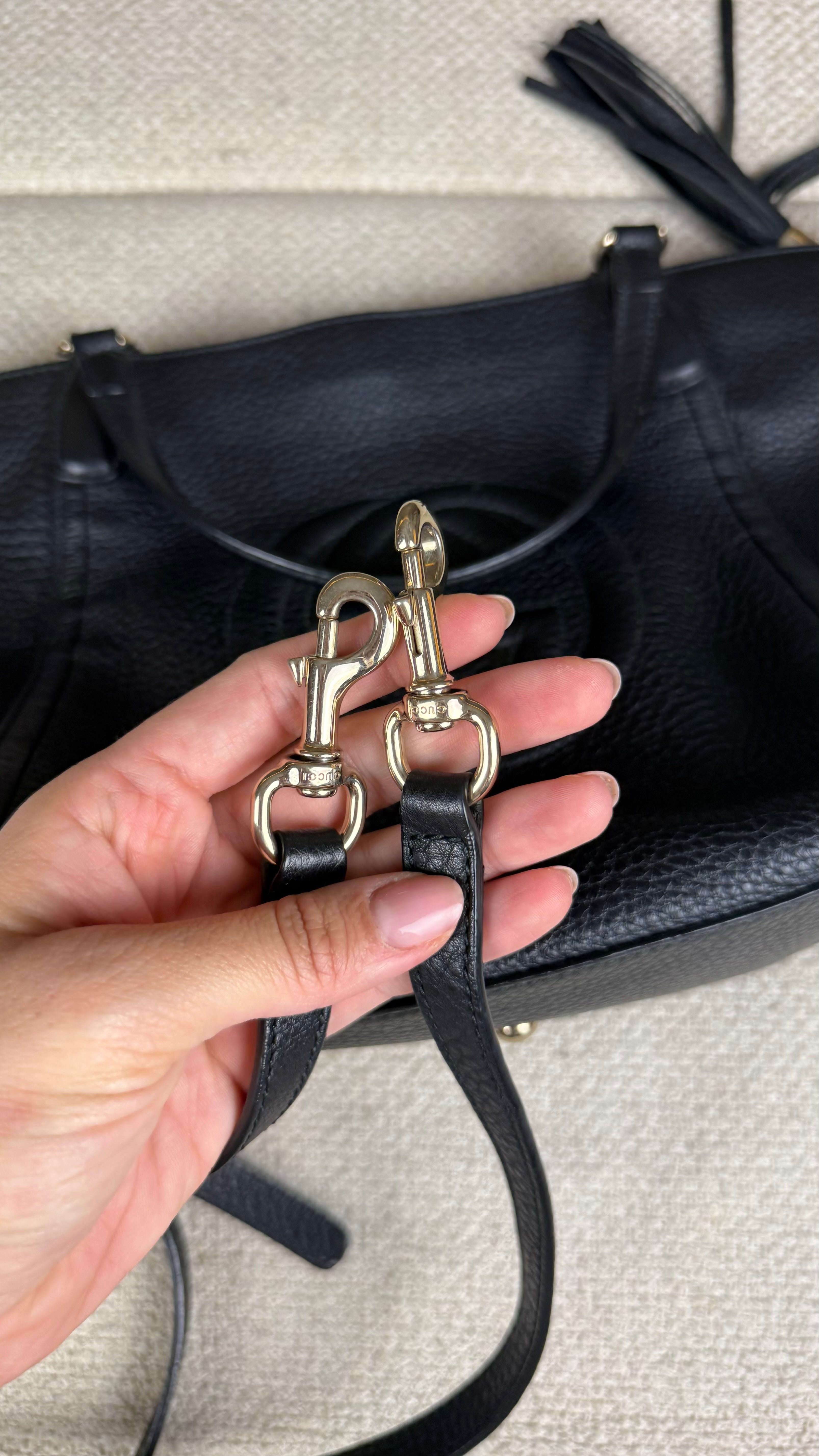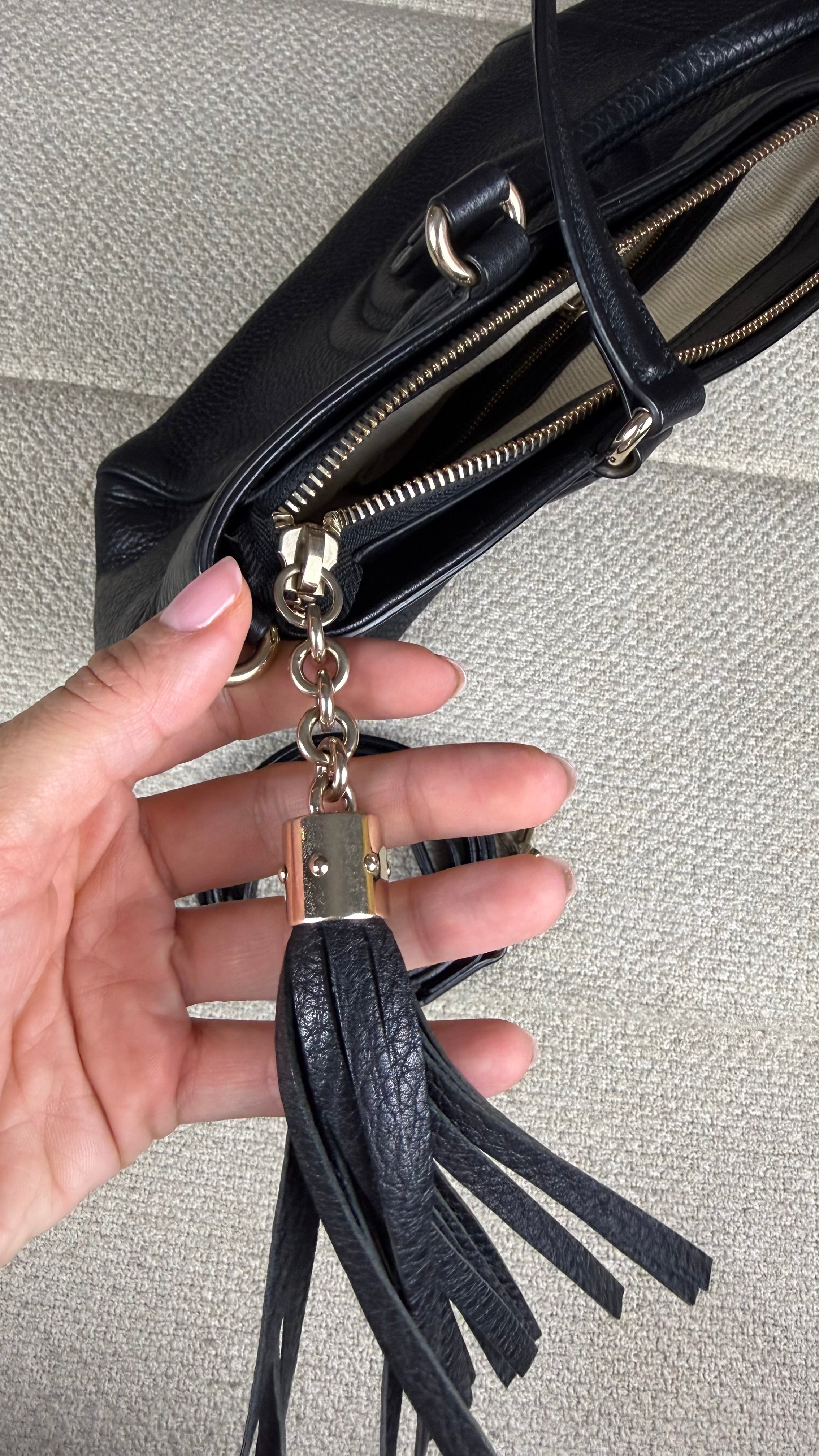 A Gucci Small Soho Bag é uma peça icónica da casa italiana, conhecida pelo seu design elegante e descontraído. Confeccionada em couro granulado preto de alta qualidade, apresenta o emblemático logótipo GG em relevo na parte frontal e o inconfundível pormenor em borla de couro (tassel), símbolo de sofisticação e movimento.