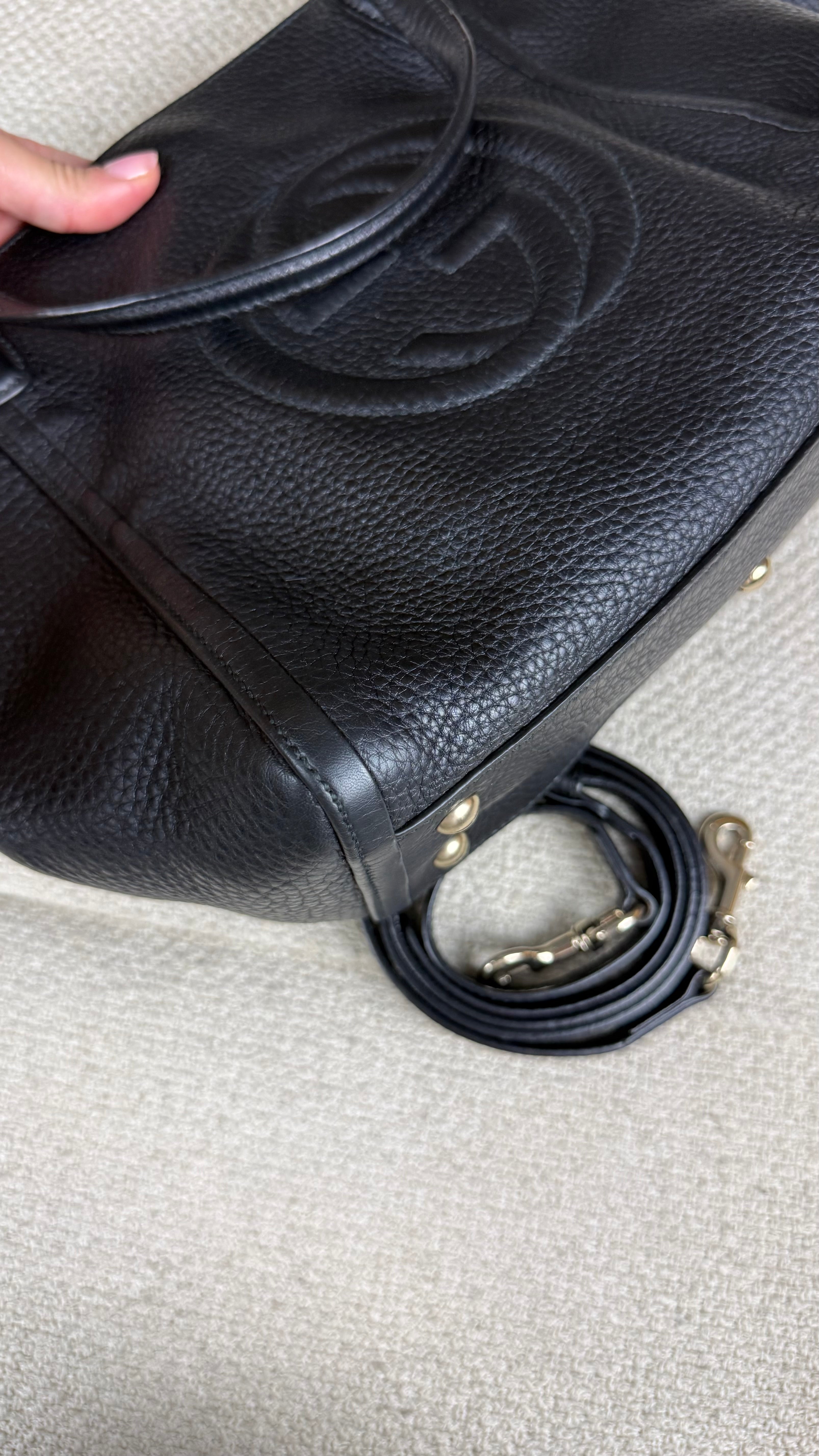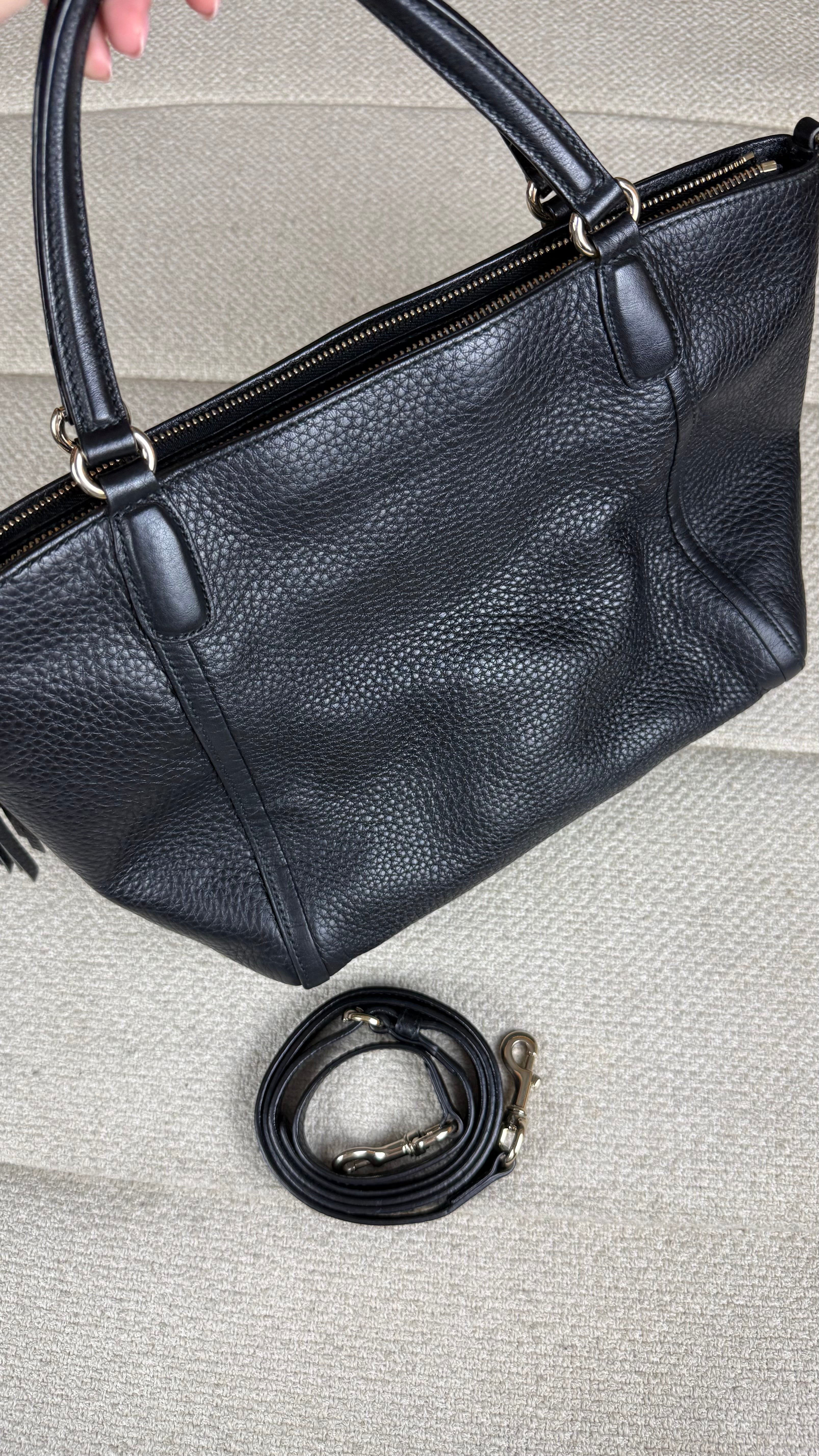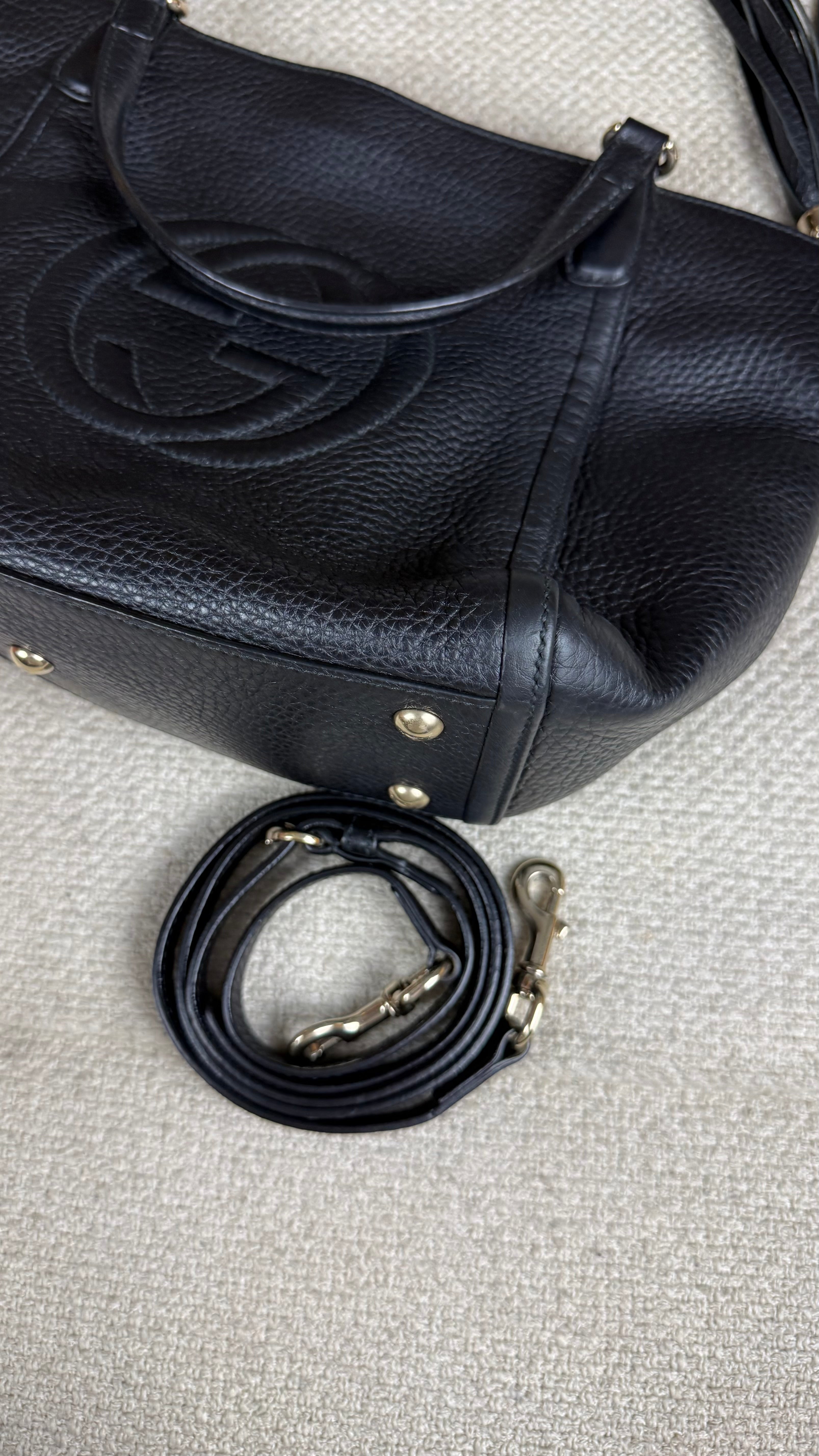 A Gucci Small Soho Bag é uma peça icónica da casa italiana, conhecida pelo seu design elegante e descontraído. Confeccionada em couro granulado preto de alta qualidade, apresenta o emblemático logótipo GG em relevo na parte frontal e o inconfundível pormenor em borla de couro (tassel), símbolo de sofisticação e movimento.