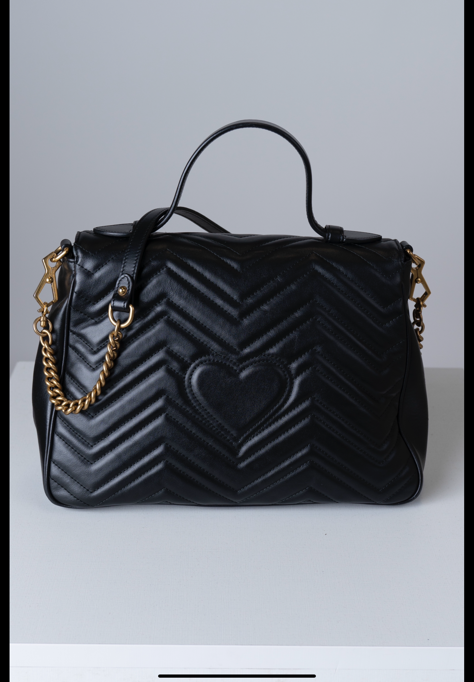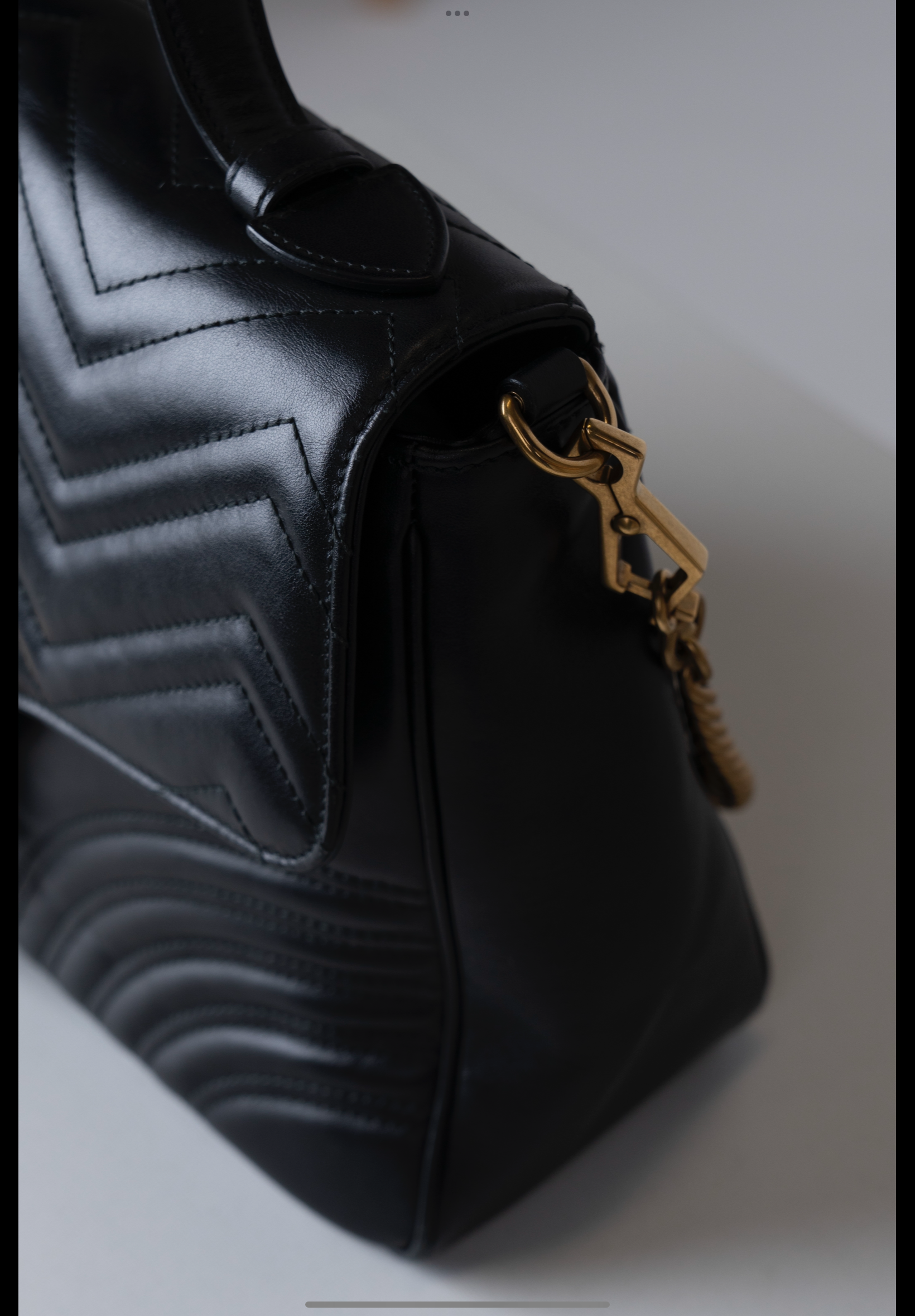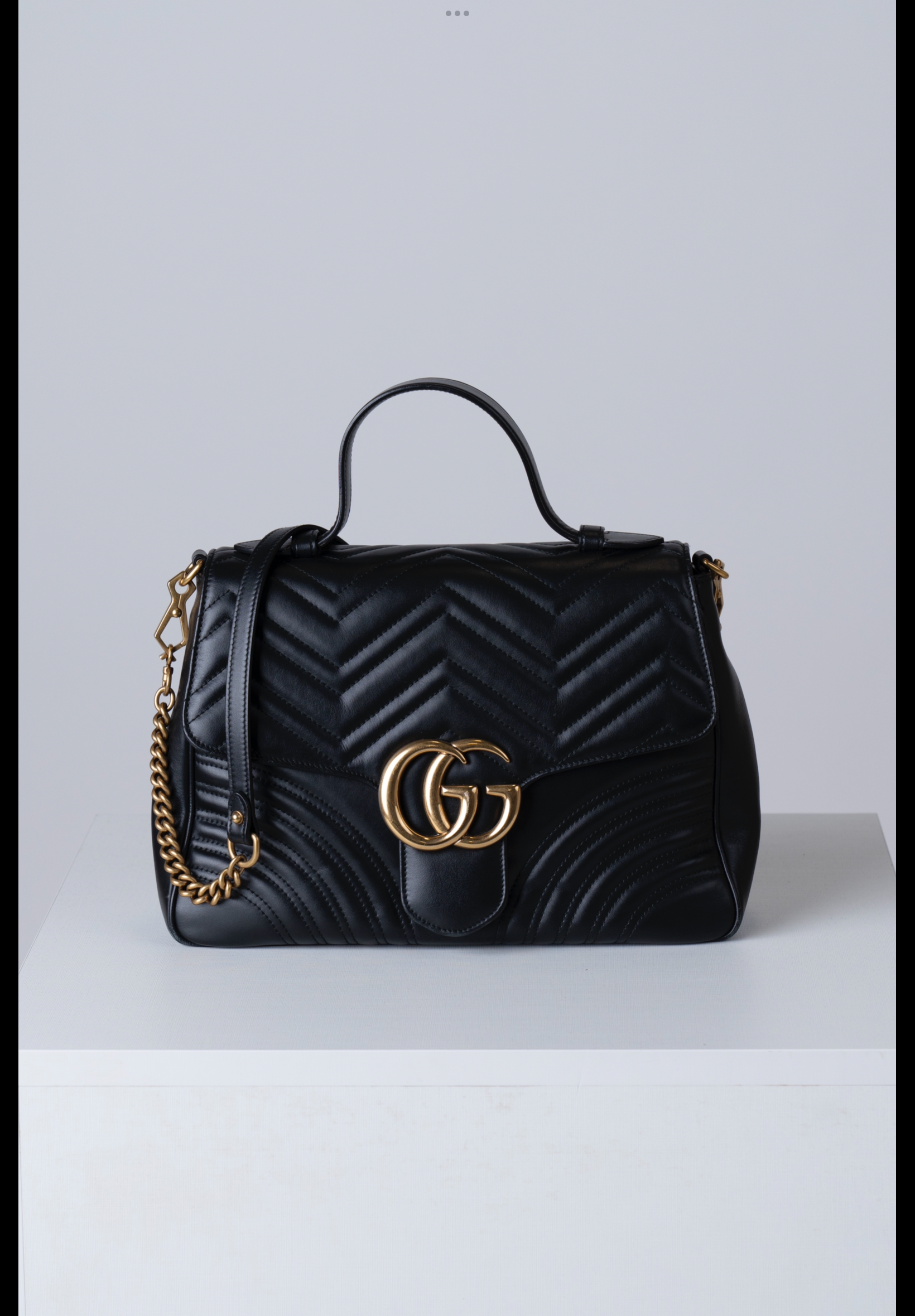A Gucci GG Marmont Top Handle é uma bolsa sofisticada que combina o estilo clássico da Gucci com detalhes contemporâneos. Parte da coleção Marmont, esta peça destaca-se pelo seu design estruturado e pelo emblemático logótipo Double G.