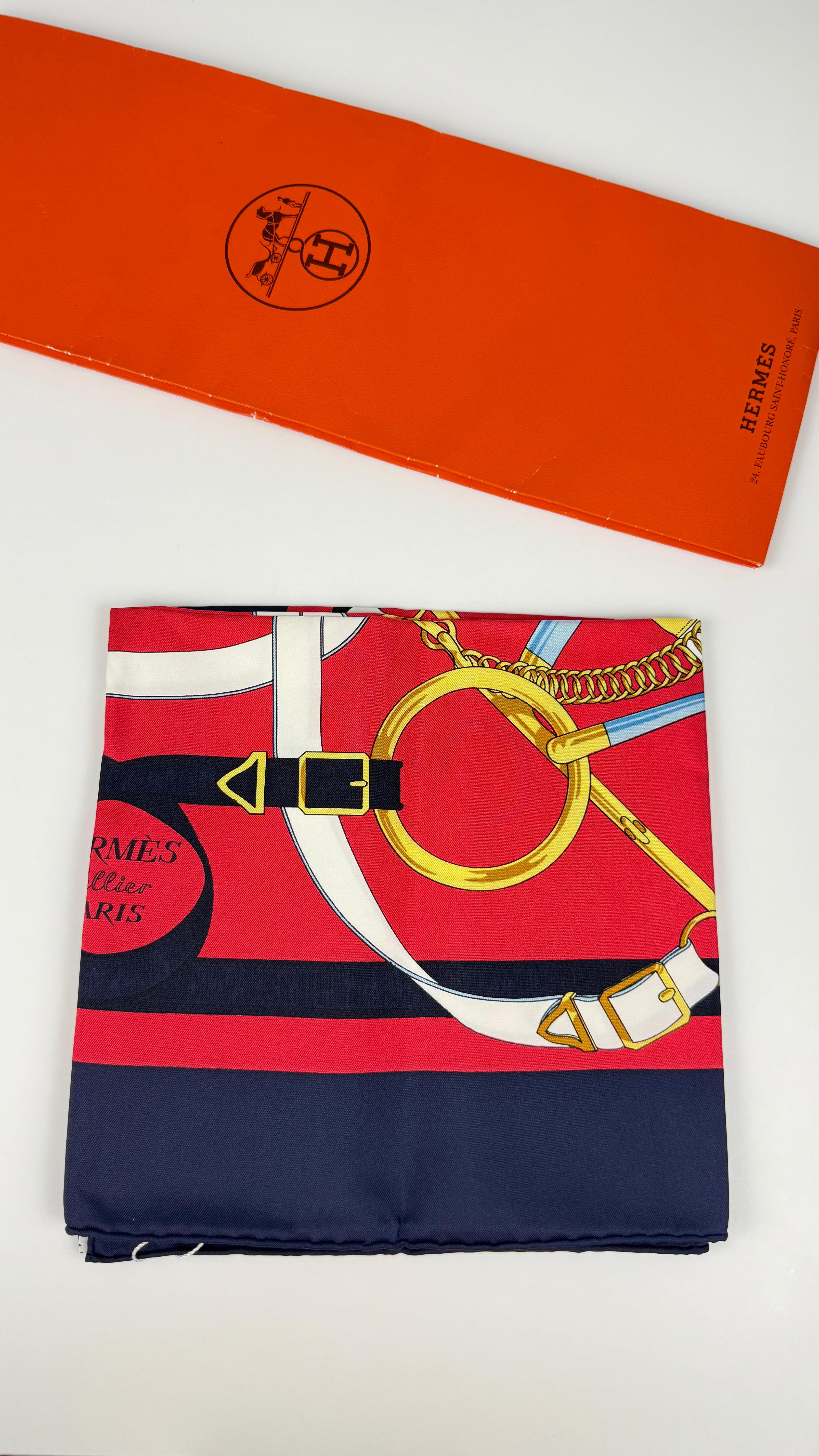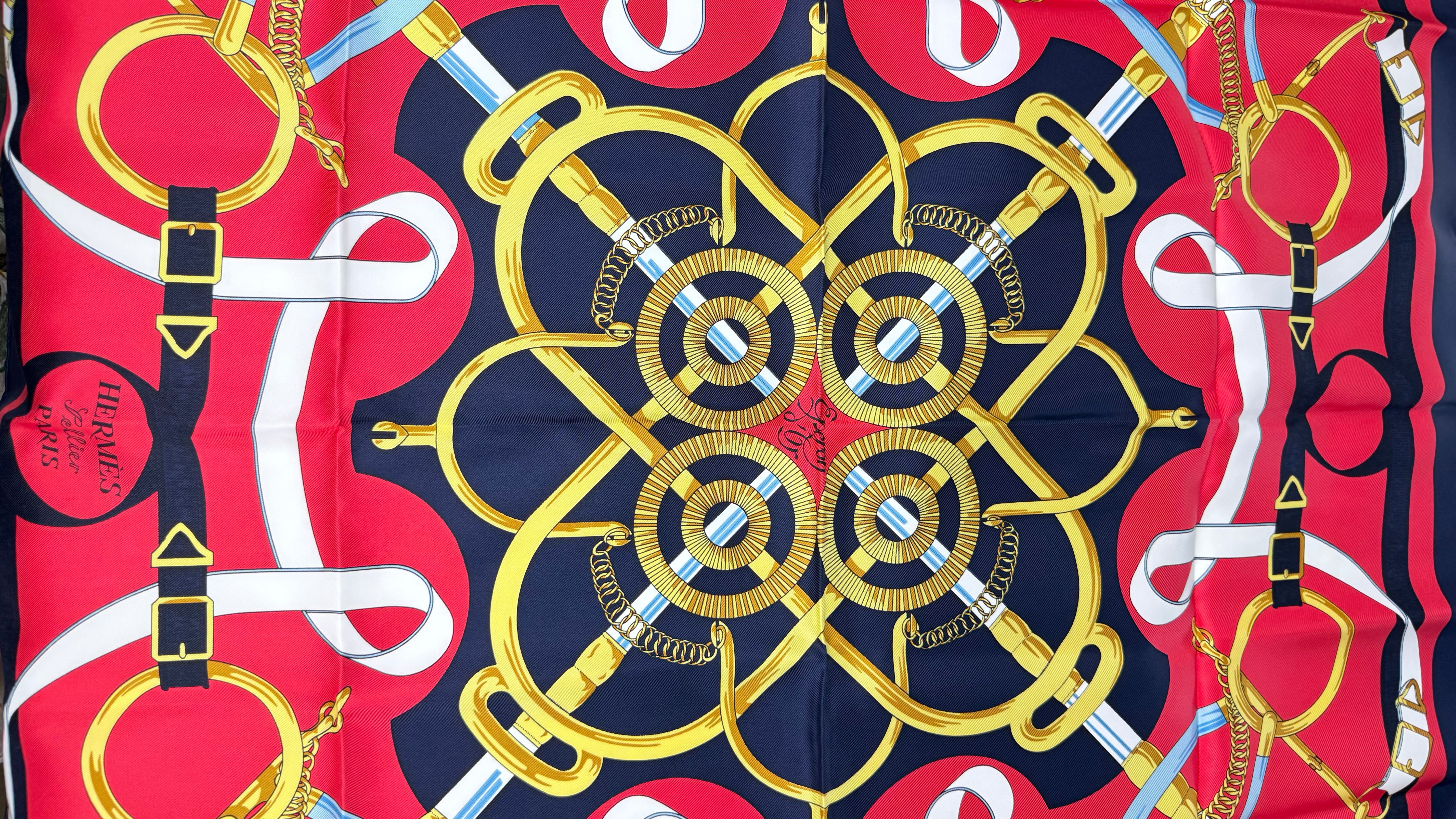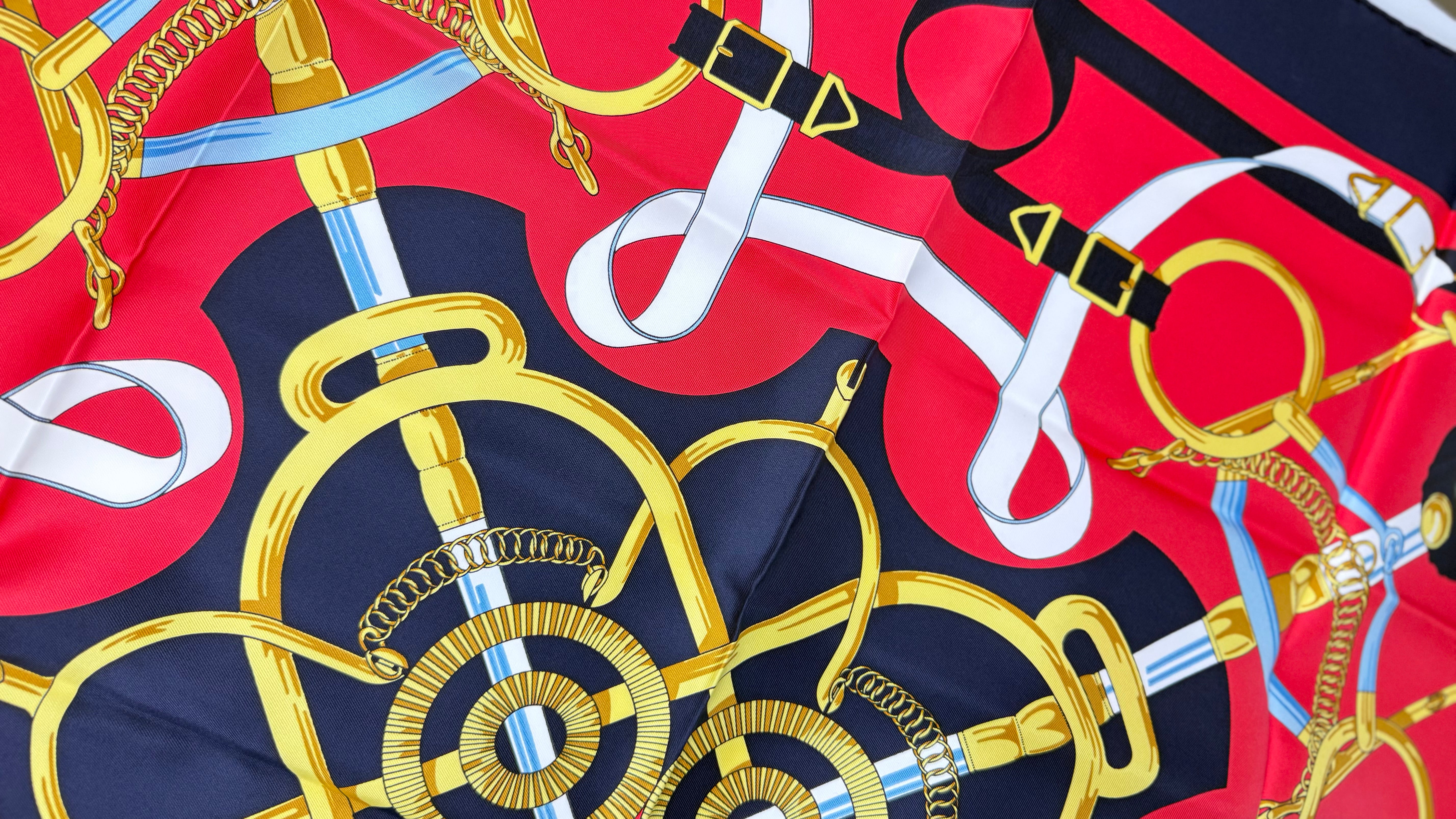 Um clássico da maison, o Carré 90 “Les Boucleries”, criado por Françoise de La Perrière, celebra a tradição equestre da Hermès com uma composição simétrica de peças de arreios ricamente detalhadas. A estampa combina tons vibrantes de vermelho, azul marinho, branco e dourado, criando um visual sofisticado e atemporal.