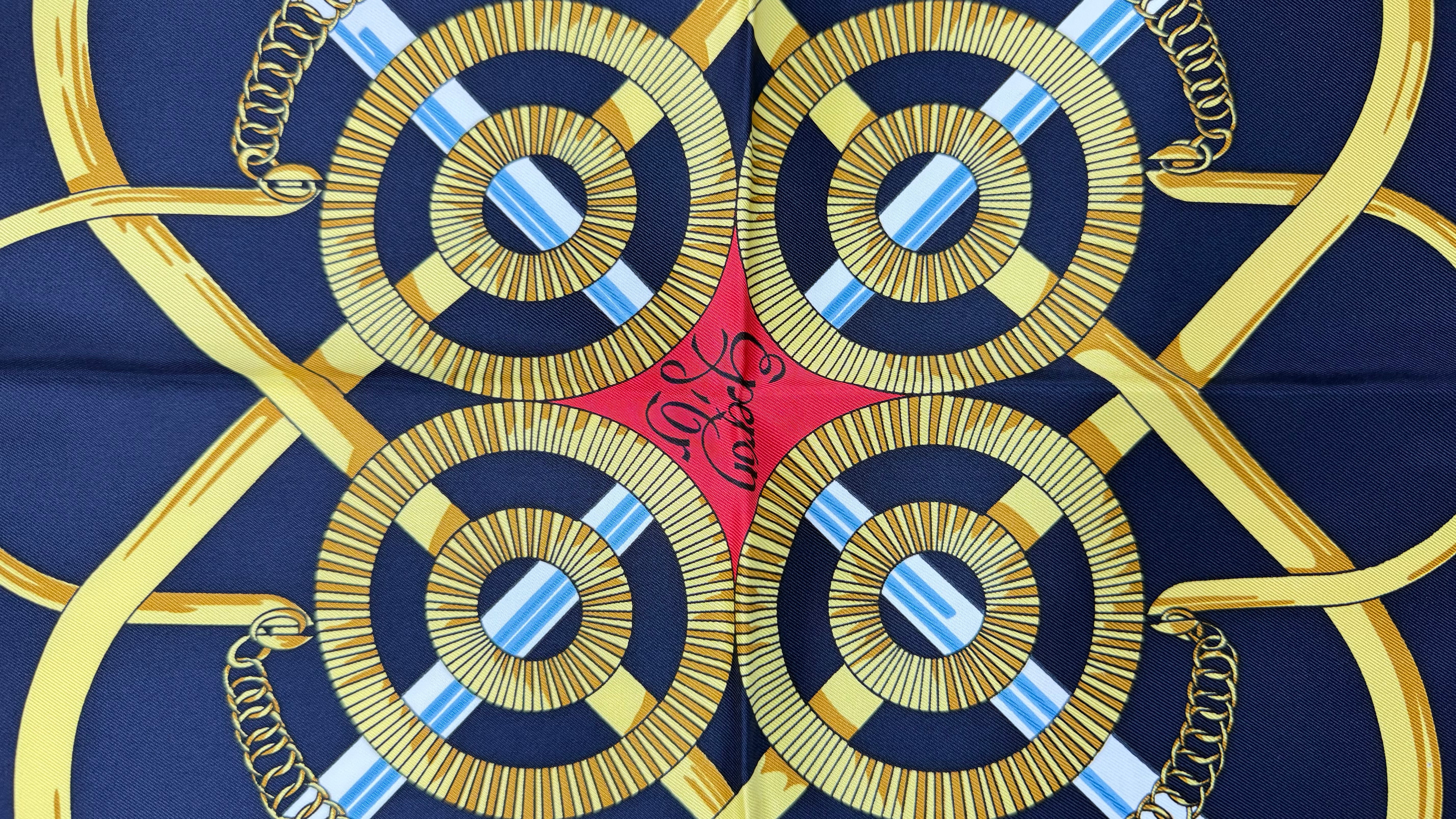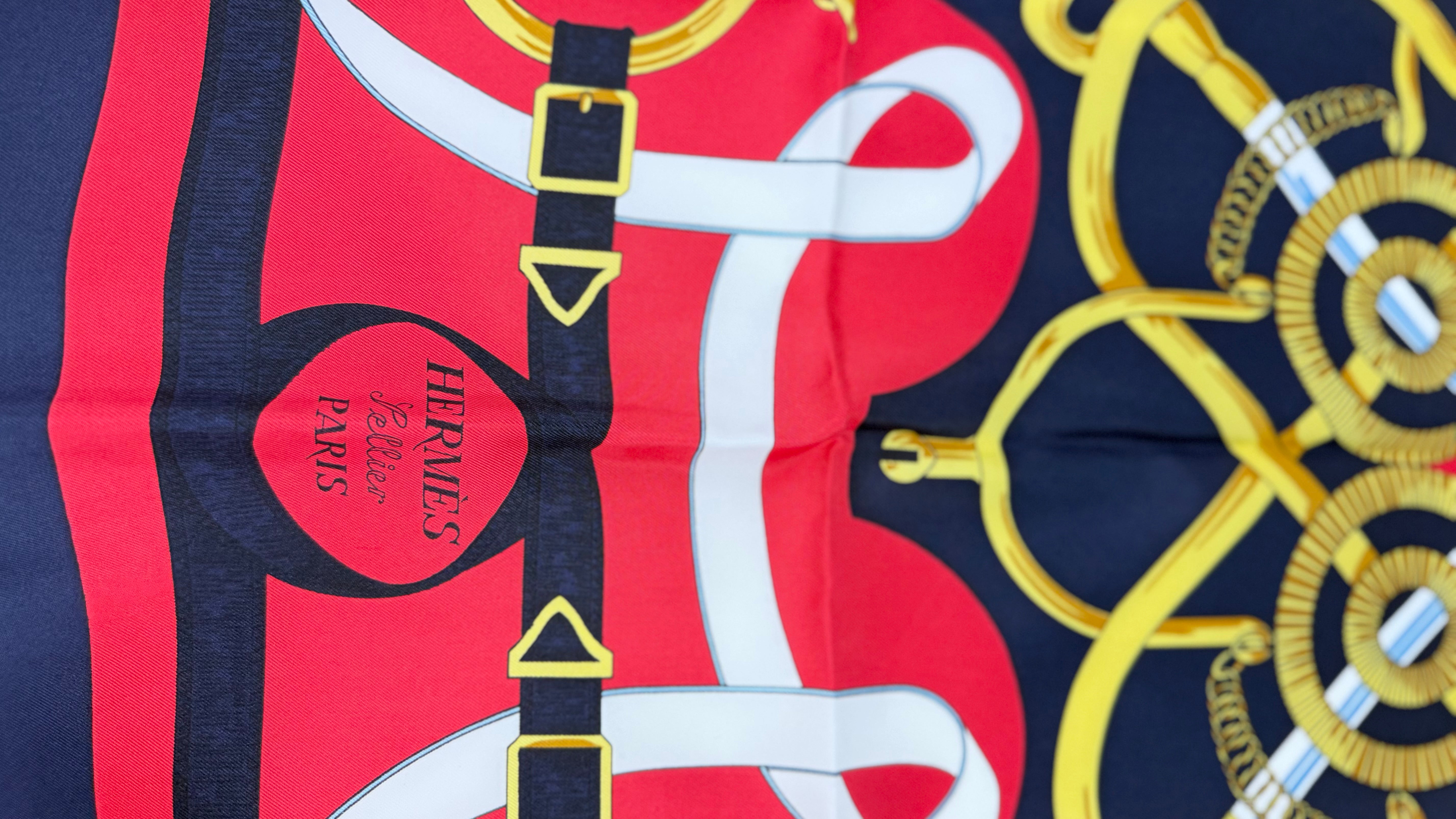 Hermès Carré 90 “Les Boucleries” por Françoise de La Perrière – Seda Vermelha, Azul e Dourado.