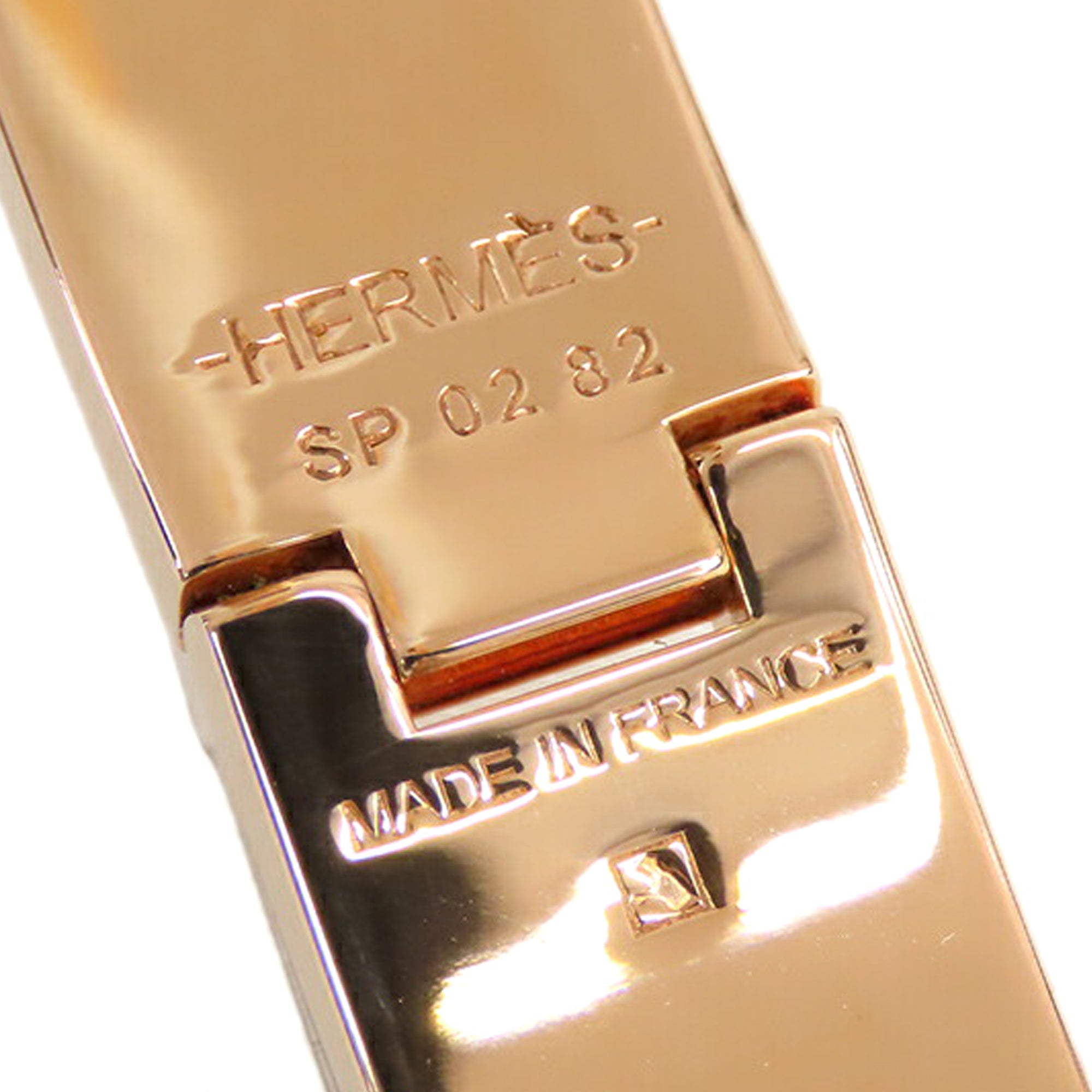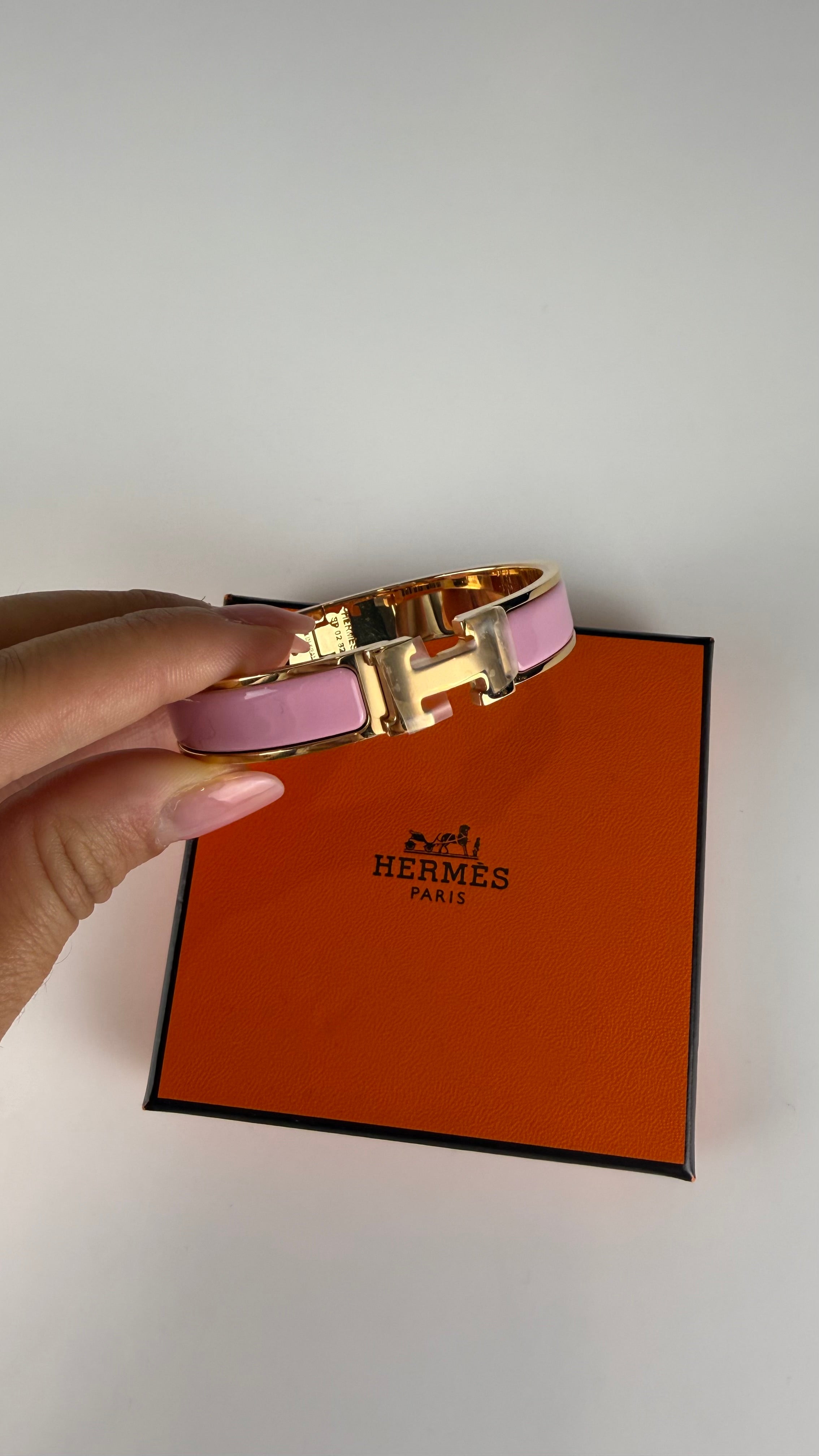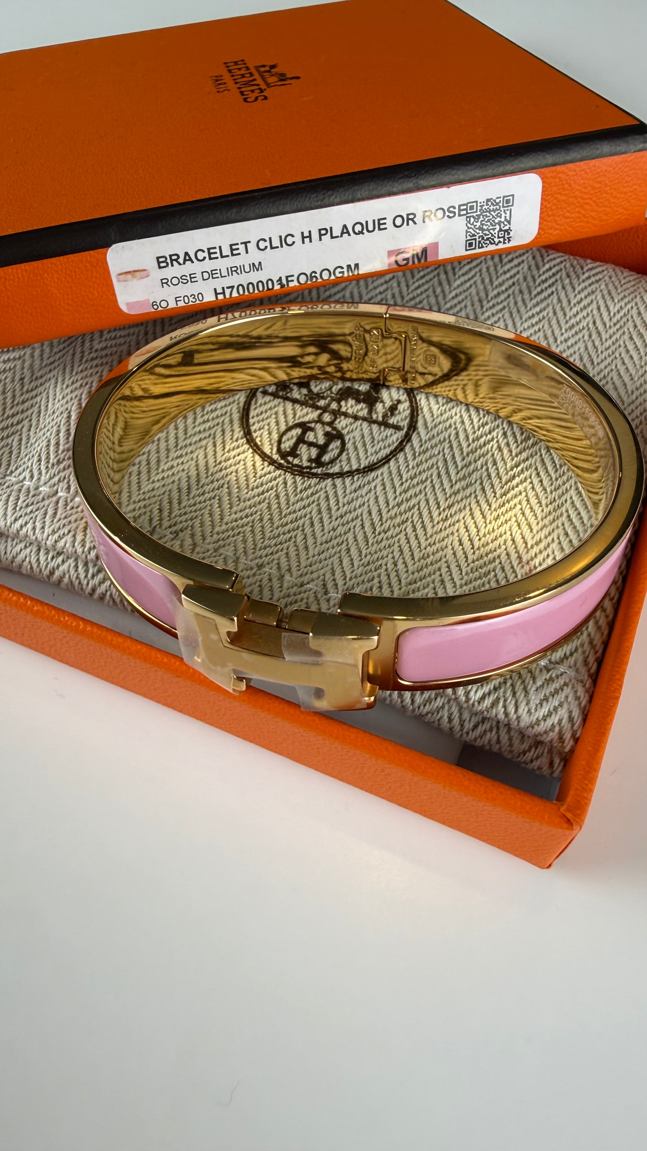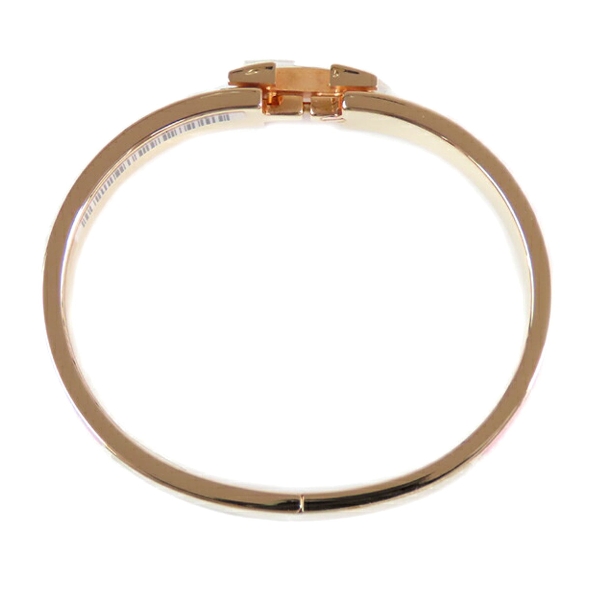 A icónica pulseira Clic H da Hermès é um símbolo de elegância e sofisticação intemporal. Fabricada em metal dourado com acabamento polido, apresenta painéis de esmaltado rosa que conferem um toque delicado e feminino à peça.