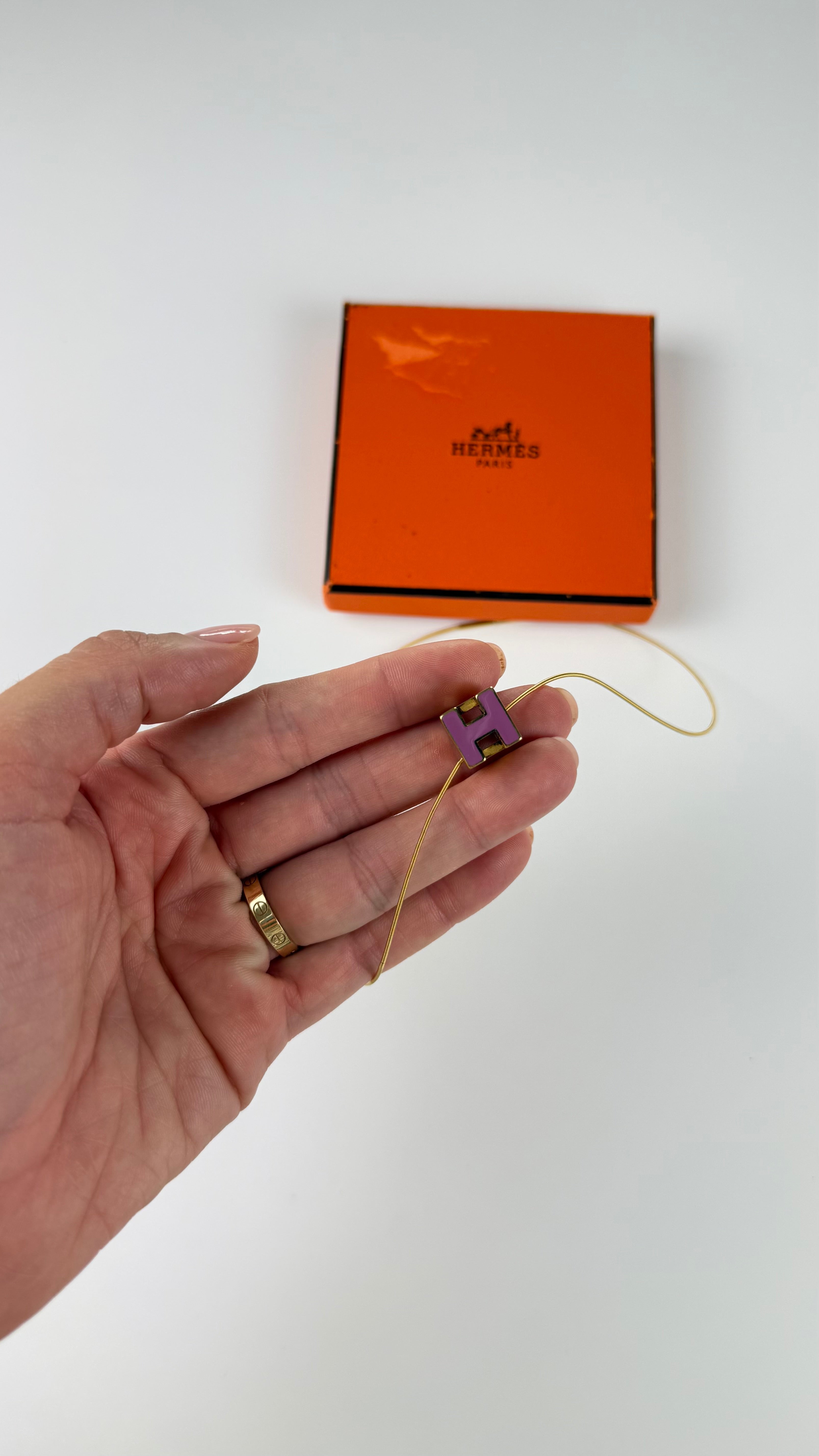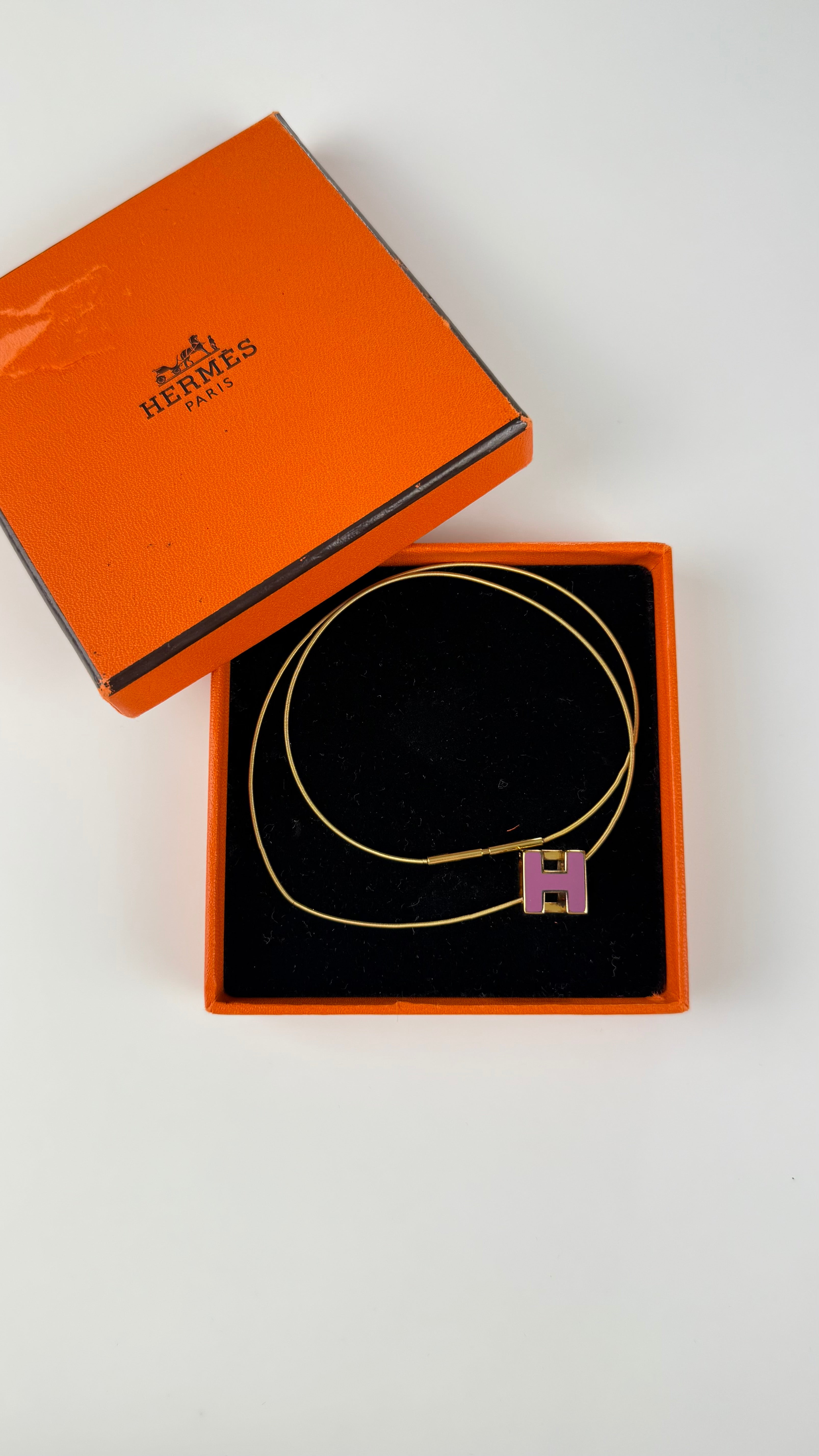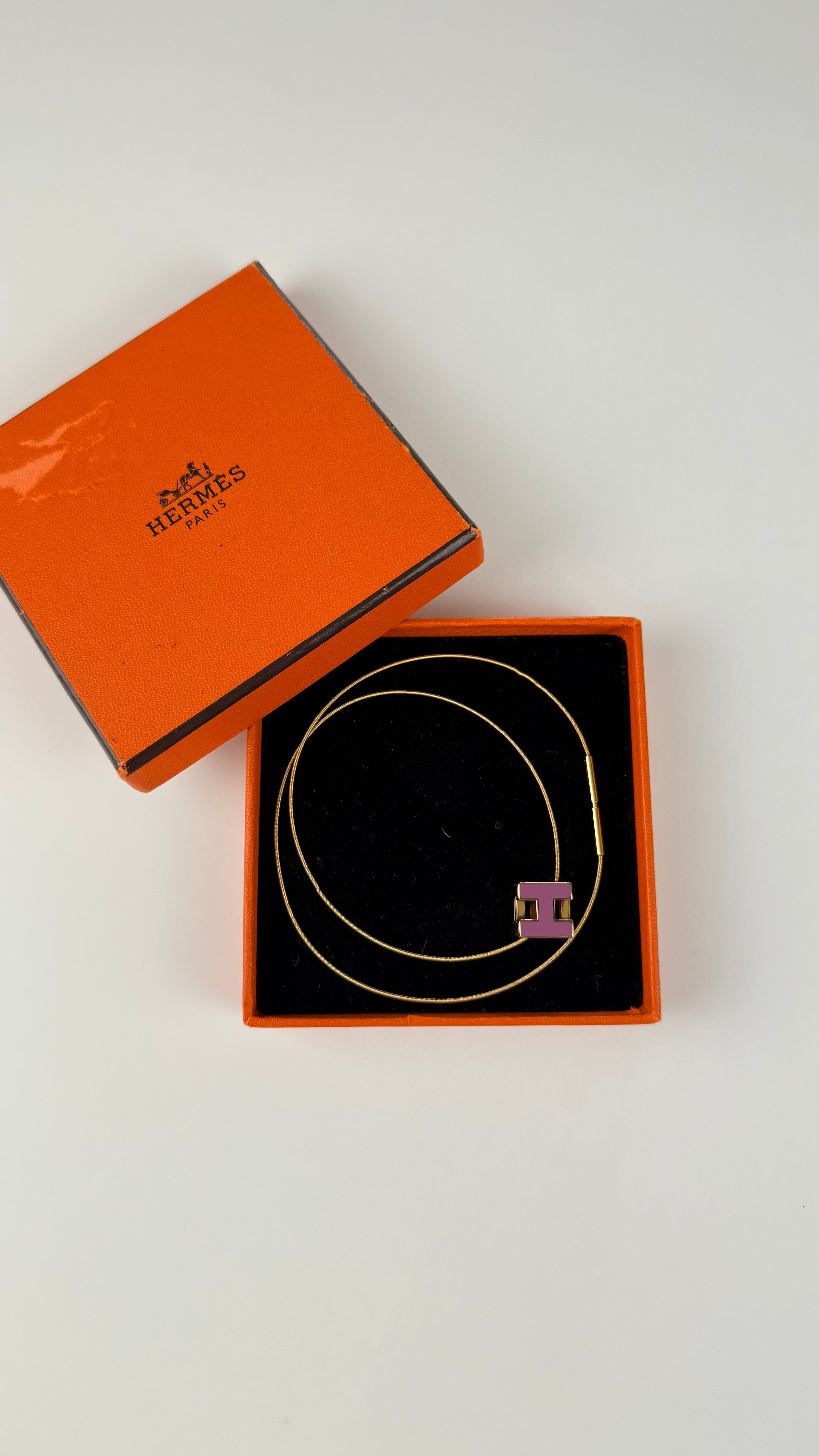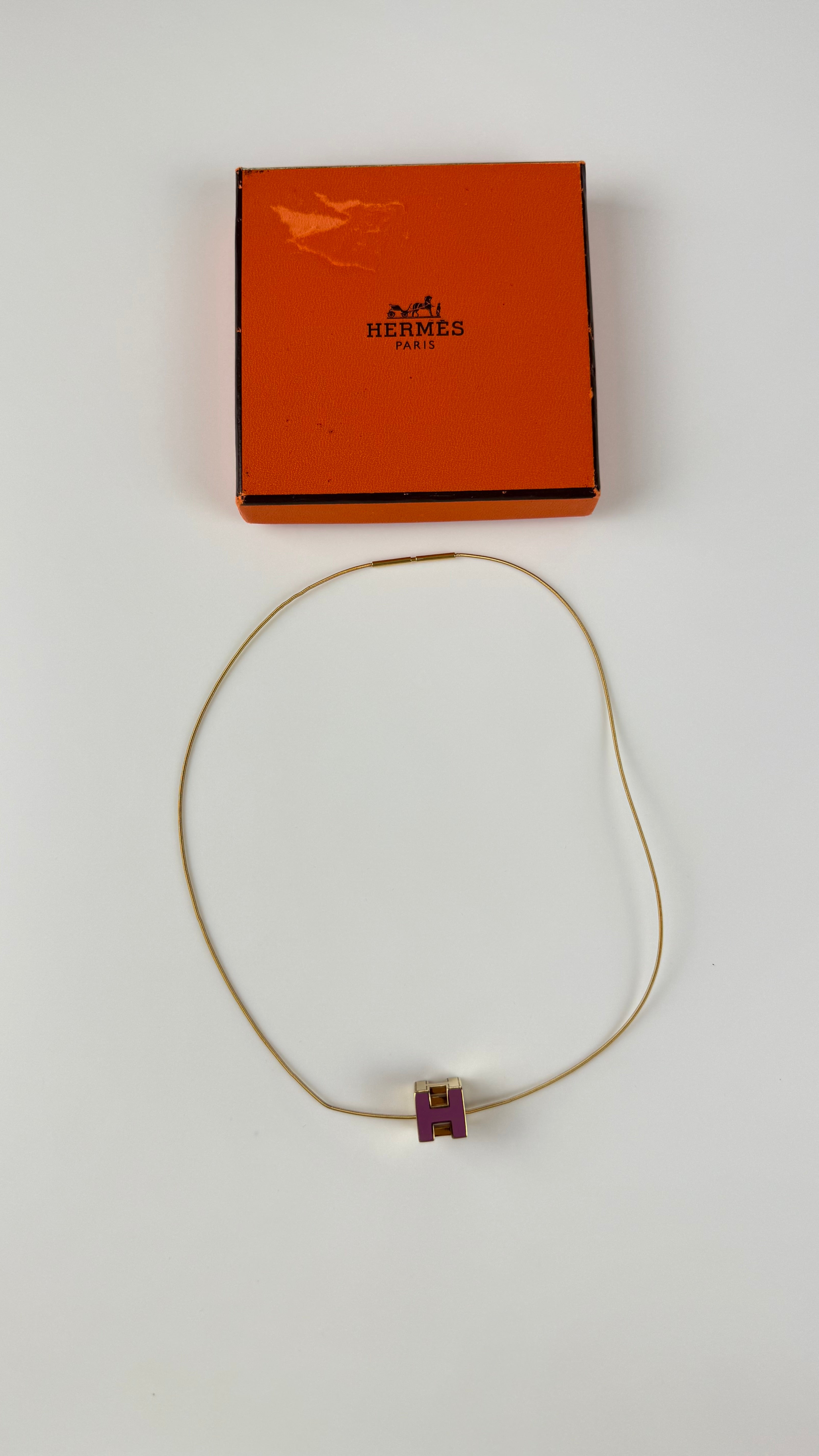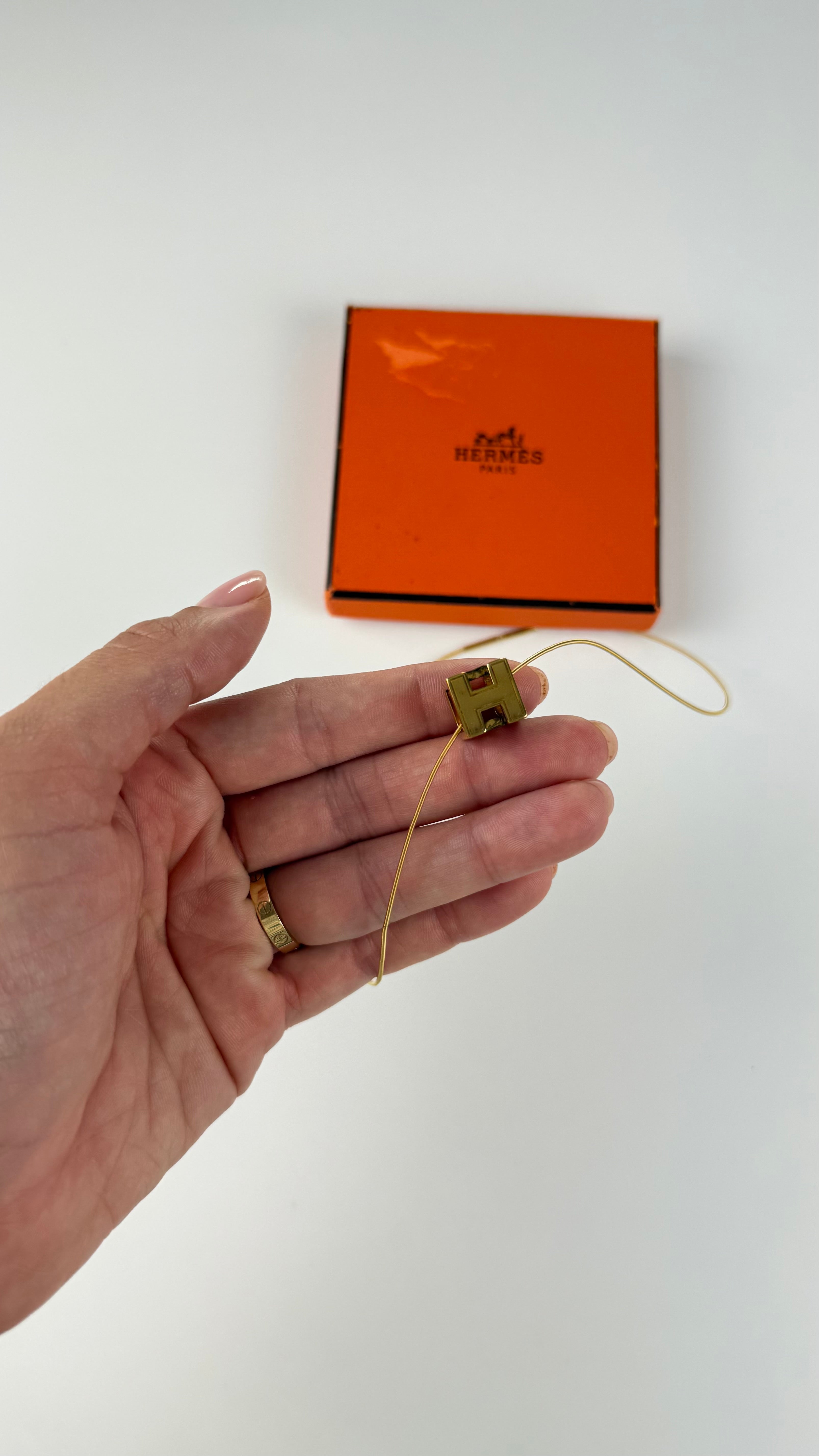 O colar Hermès Cage d’H Cube banhado a ouro é uma peça de joalharia vintage que combina elegância atemporal com o design icónico da maison francesa. Este colar destaca-se pelo seu pingente em forma de cubo, com detalhes em esmalte, suspenso numa corrente tipo "snake" também banhada a ouro.