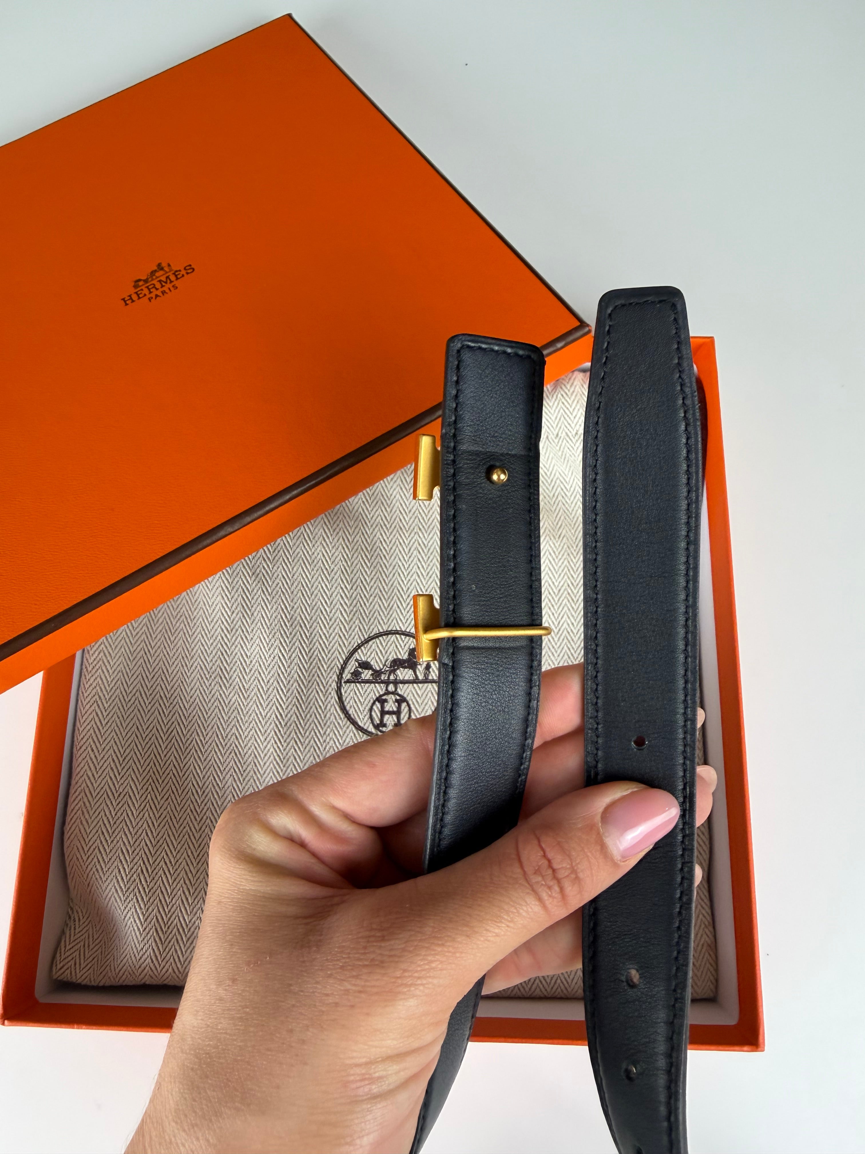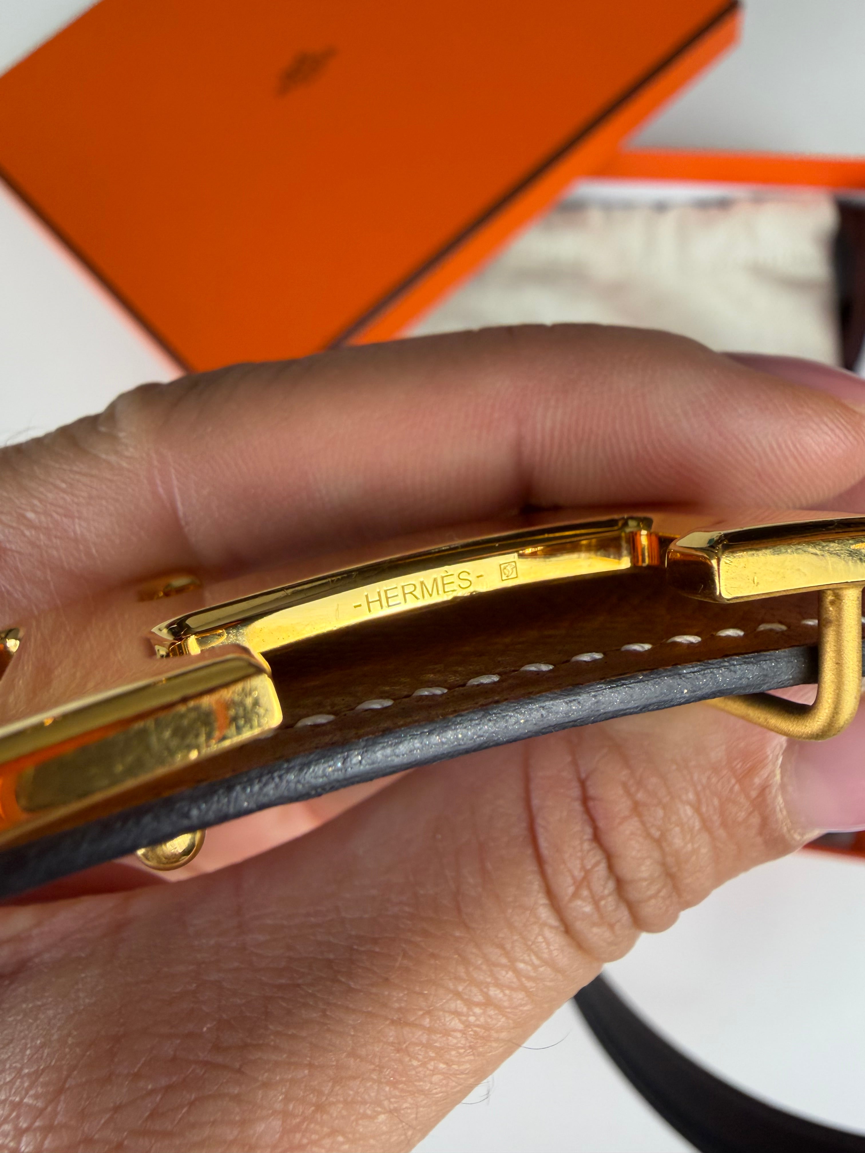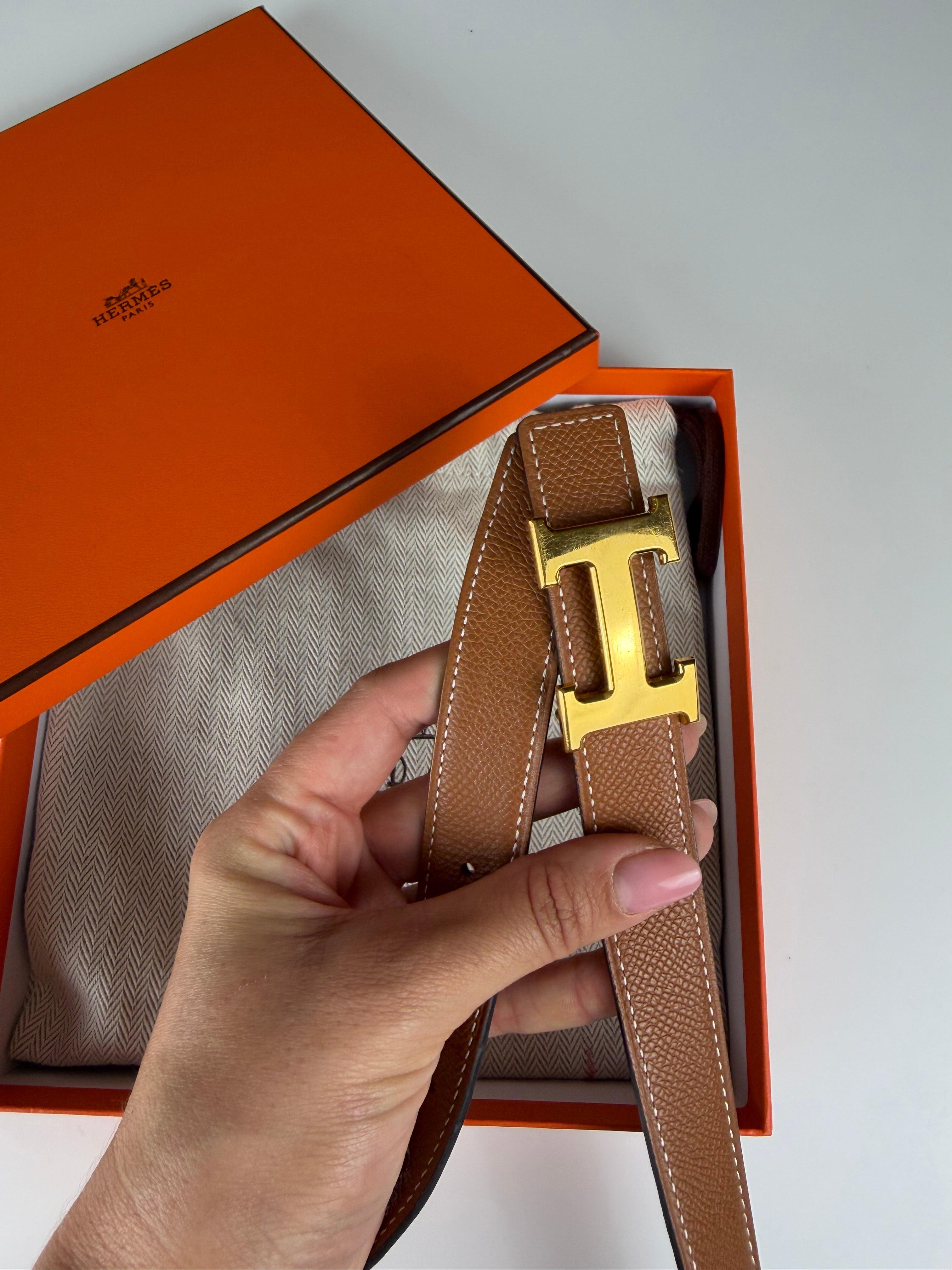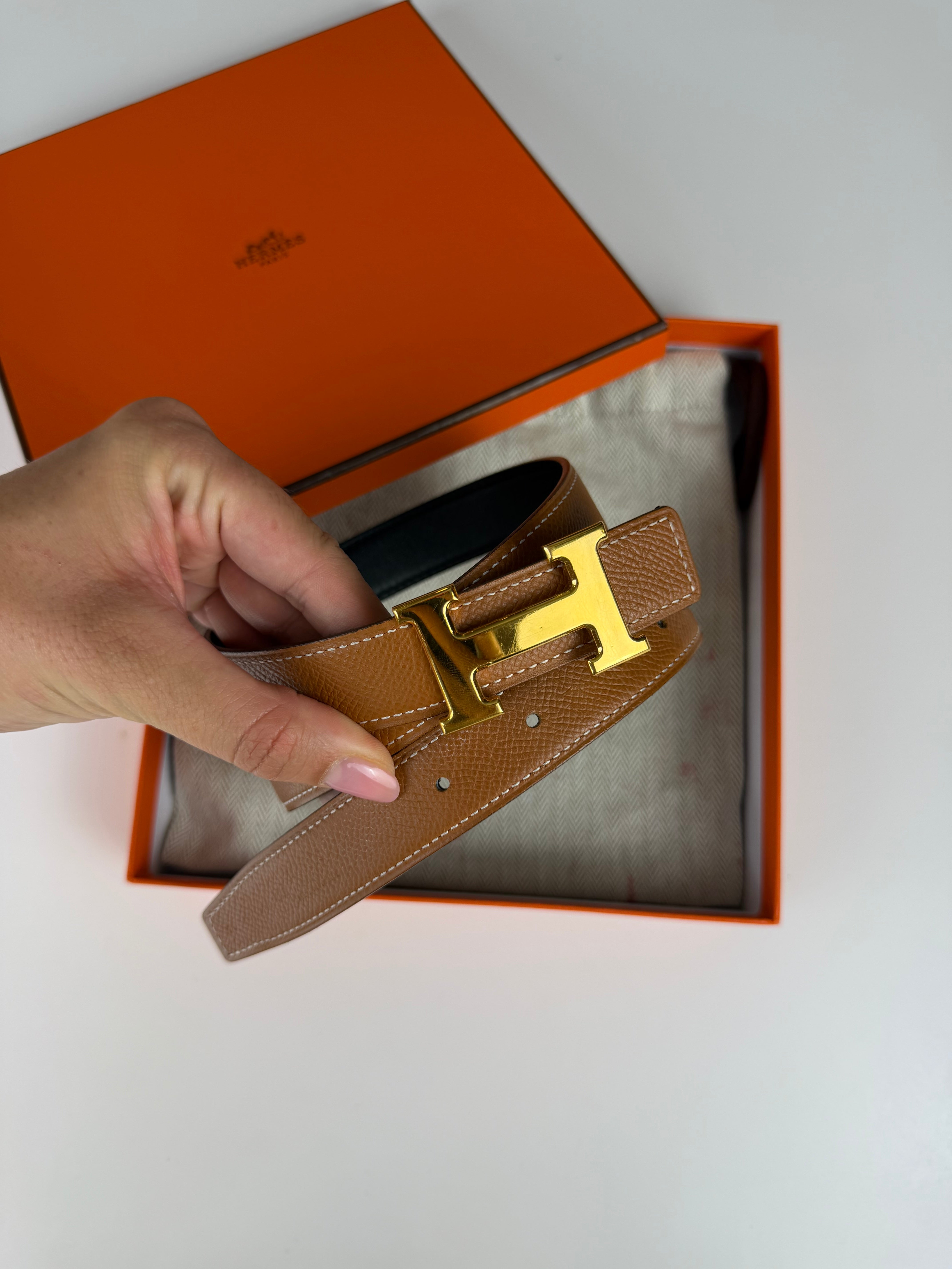 Um verdadeiro clássico da Hermès, o cinto Constance é sinônimo de elegância atemporal e design impecável. Este modelo é reversível, apresentando um lado em couro Gold (caramelo) com textura Epsom e o outro em couro Noir (preto liso) — perfeito para transitar entre looks casuais e formais com um único acessório.