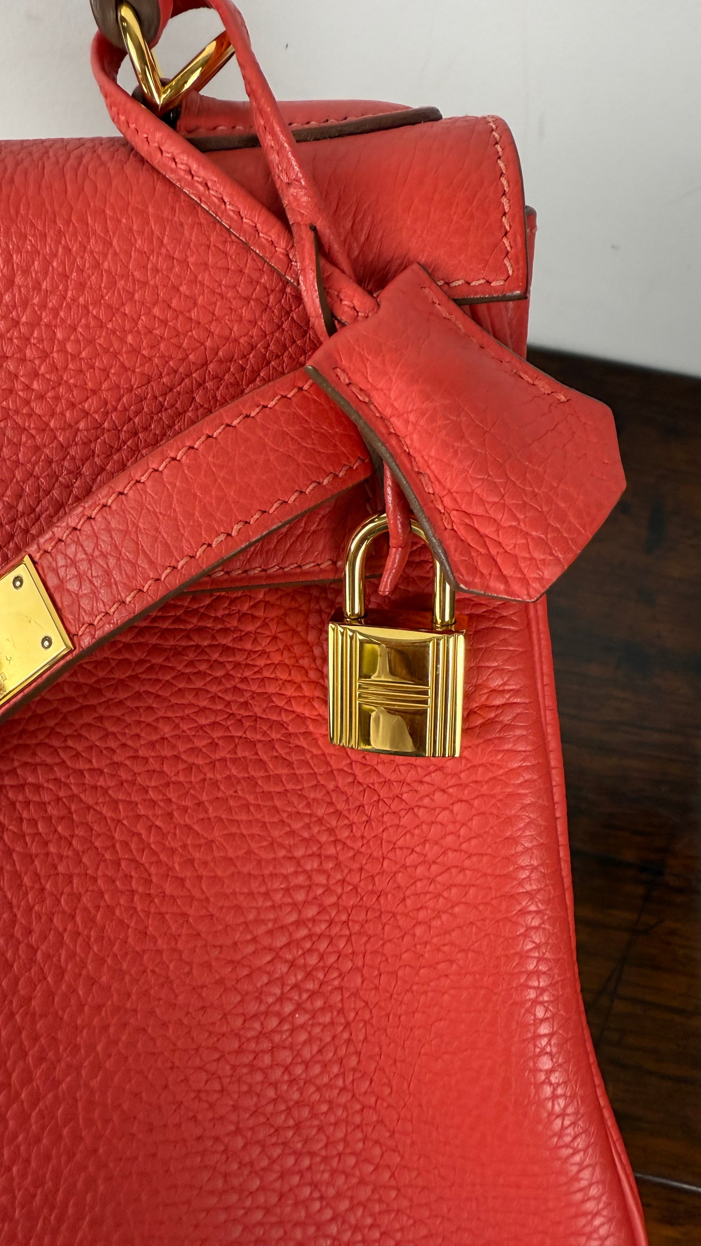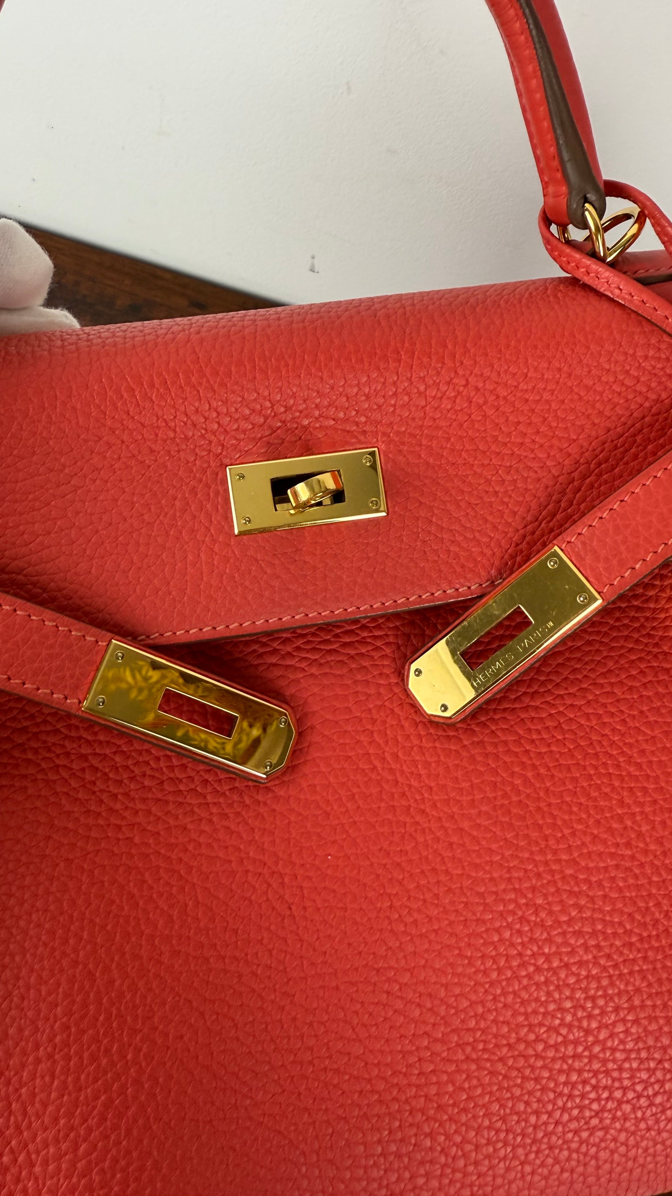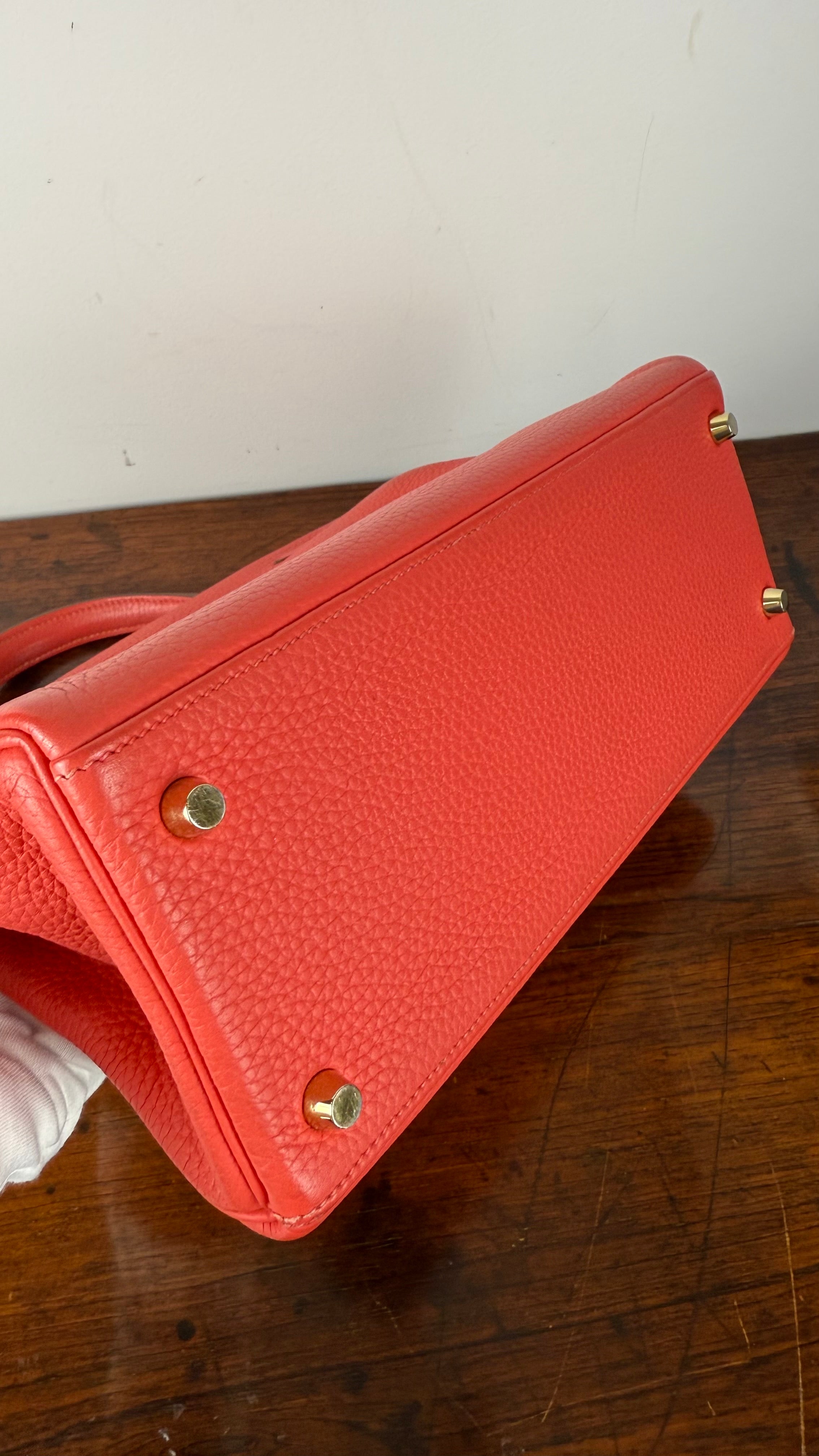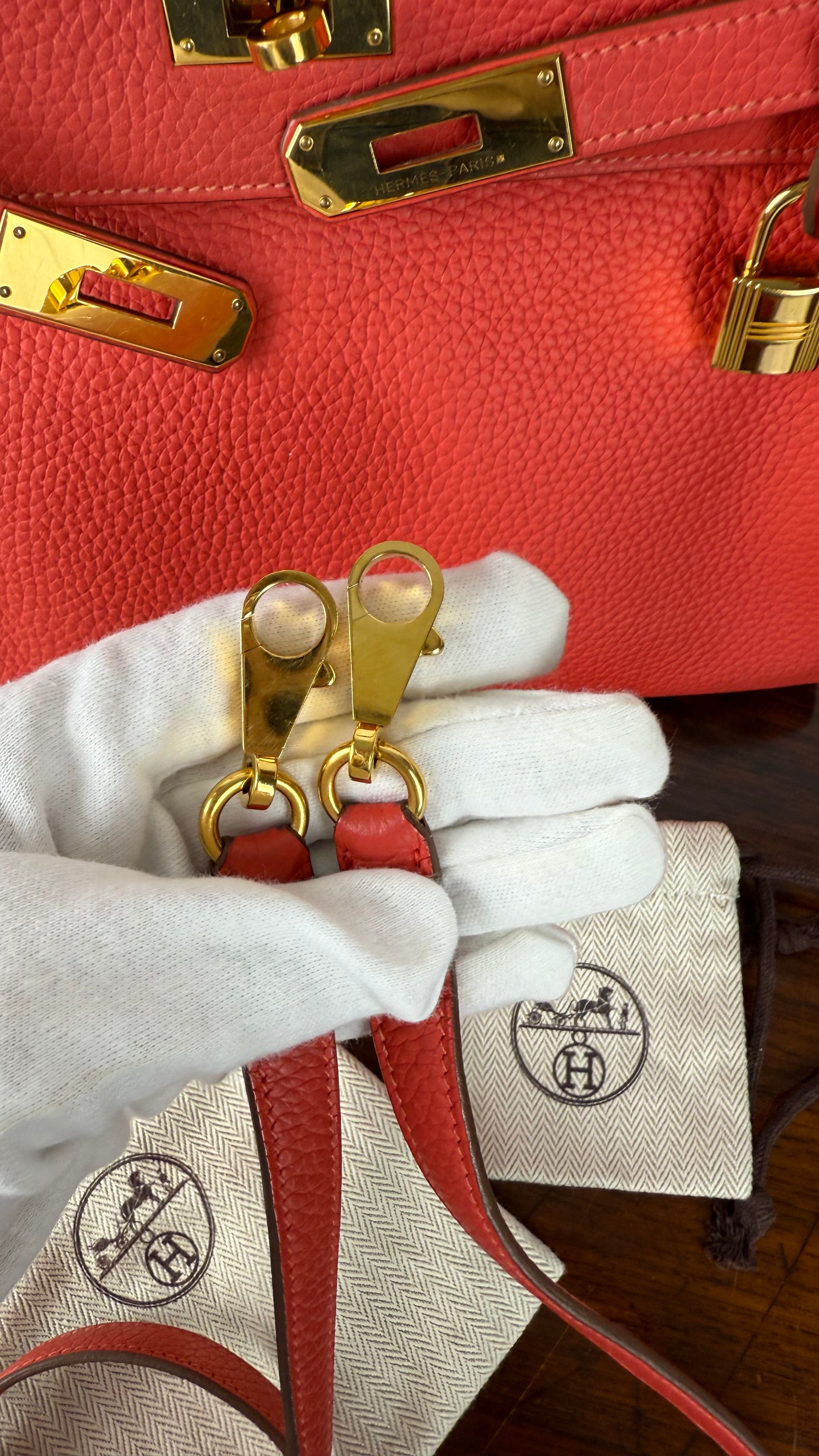 Hermès Kelly 28 Rose Jaipur com ferragem dourada é a elegante variação de 28 cm da icônica Kelly, confeccionada em couro Togo no tom coral-rosado Rose Jaipur, combinando costura interna (Retourne) e aba frontal com fecho S-lock dourado, que envolve o design estruturado e sofisticado.
