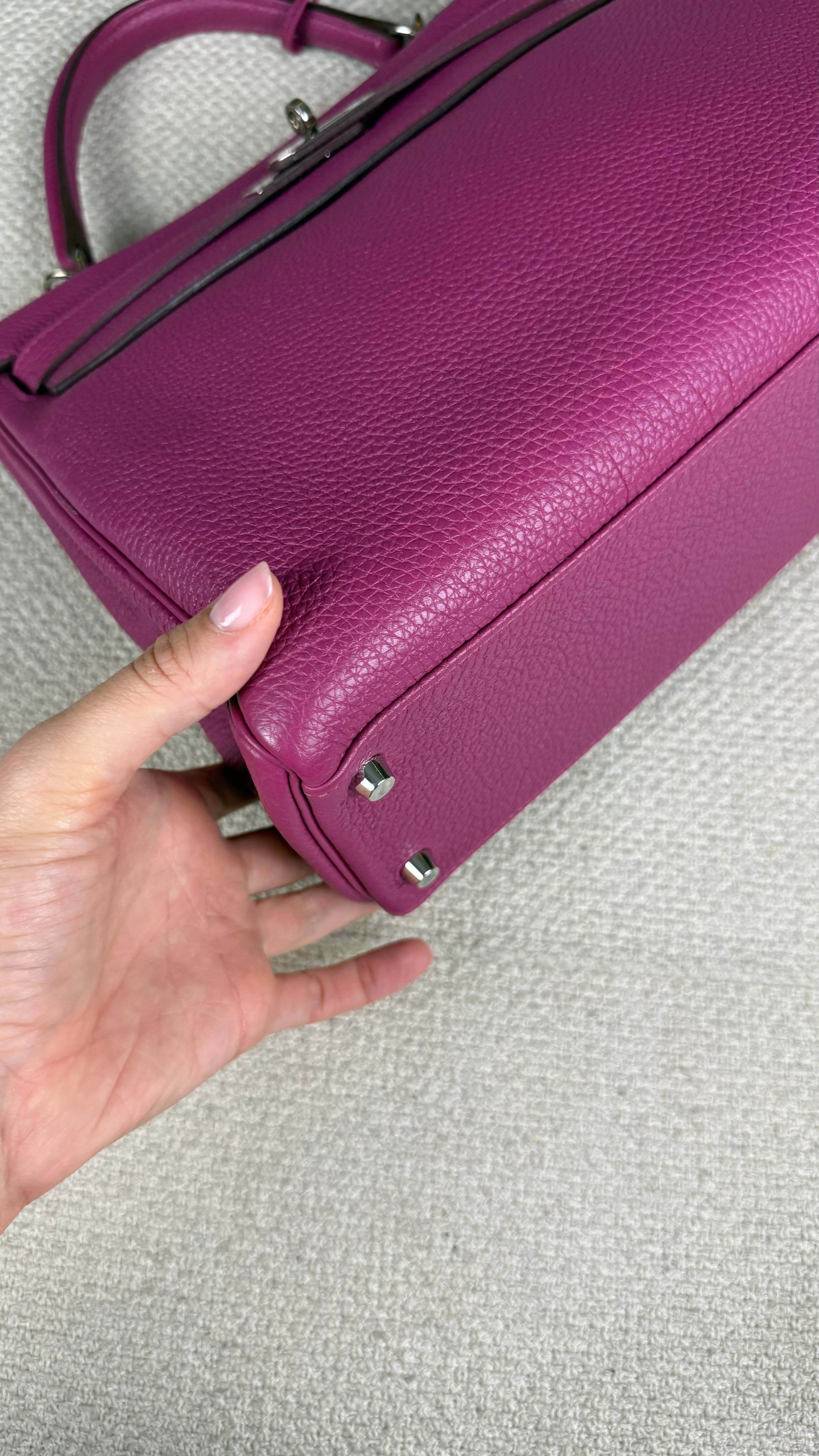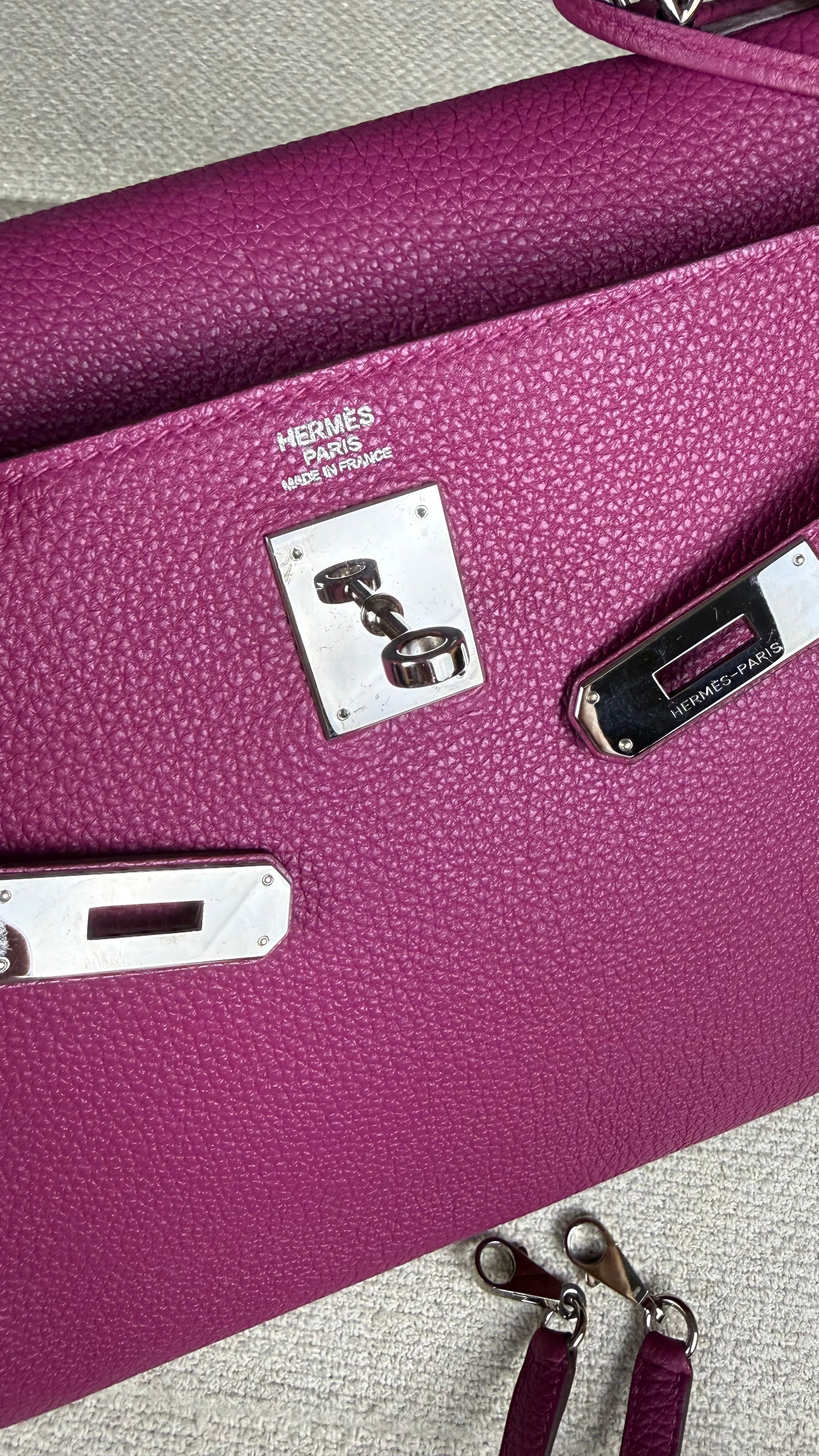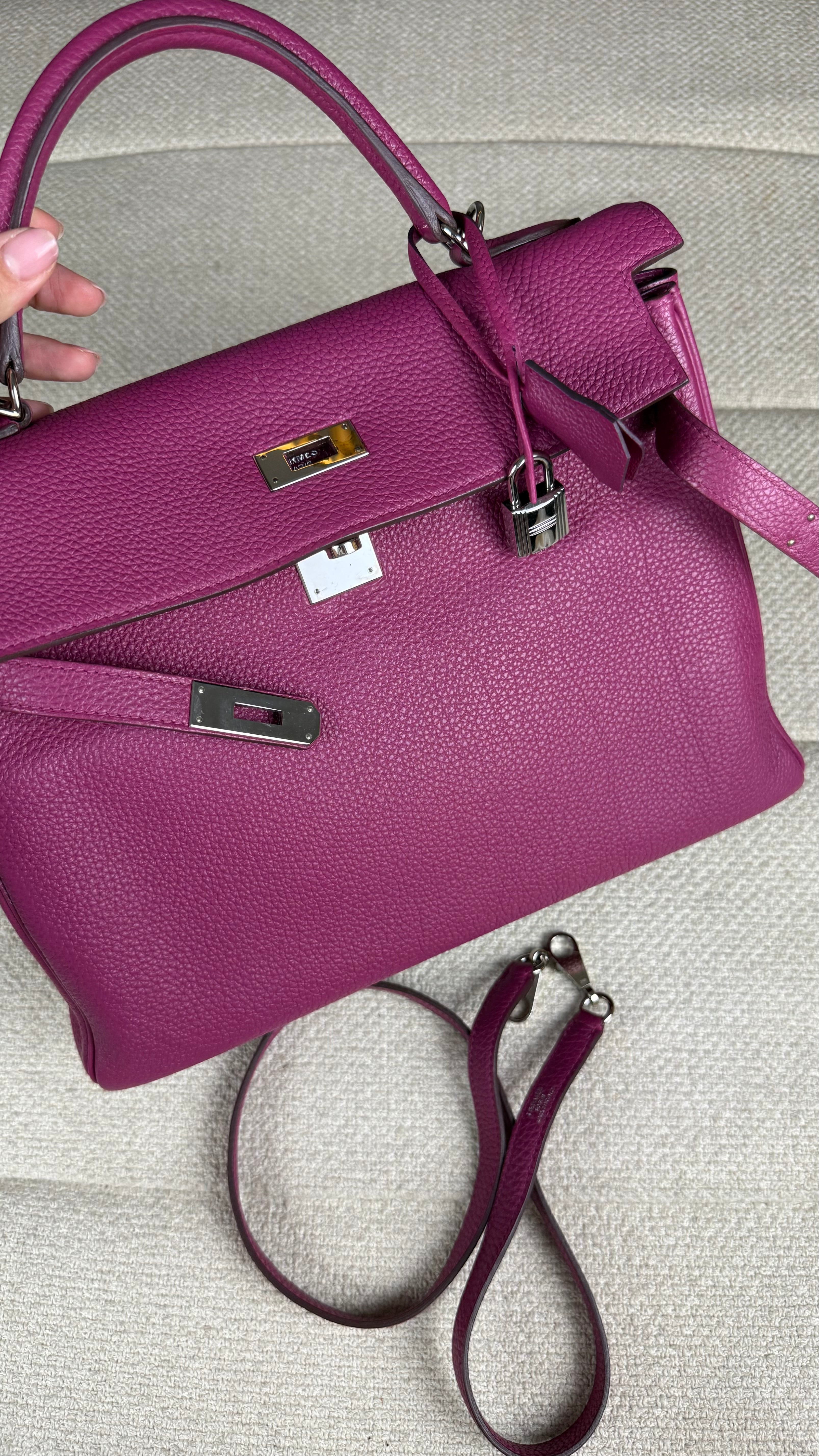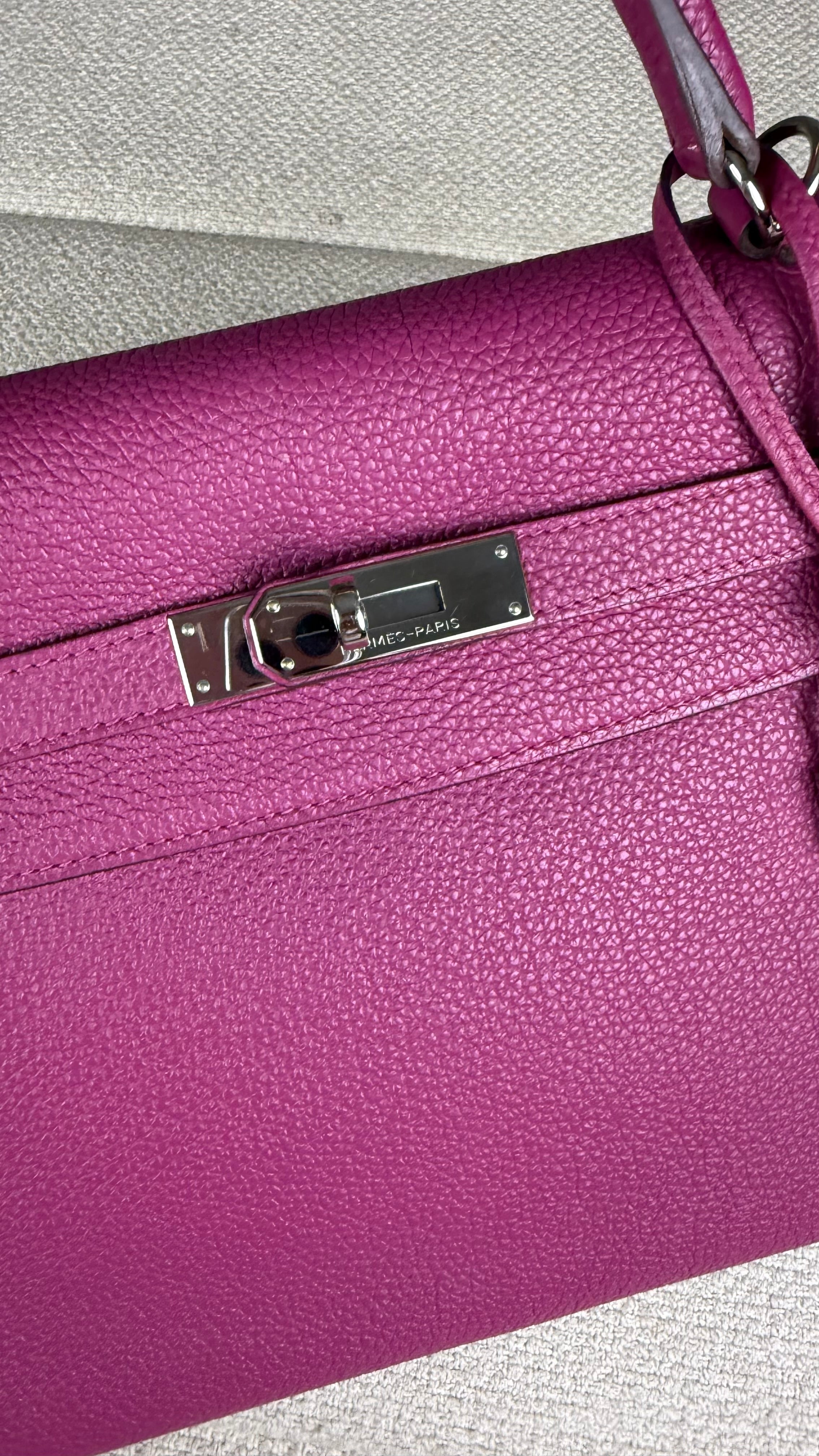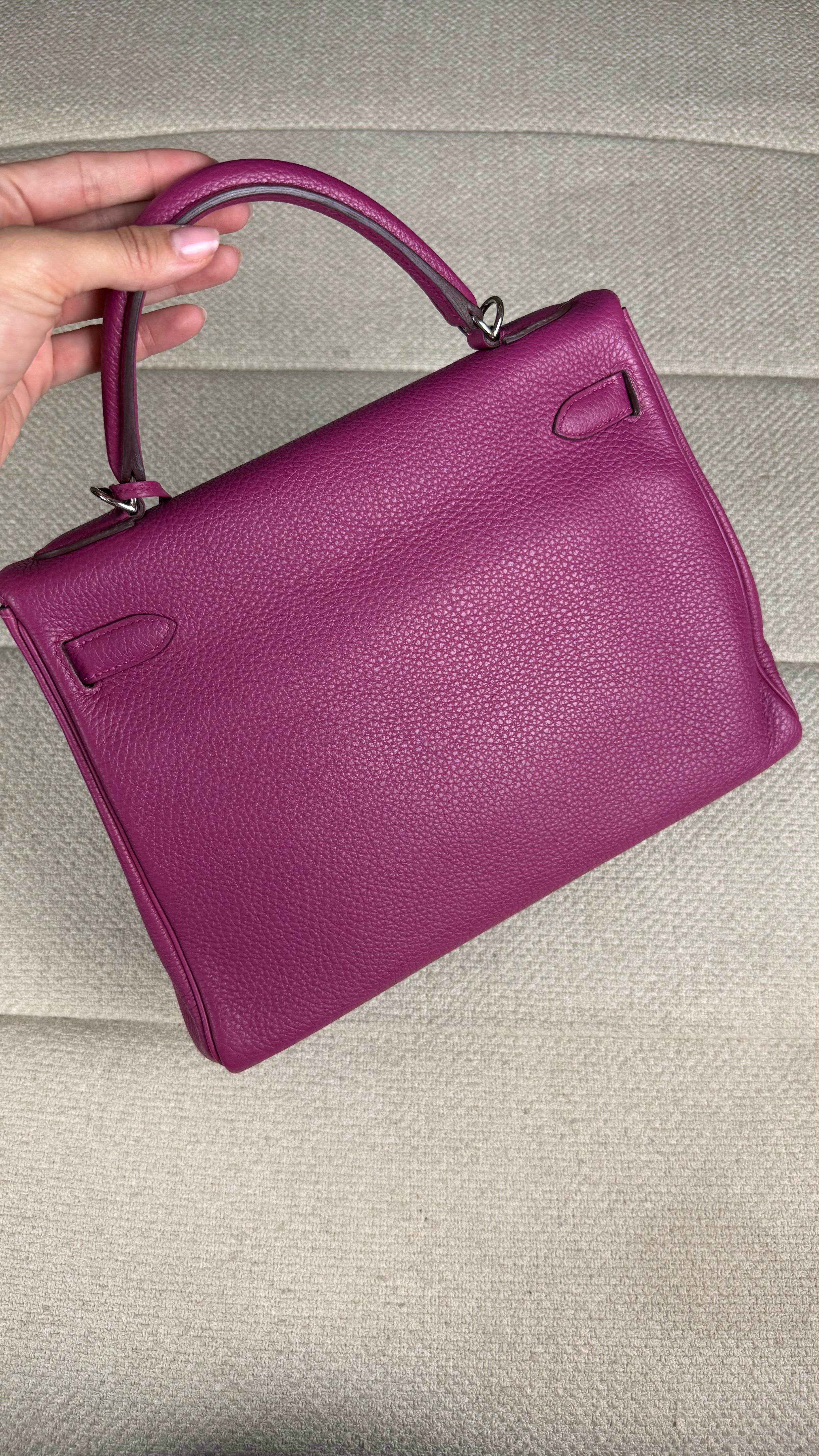 Hermès Kelly 32 Sellier em couro Togo – Cor Anemone – Ferragens Palladium.