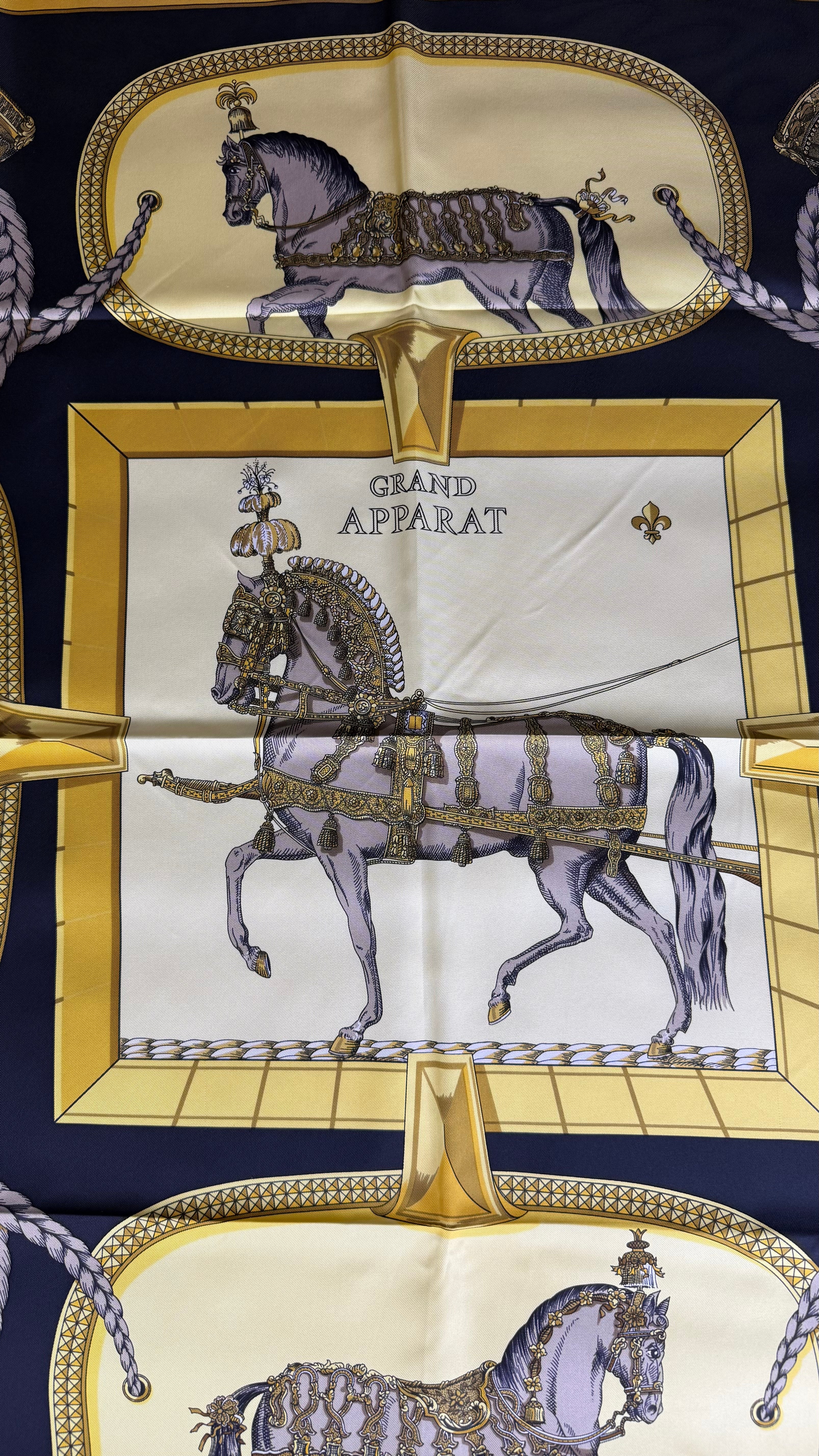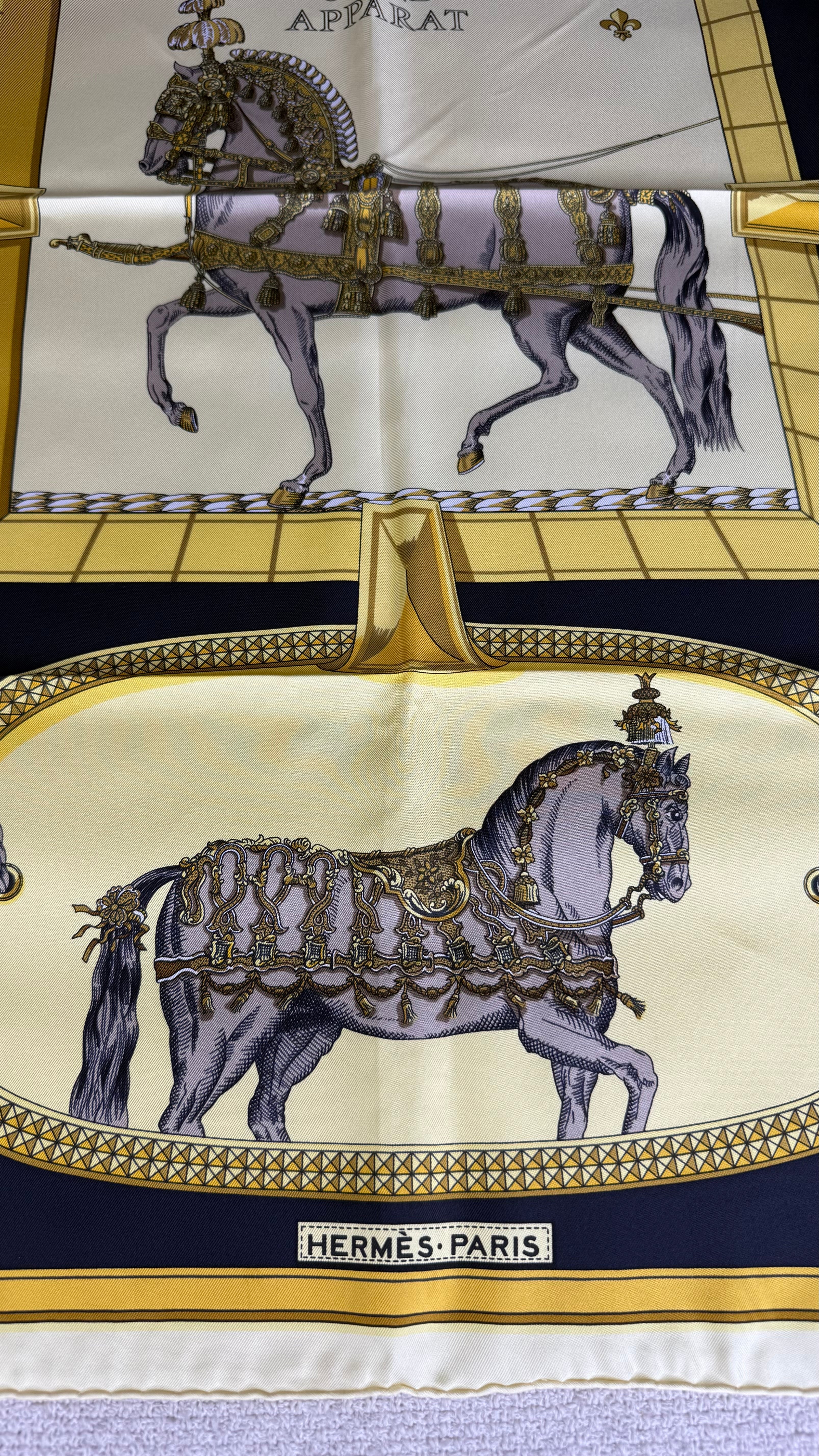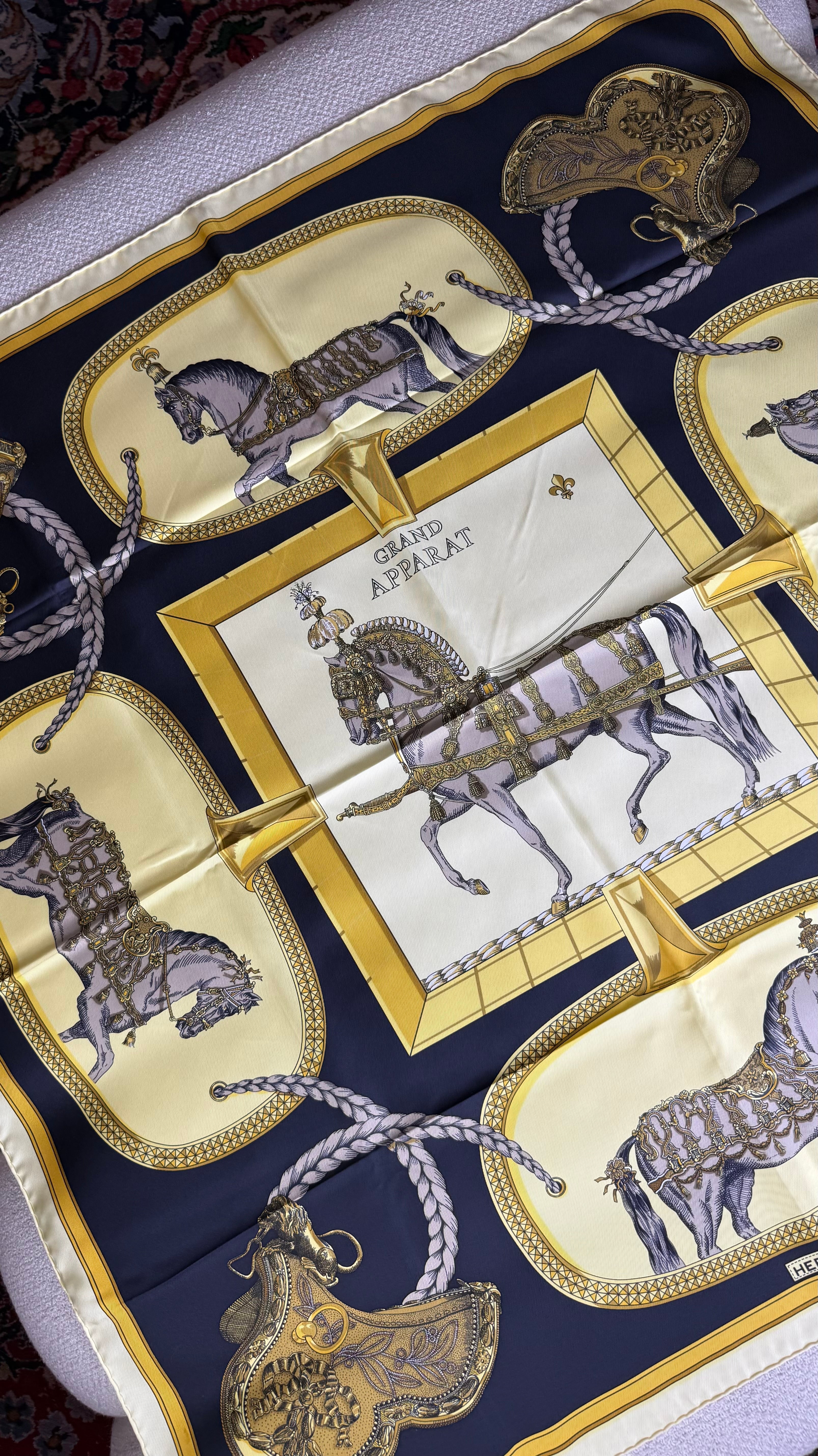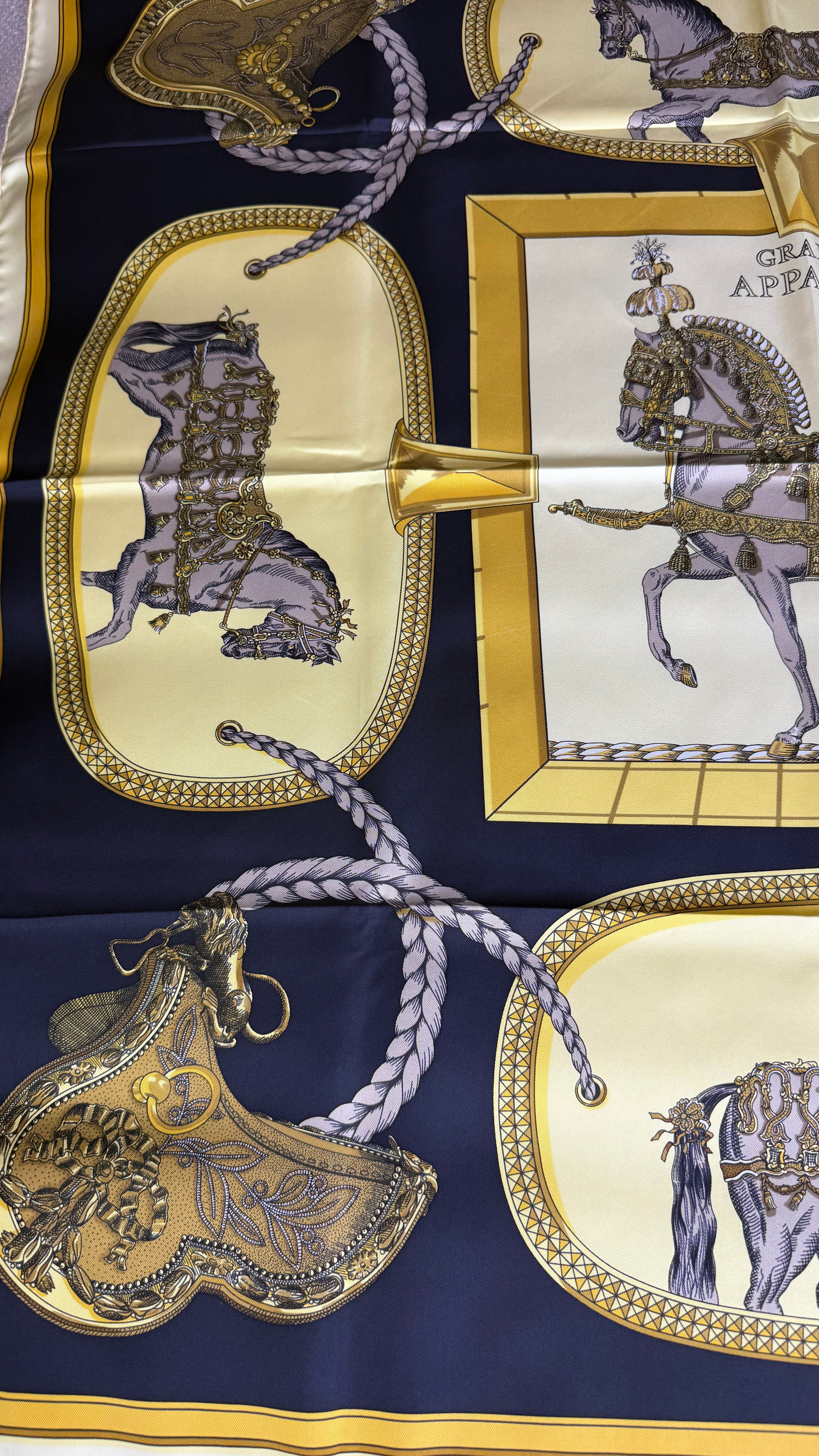 O Hermès Grand Apparat Silk Scarf é um dos lenços mais emblemáticos da maison francesa, refletindo a herança equestre e a sofisticação atemporal da marca. Criado pelo artista Jacques Eudel em 1962, este carré de seda tornou-se um clássico, sendo reeditado ao longo dos anos em diversas combinações de cores e estilos.