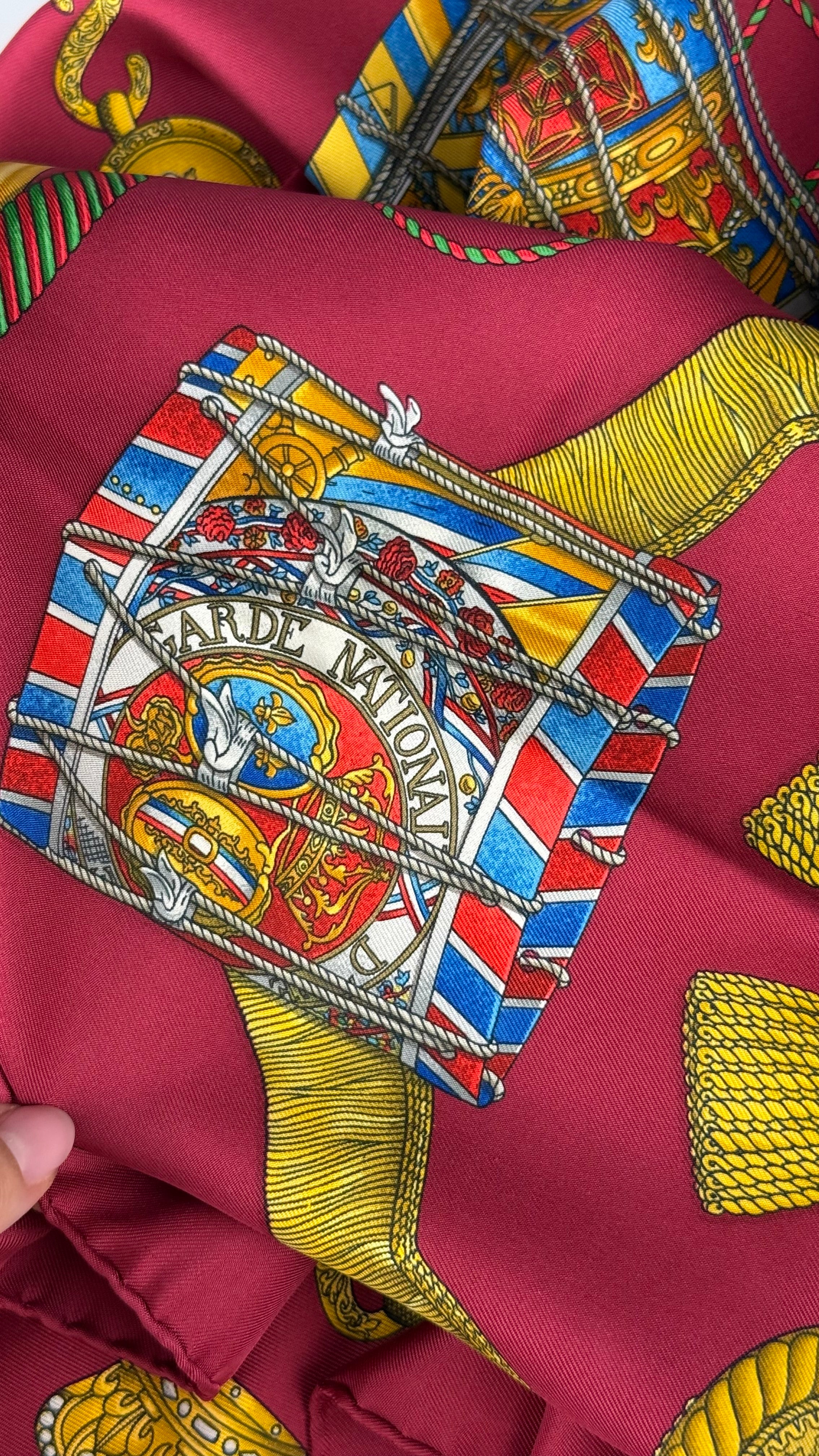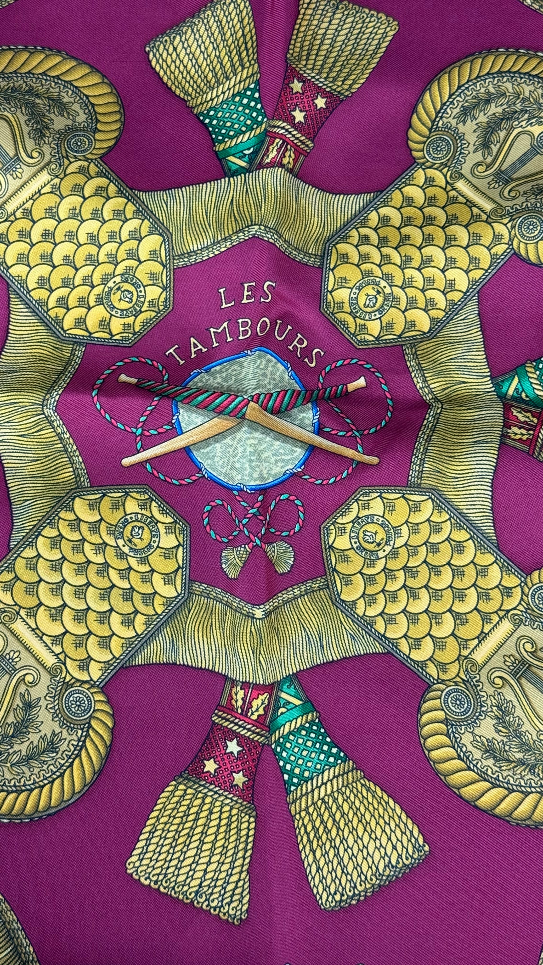 Este magnífico lenço Hermès é do modelo “Les Tambours”, uma criação clássica da marca que celebra os tambores e elementos militares históricos franceses, representados de forma artística e extremamente detalhada.