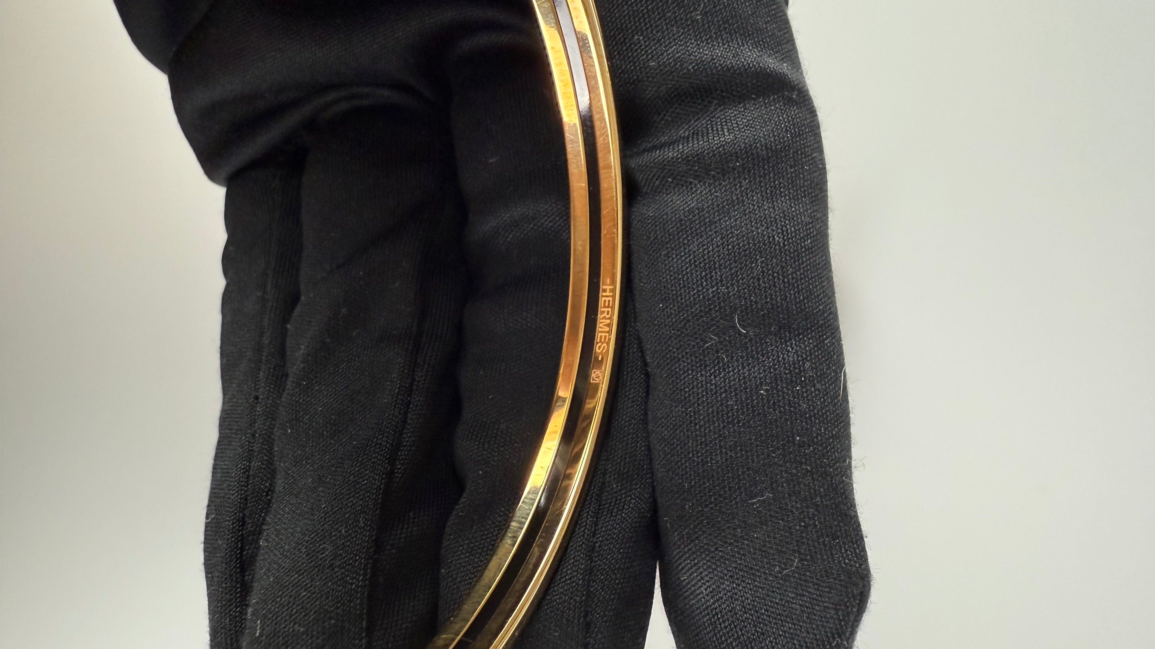 Confeccionada em metal dourado polido, traz acabamento esmaltado em rosa claro, tonalidade feminina e elegante, com a gravação discreta “HERMÈS - PARIS”. O design minimalista faz dela um acessório versátil, perfeito para ser usado sozinho ou em combinação com outras pulseiras.
