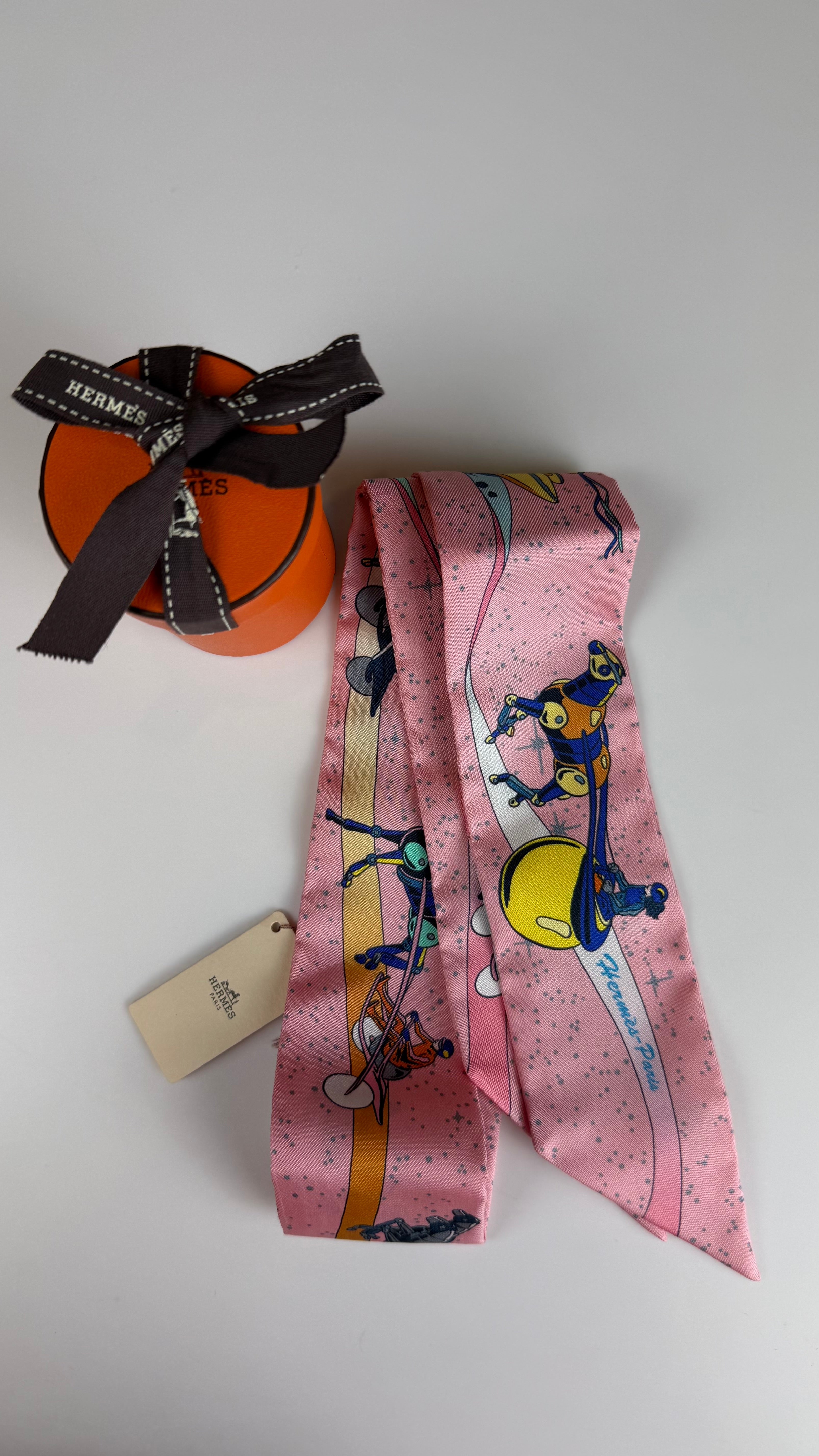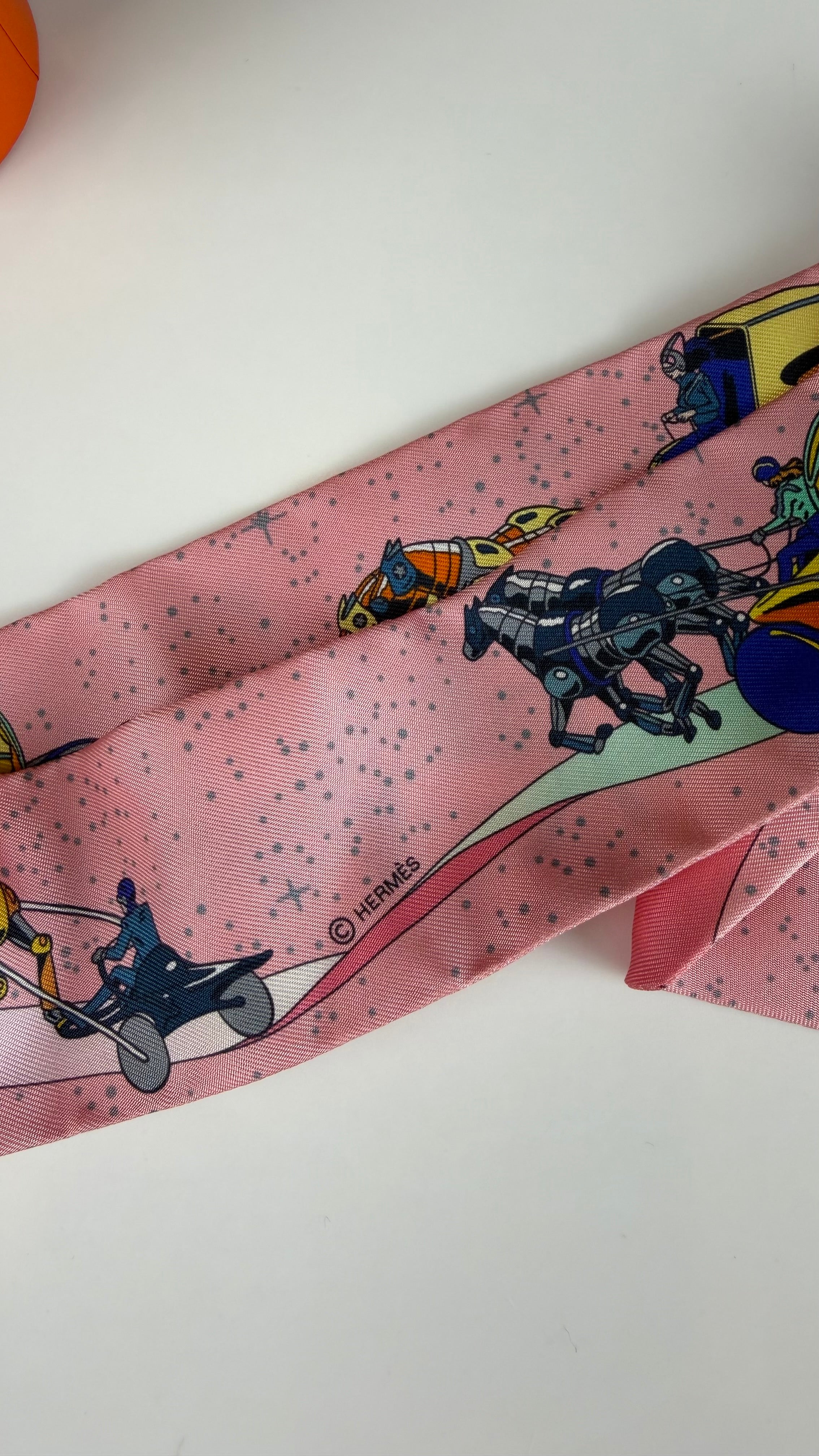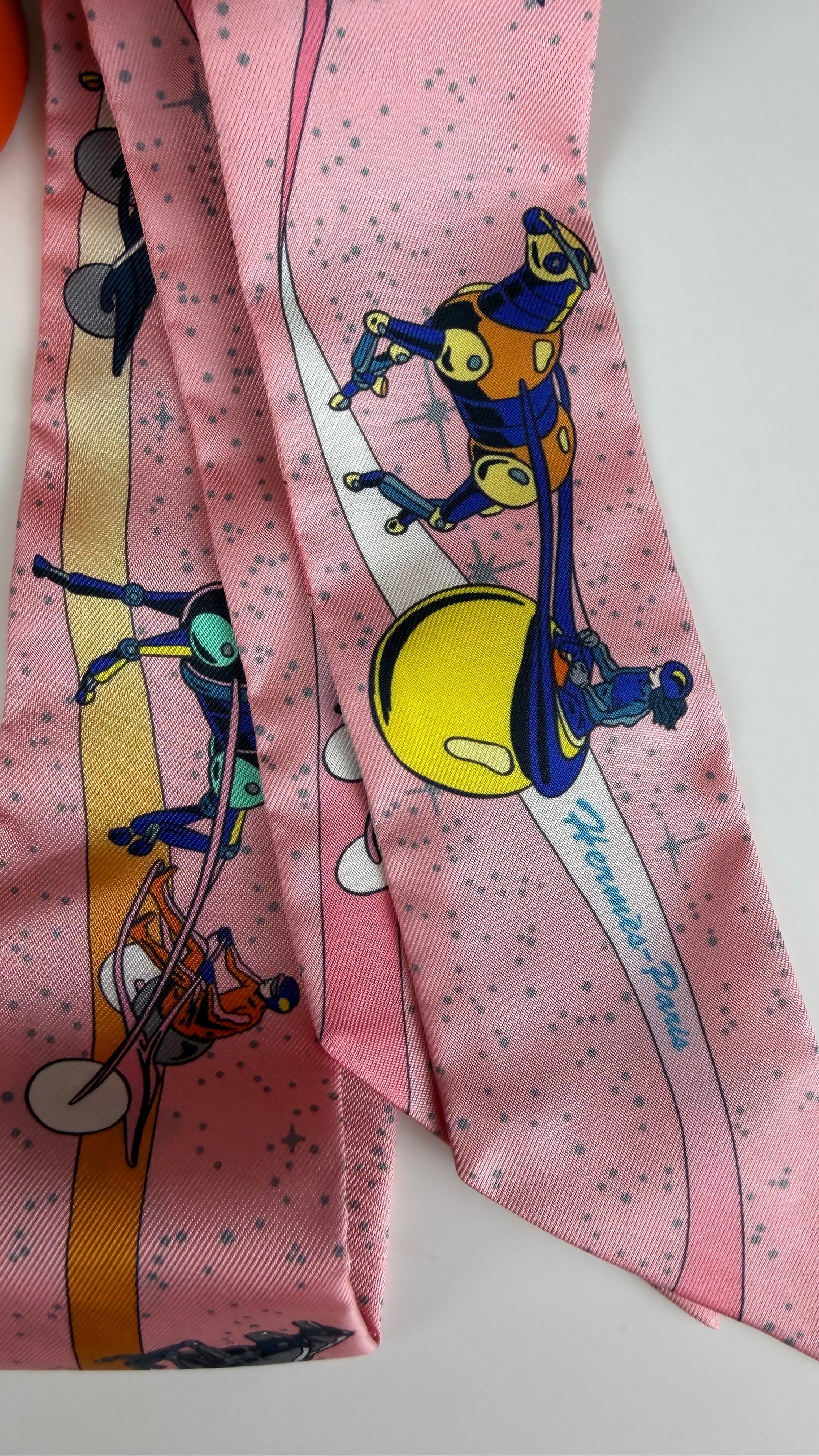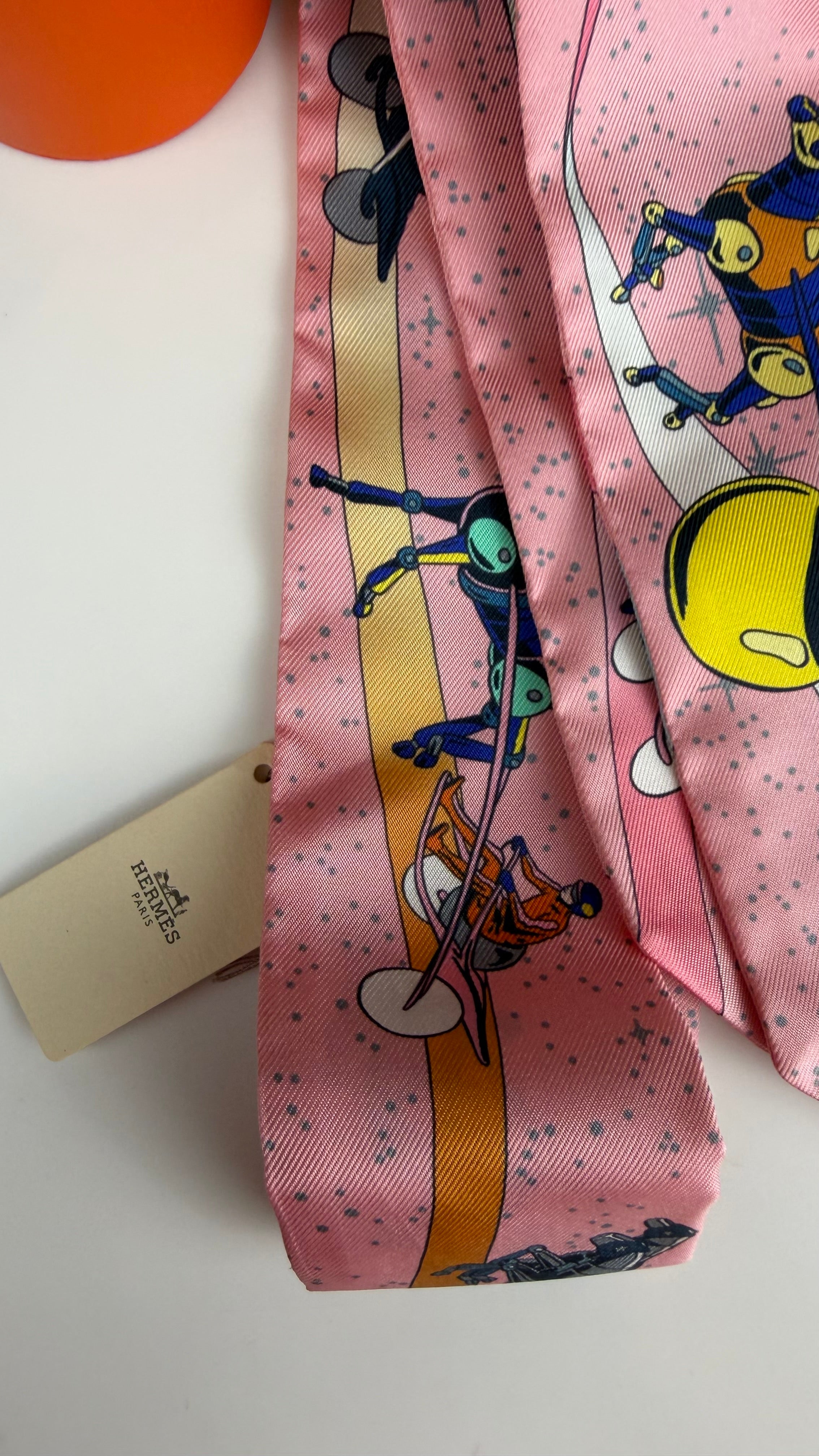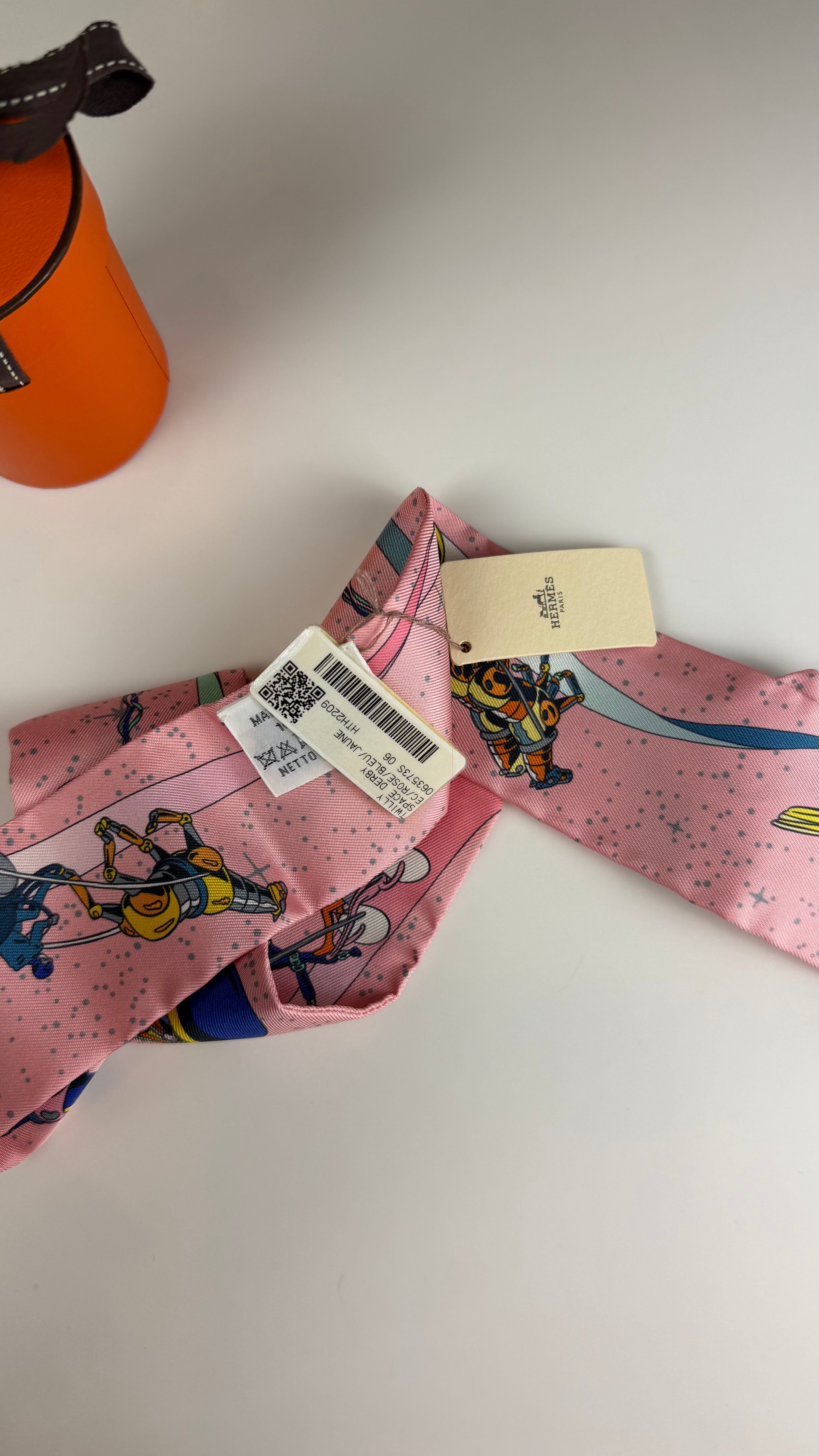 O Aéronefs Paris Silk Twilly Scarf da Hermès é uma celebração criativa do universo da aviação, reinterpretado com o toque lúdico e artístico característico da Maison. Confeccionado em 100% seda, este twilly apresenta uma estampa divertida com aviões, personagens e elementos gráficos sobre um fundo rosa pontilhado, criando um visual moderno e cheio de personalidade.