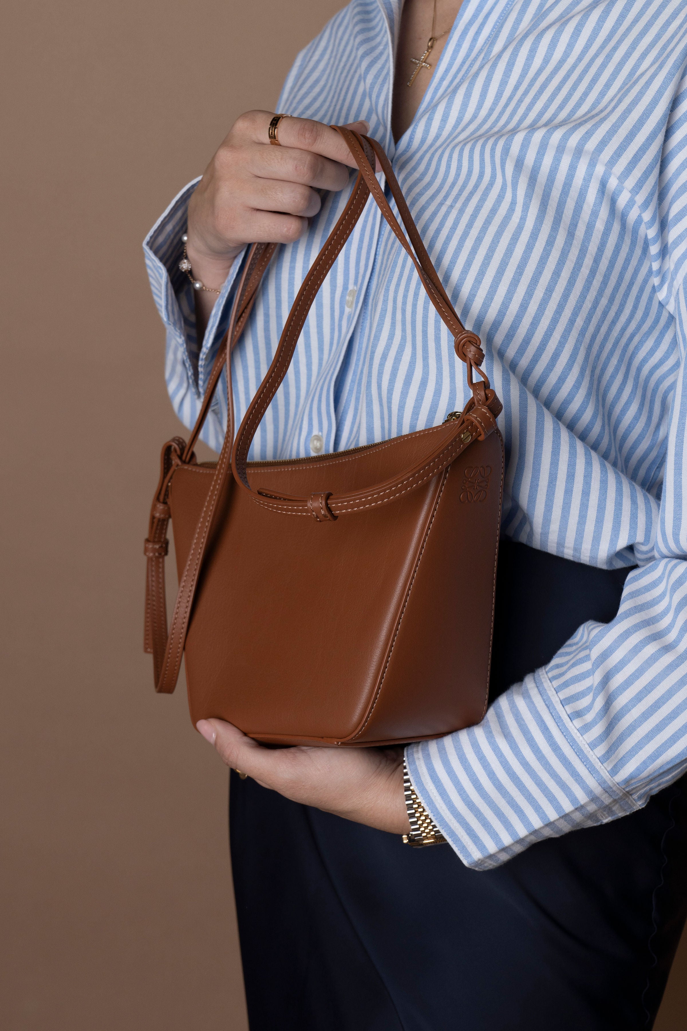 A Loewe Hammock Hobo Small é a reinterpretação contemporânea do design versátil e arquitetônico da icônica bolsa Hammock. Confeccionada em couro de bezerro granulado de altíssima qualidade, a peça combina fluidez, leveza e elegância, mantendo a essência artesanal característica da Loewe.