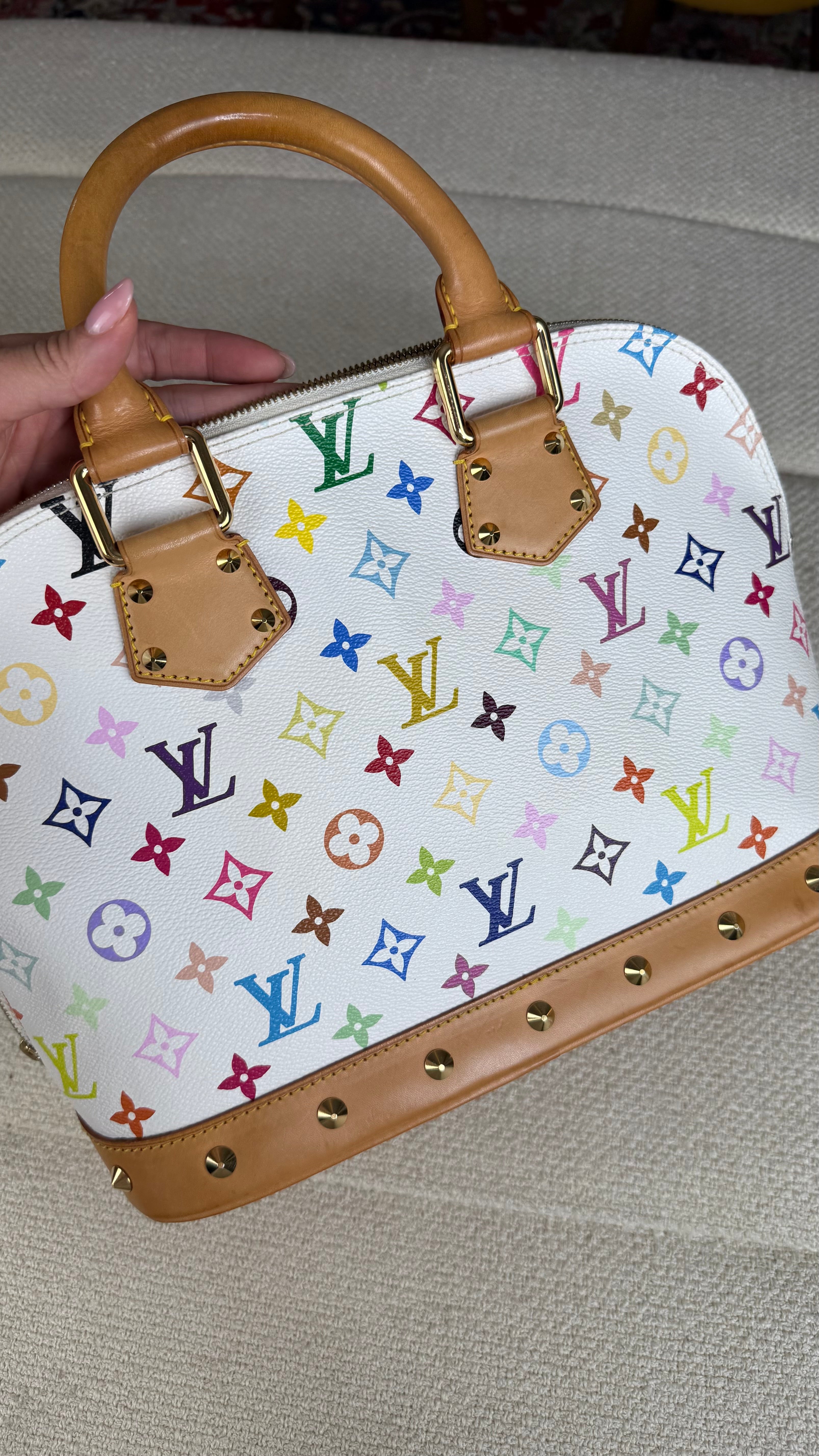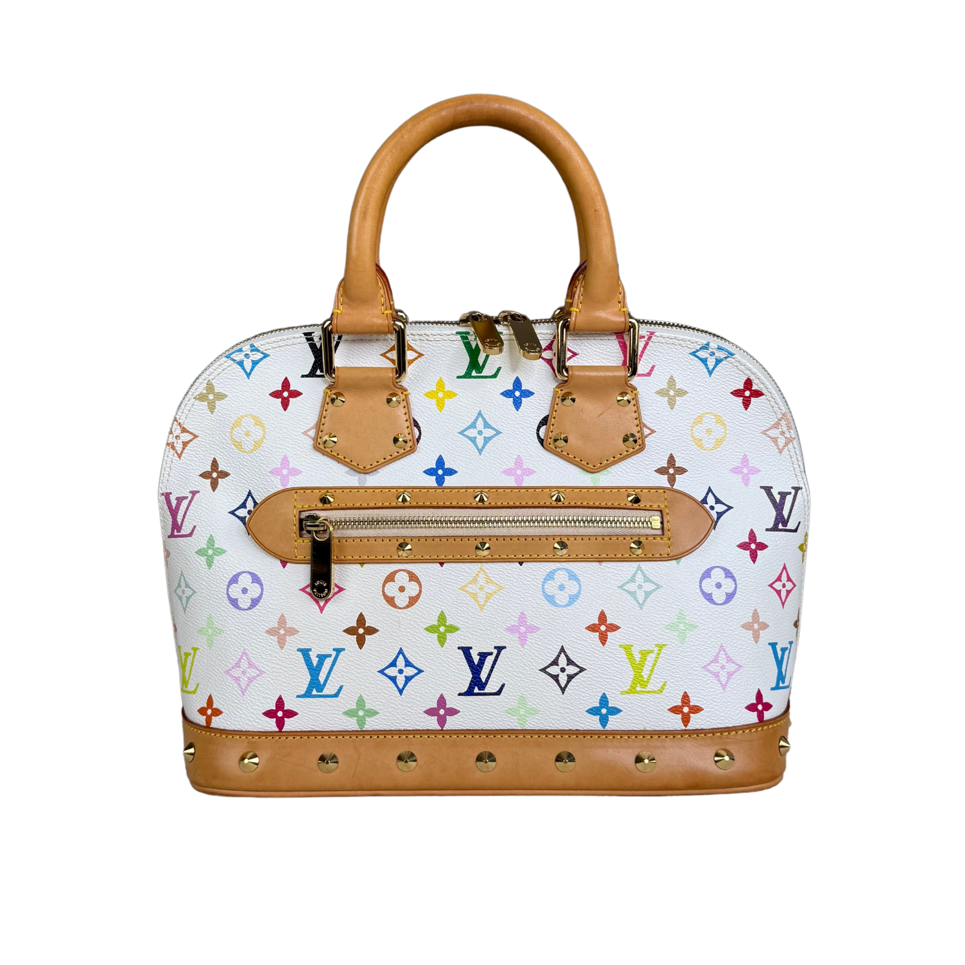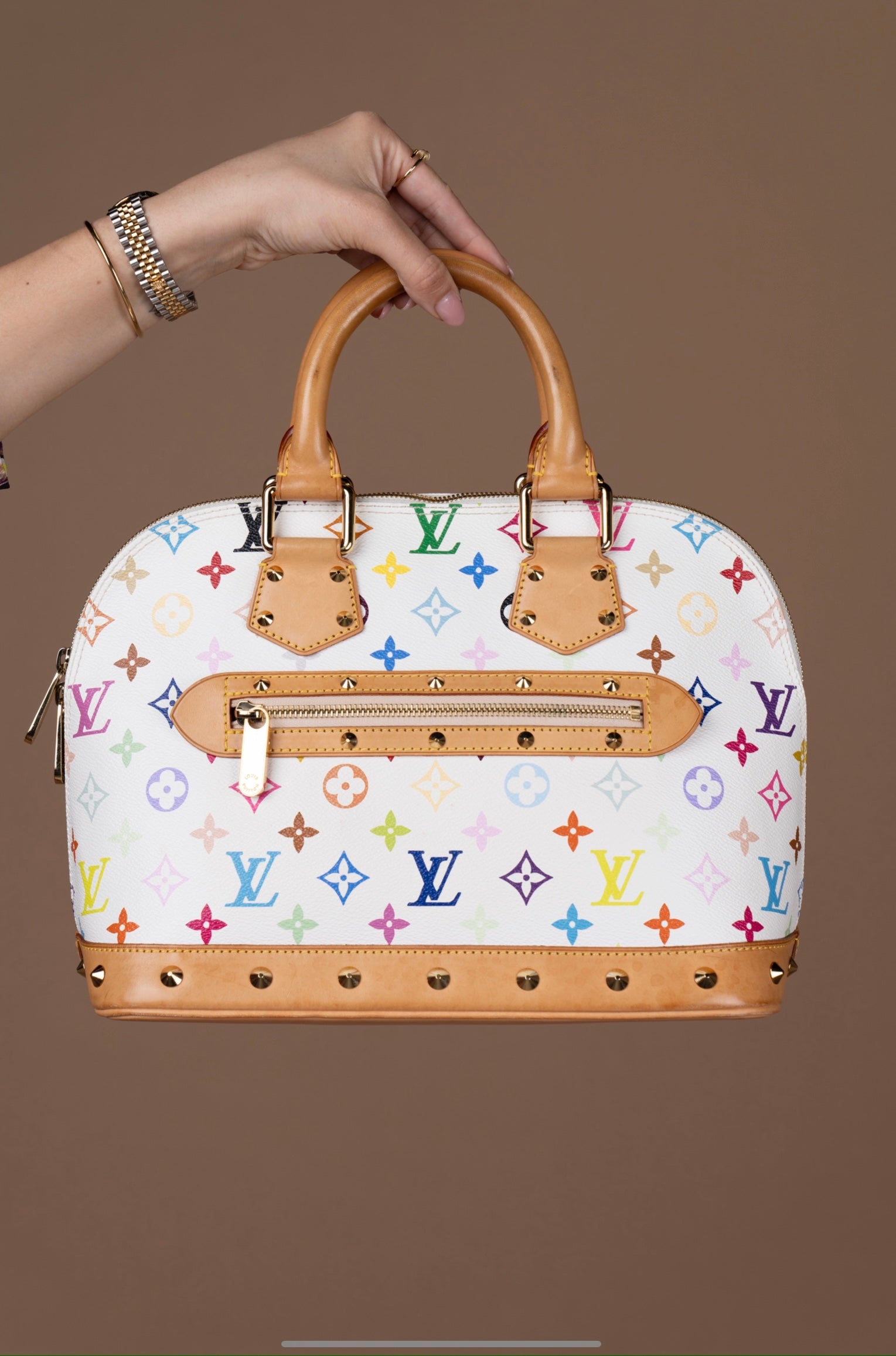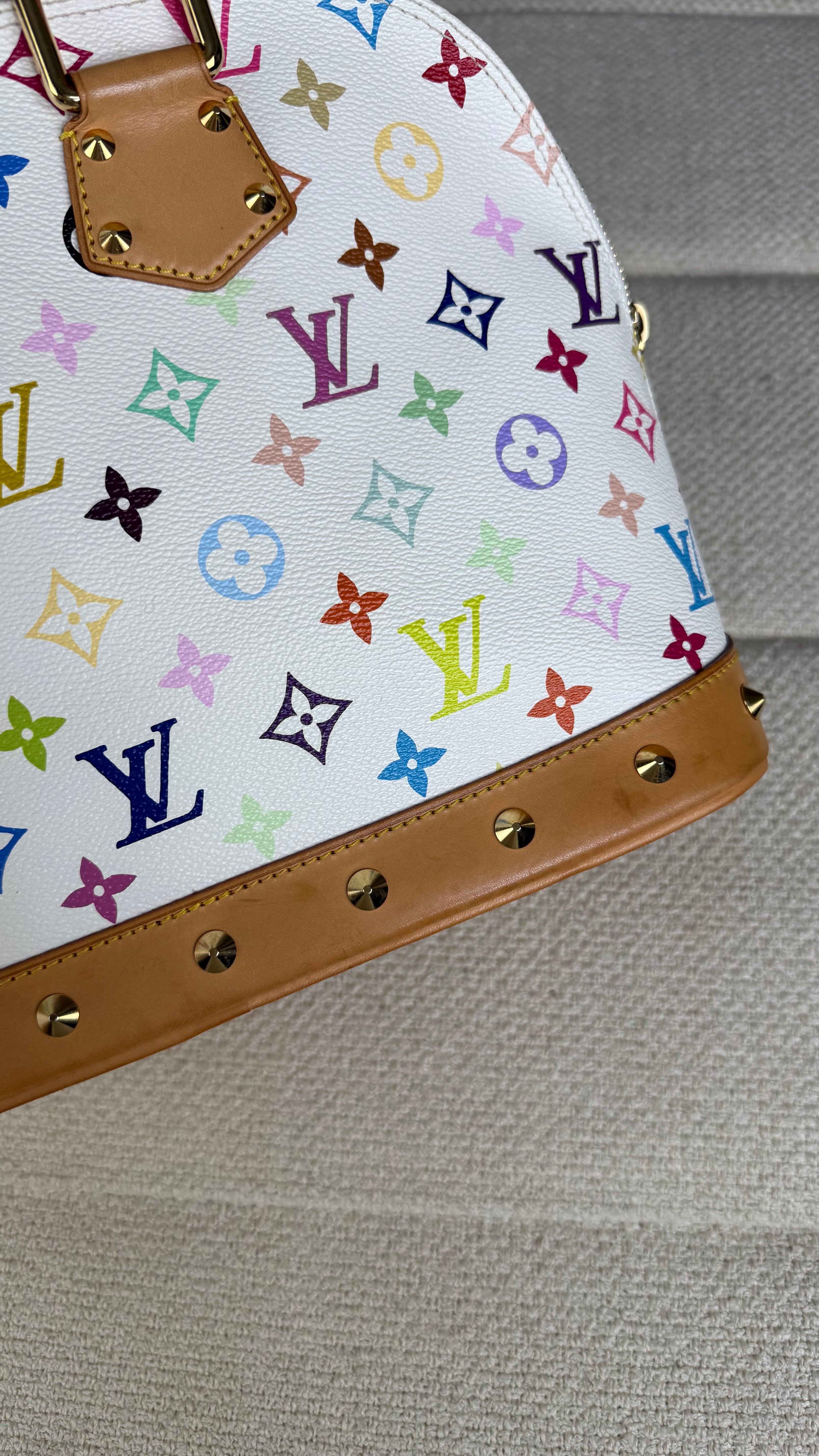 A Louis Vuitton Alma PM x Takashi Murakami é uma das colaborações mais emblemáticas entre moda e arte pop, lançada originalmente em 2003 sob a direção criativa de Marc Jacobs. Esta edição especial da clássica bolsa Alma destaca-se pelo uso do vibrante padrão Monogram Multicolore, criado por Murakami, que reinterpreta o monograma tradicional da Louis Vuitton com 33 cores serigrafadas sobre canvas branco, conferindo-lhe um visual lúdico e contemporâneo.