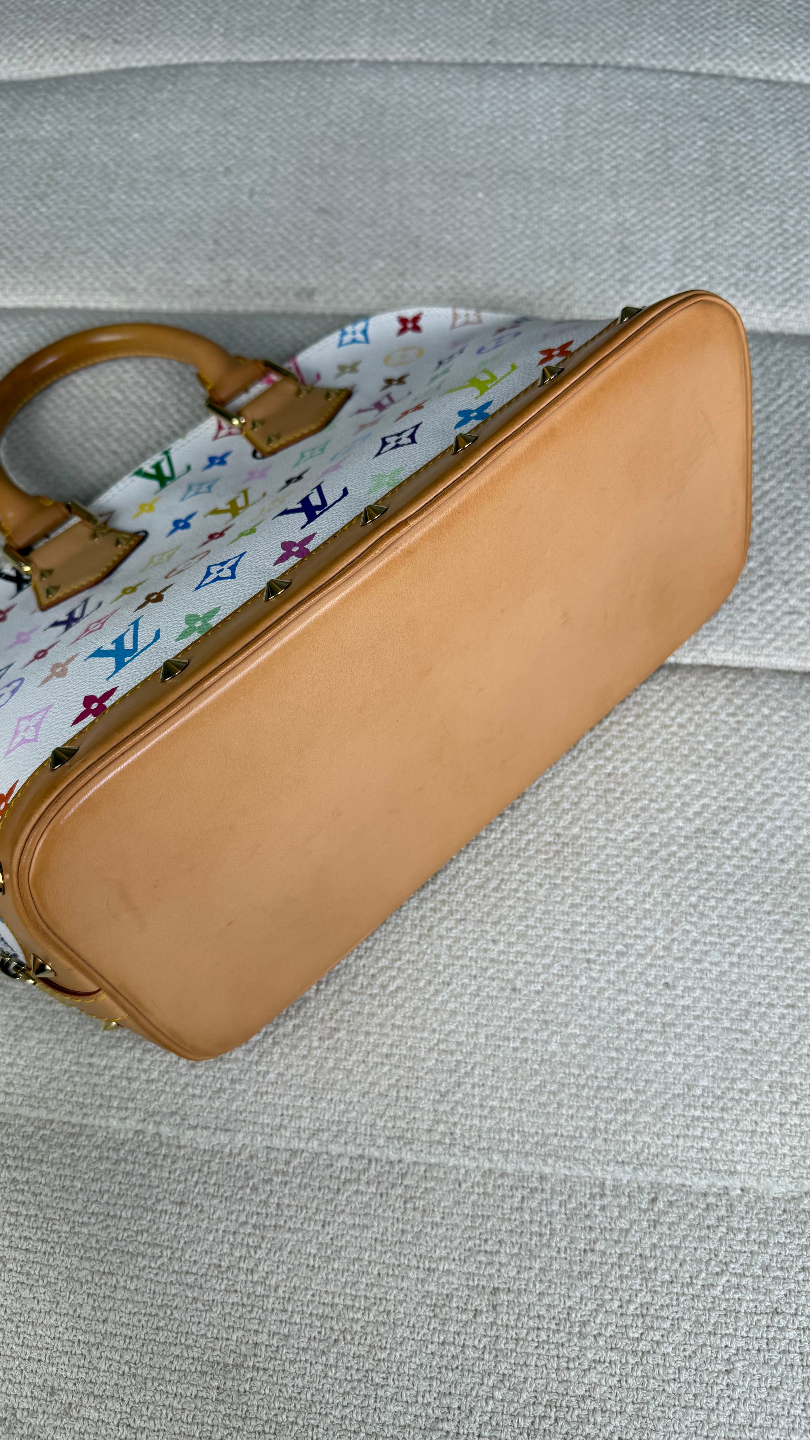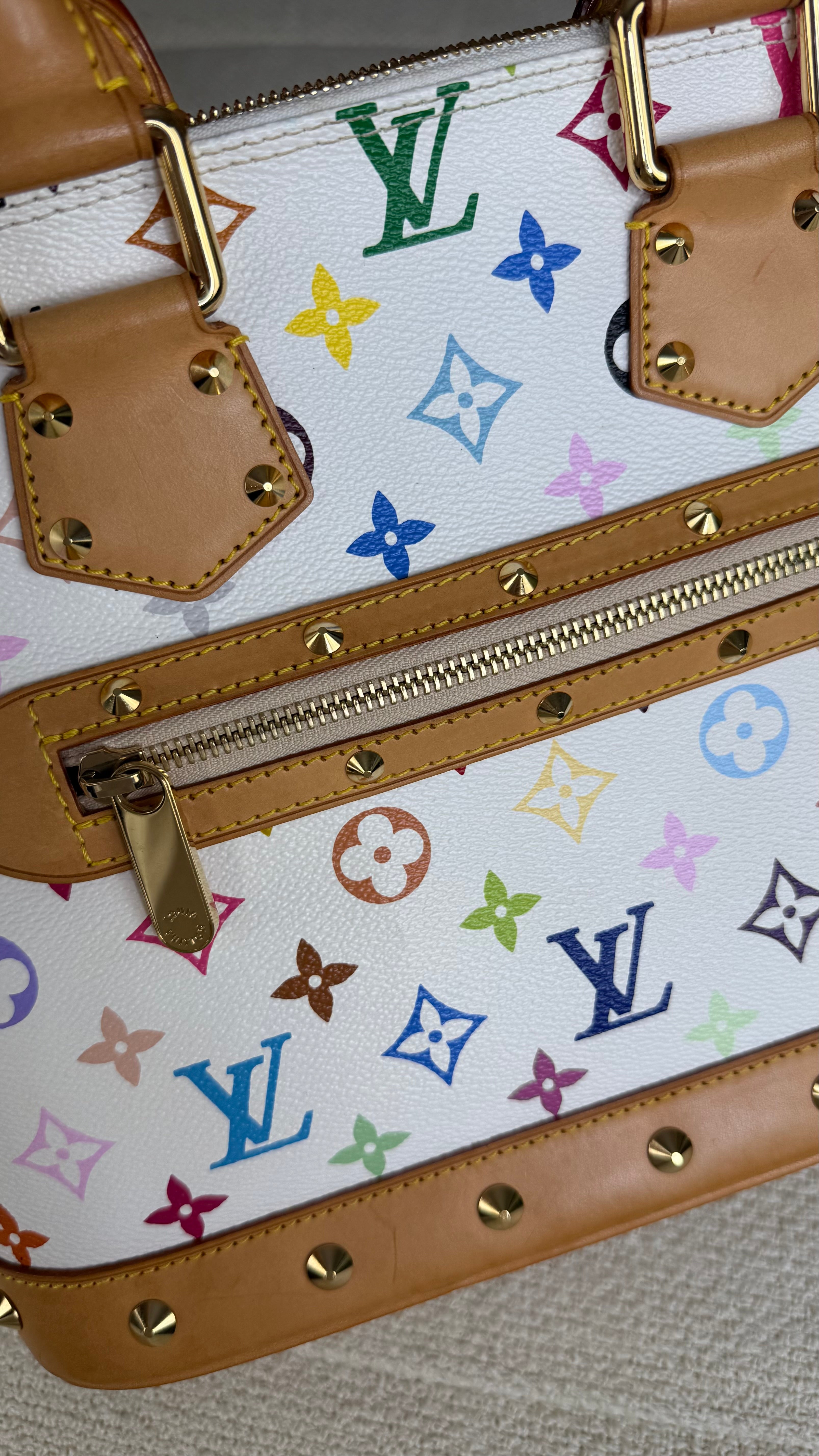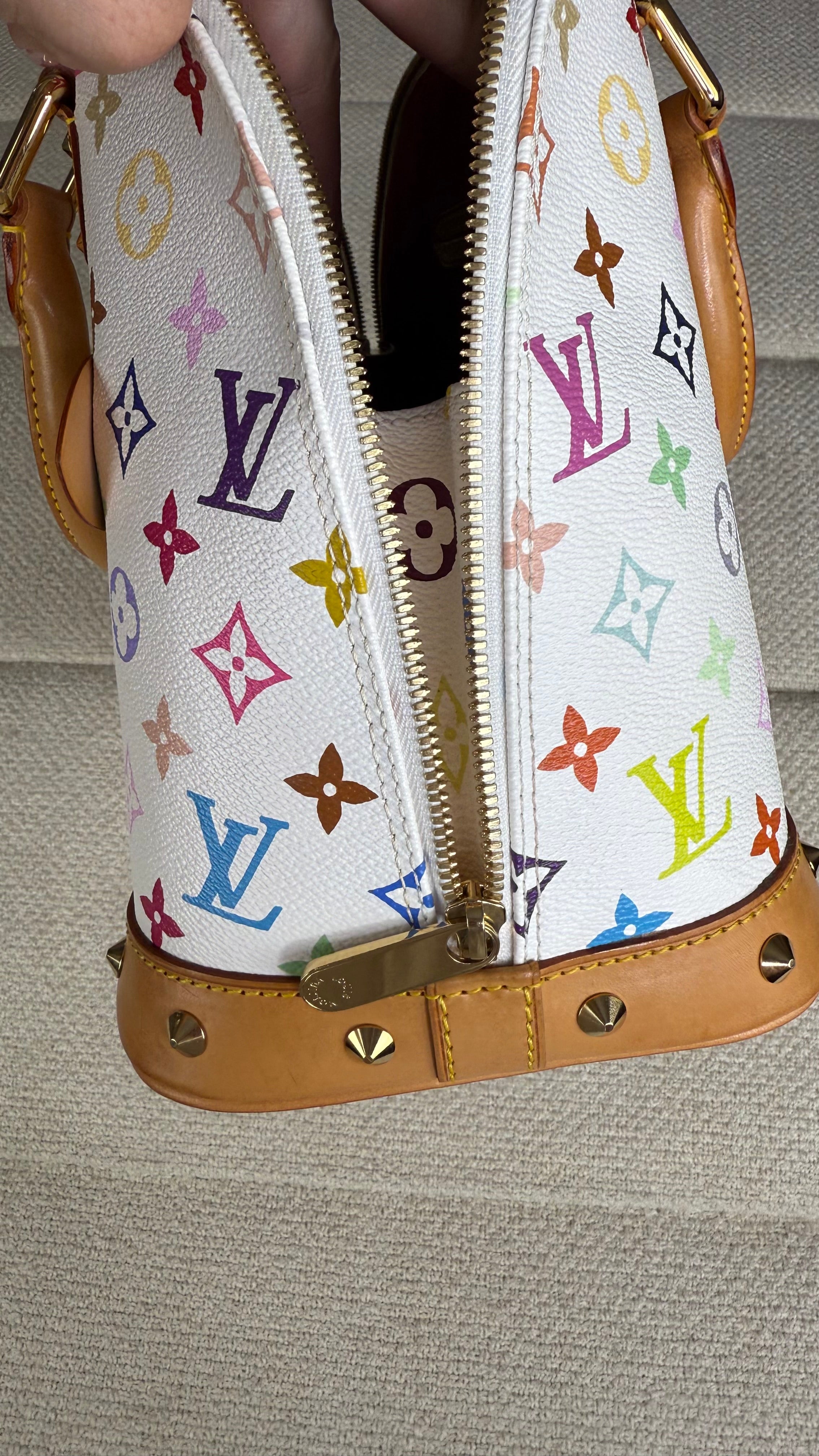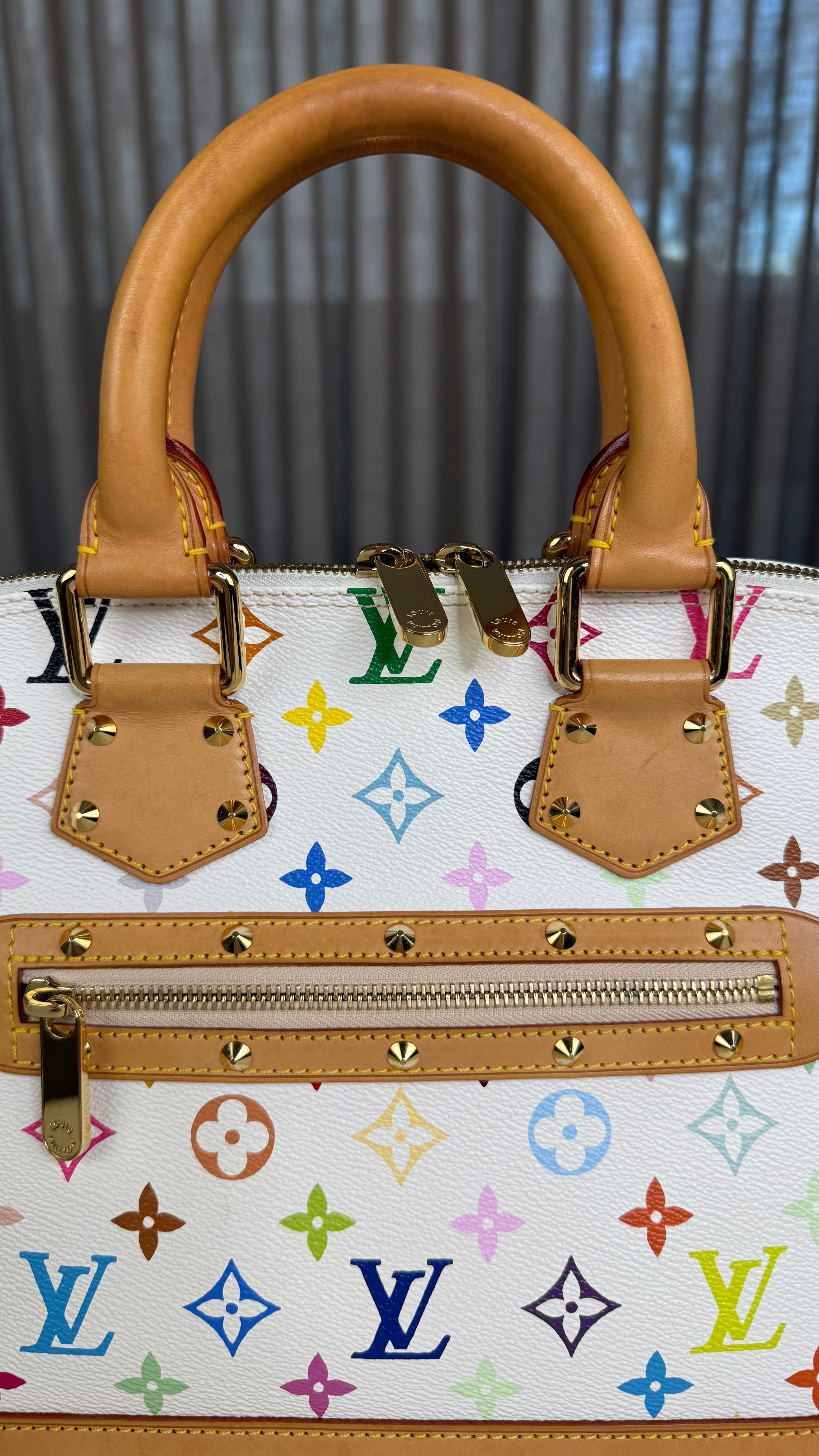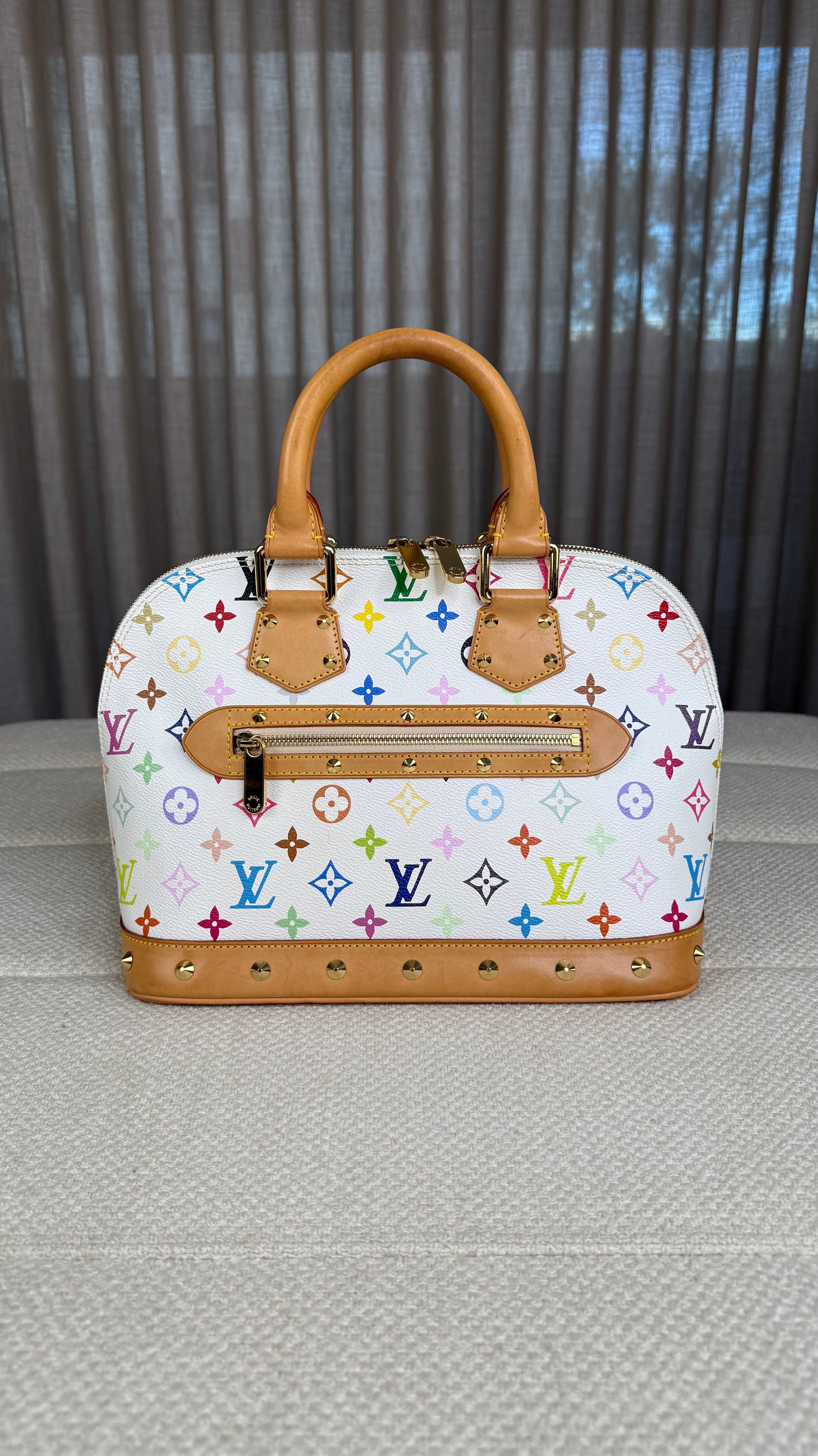 A Louis Vuitton Alma PM x Takashi Murakami é uma das colaborações mais emblemáticas entre moda e arte pop, lançada originalmente em 2003 sob a direção criativa de Marc Jacobs. Esta edição especial da clássica bolsa Alma destaca-se pelo uso do vibrante padrão Monogram Multicolore, criado por Murakami, que reinterpreta o monograma tradicional da Louis Vuitton com 33 cores serigrafadas sobre canvas branco, conferindo-lhe um visual lúdico e contemporâneo.