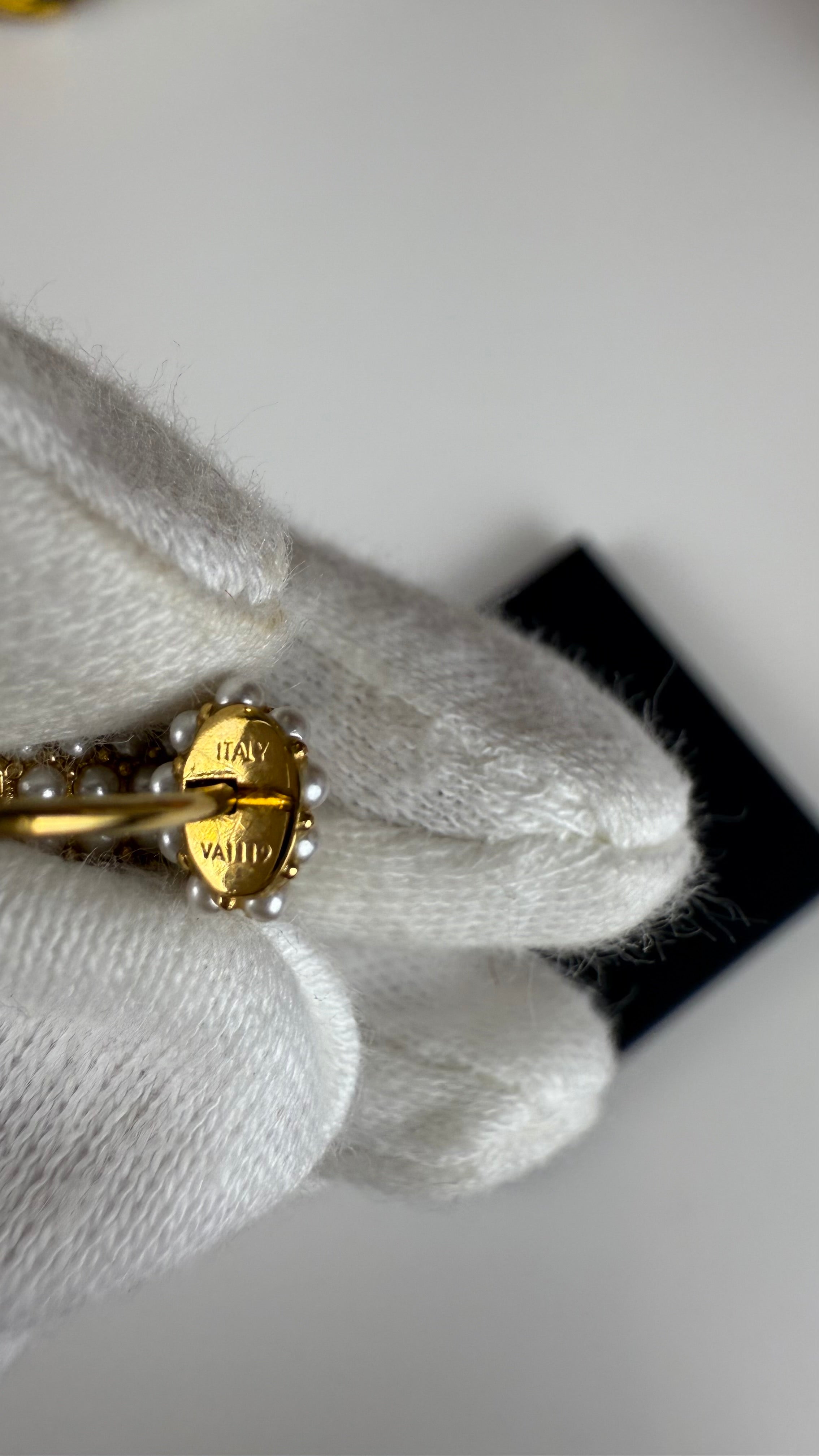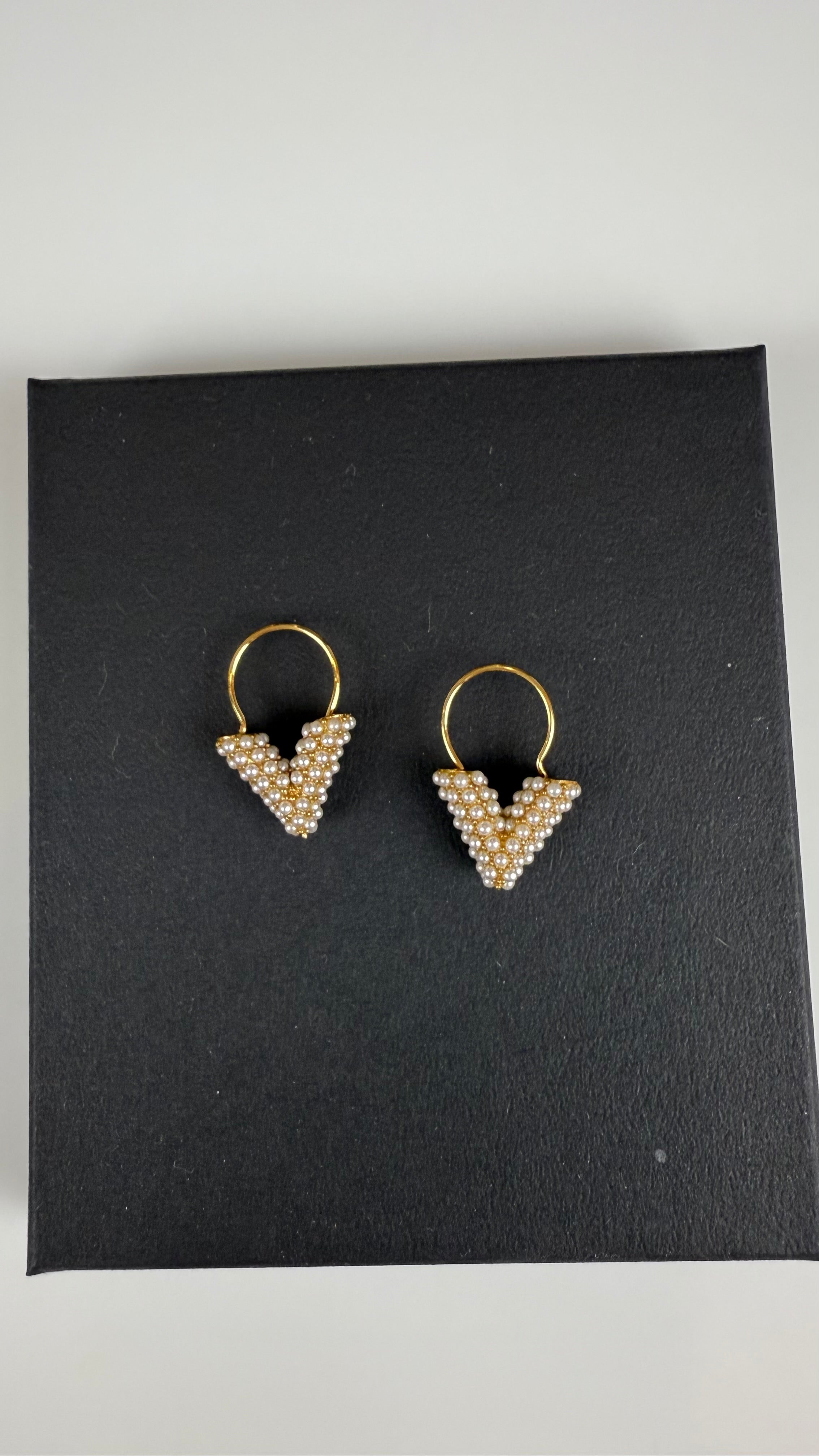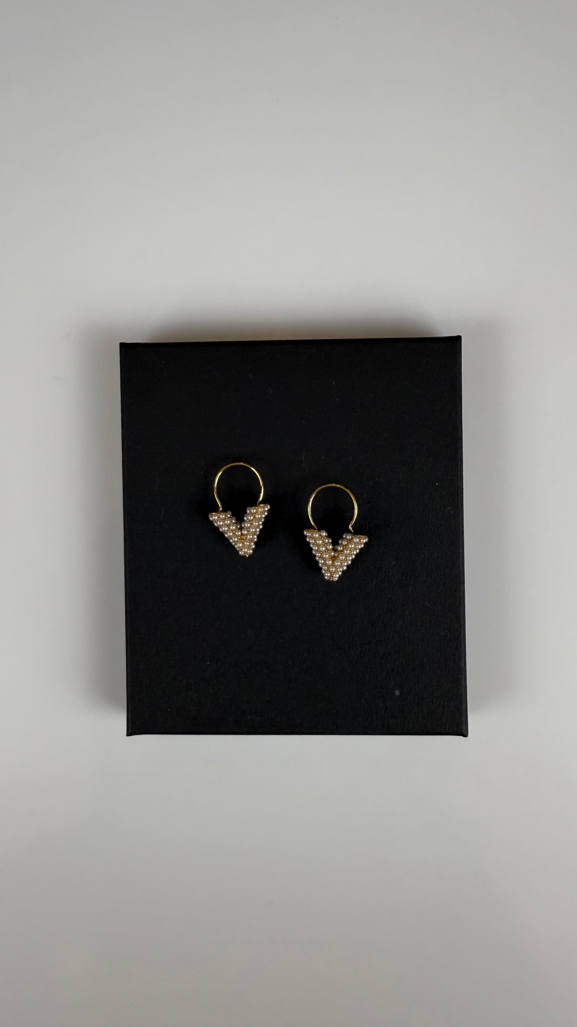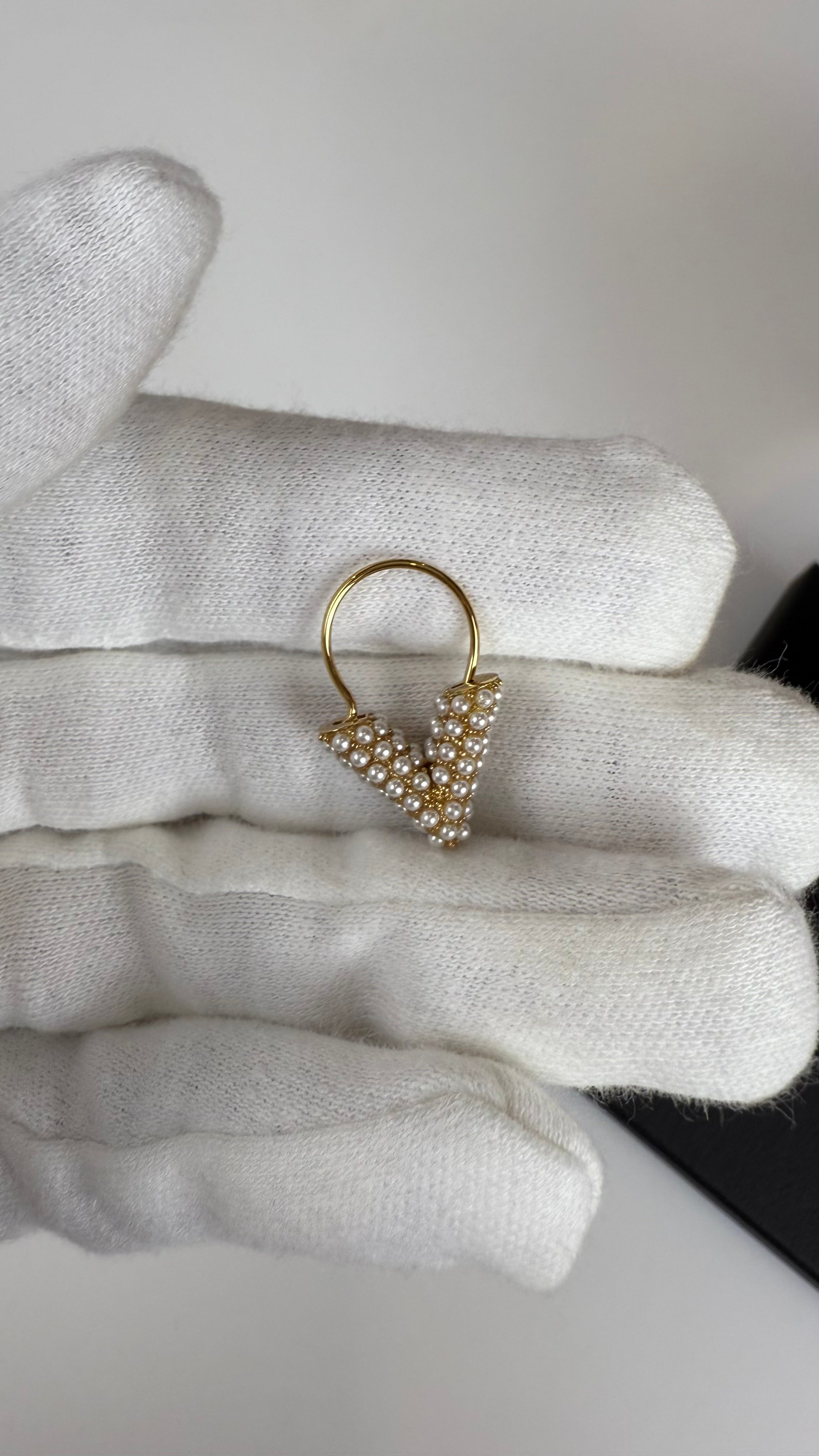 Elegantes brincos da Louis Vuitton em formato de aro dourado com pendente em “V”, símbolo icónico da Maison. O design é enriquecido por minuciosas pérolas aplicadas, que conferem sofisticação e brilho ao acessório. Produzidos em Itália, unem o luxo intemporal da LV ao charme contemporâneo, tornando-os perfeitos tanto para o dia a dia como para ocasiões especiais.