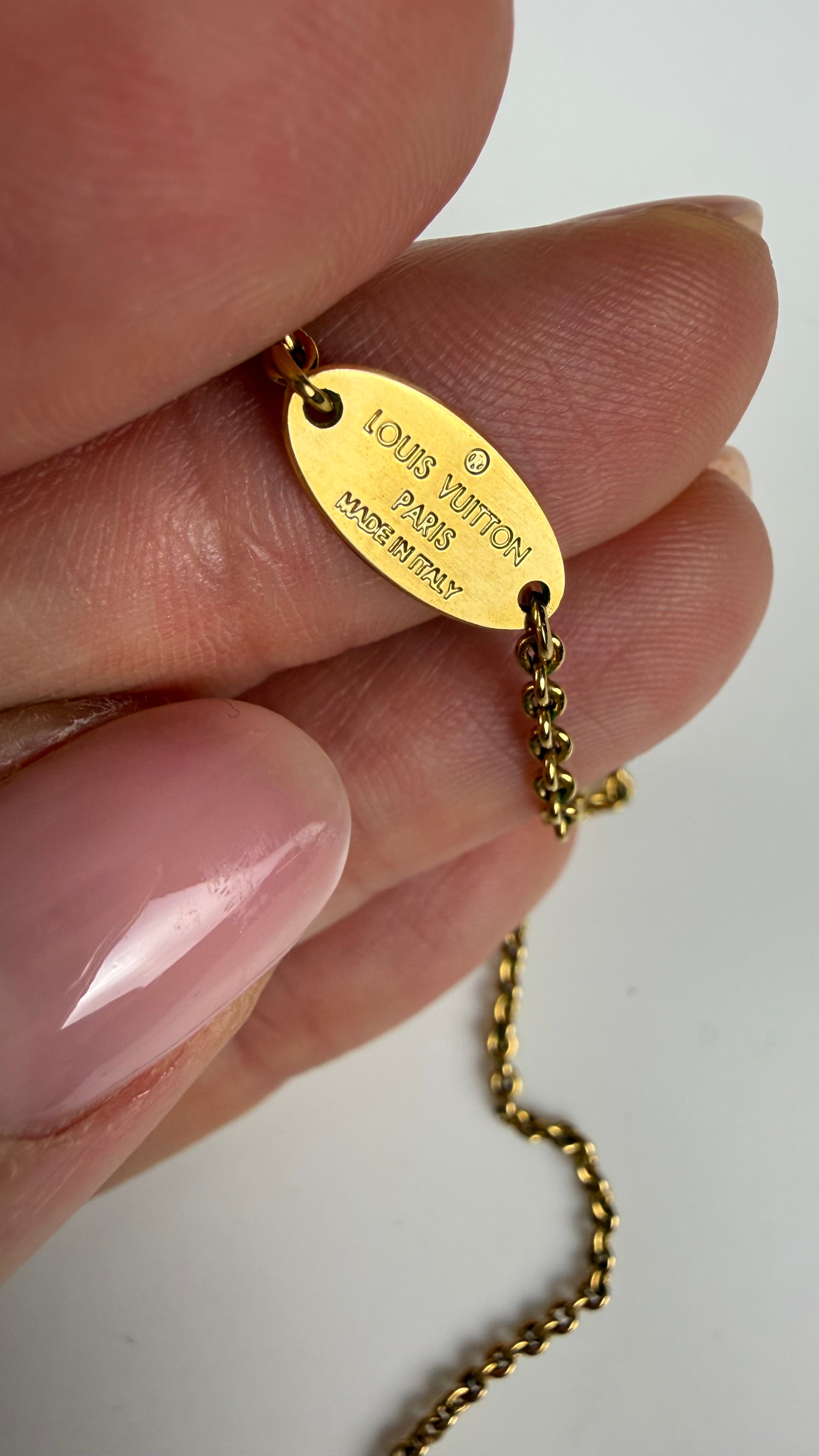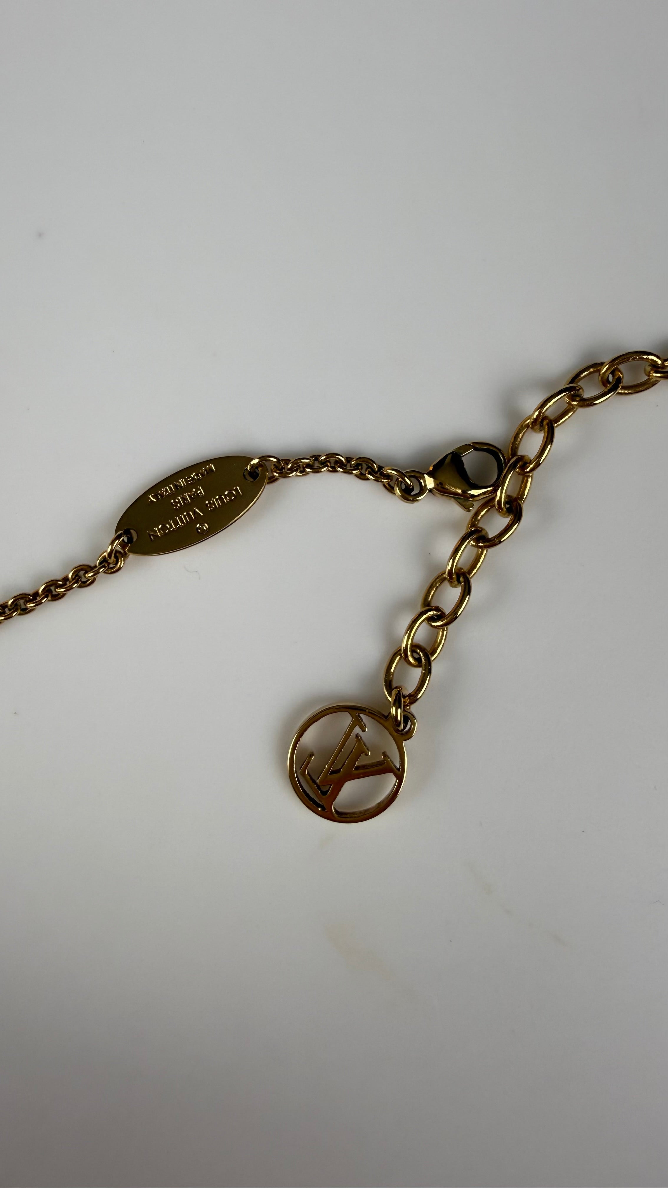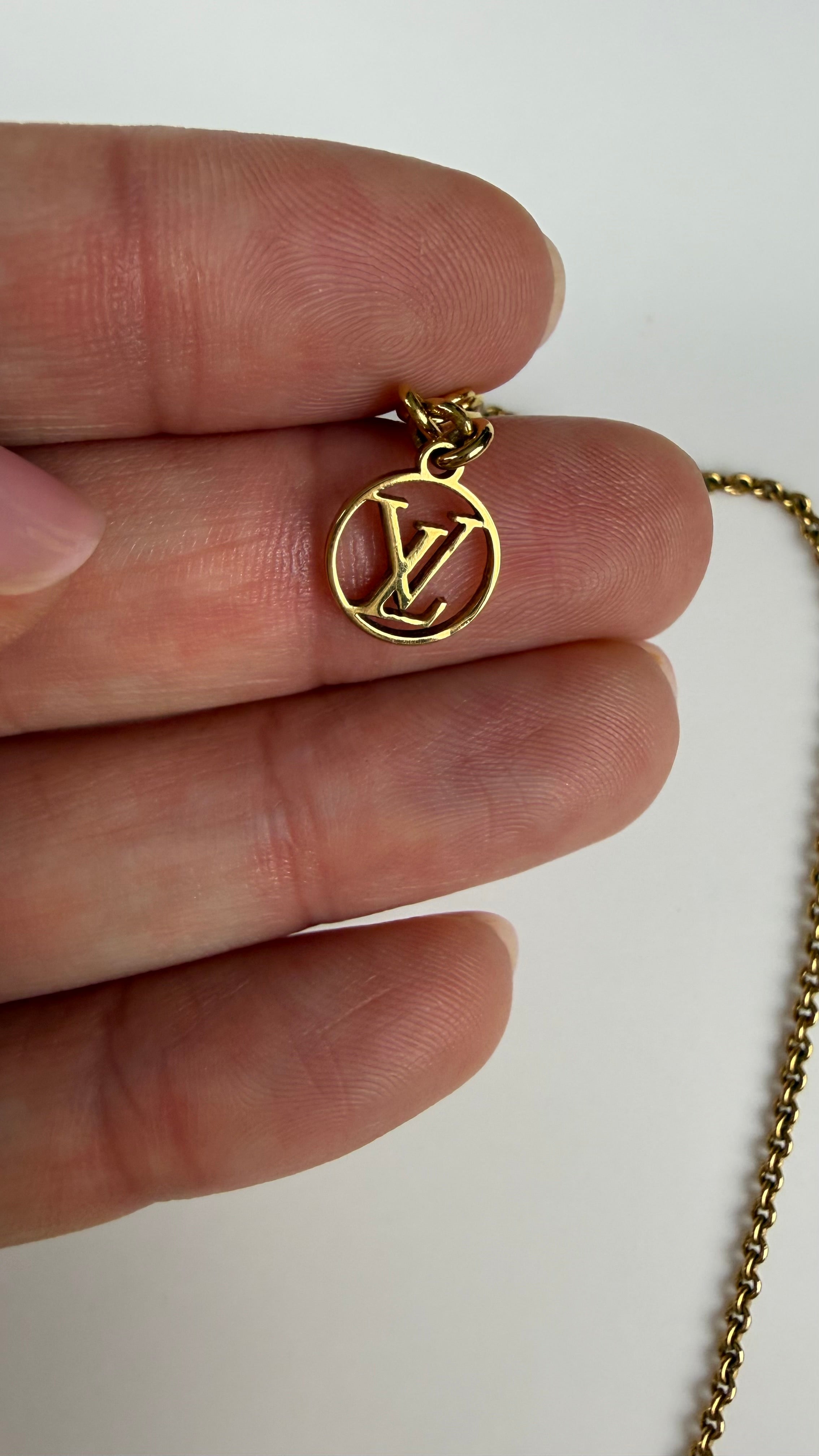 O pingente em metal dourado polido possui acabamento brilhante e traz o discreto monograma LV na base, garantindo charme e autenticidade. A corrente também em metal dourado complementa o design moderno e sofisticado, perfeito para usar sozinho ou combinado com outras peças.