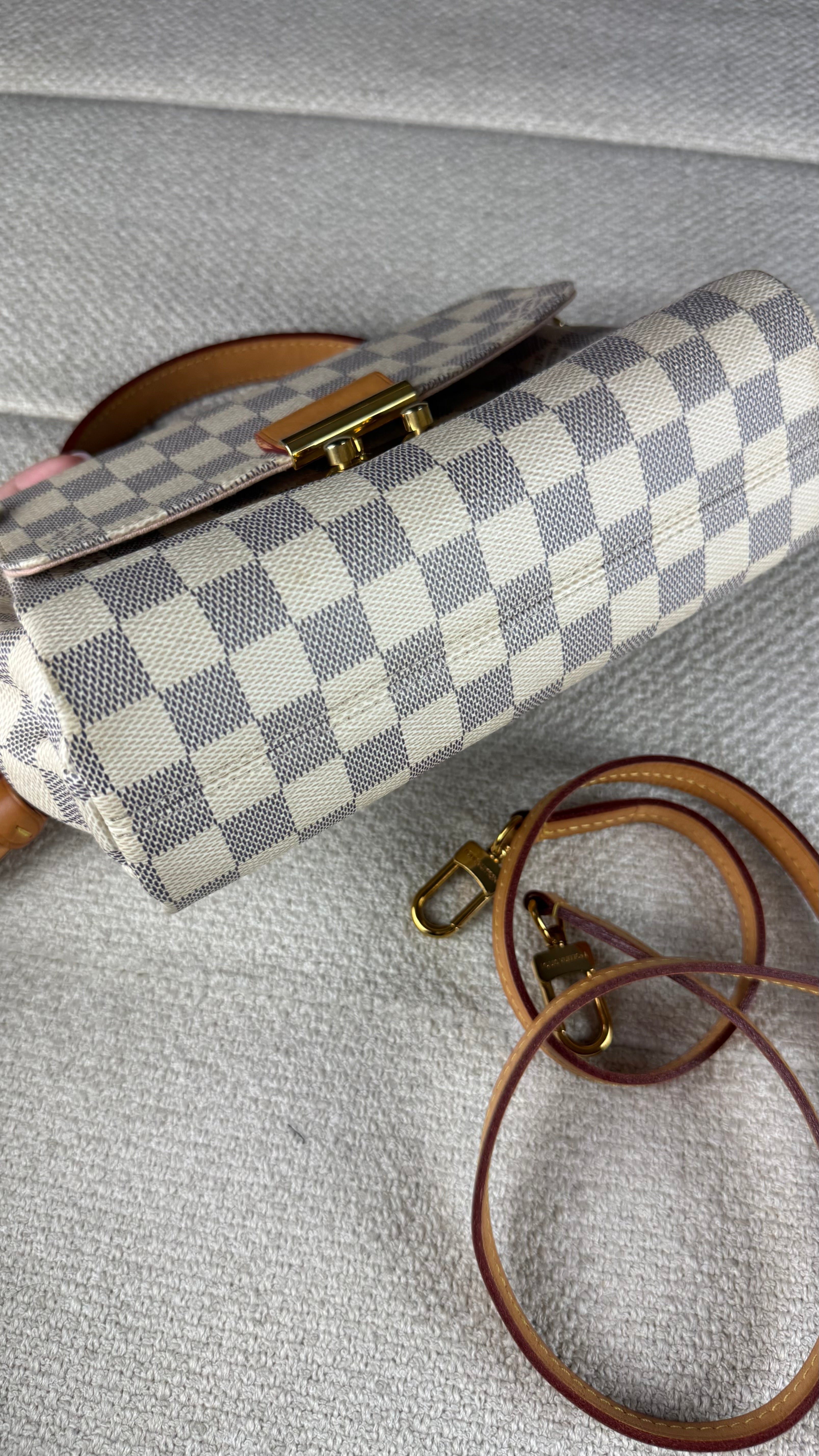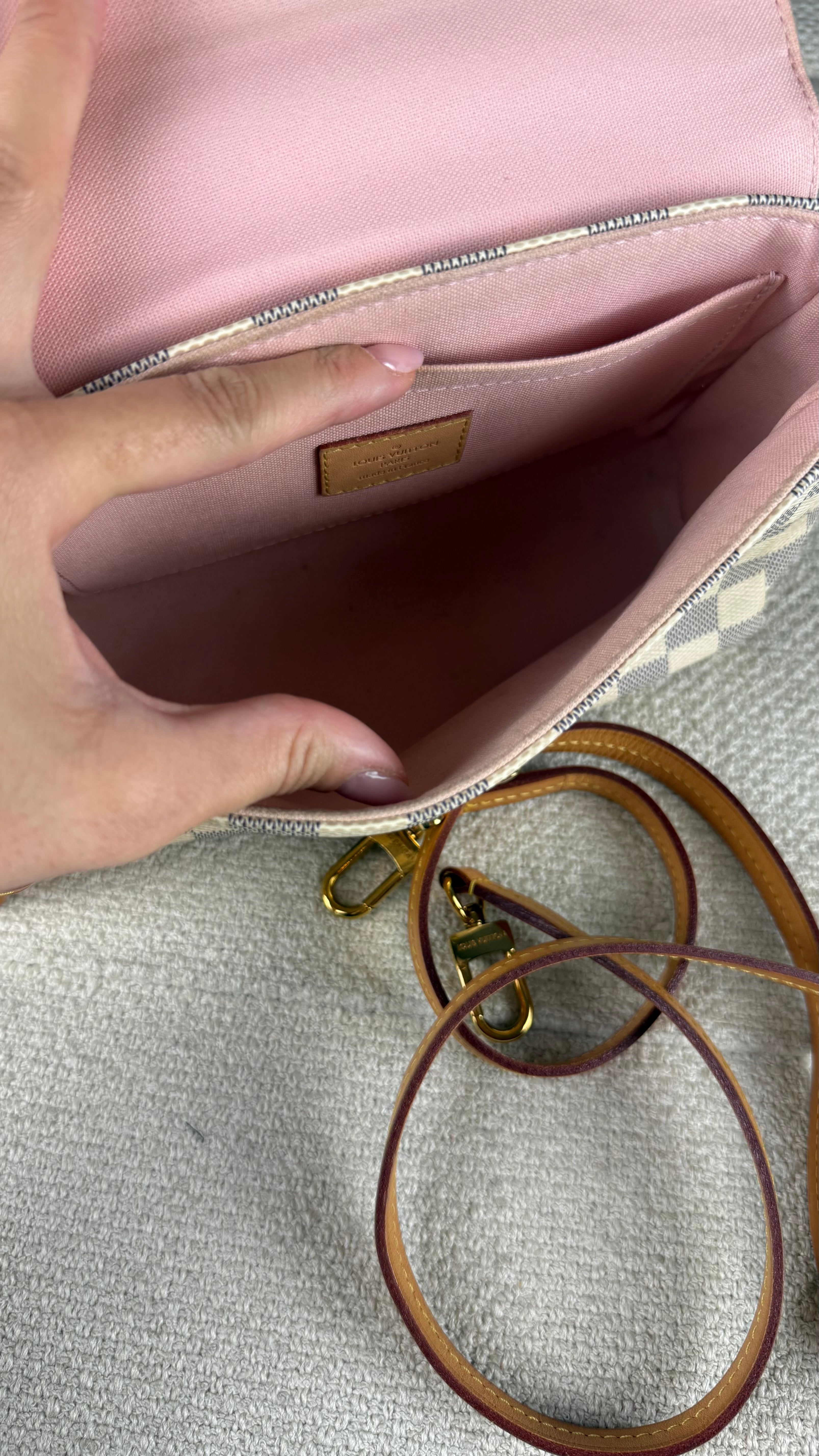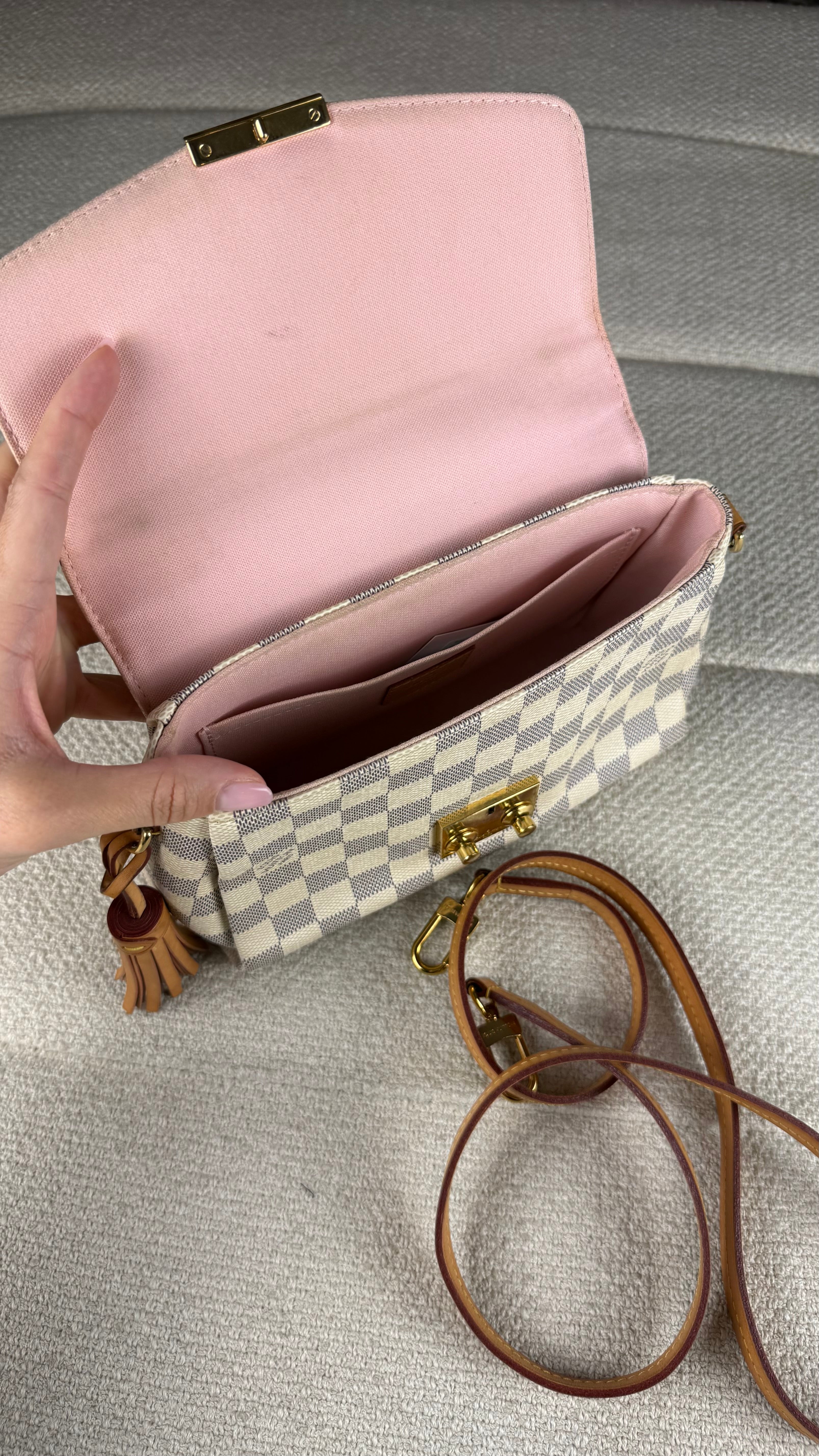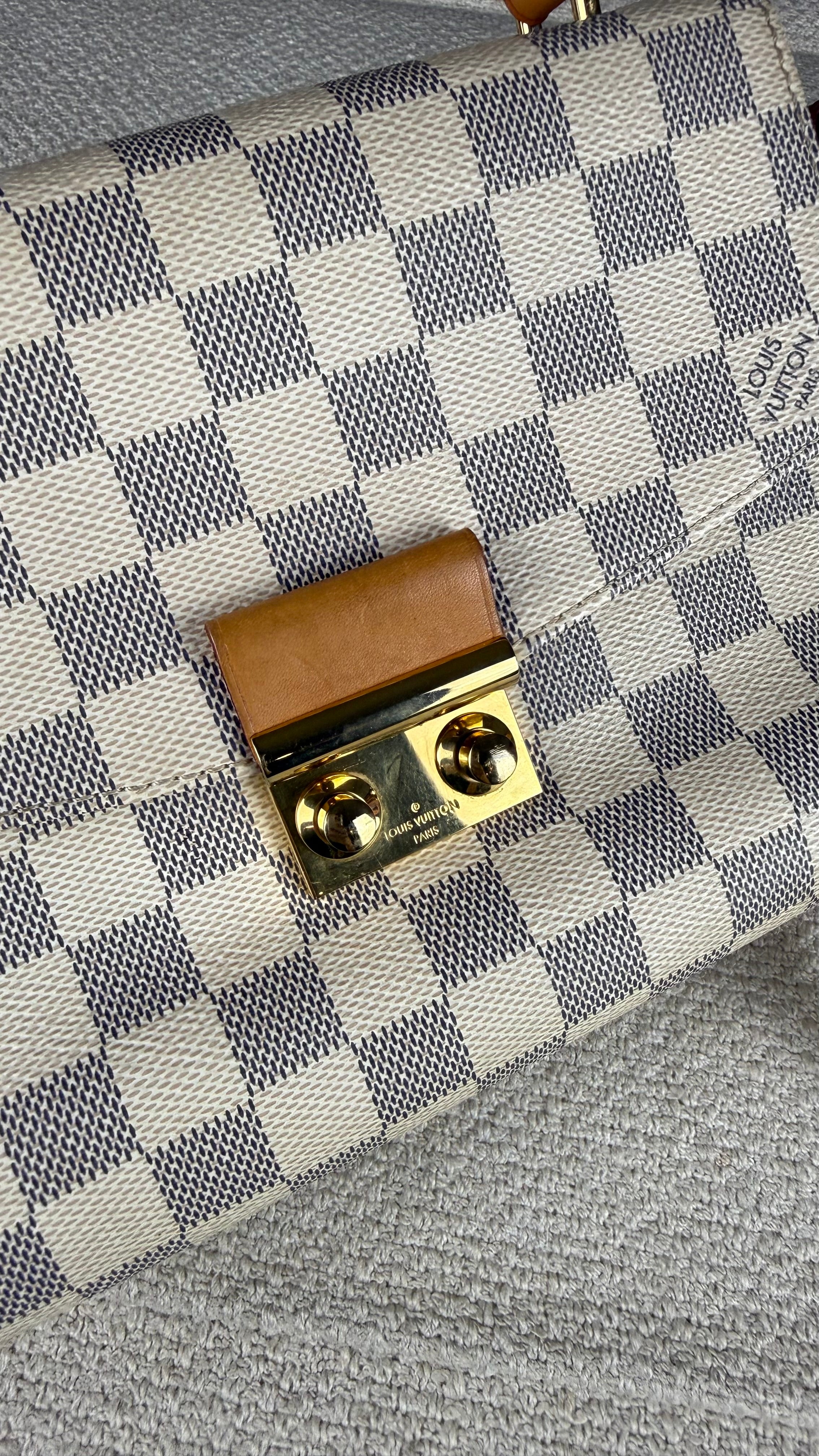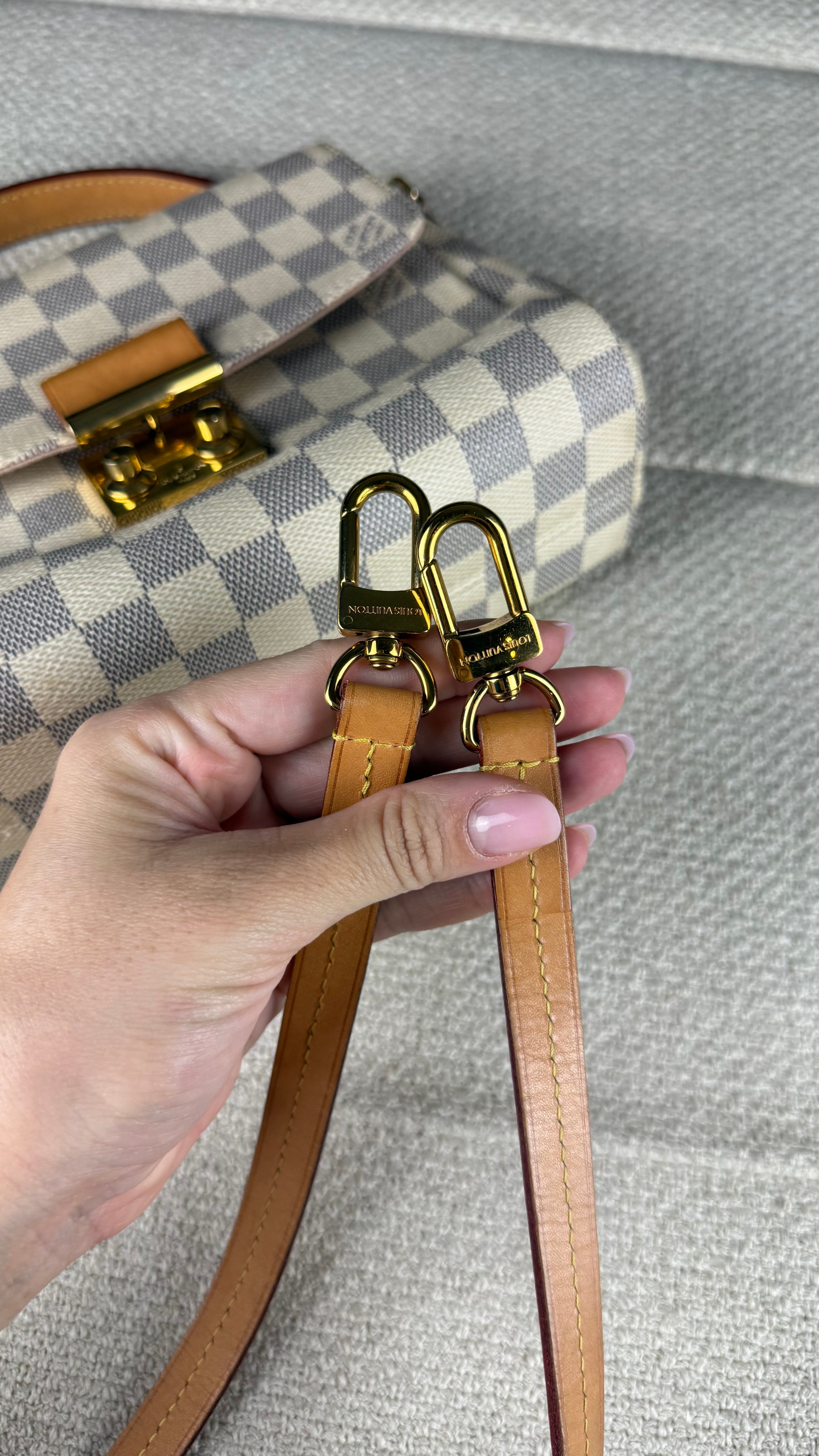A bolsa Louis Vuitton Croisette em Damier Azur é uma peça compacta e elegante, ideal para ocasiões casuais e sofisticadas. Com um design moderno e detalhes refinados, ela combina funcionalidade com o estilo icônico da marca.