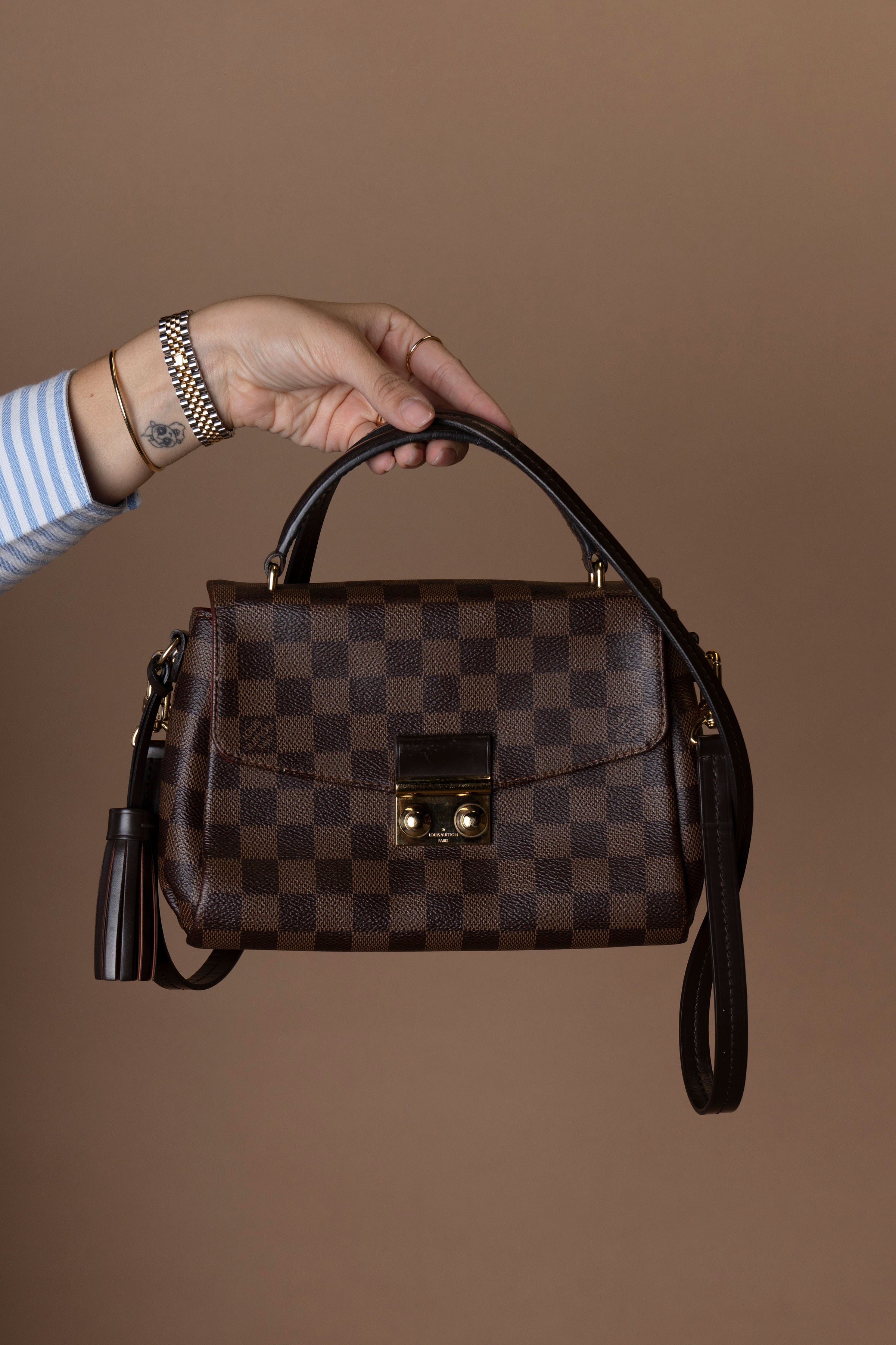 A Croisette é um modelo pequeno, mas estruturado, que se destaca pelo seu design sofisticado e funcional. Feita em canvas Damier Ebene, um dos padrões clássicos da Louis Vuitton, a bolsa combina elegância atemporal com praticidade contemporânea.