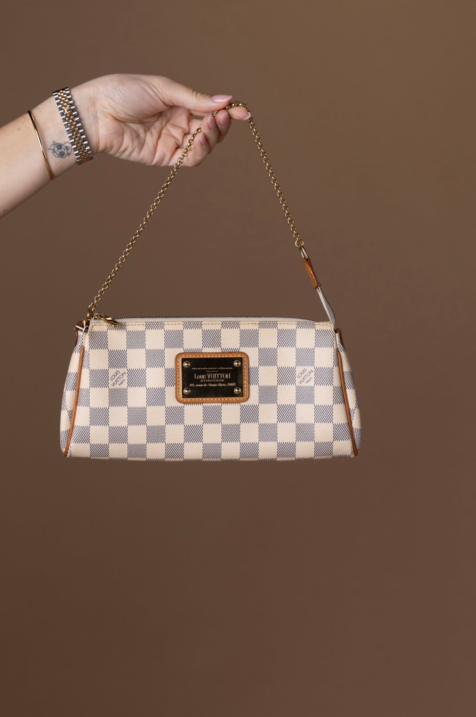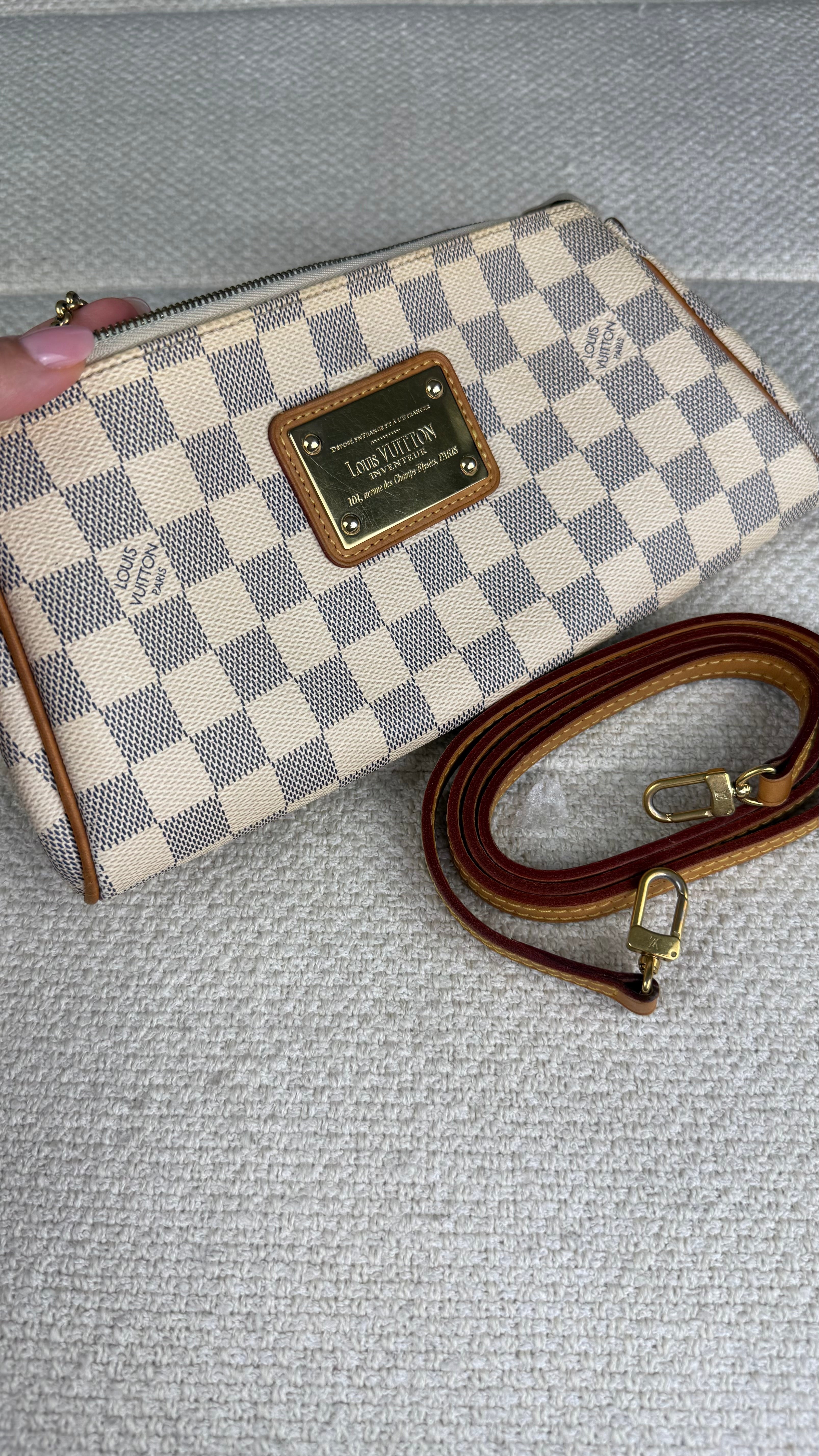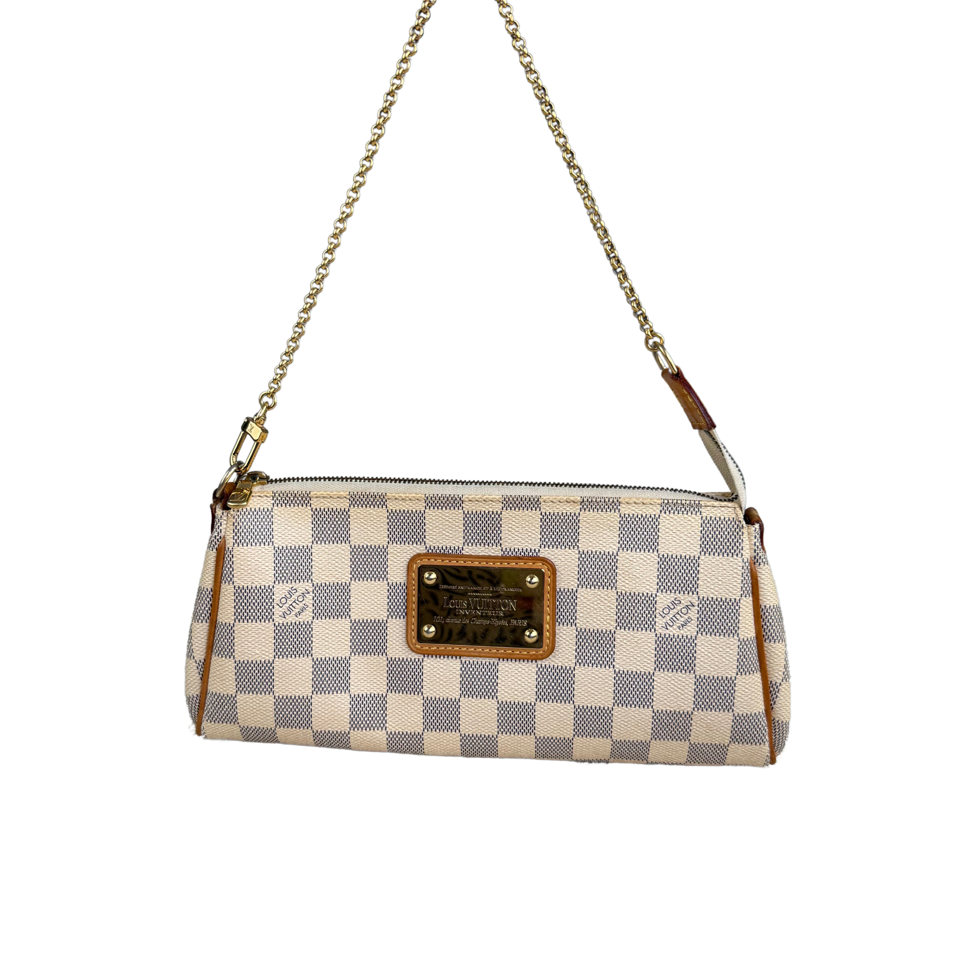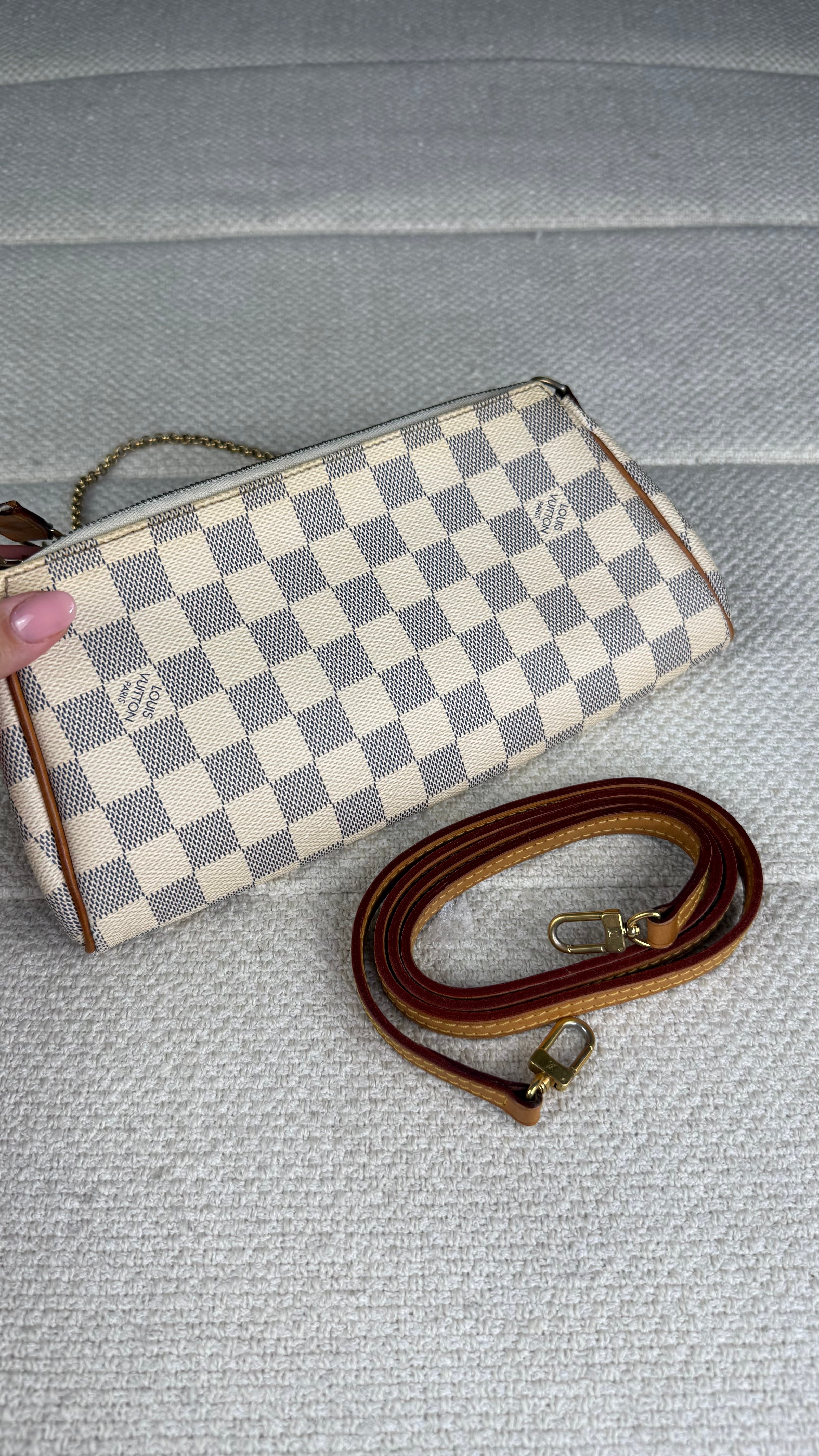 A Eva Clutch em Damier Azur é a combinação perfeita de charme e versatilidade. Compacta e elegante, ela pode ser usada como clutch de mão para eventos sofisticados ou como bolsa de ombro para um visual descontraído, graças à sua alça de corrente dourada e a tira de couro removível. Confeccionada em lona Damier Azur, com acabamento em couro natural, a Eva traz um toque de frescor e luminosidade a qualquer look, sendo ideal para dias ensolarados e noites especiais.