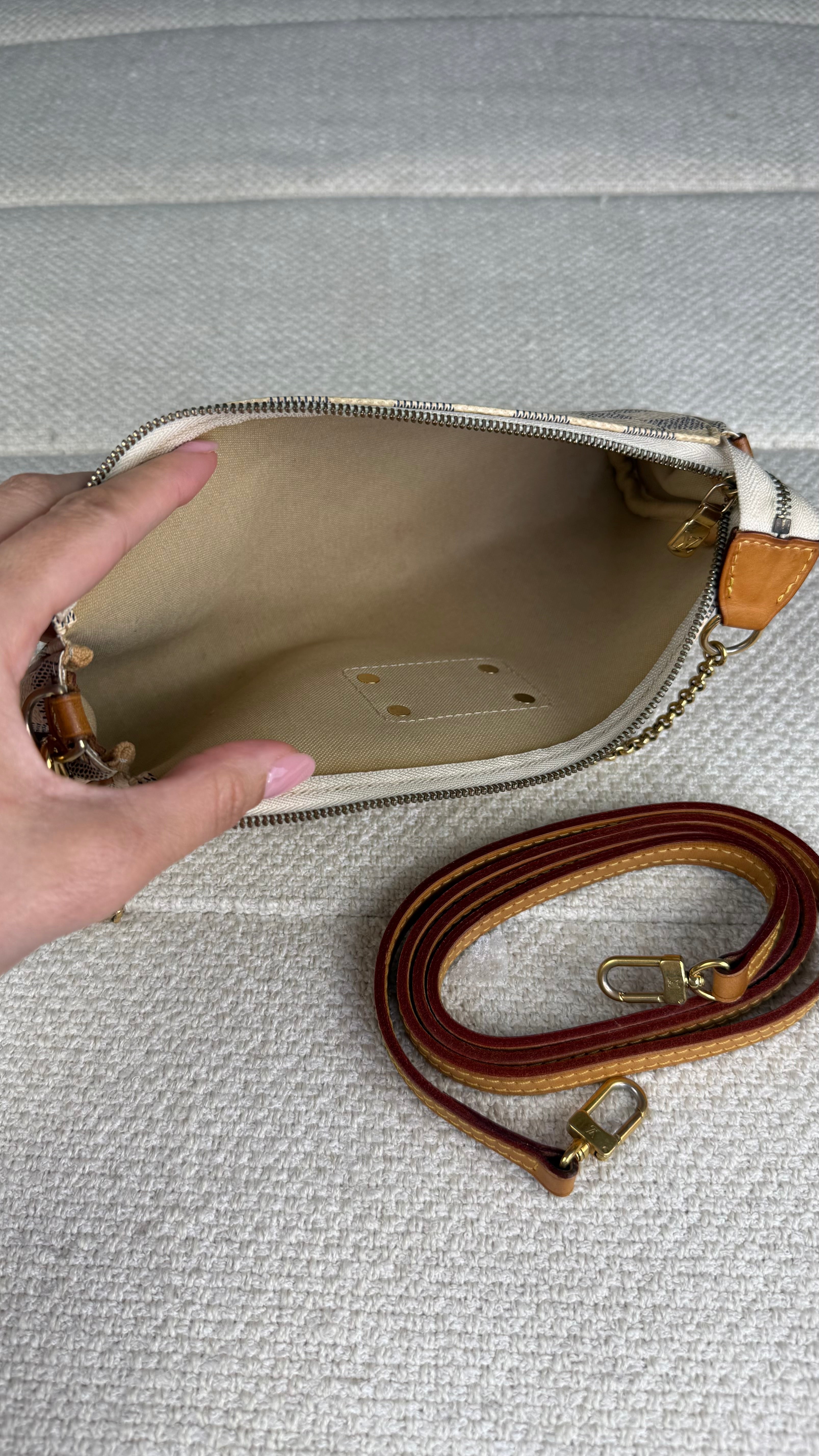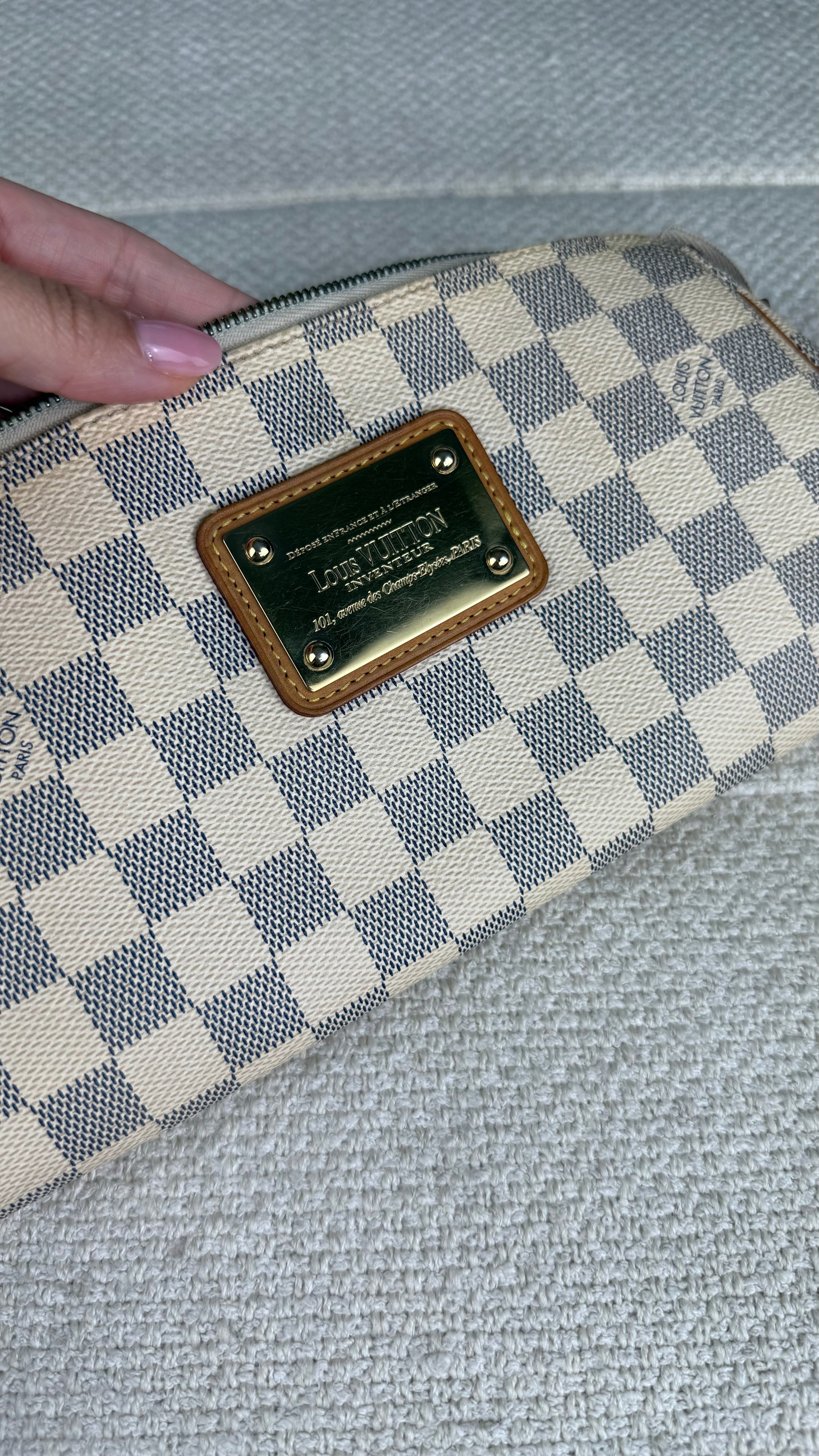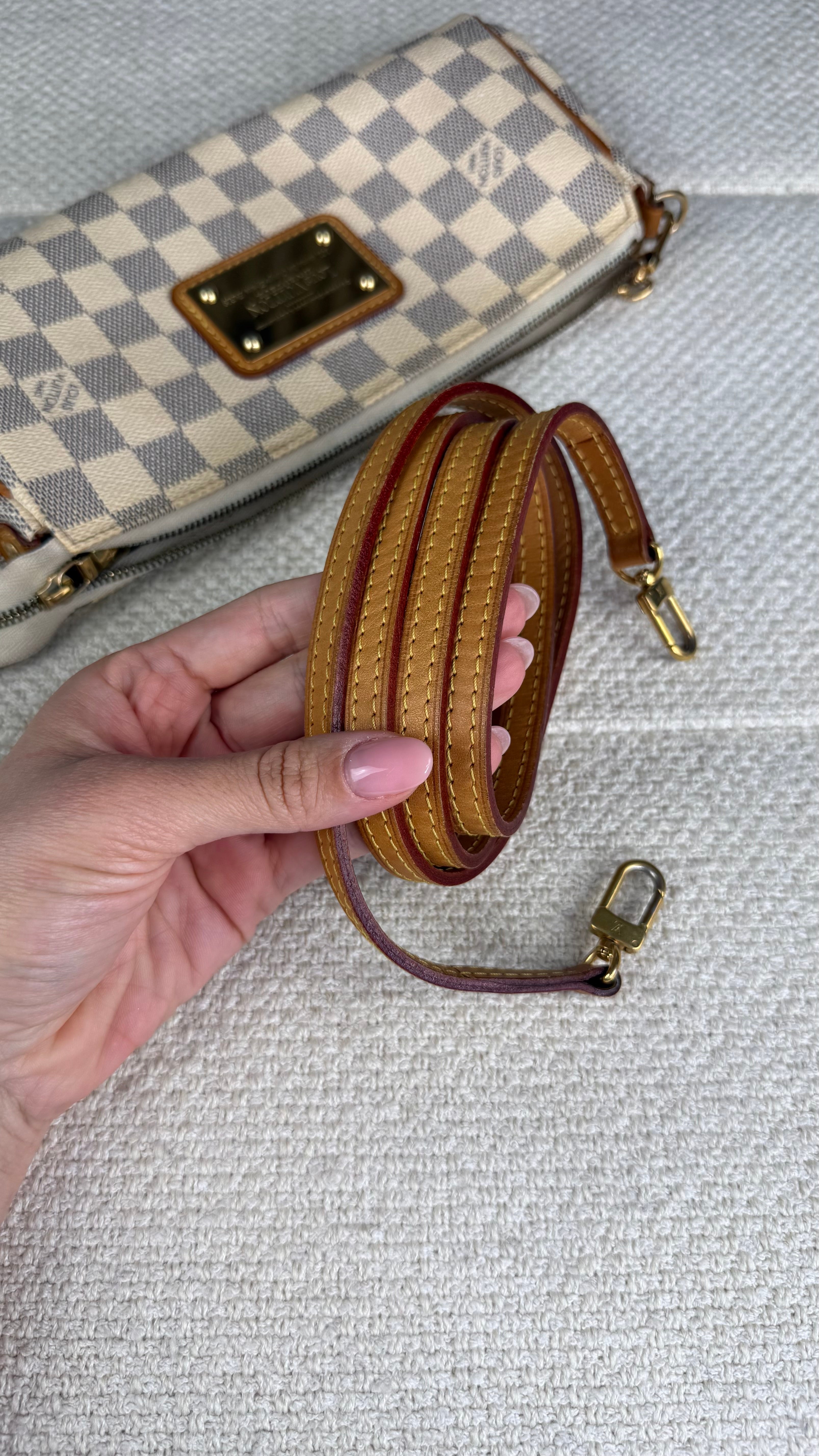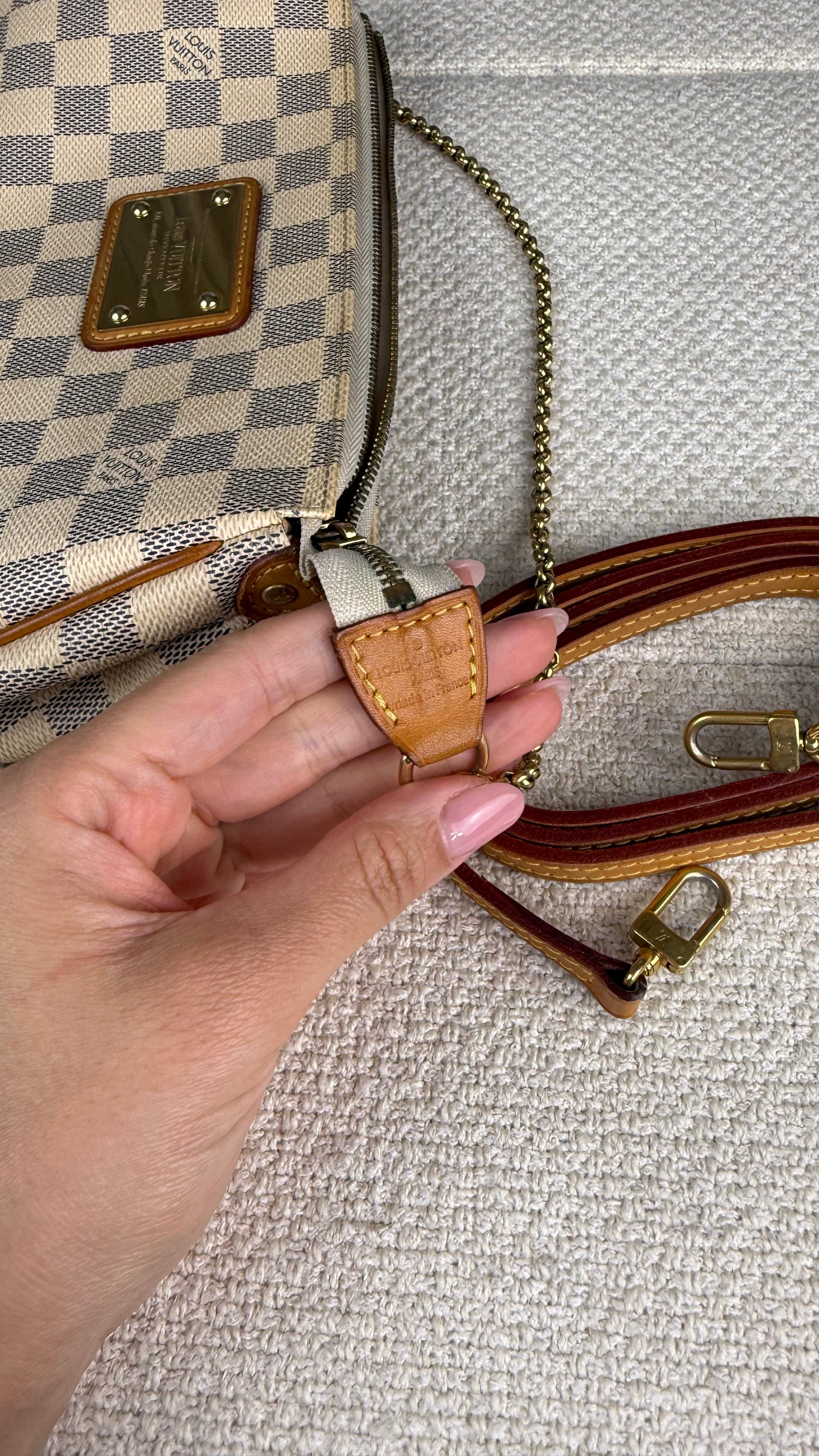 A Eva Clutch em Damier Azur é a combinação perfeita de charme e versatilidade. Compacta e elegante, ela pode ser usada como clutch de mão para eventos sofisticados ou como bolsa de ombro para um visual descontraído, graças à sua alça de corrente dourada e a tira de couro removível. Confeccionada em lona Damier Azur, com acabamento em couro natural, a Eva traz um toque de frescor e luminosidade a qualquer look, sendo ideal para dias ensolarados e noites especiais.
