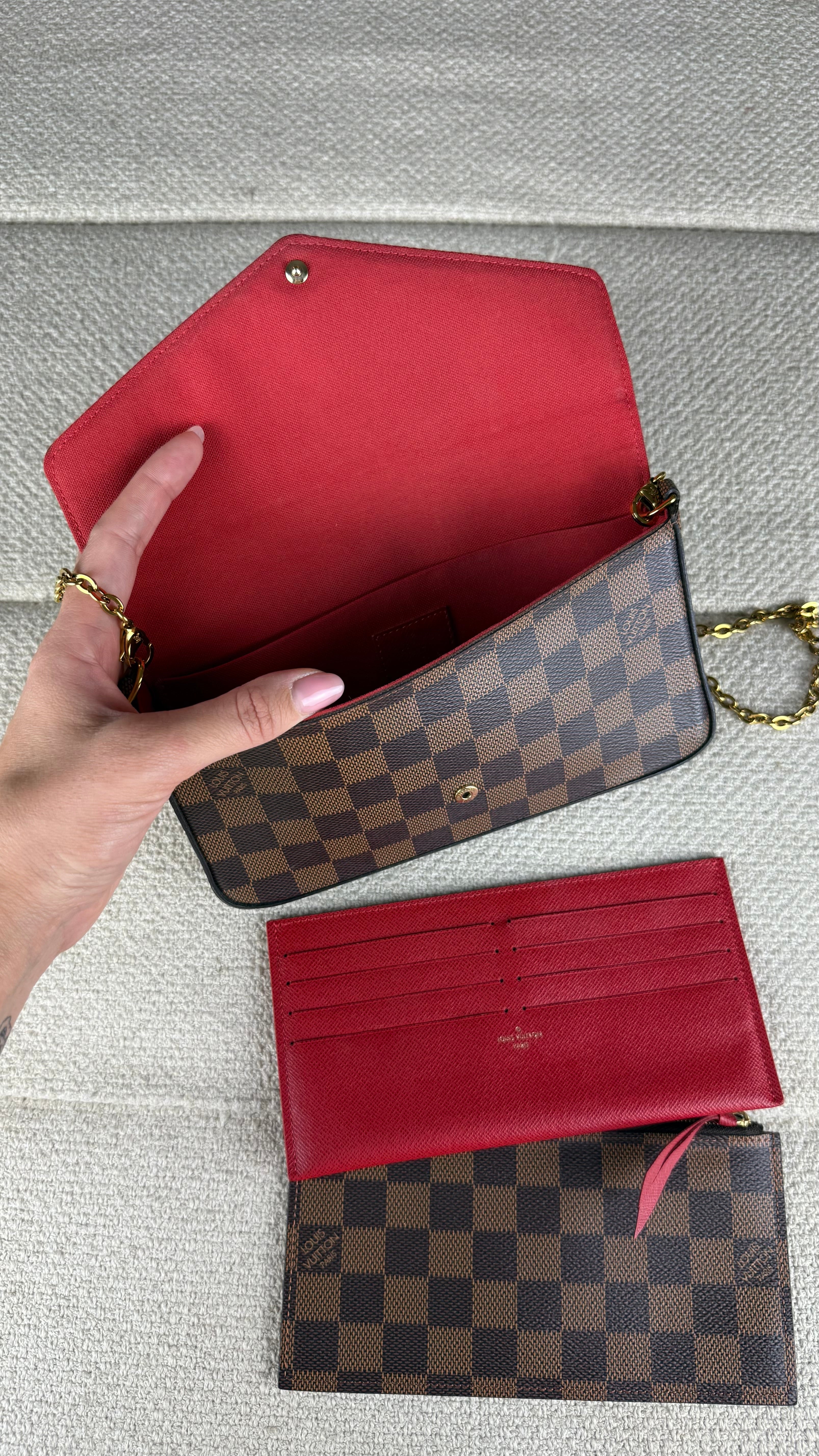 A Louis Vuitton Pochette Félicie Damier Ébène é um ícone de sofisticação e versatilidade. Confeccionada em canvas revestido no clássico padrão quadriculado marrom, a peça conta com detalhes em couro e ferragens douradas que realçam sua elegância atemporal.