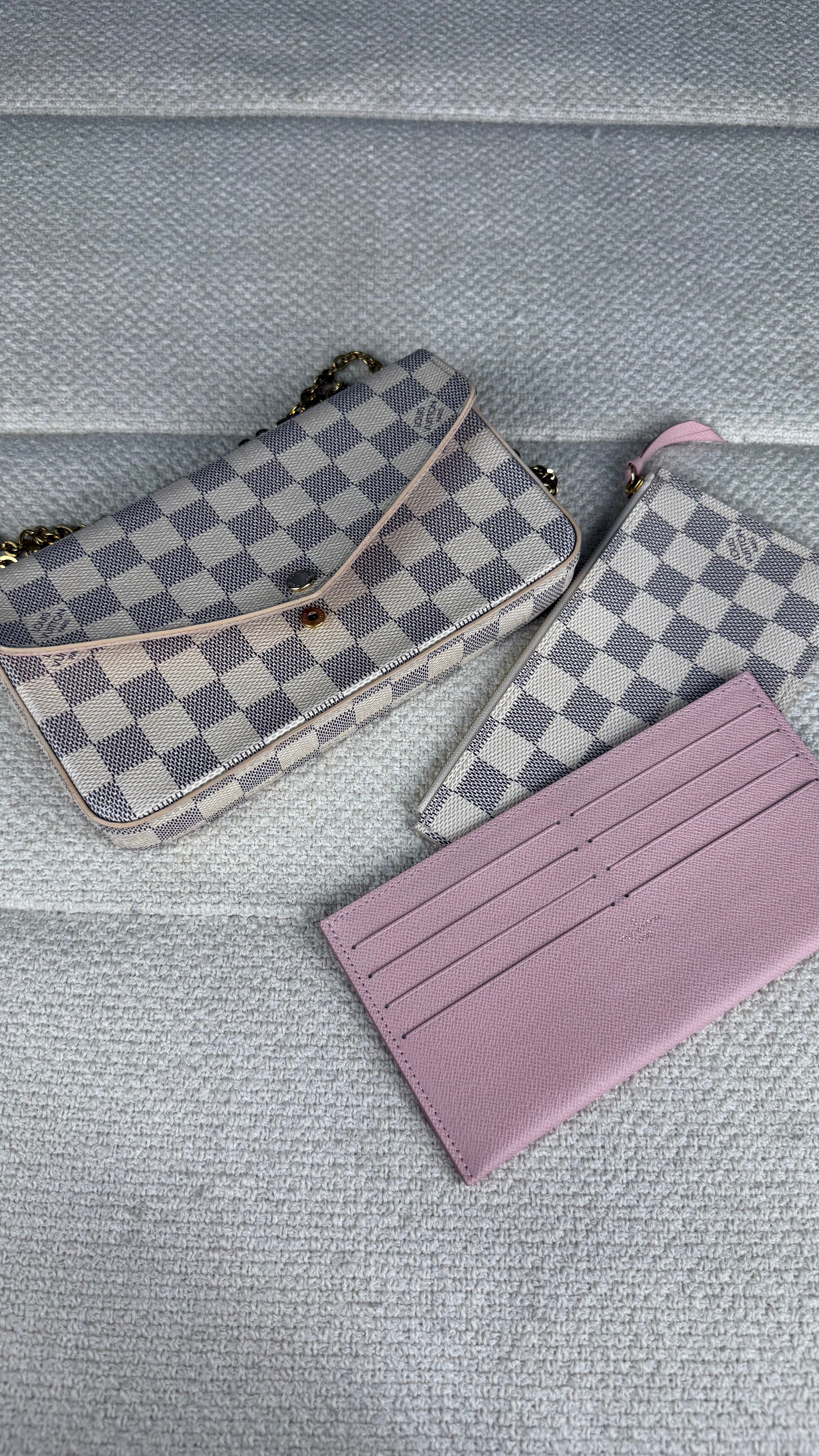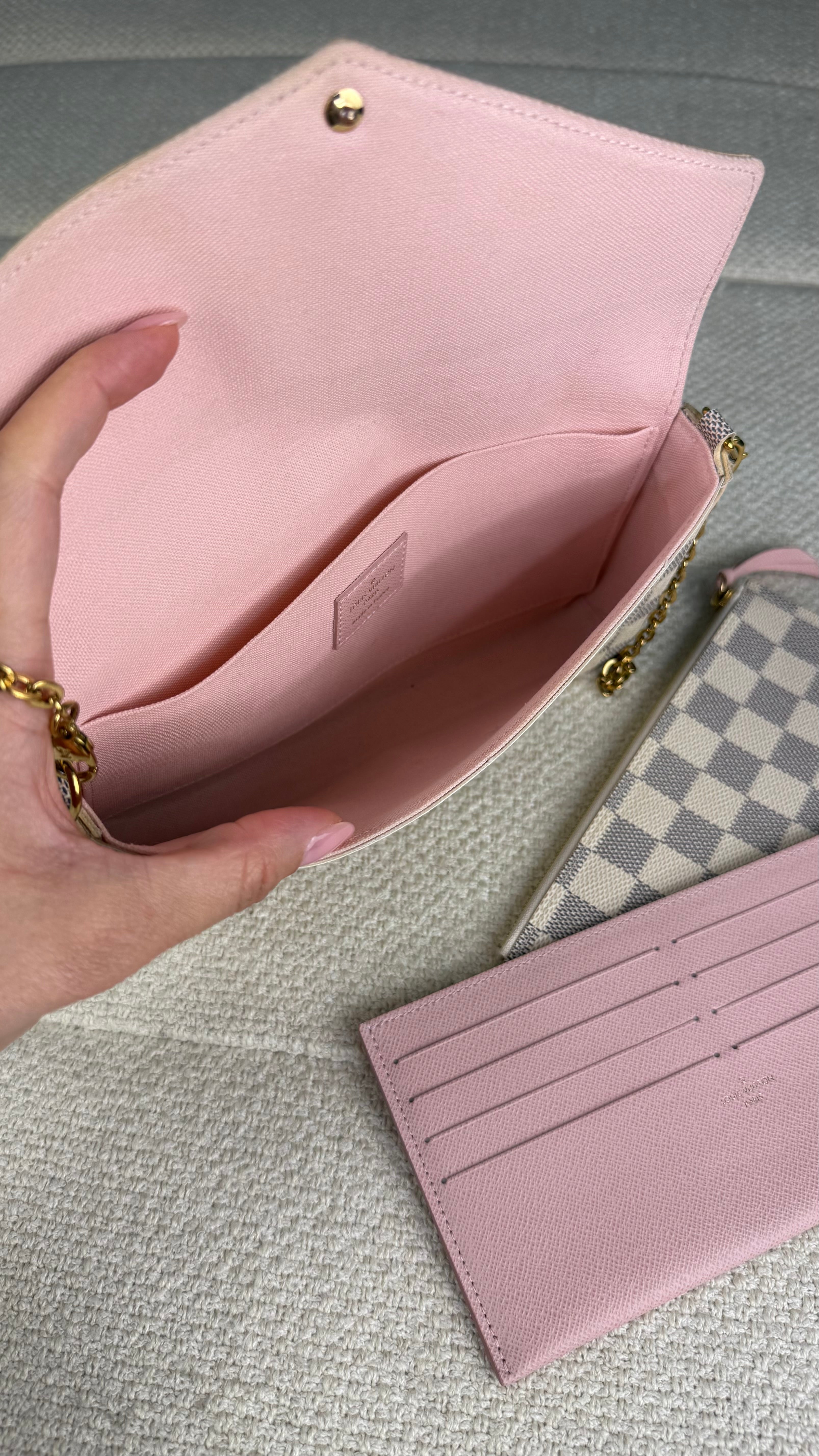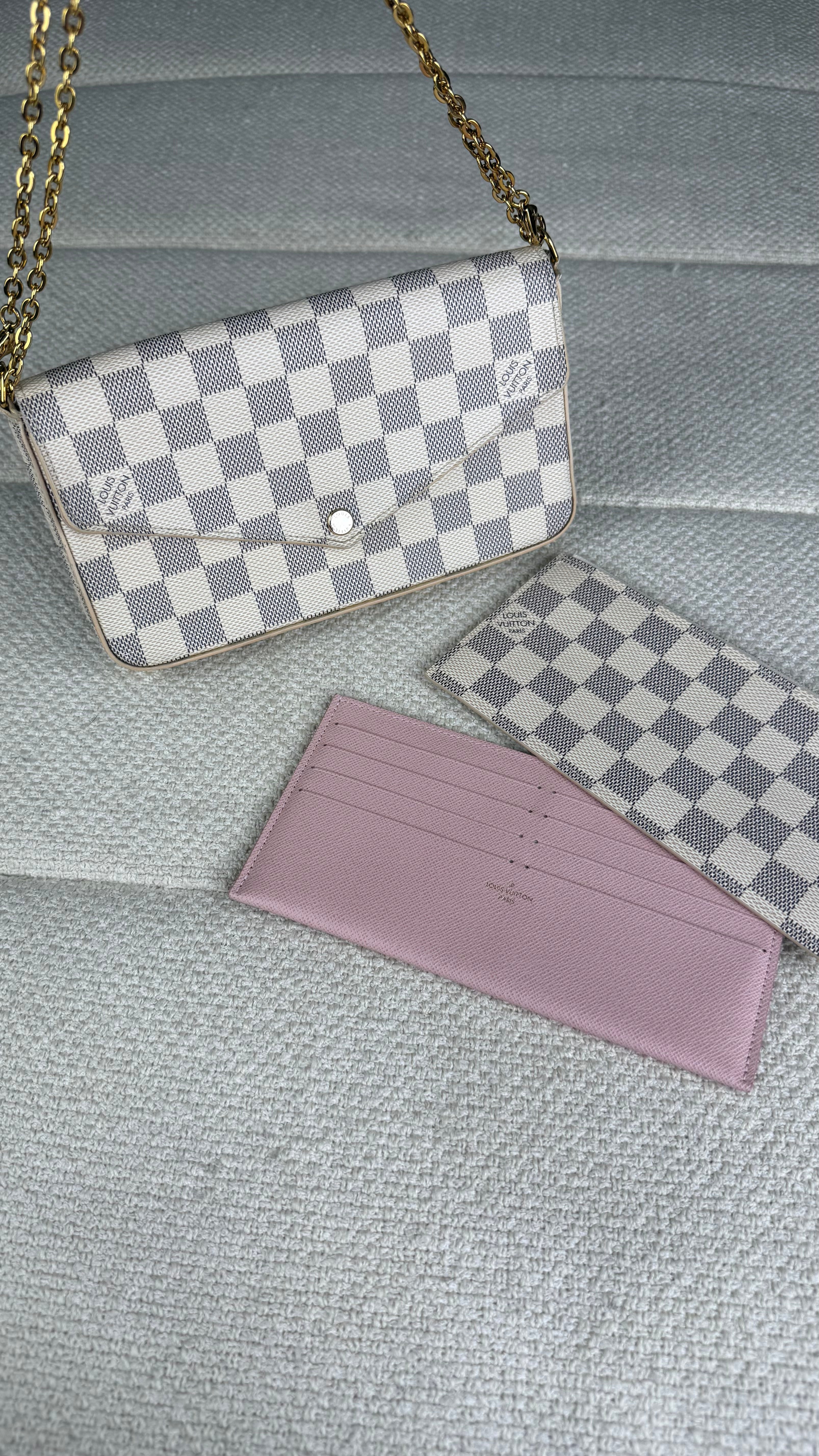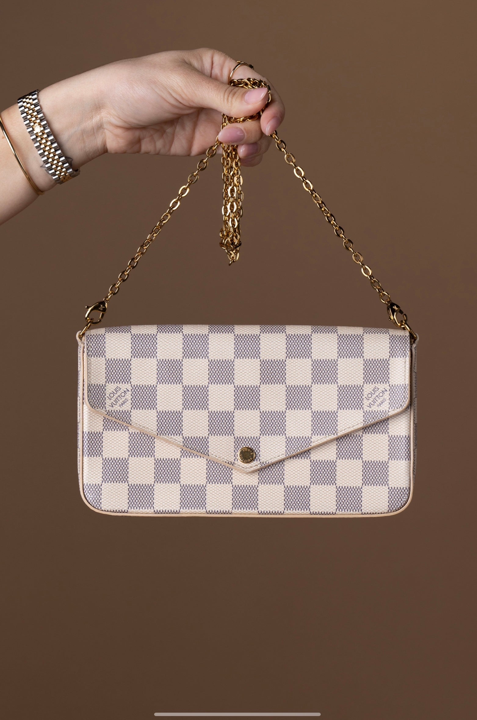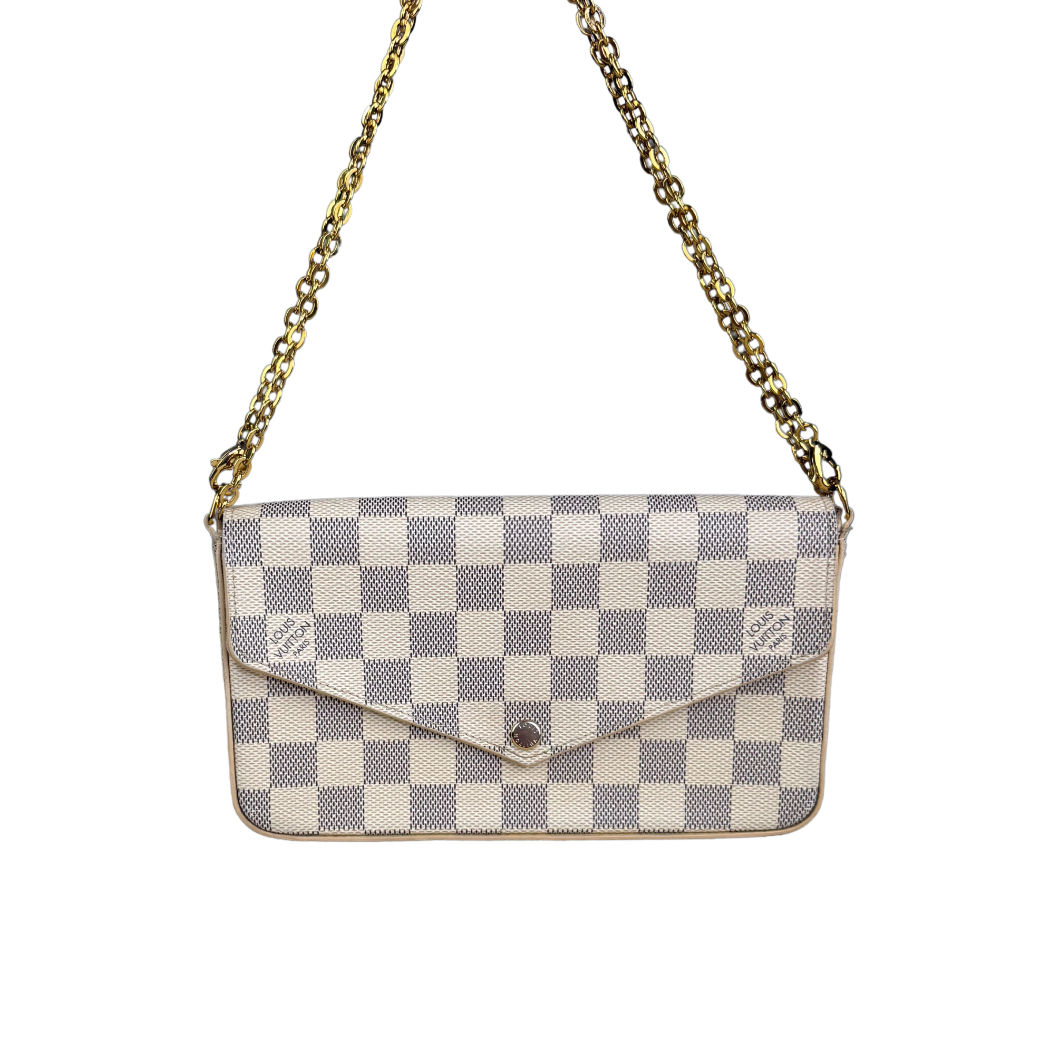 A Félicie Pochette em Damier Azur é a união perfeita entre elegância e funcionalidade. Compacta e versátil, ela pode ser usada como bolsa de ombro, clutch ou carteira, adaptando-se ao seu estilo e à sua rotina. Confeccionada em lona canvas Damier Azur com acabamento em couro natural, essa peça luminosa é ideal para dias ensolarados e ocasiões especiais. A corrente dourada removível e o interior organizado tornam a Félicie um item indispensável para quem valoriza sofisticação e praticidade.