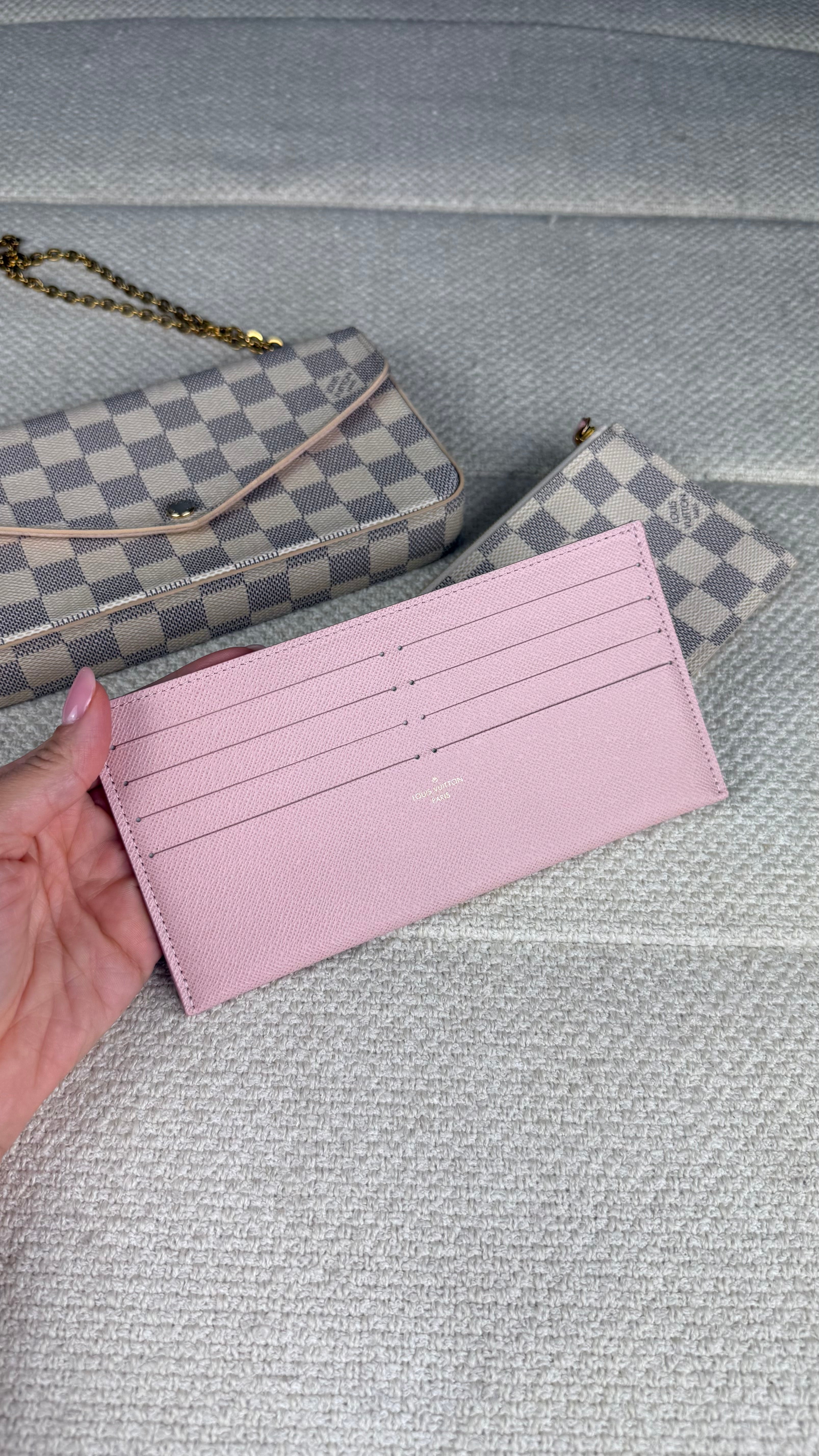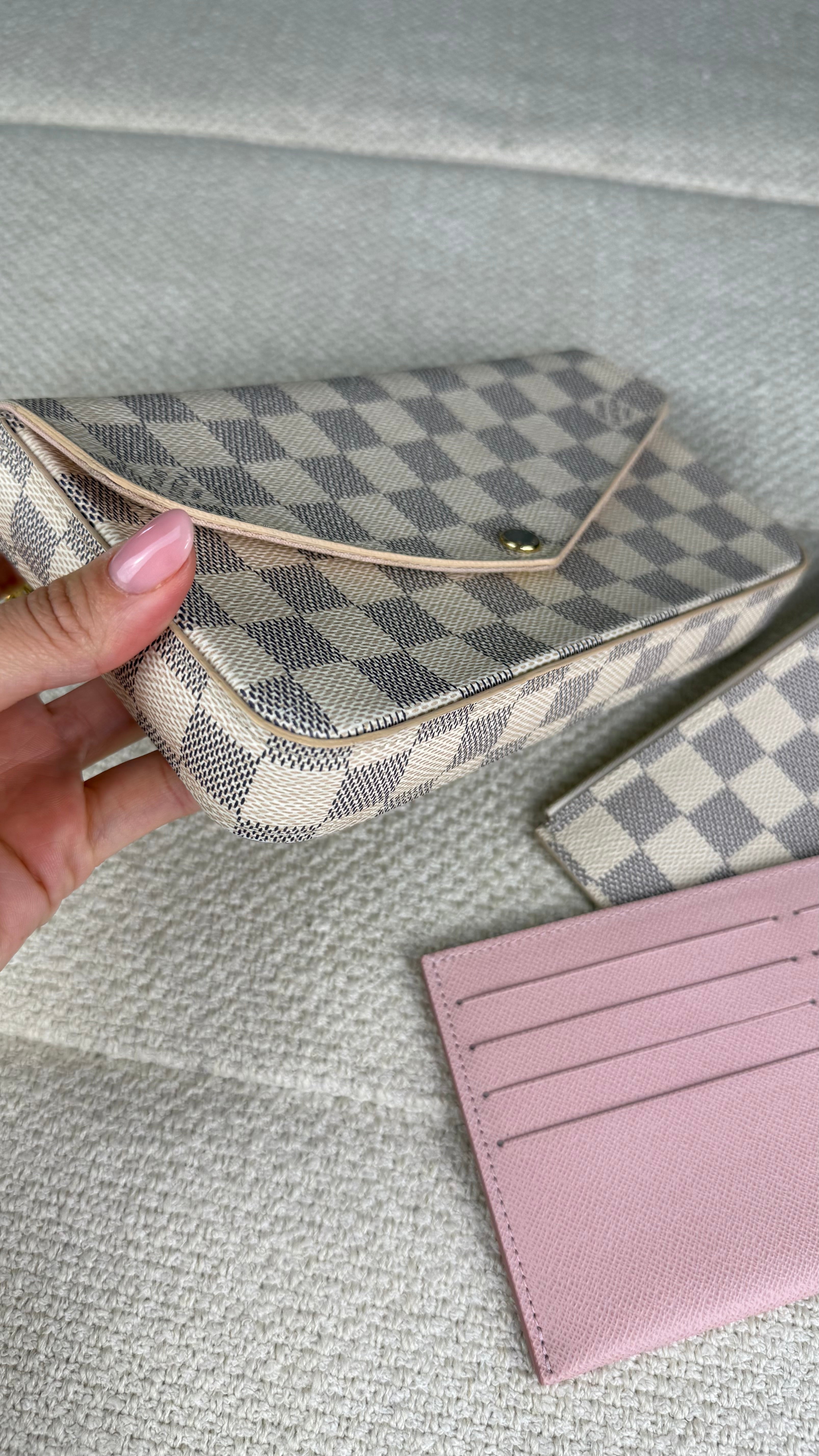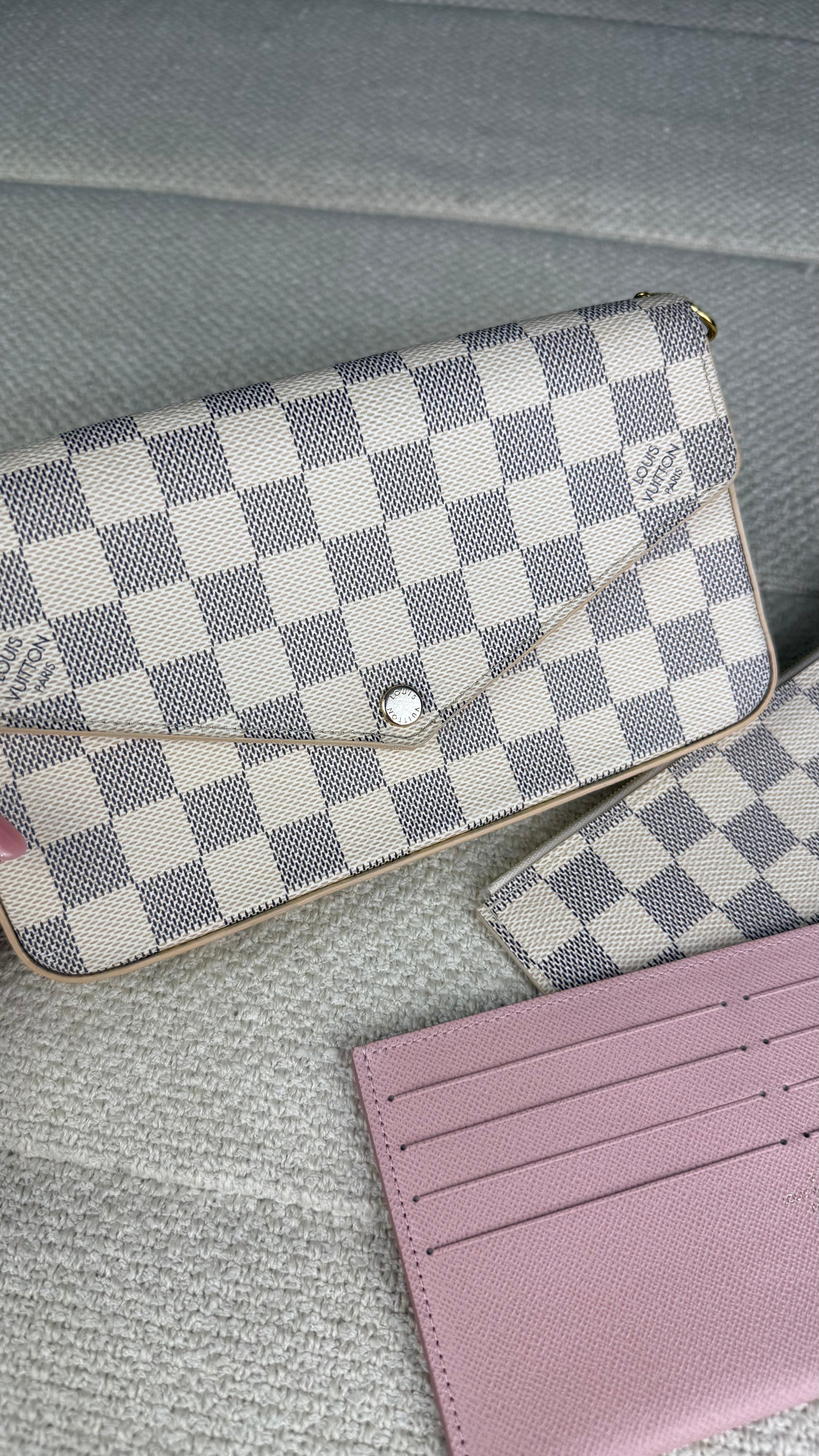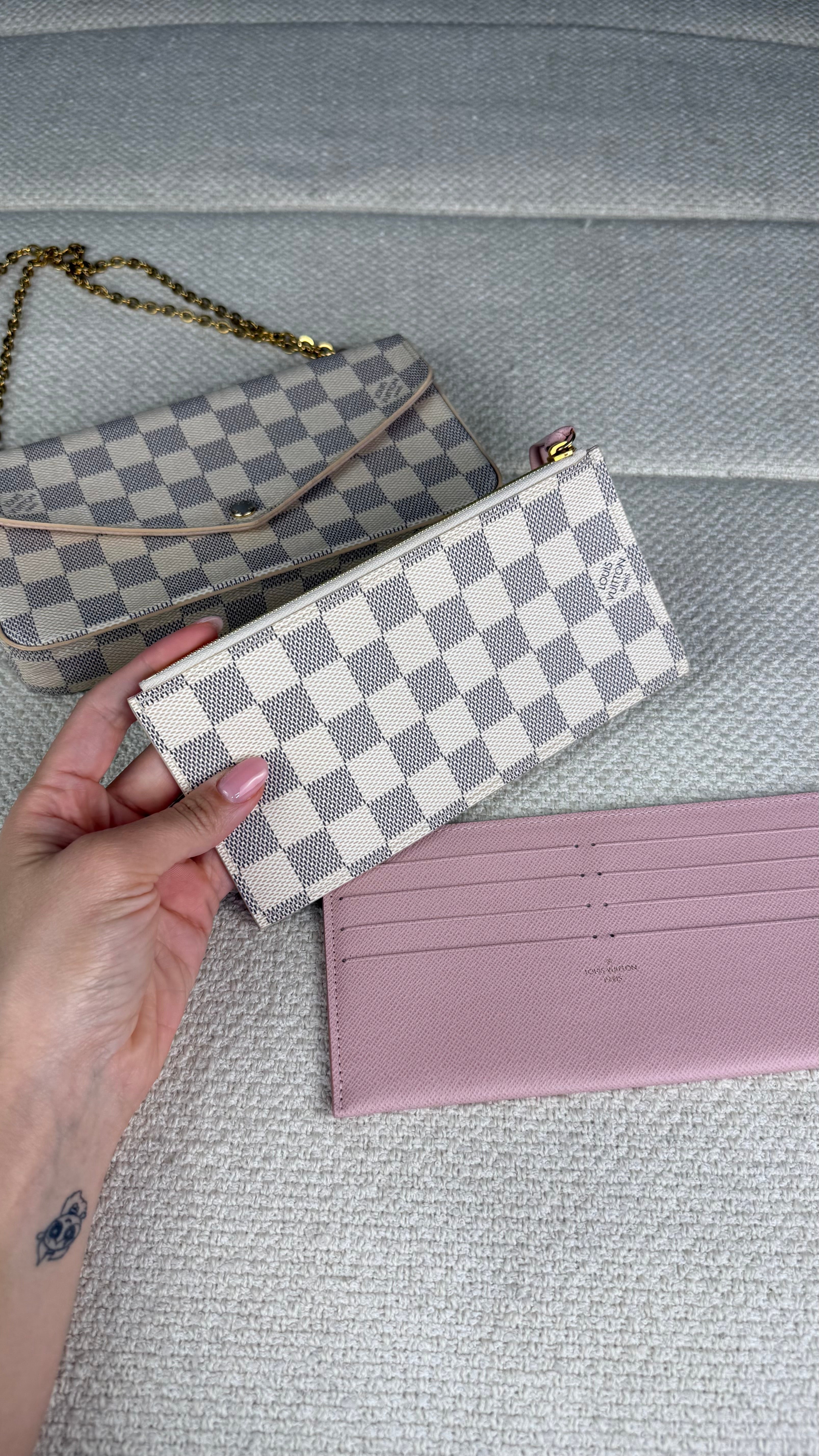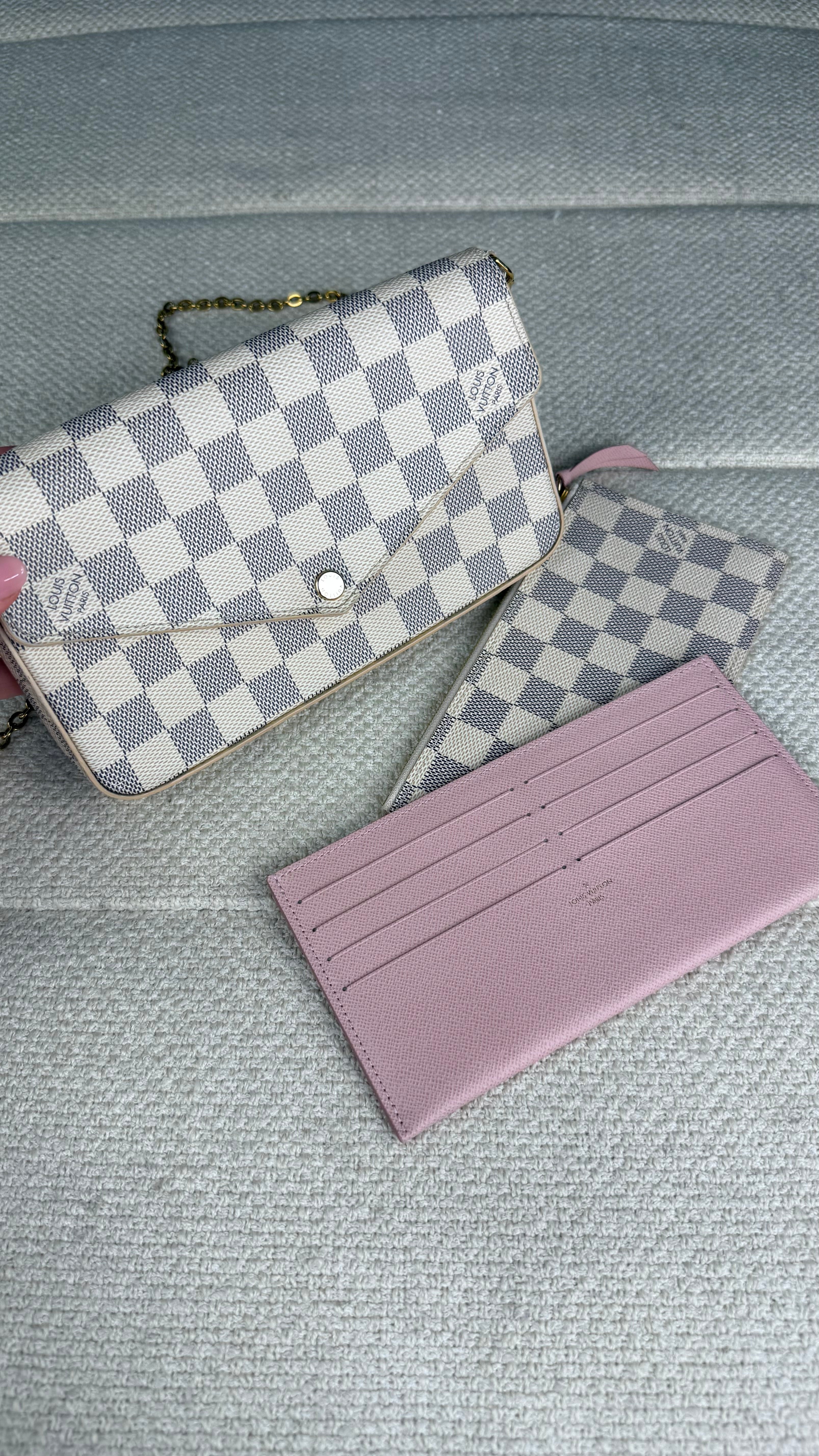 A Félicie Pochette em Damier Azur é a união perfeita entre elegância e funcionalidade. Compacta e versátil, ela pode ser usada como bolsa de ombro, clutch ou carteira, adaptando-se ao seu estilo e à sua rotina. Confeccionada em lona canvas Damier Azur com acabamento em couro natural, essa peça luminosa é ideal para dias ensolarados e ocasiões especiais. A corrente dourada removível e o interior organizado tornam a Félicie um item indispensável para quem valoriza sofisticação e praticidade.