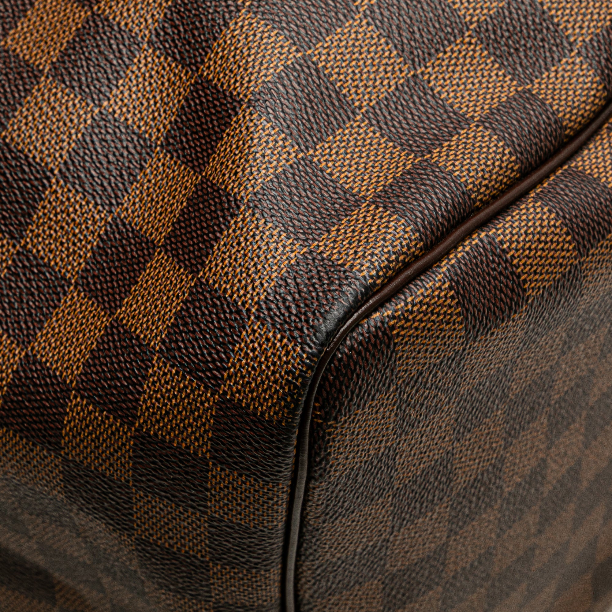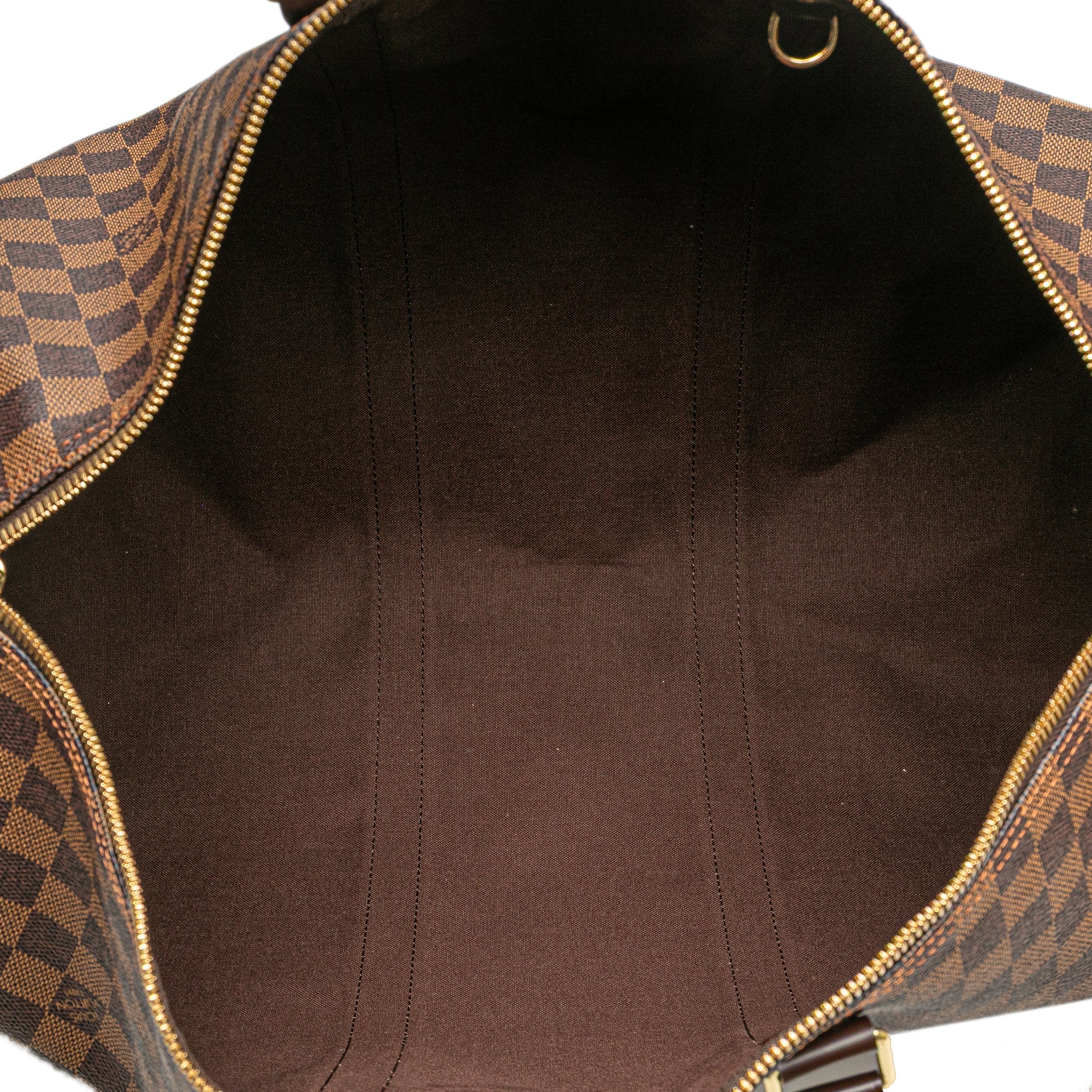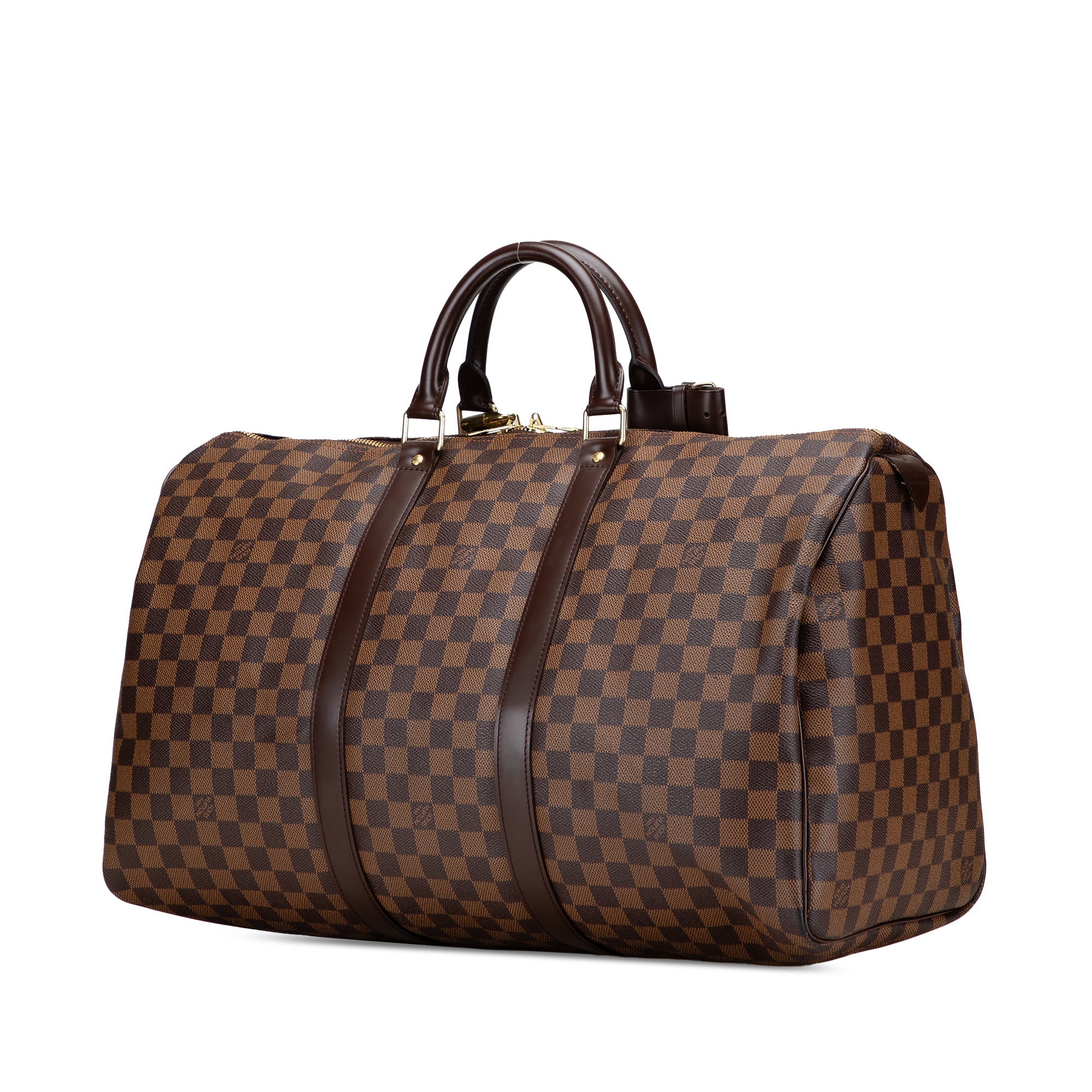A Keepall 50 Damier Ebene é a companheira ideal para viagens curtas e fins de semana. Fabricada em lona revestida Damier Ebene, é resistente à água e ao desgaste, mantendo sua elegância e sofisticação típicas da Louis Vuitton.