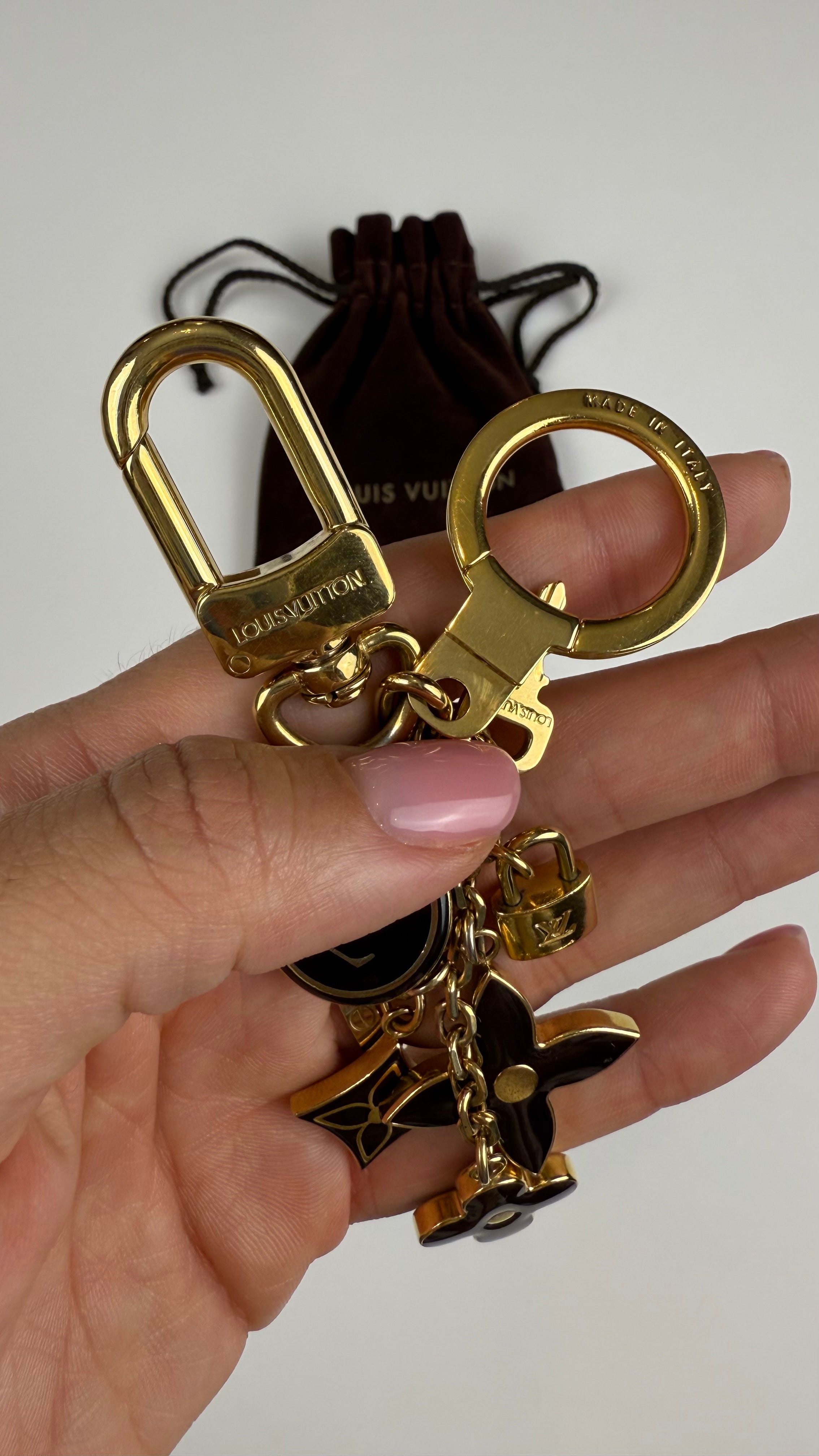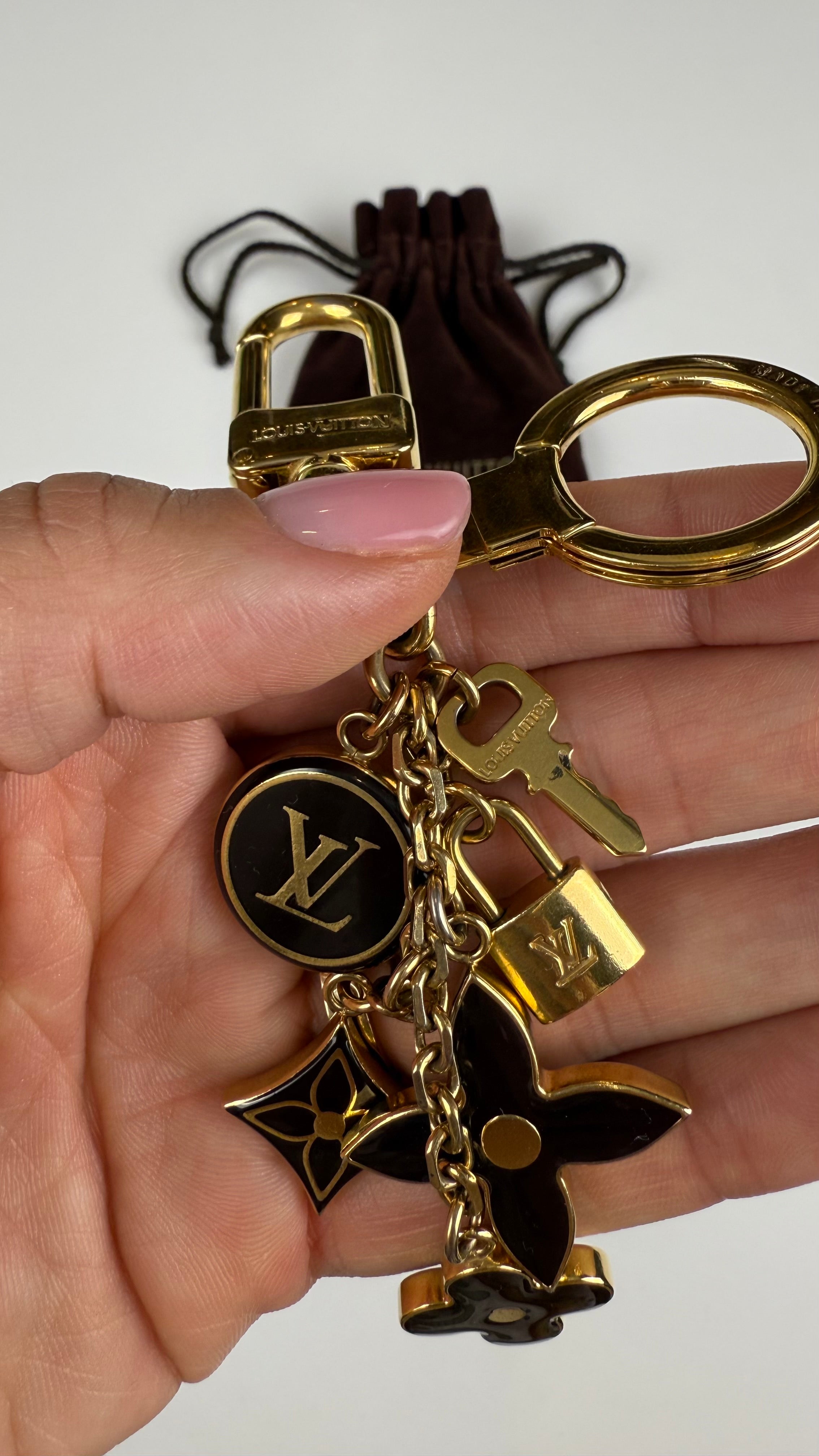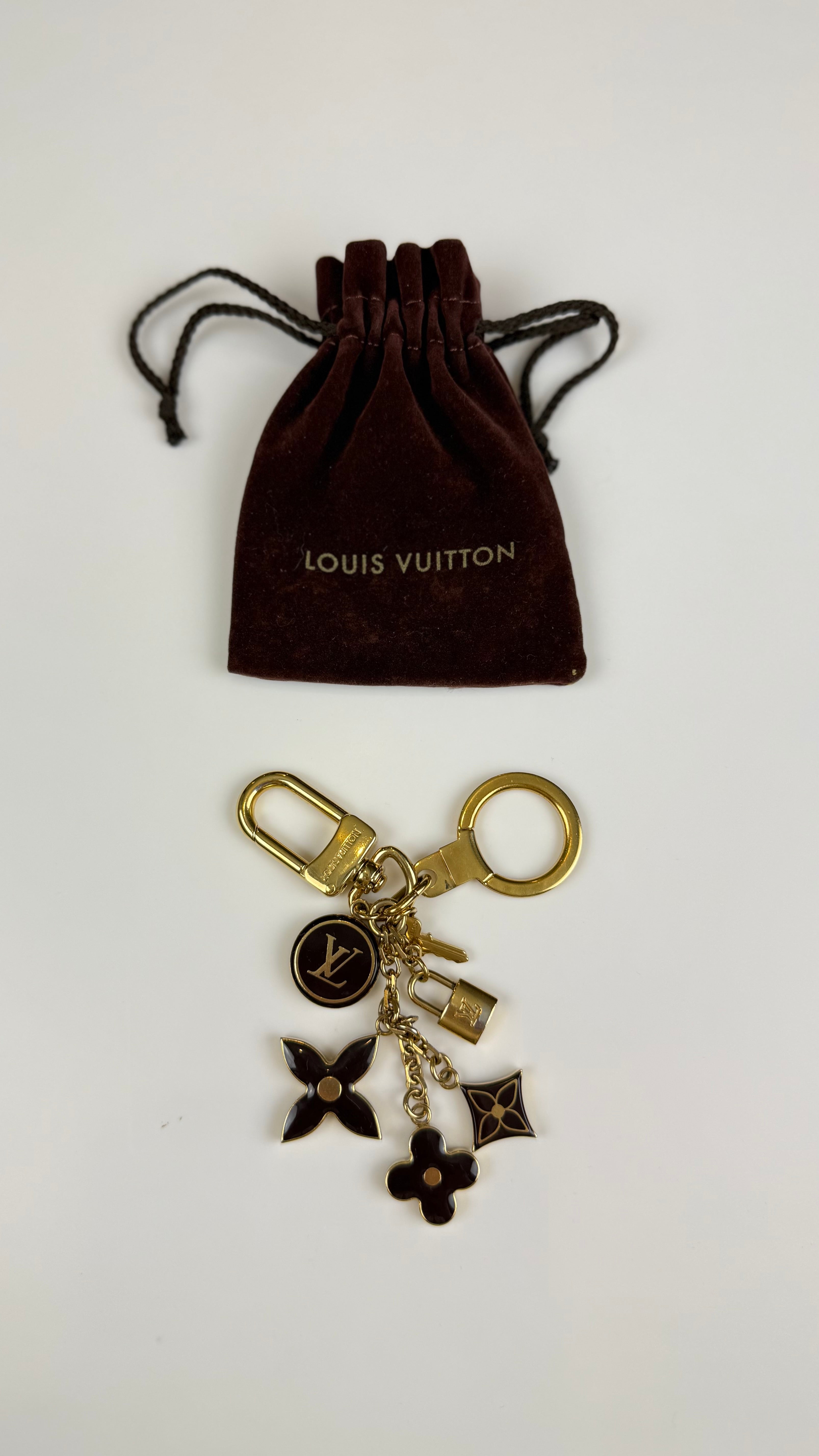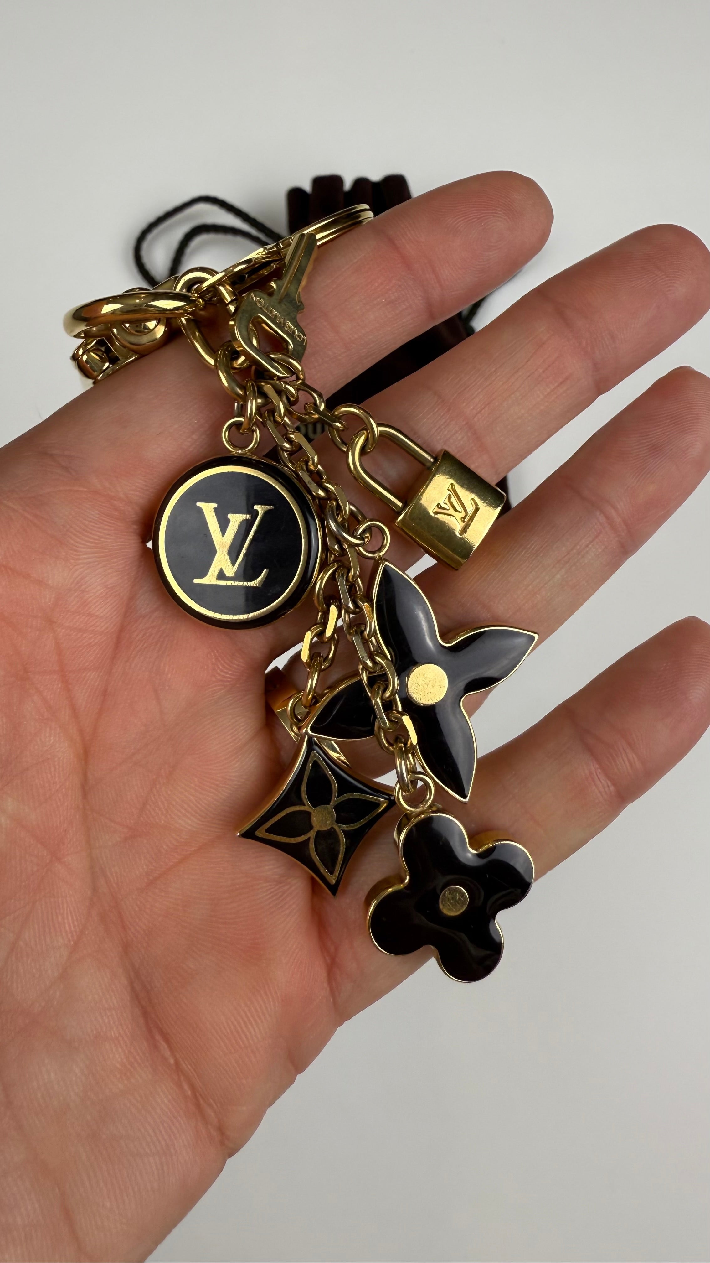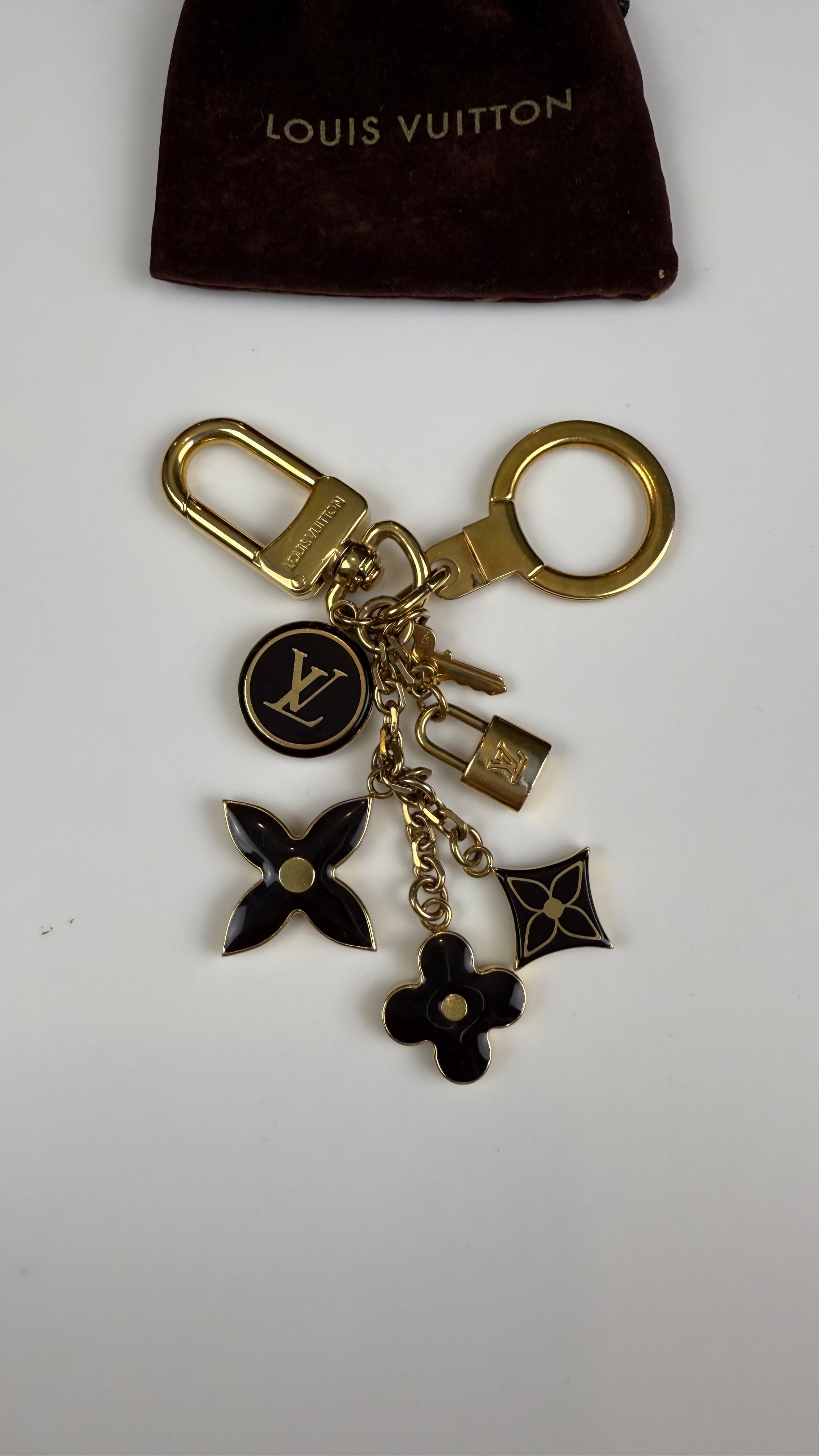 Charmoso e sofisticado porta-chaves Louis Vuitton em metal dourado, com vários pendentes icónicos da Maison: flor do Monograma em preto, cadeado e chave estilizados e o inconfundível logótipo LV. Cada detalhe foi cuidadosamente desenhado para refletir o espírito luxuoso e atemporal da marca.