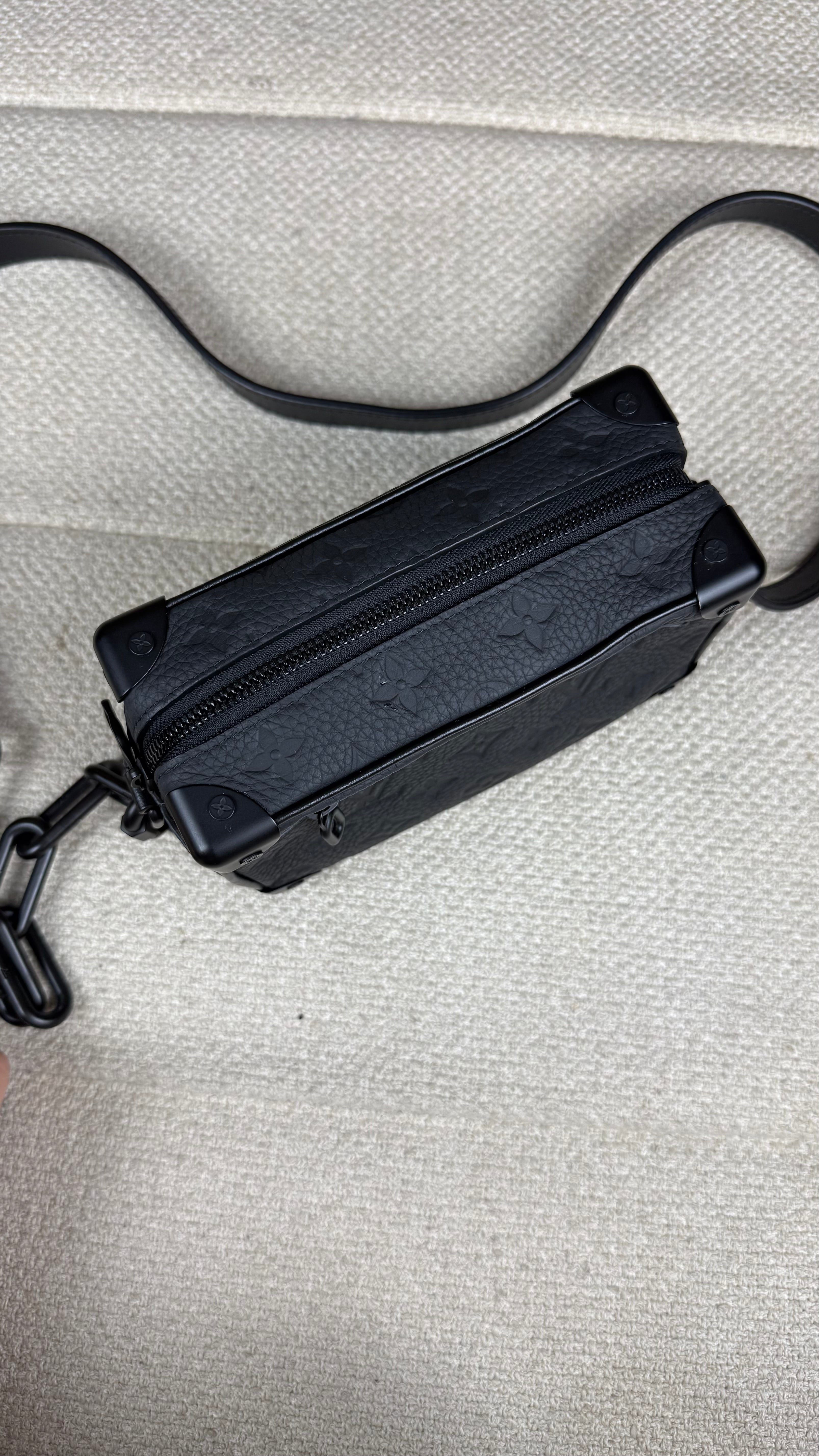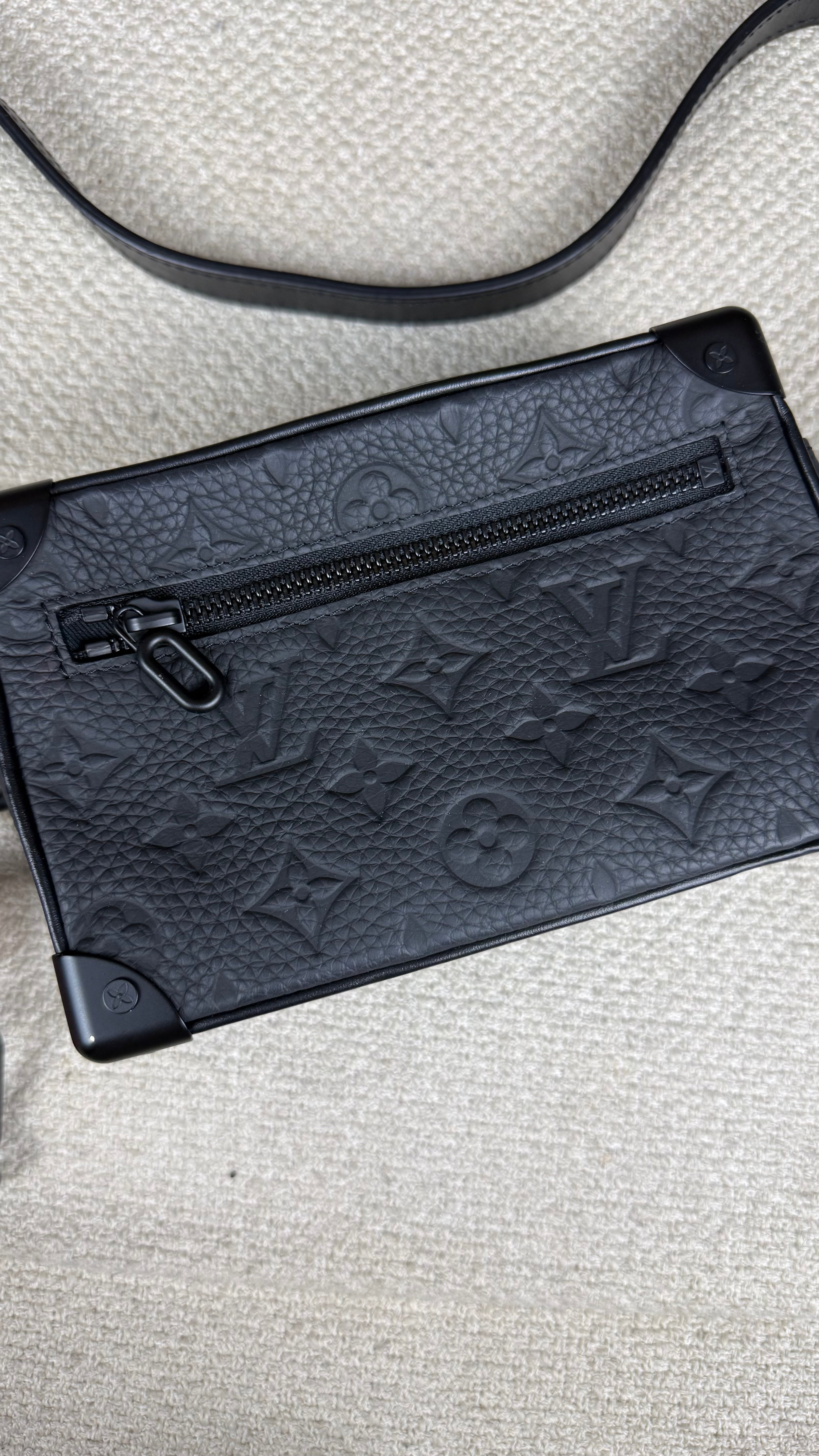 A Mini Soft Trunk da Louis Vuitton, confeccionada em couro Monogram Taurillon preto, é uma peça icônica desenhada por Virgil Abloh que combina luxo moderno com o visual estruturado das tradicionais trunks da Maison. Este modelo é altamente desejado por seu design contemporâneo, acabamento premium e estética robusta.