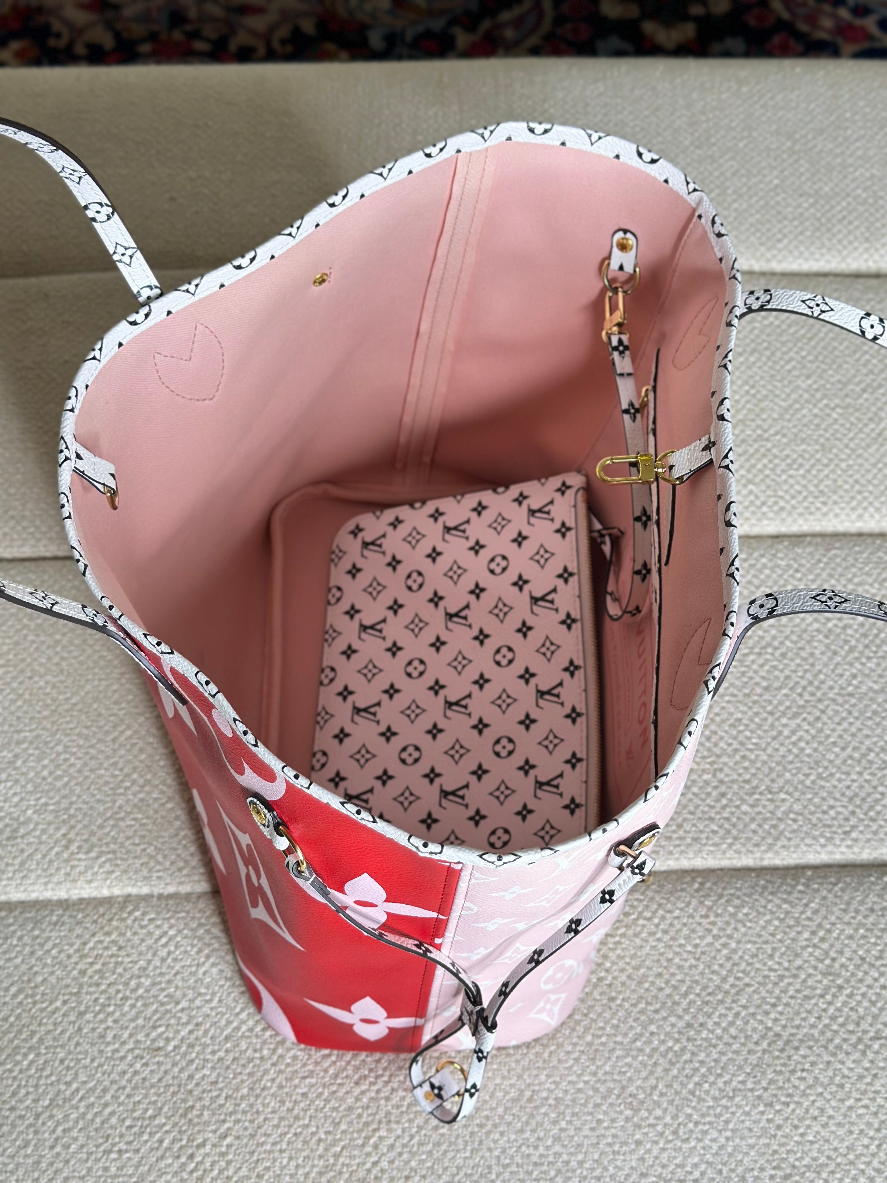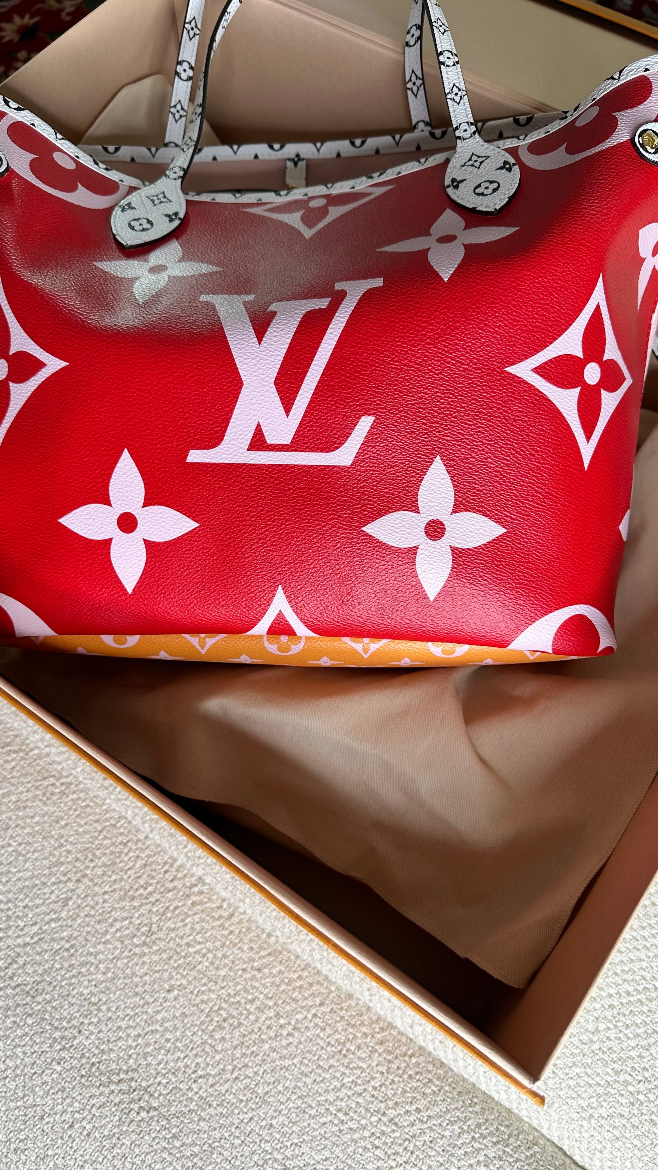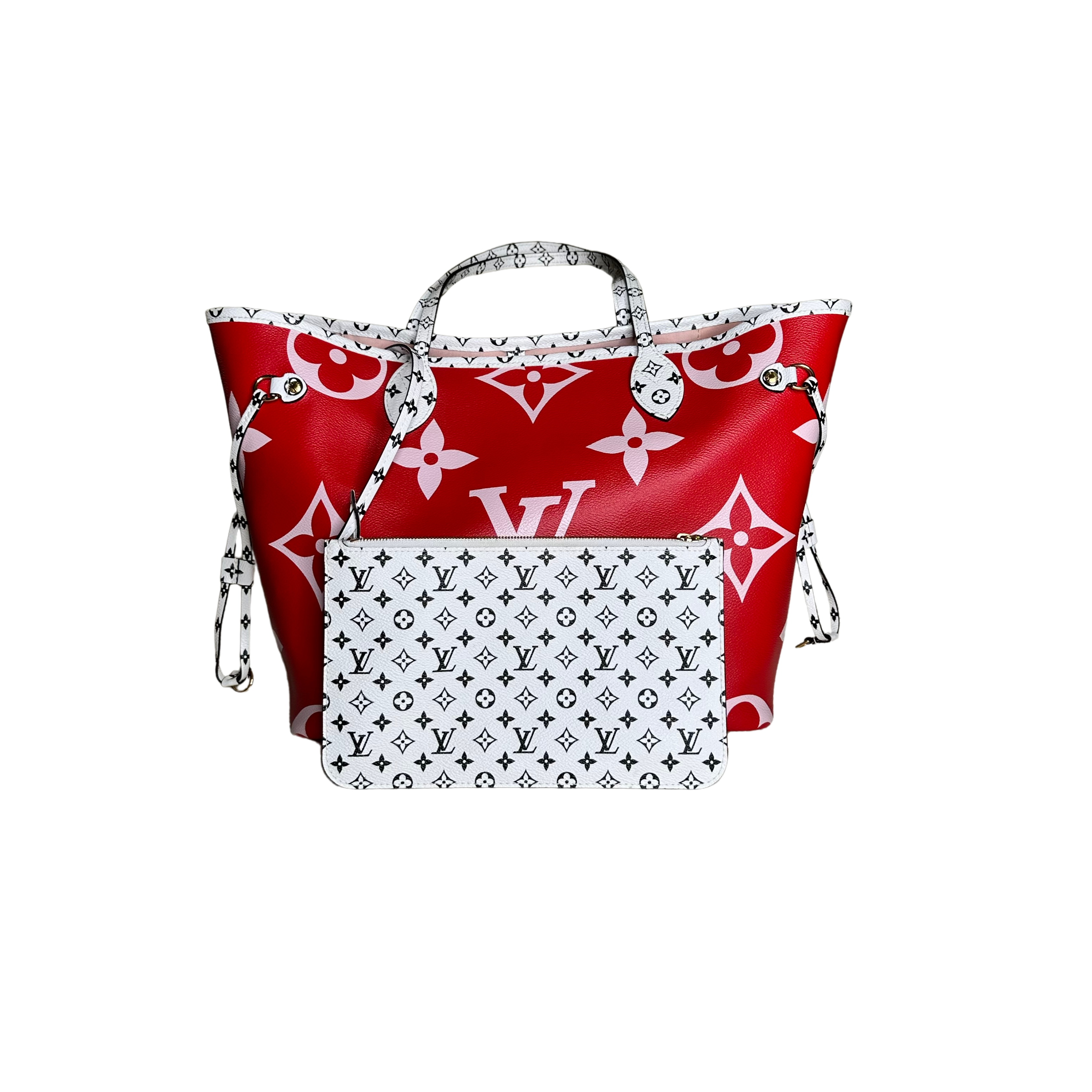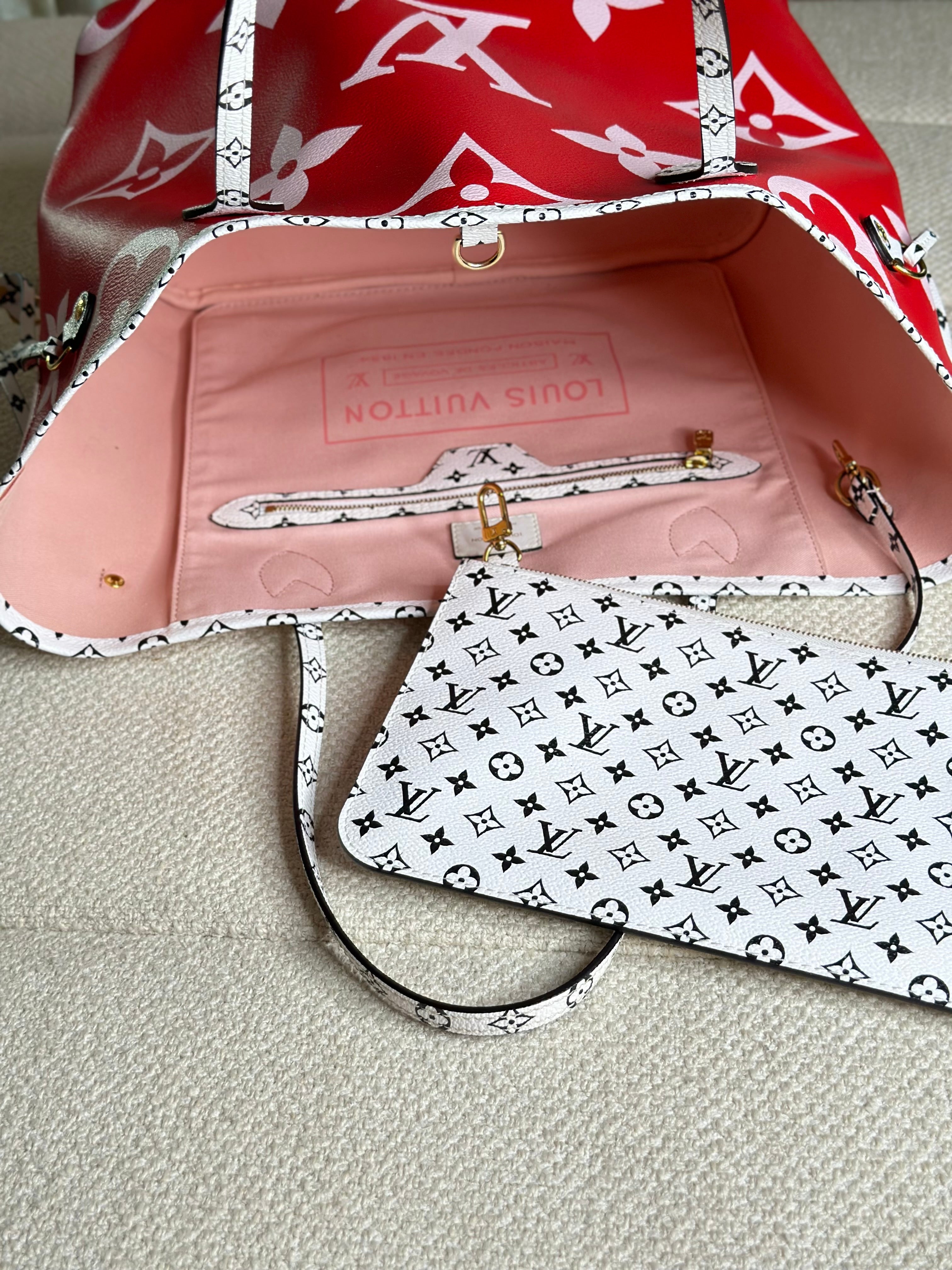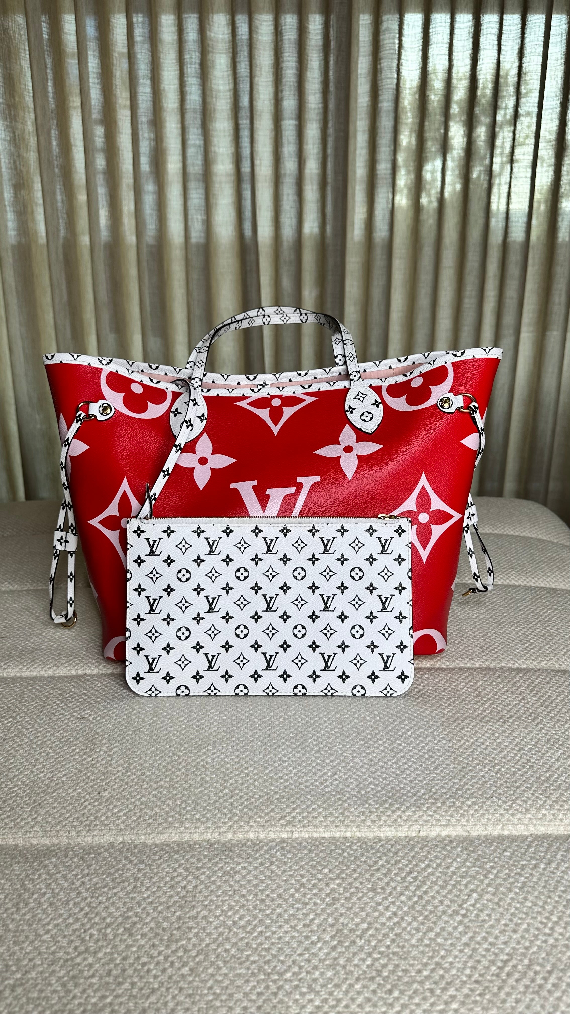 Cor: multicolor, vermelho, padrão monograma rosa, fundo laranja, e a Pochette padrão monograma branco e preto.