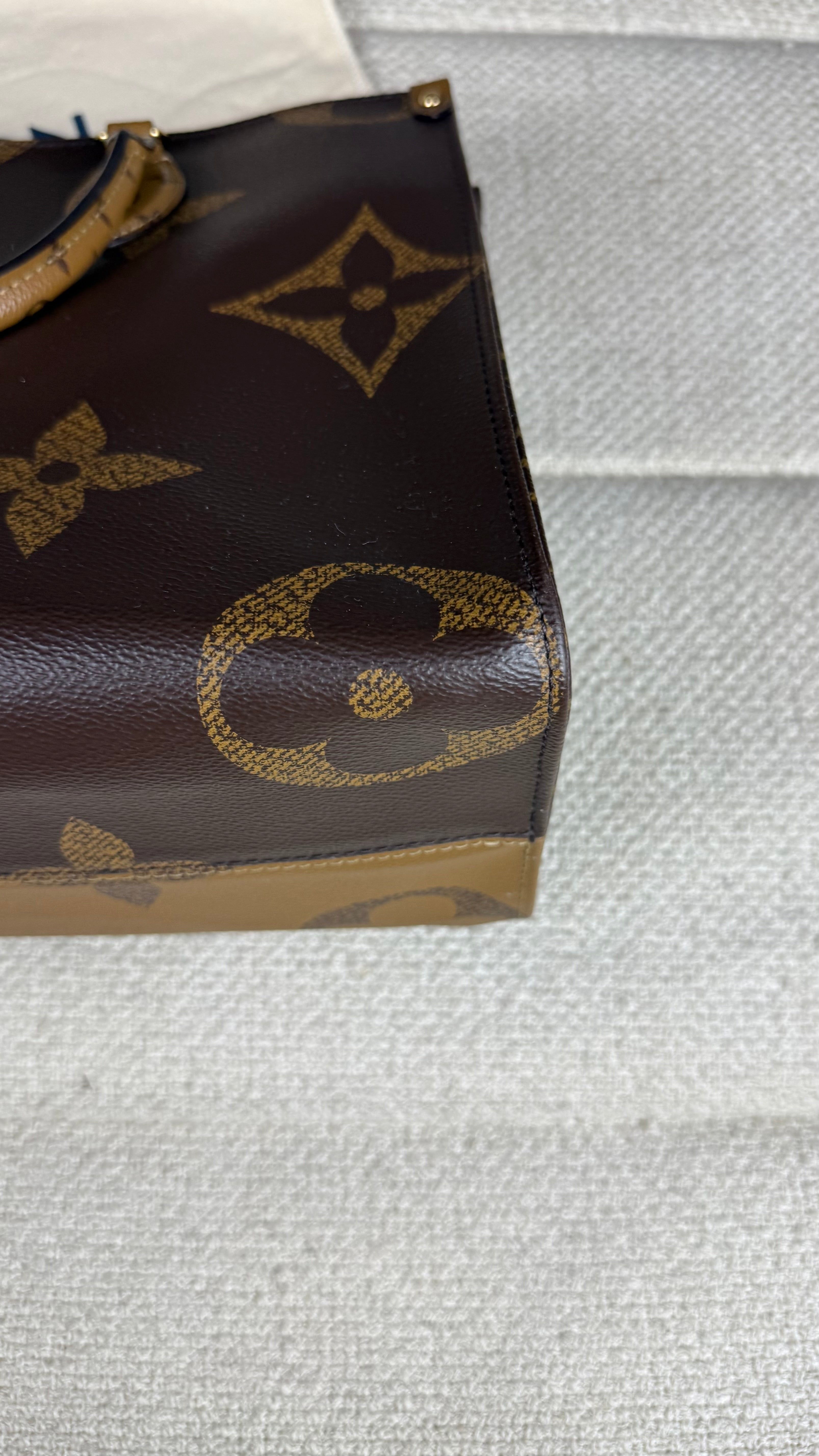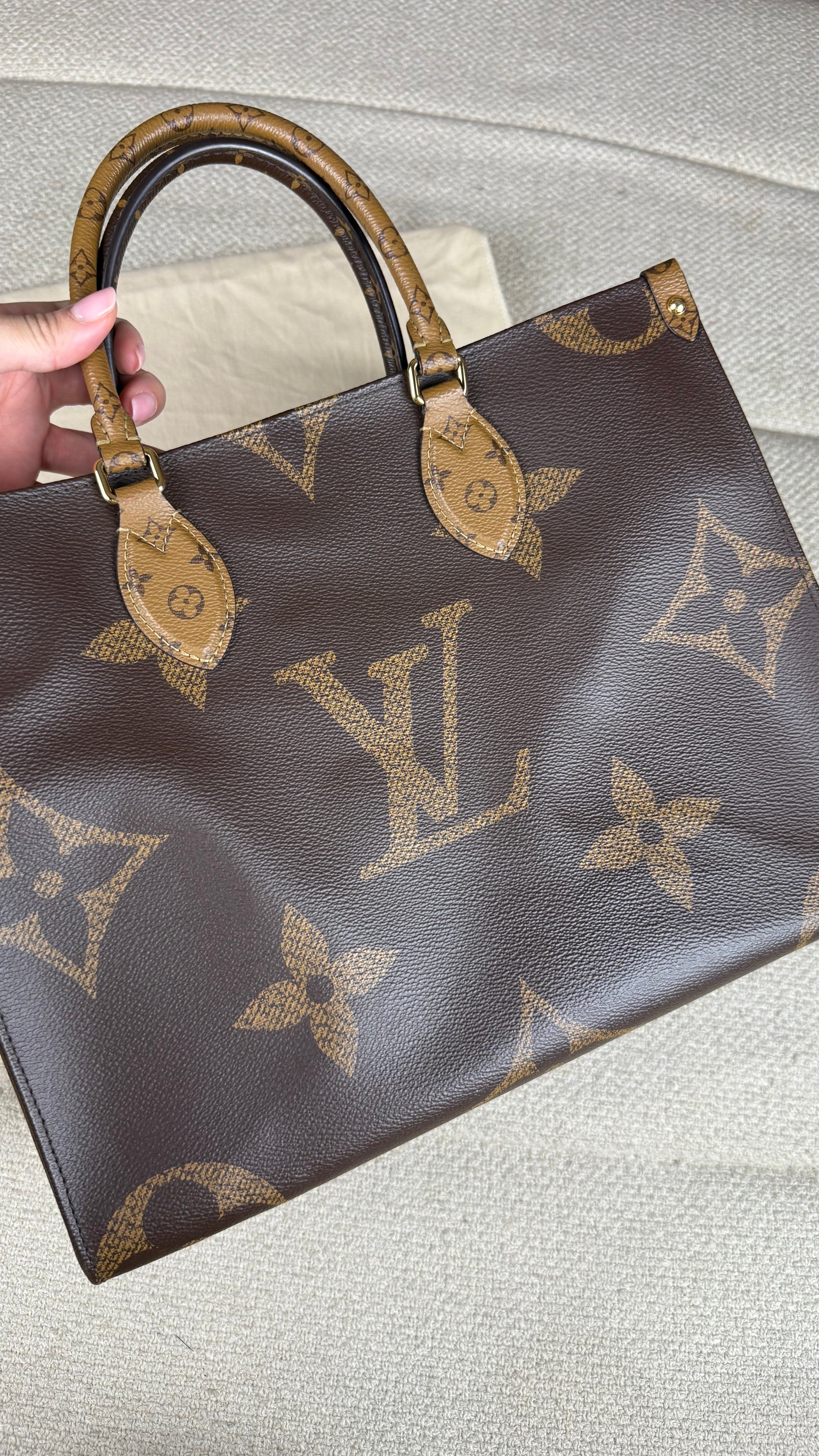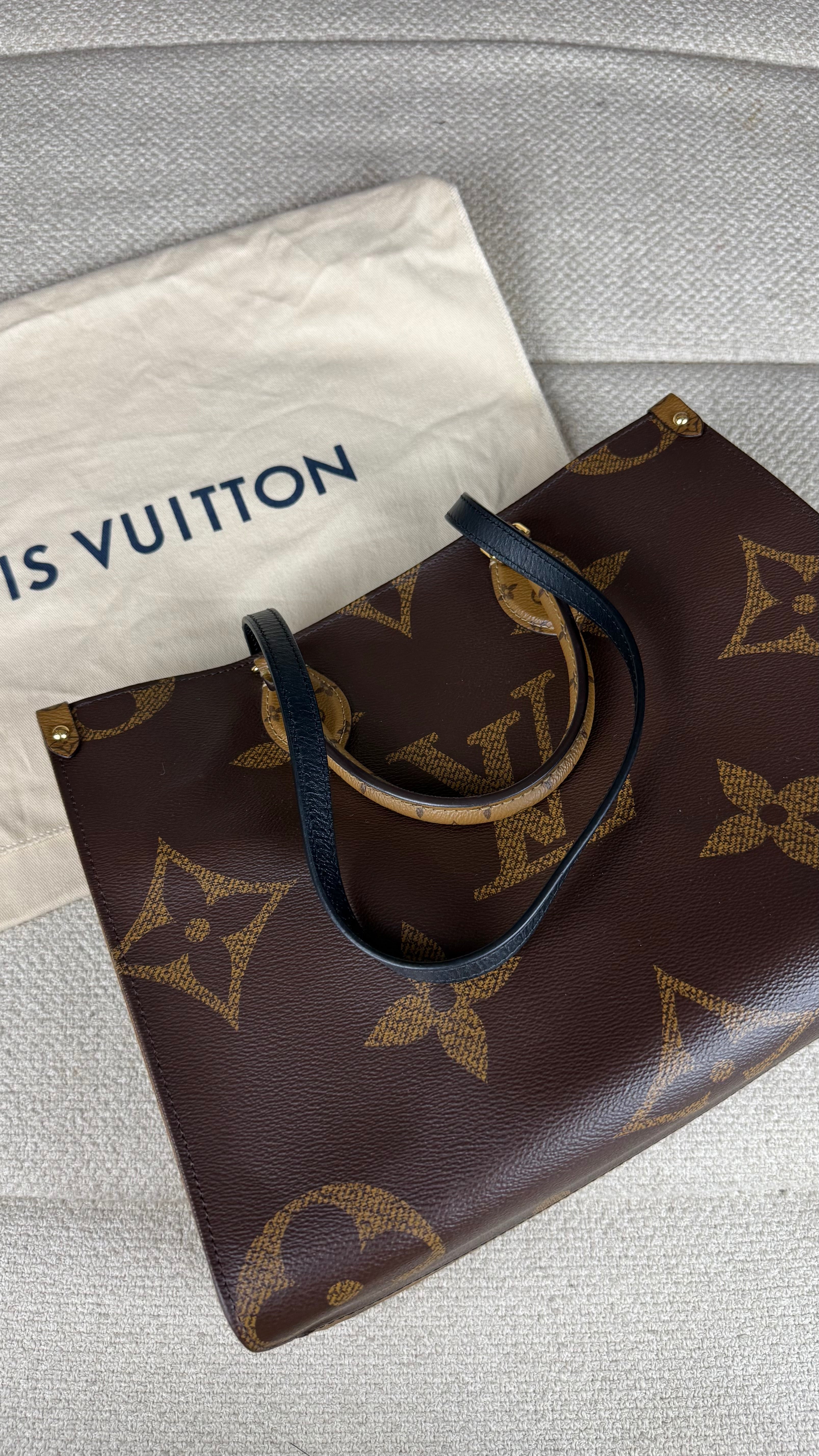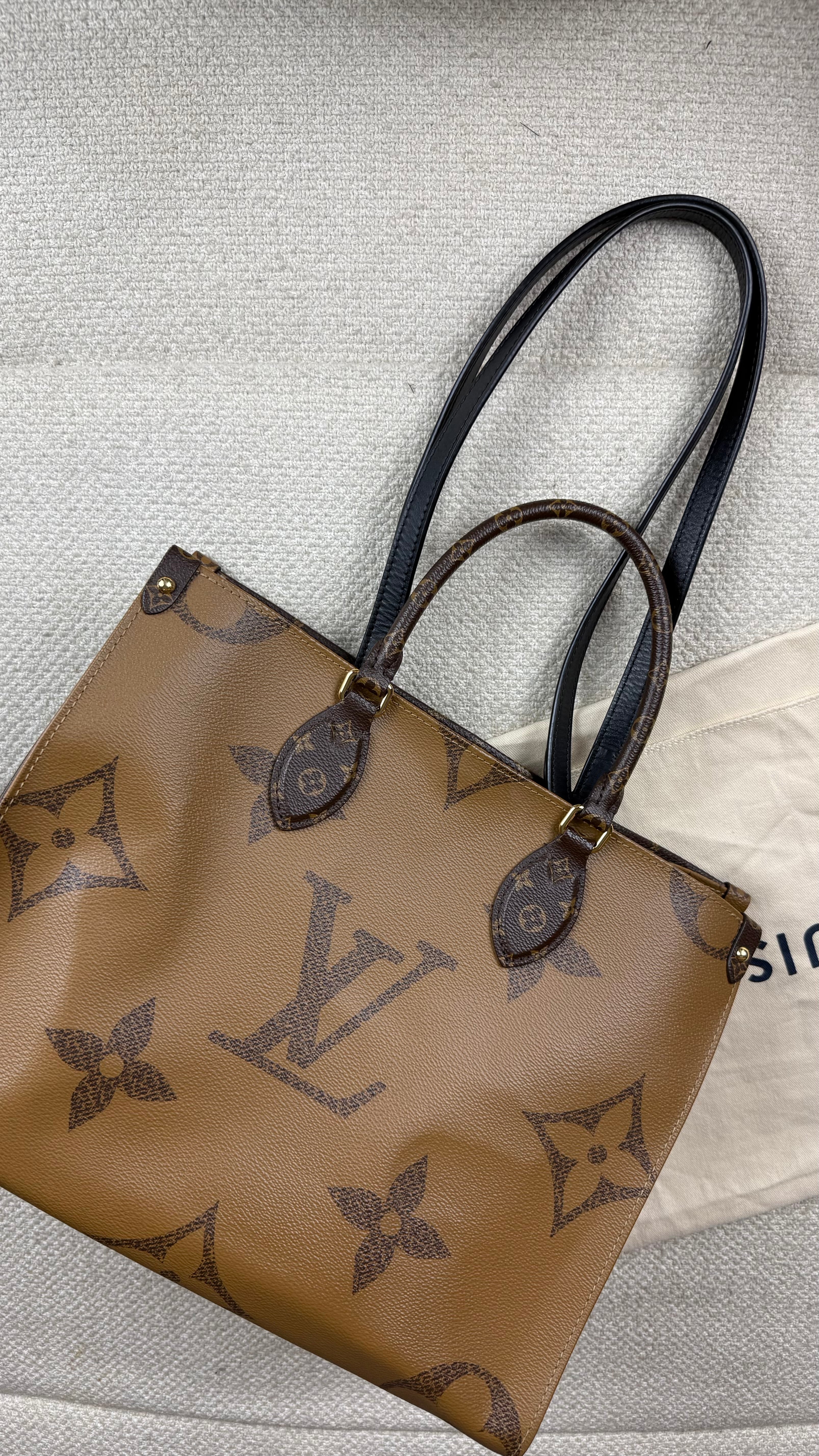 A Louis Vuitton OnTheGo MM é uma das malas mais modernas e celebradas da Maison, combinando um design estruturado e versátil com a identidade forte do monograma LV. Nesta versão Monogram Giant Reverse, o modelo exibe o icónico padrão ampliado em dois tons — castanho escuro e caramelo claro — oferecendo um contraste contemporâneo e extremamente elegante.