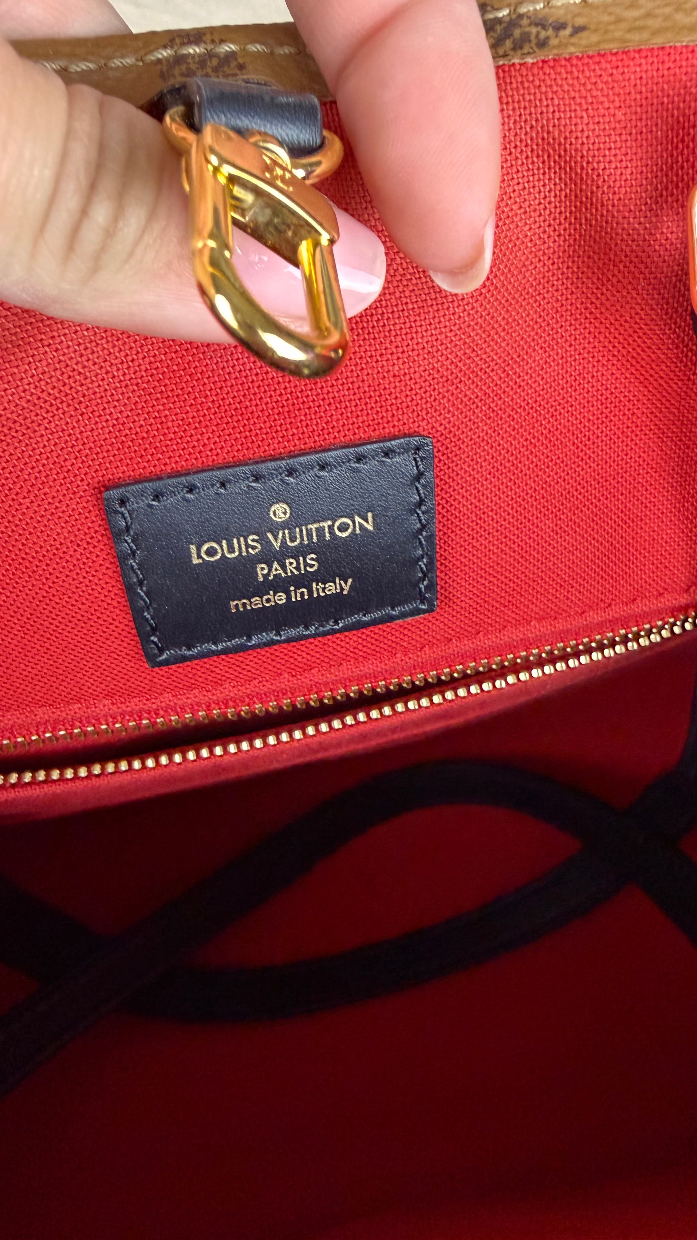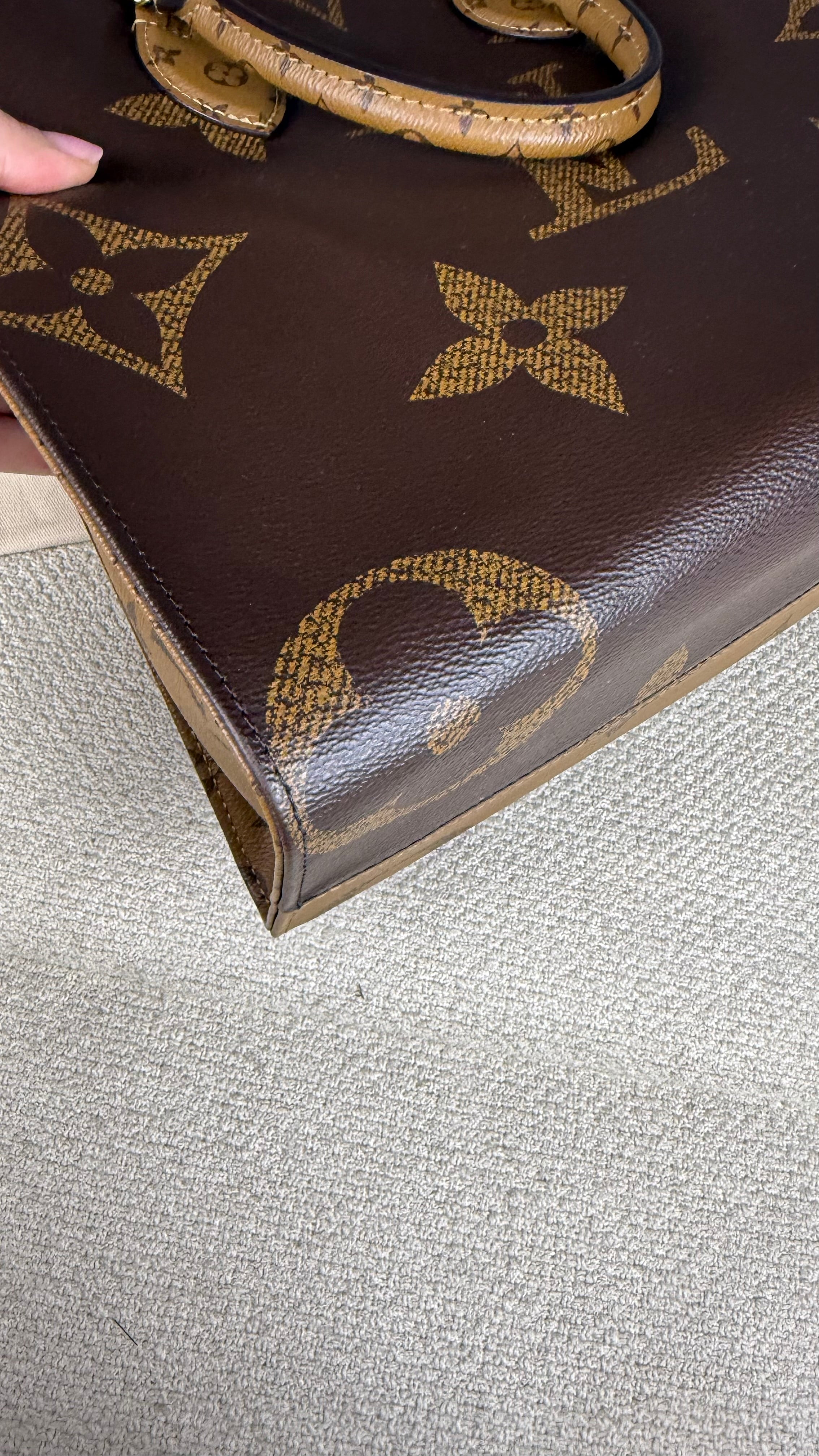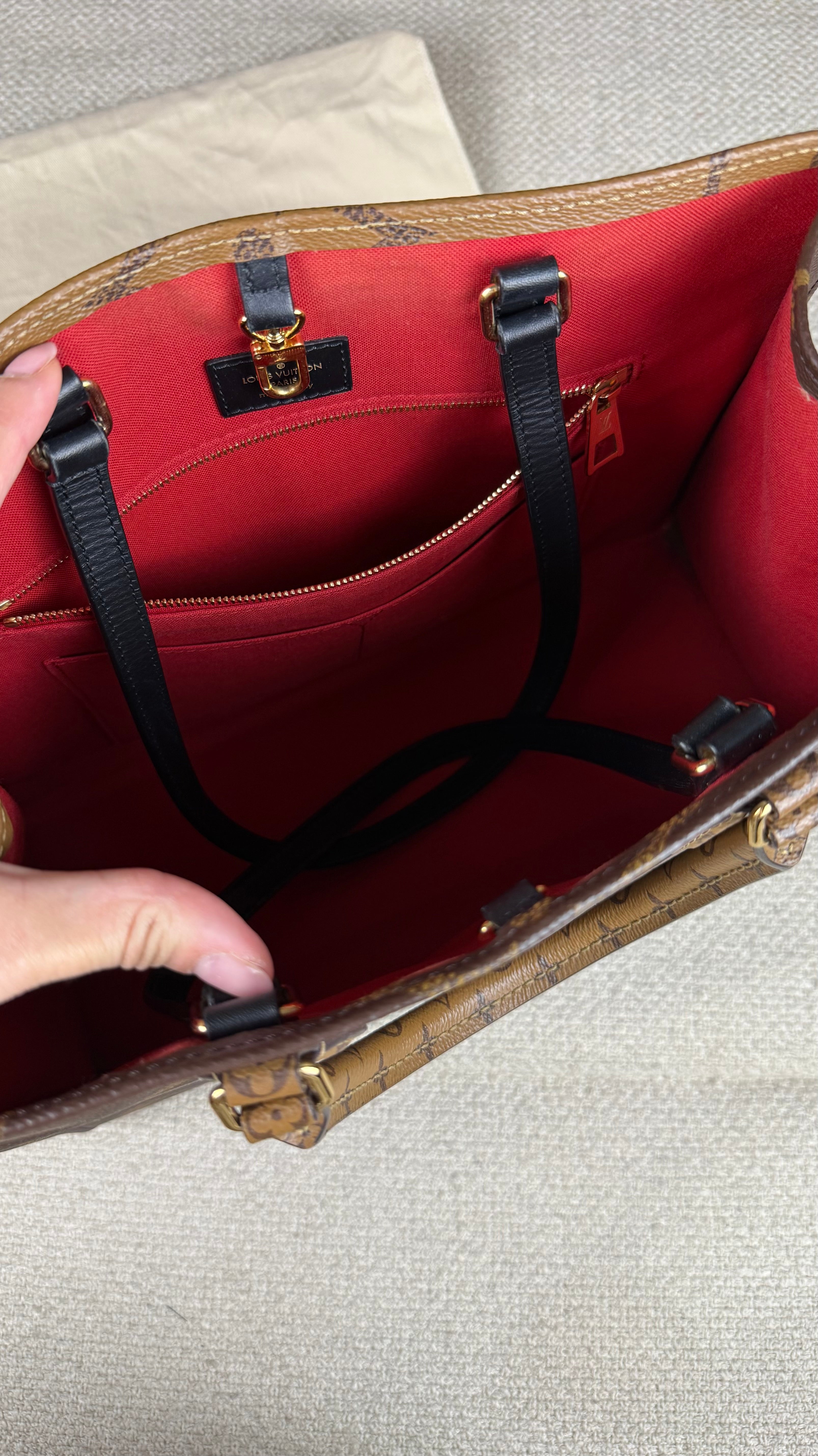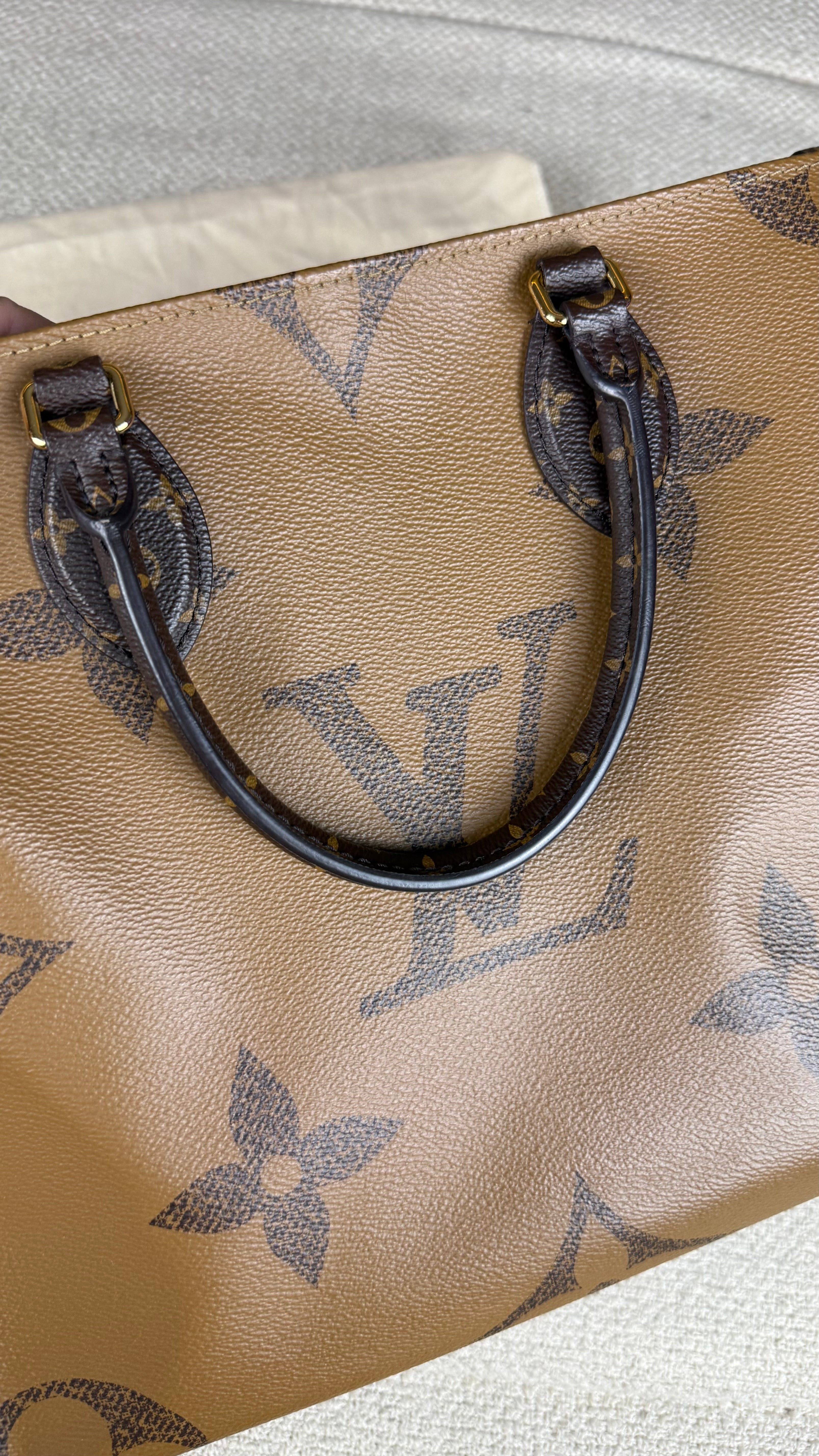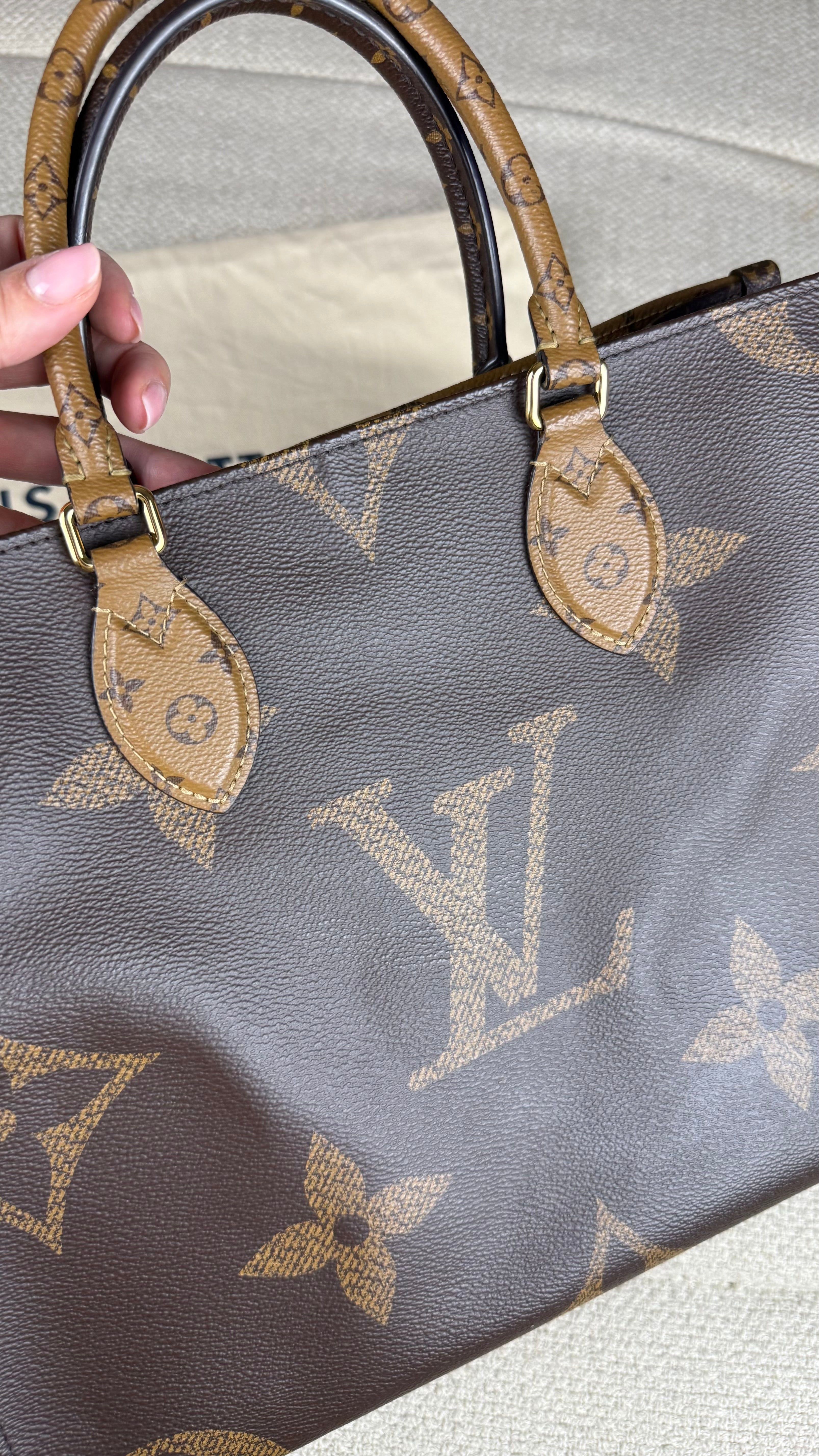 A Louis Vuitton OnTheGo MM é uma das malas mais modernas e celebradas da Maison, combinando um design estruturado e versátil com a identidade forte do monograma LV. Nesta versão Monogram Giant Reverse, o modelo exibe o icónico padrão ampliado em dois tons — castanho escuro e caramelo claro — oferecendo um contraste contemporâneo e extremamente elegante.