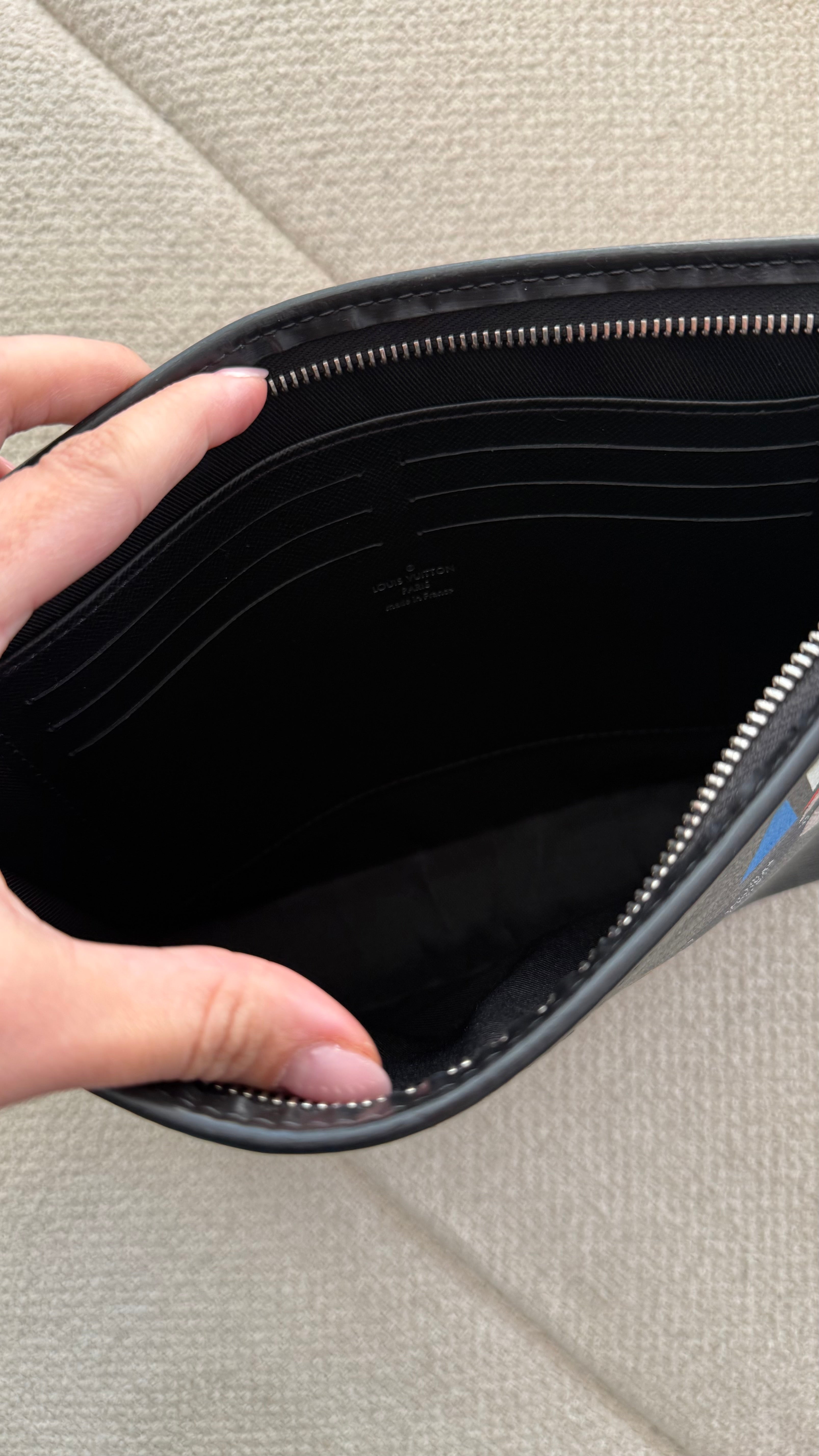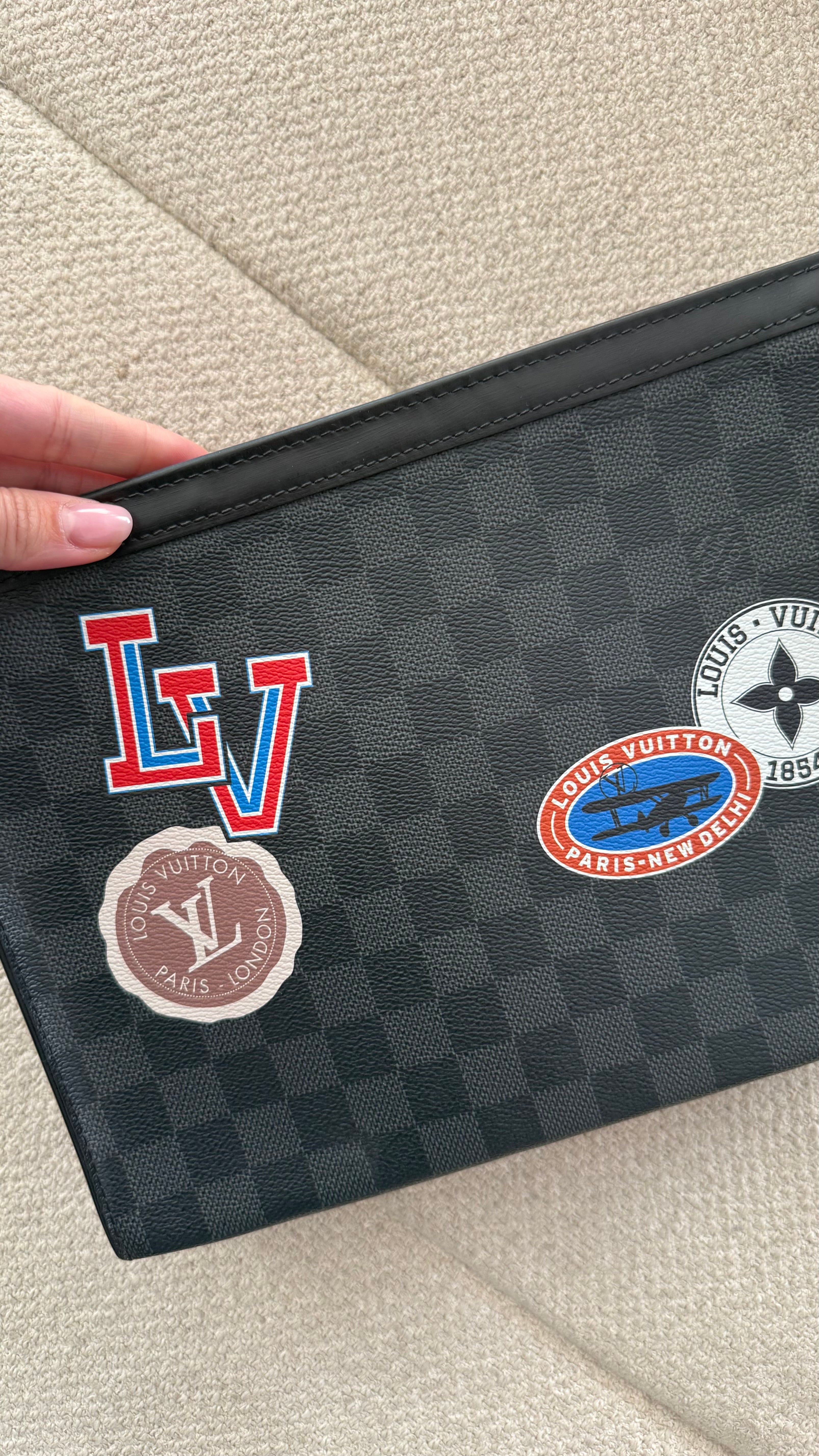 A Pochette Voyage MM da Louis Vuitton combina o clássico canvas Damier Graphite com detalhes modernos da coleção LV League, trazendo um visual sofisticado com personalidade. O acessório apresenta patches exclusivos aplicados na parte frontal, dando um toque esportivo e contemporâneo ao design.