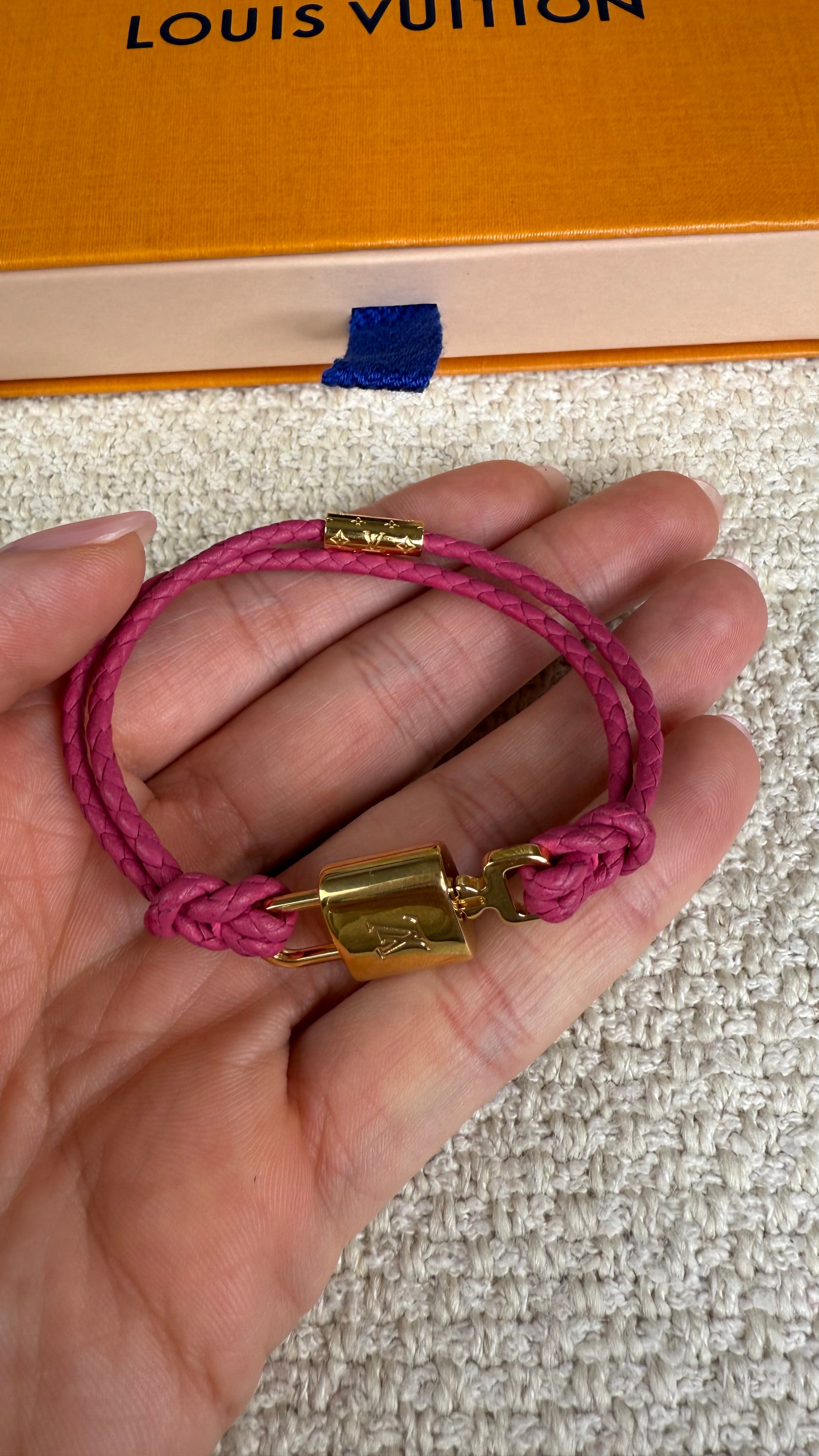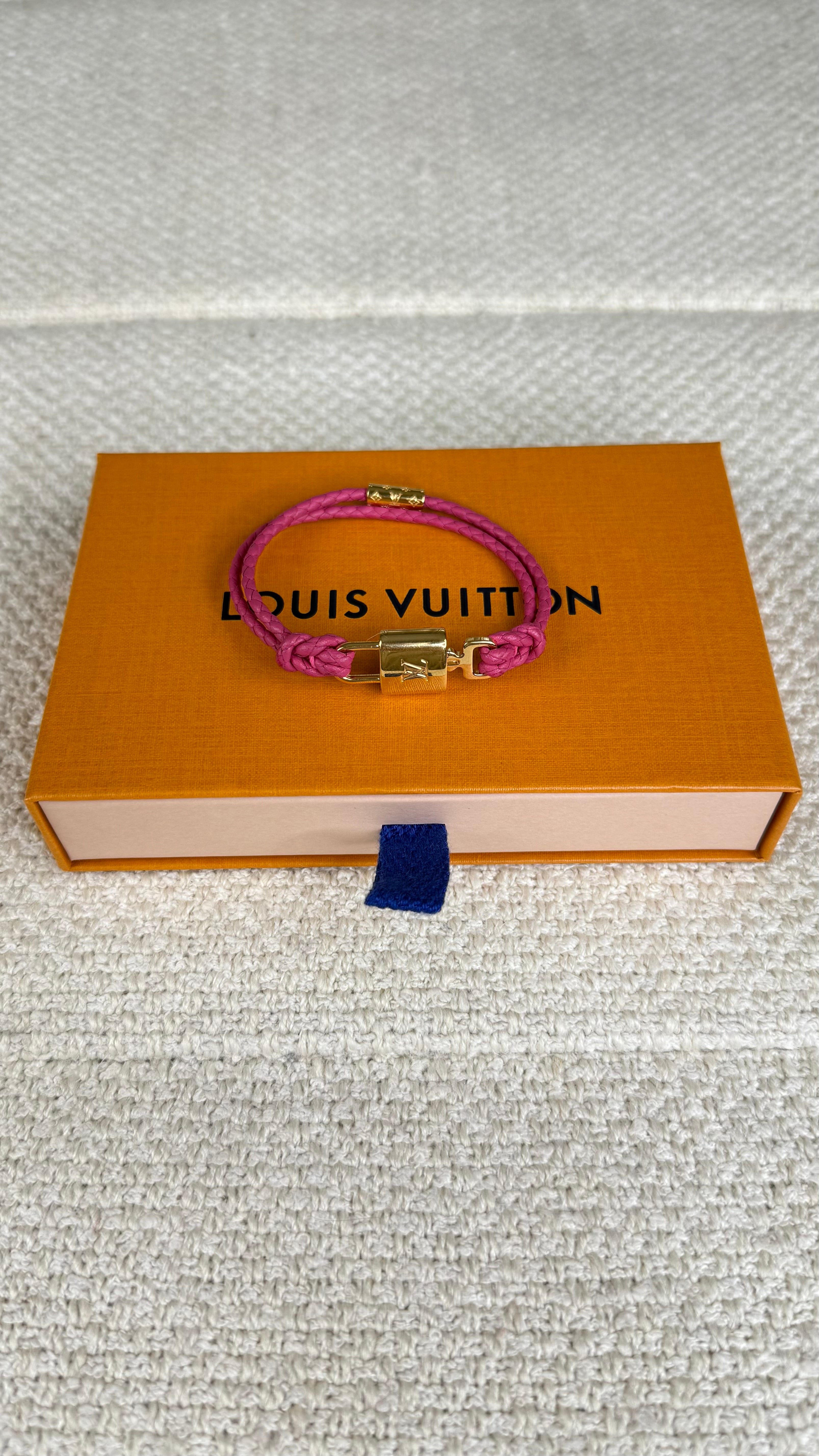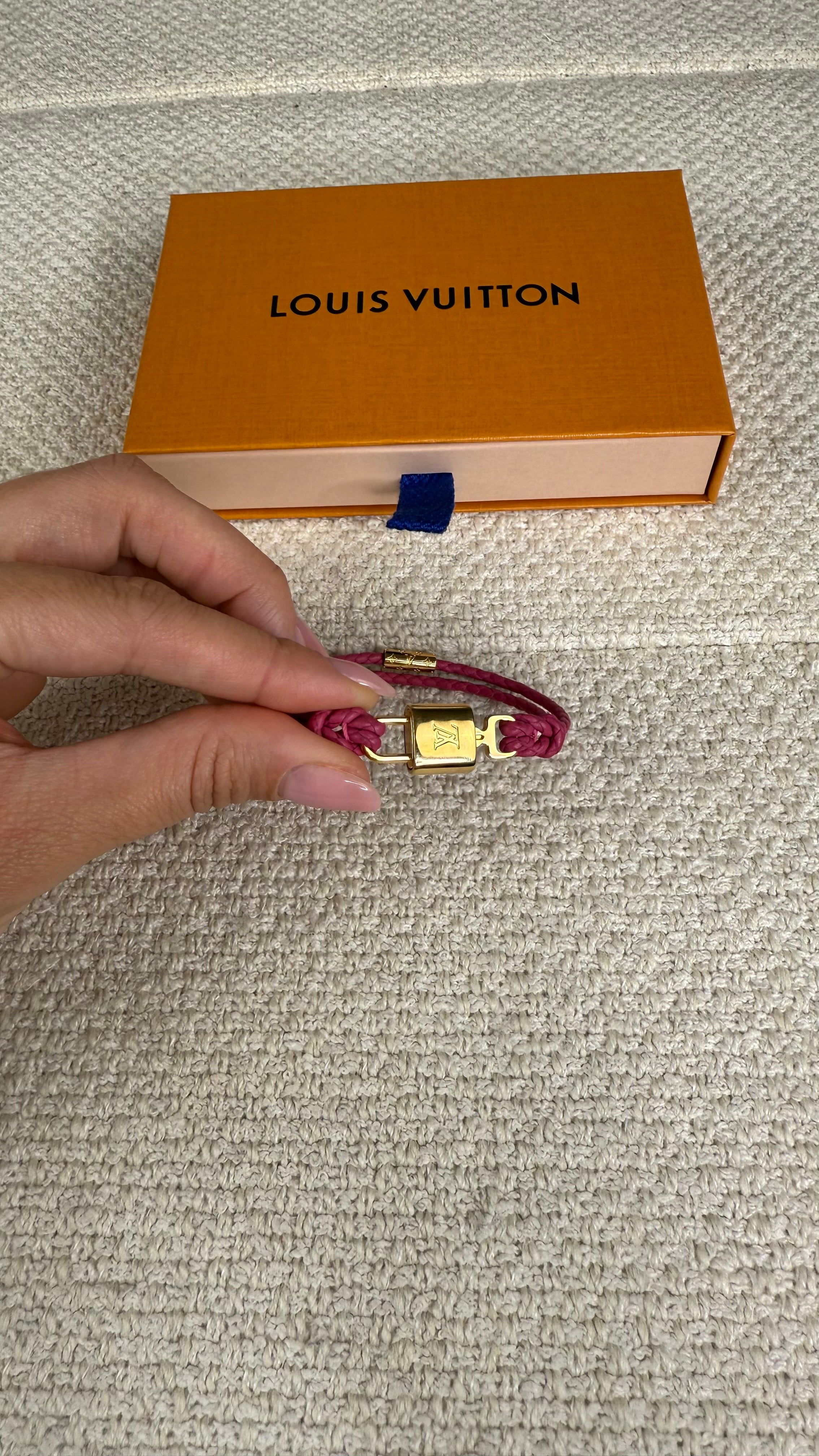 A pulseira LV Padlock da Louis Vuitton é um acessório sofisticado que combina o legado da Maison com um design contemporâneo. Inspirada nos cadeados utilizados nos icônicos baús da marca, esta pulseira destaca-se pelo seu fecho funcional em forma de cadeado, frequentemente acompanhado de uma chave removível.