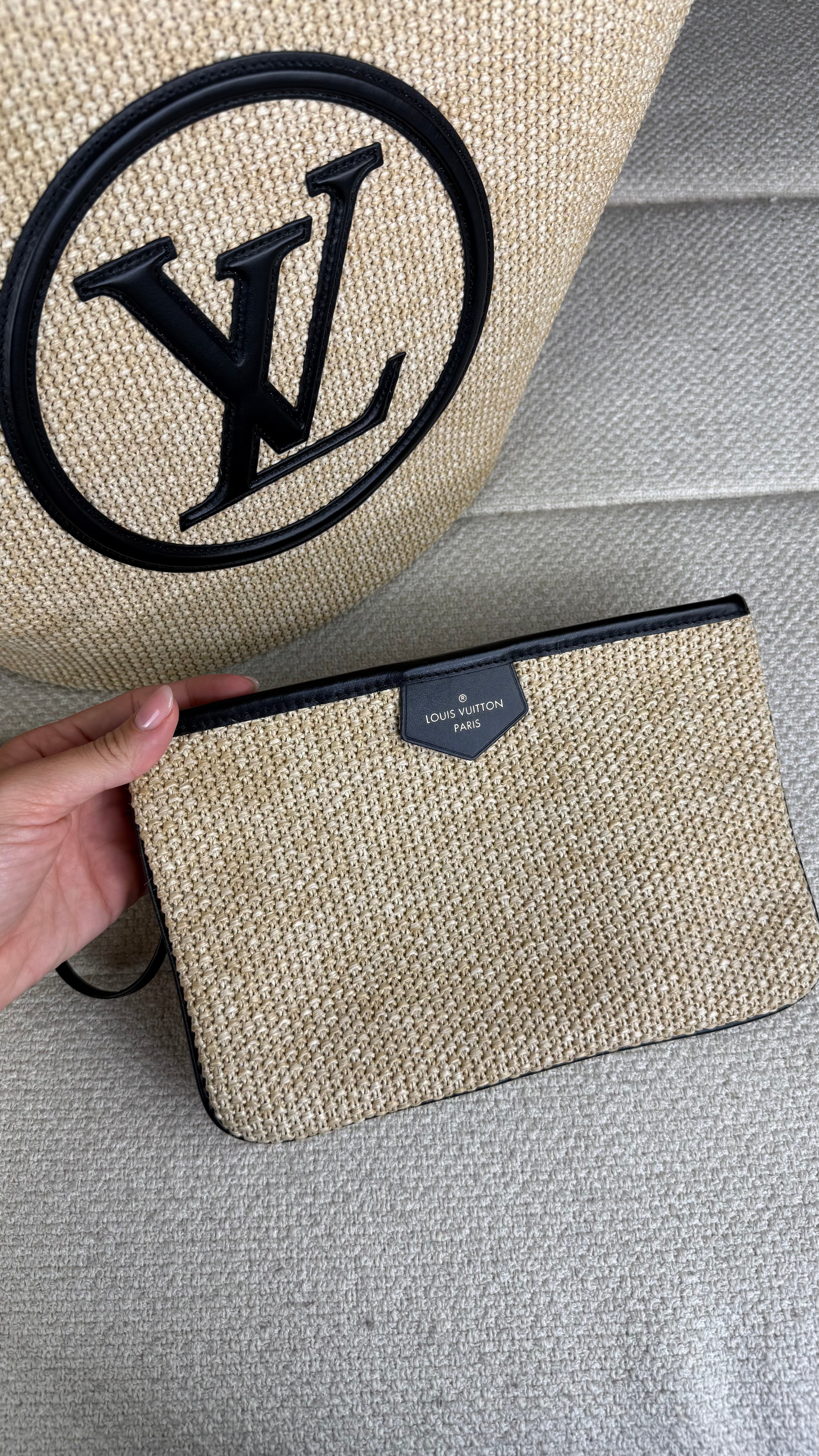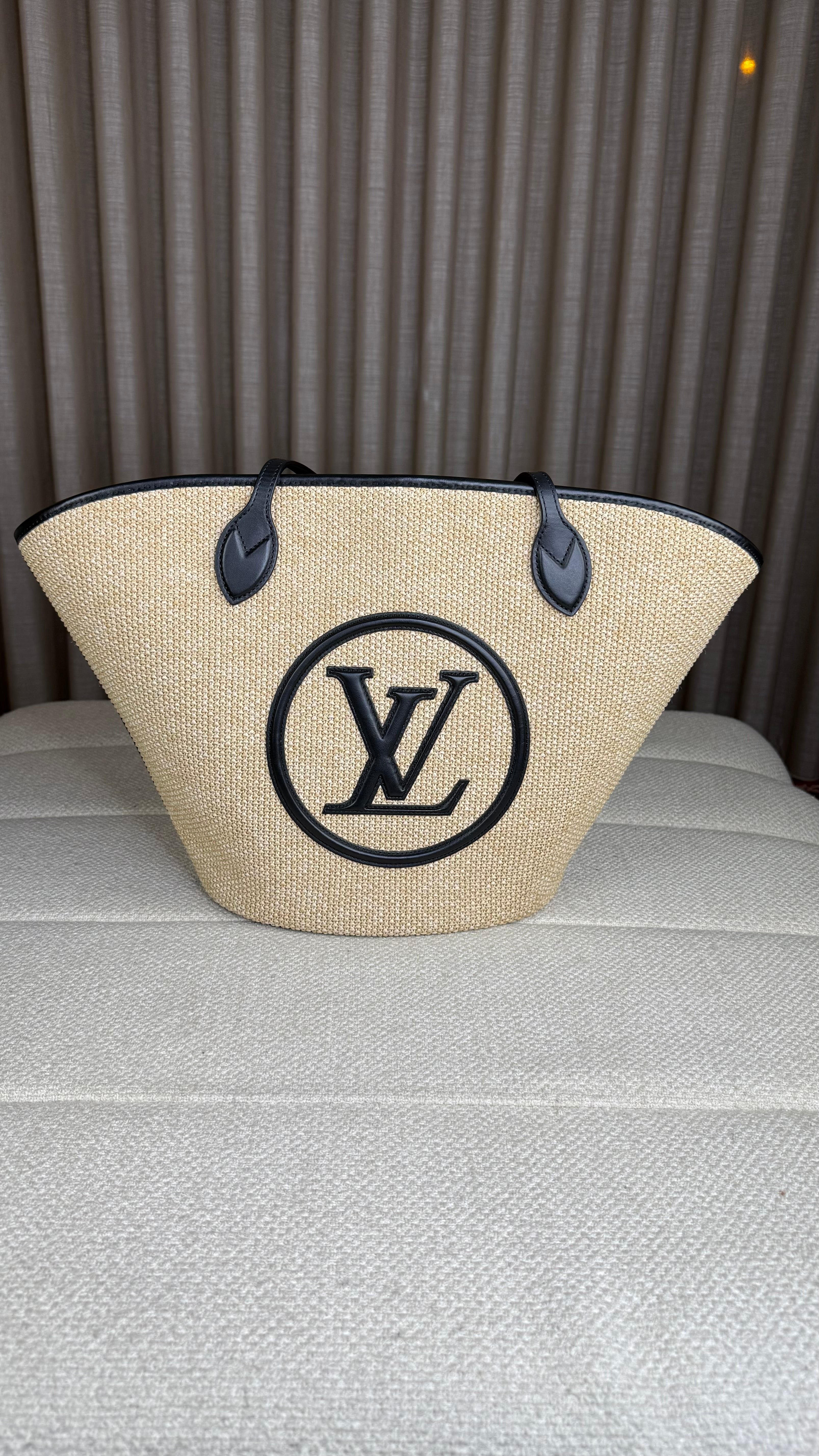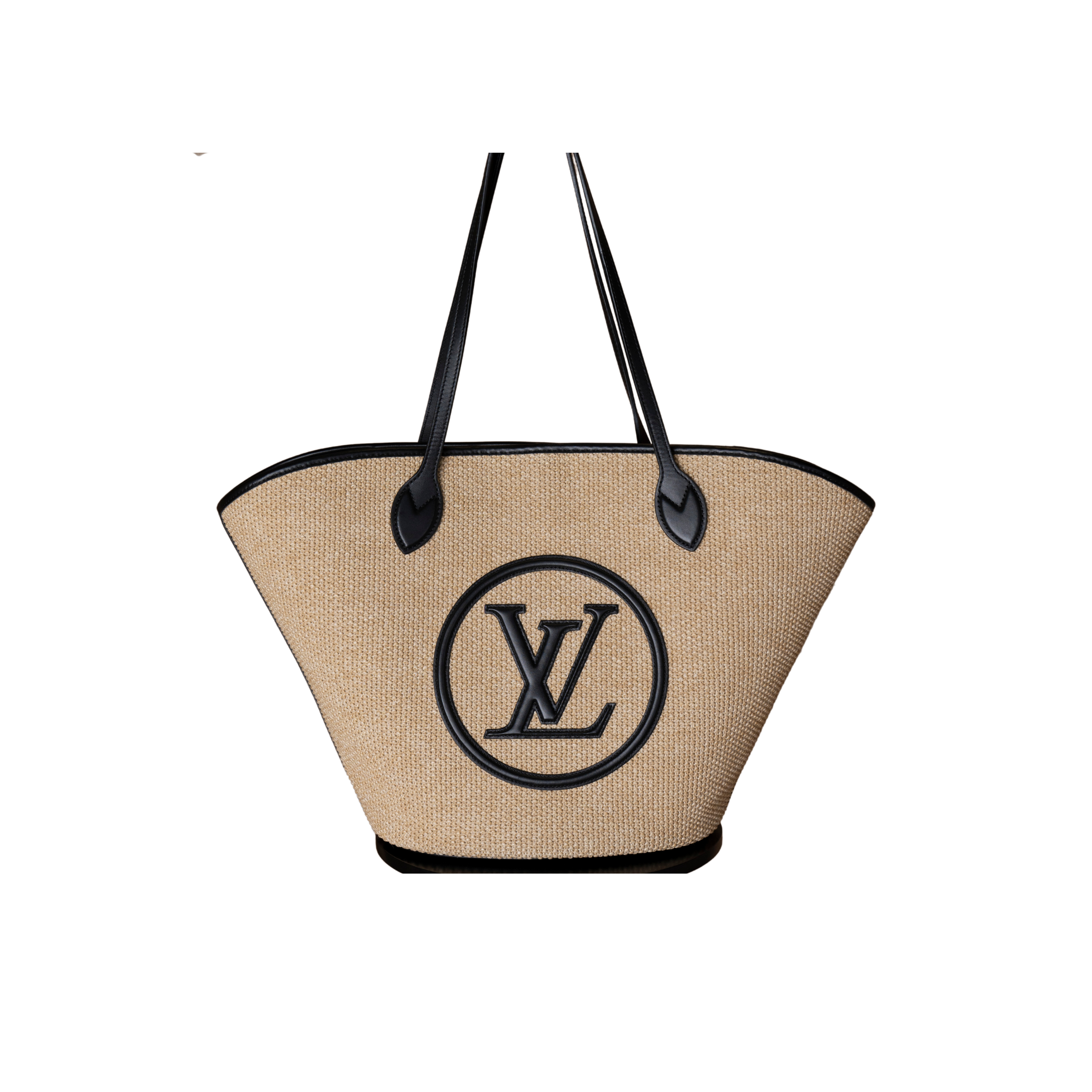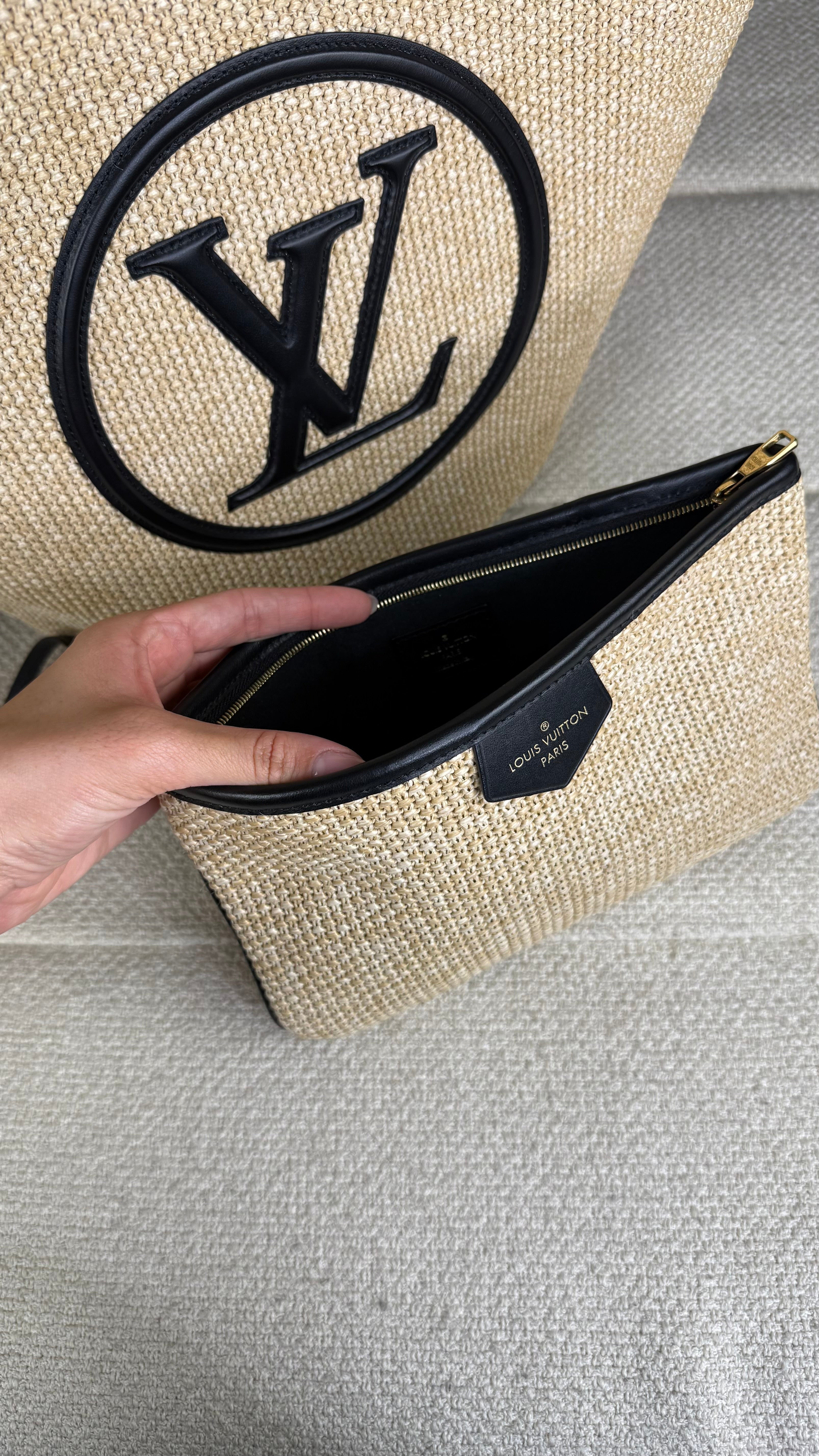 A Louis Vuitton Saint Jacques Raffia Tote é uma bolsa de grandes dimensões, ideal para o verão, que combina o icónico design de cabas da maison com materiais naturais e acabamento artesanal. Confeccionada em raffia sintética trançada, possui detalhes em couro bovino natural nos acabamentos e ferragens em metal dourado que contrastam com o corpo texturizado. O interior aberto em microsuede acolhe uma pochette de raffia removível, permitindo organização extra ou uso como clutch.